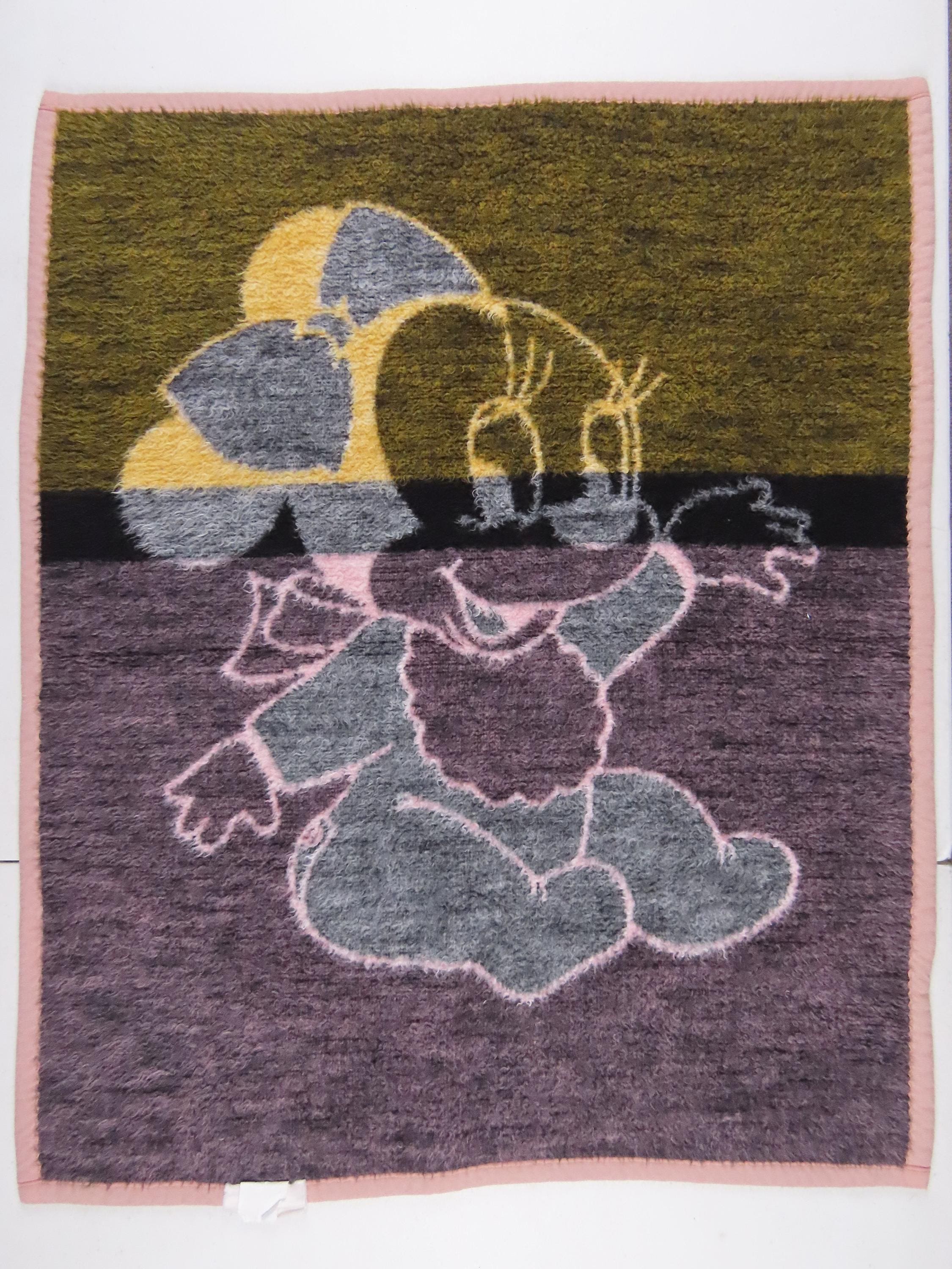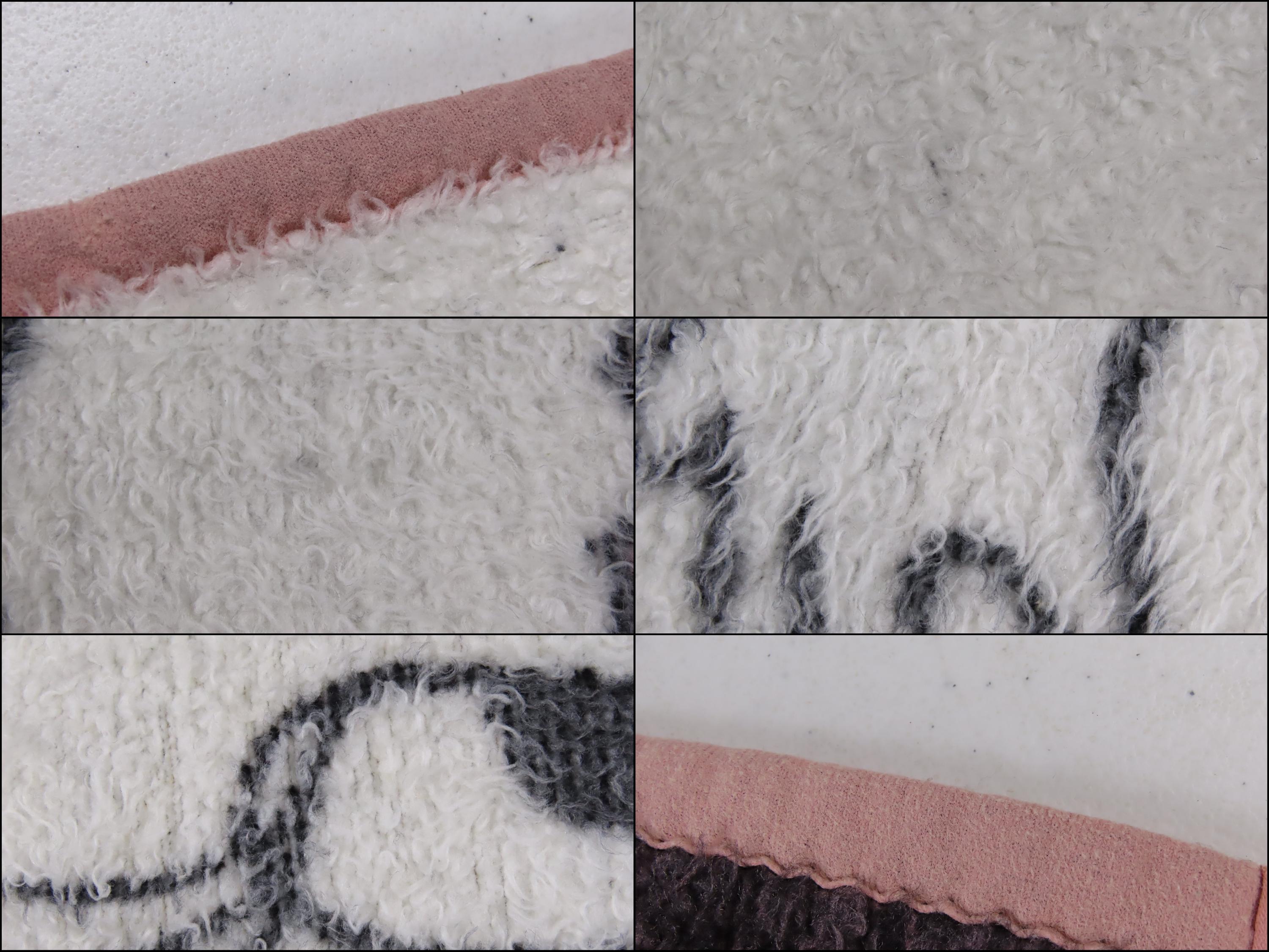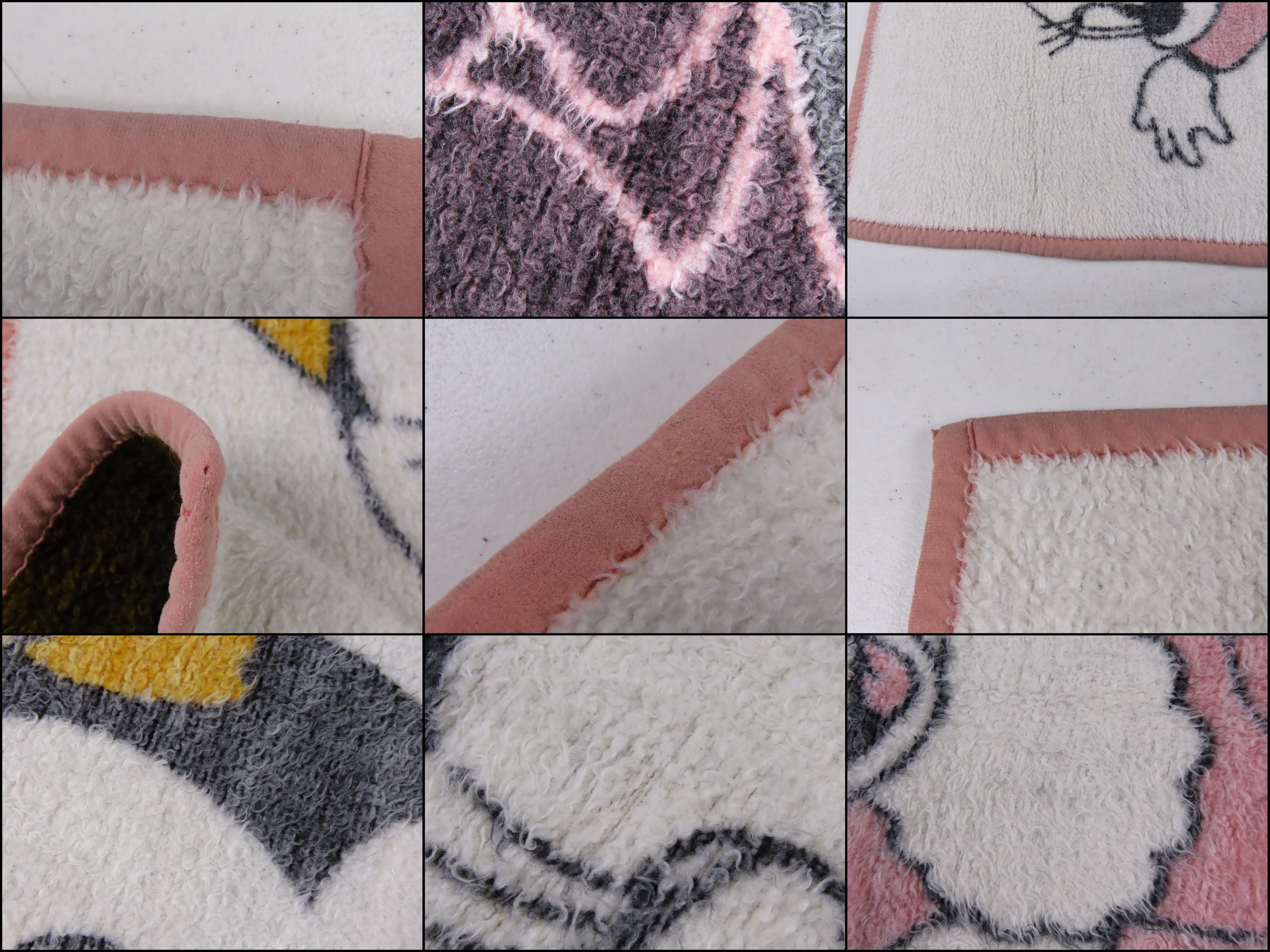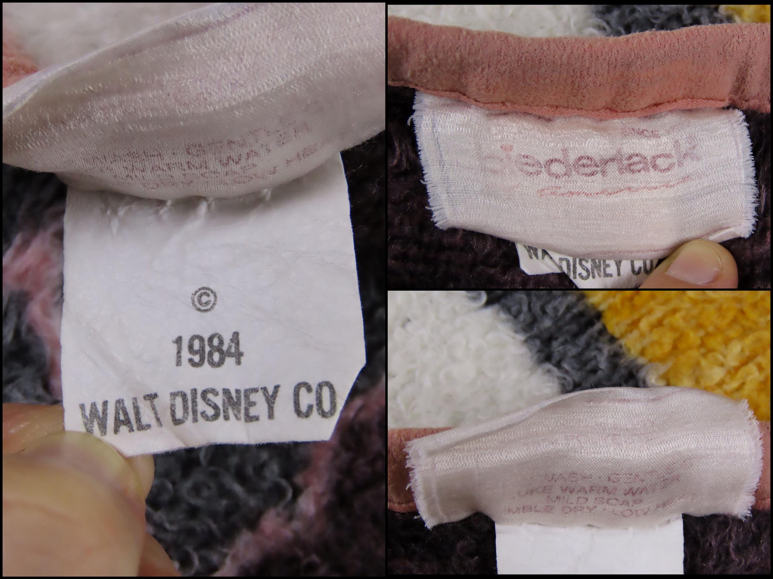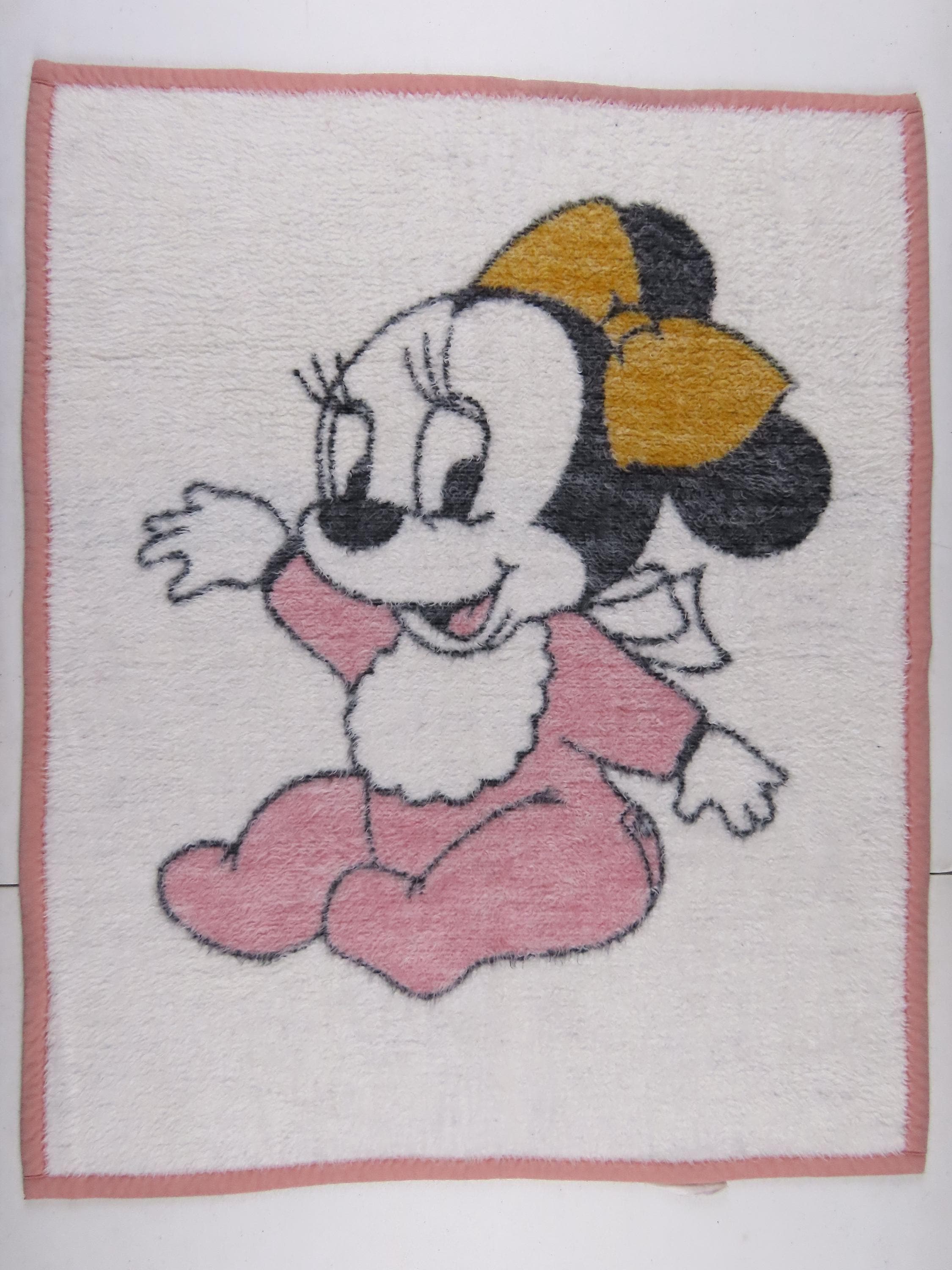 Vintage Minnie Mouse Biederlack small plush blanket from 1984 which is 85% acrylic and 15% polyester. It is about 34" tall by 27" wide (87 cm by 69 cm). It is worn, discolored, and the colors are a faded/streaky. There are missing fiber spots, thin spots, and some fibers show through to the other side of blanket. The binding is discolored, pilling, and has a tiny hole. It doesn't have straight edges most likely from the blanket stretching some. The backside isn't as soft as the front.