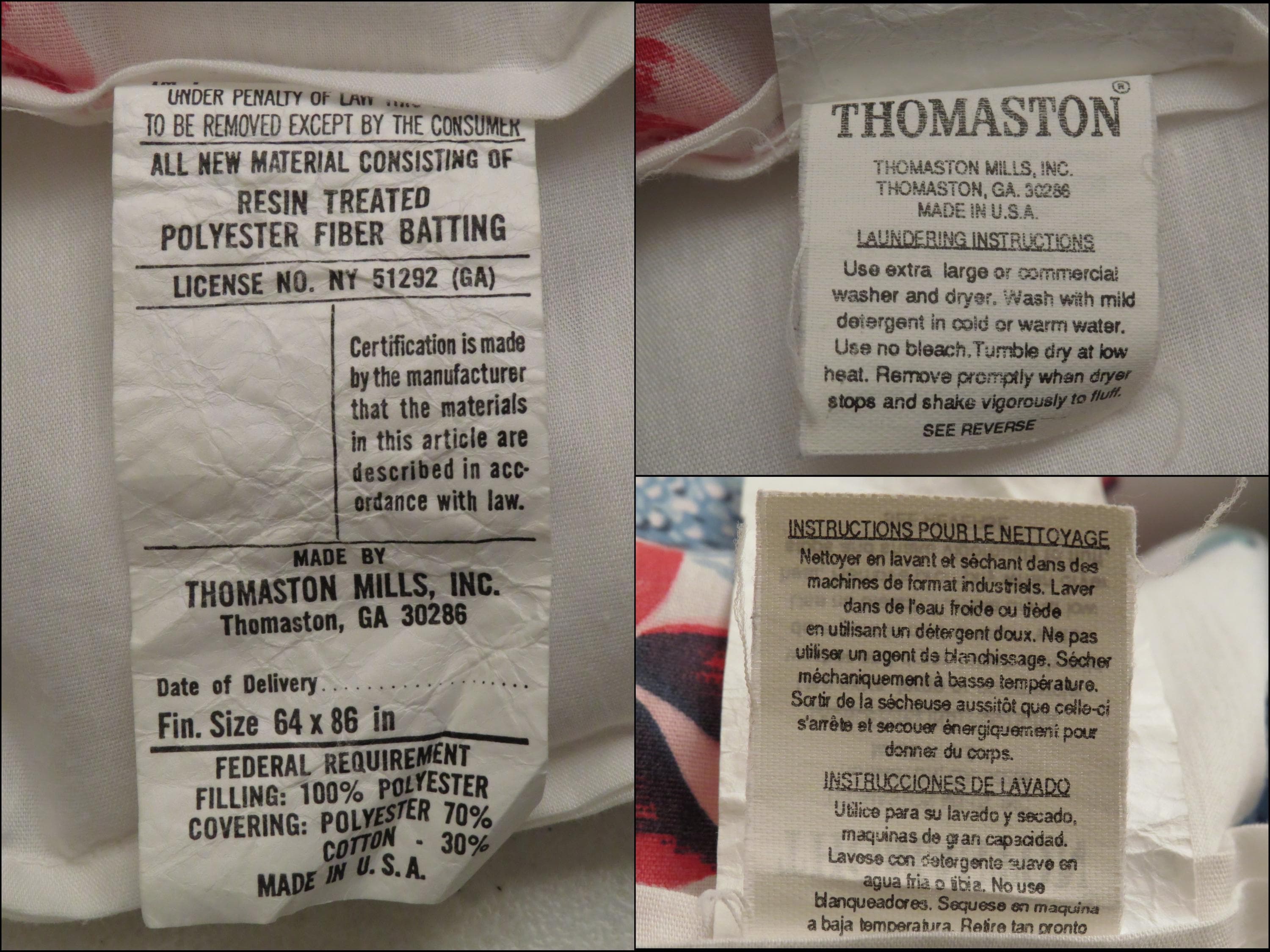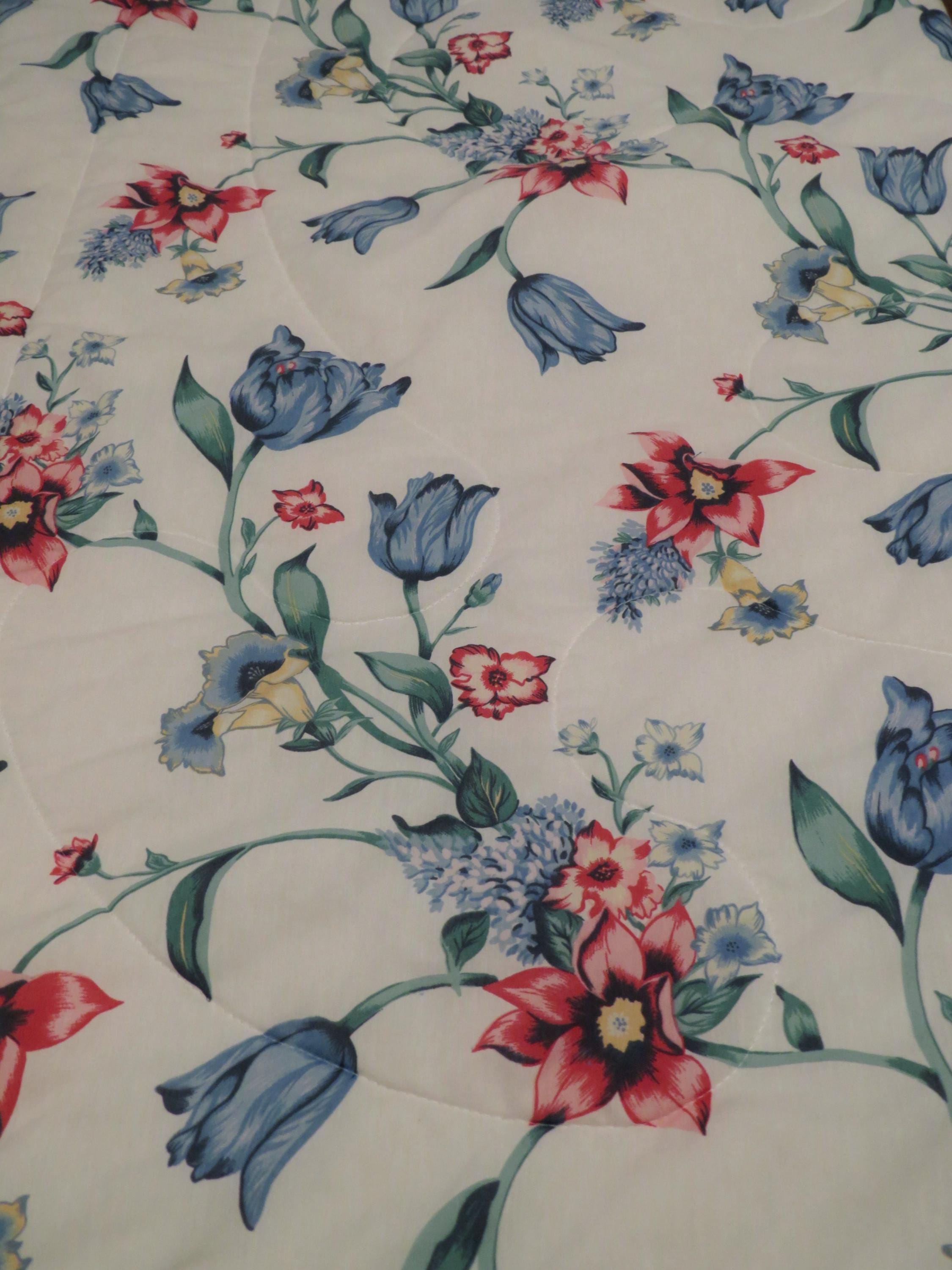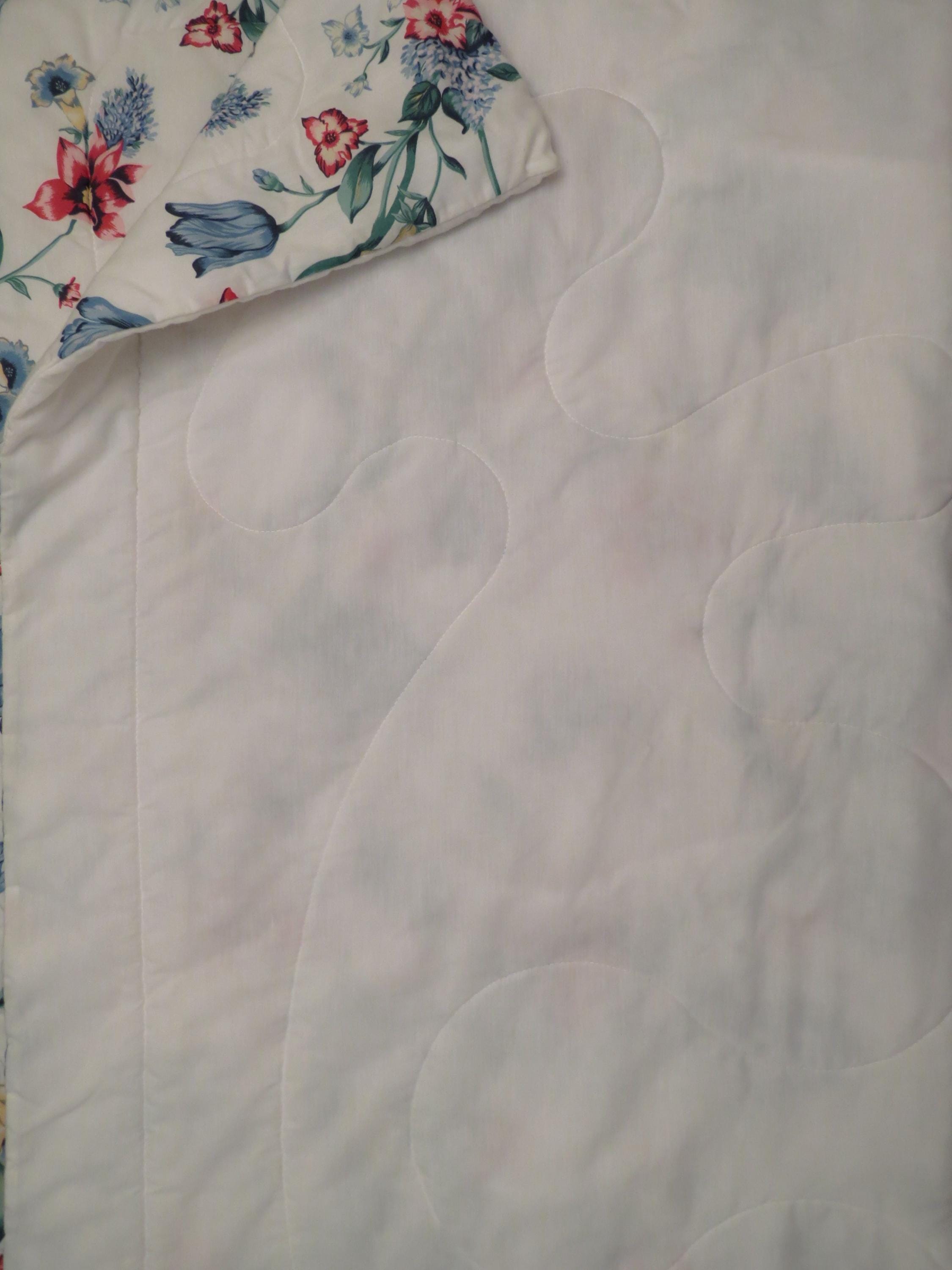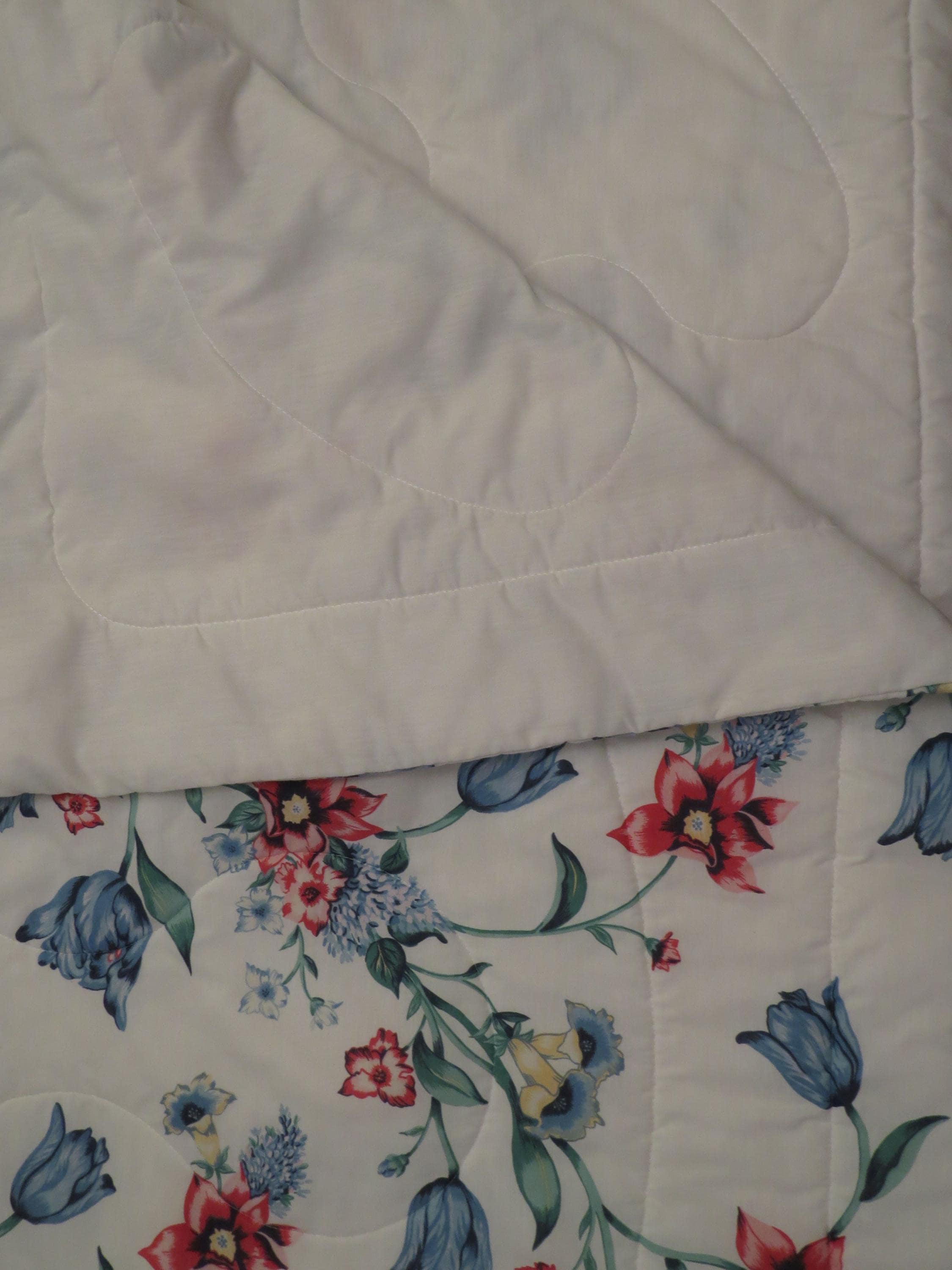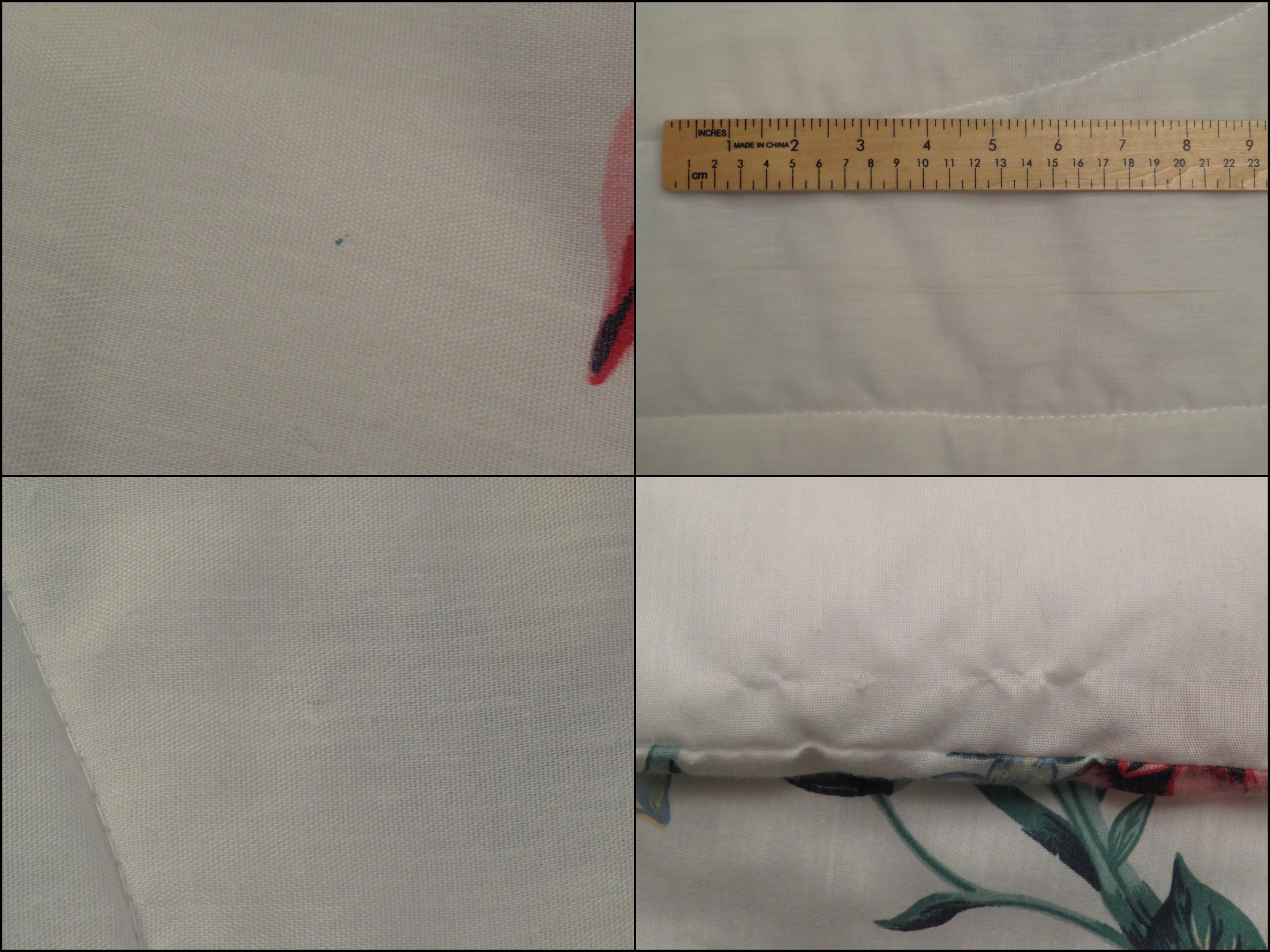 Vintage floral twin comforter which is 70% polyester and 30% cotton. The filling is 100% polyester, and has settled unevenly in areas. It has light pilling in areas and has some tiny marks (repeating printing errors). The white backside has light pilling in areas, a stain streak, and a missing thread spot. There are some thin spots, and some of them are forming tiny holes.