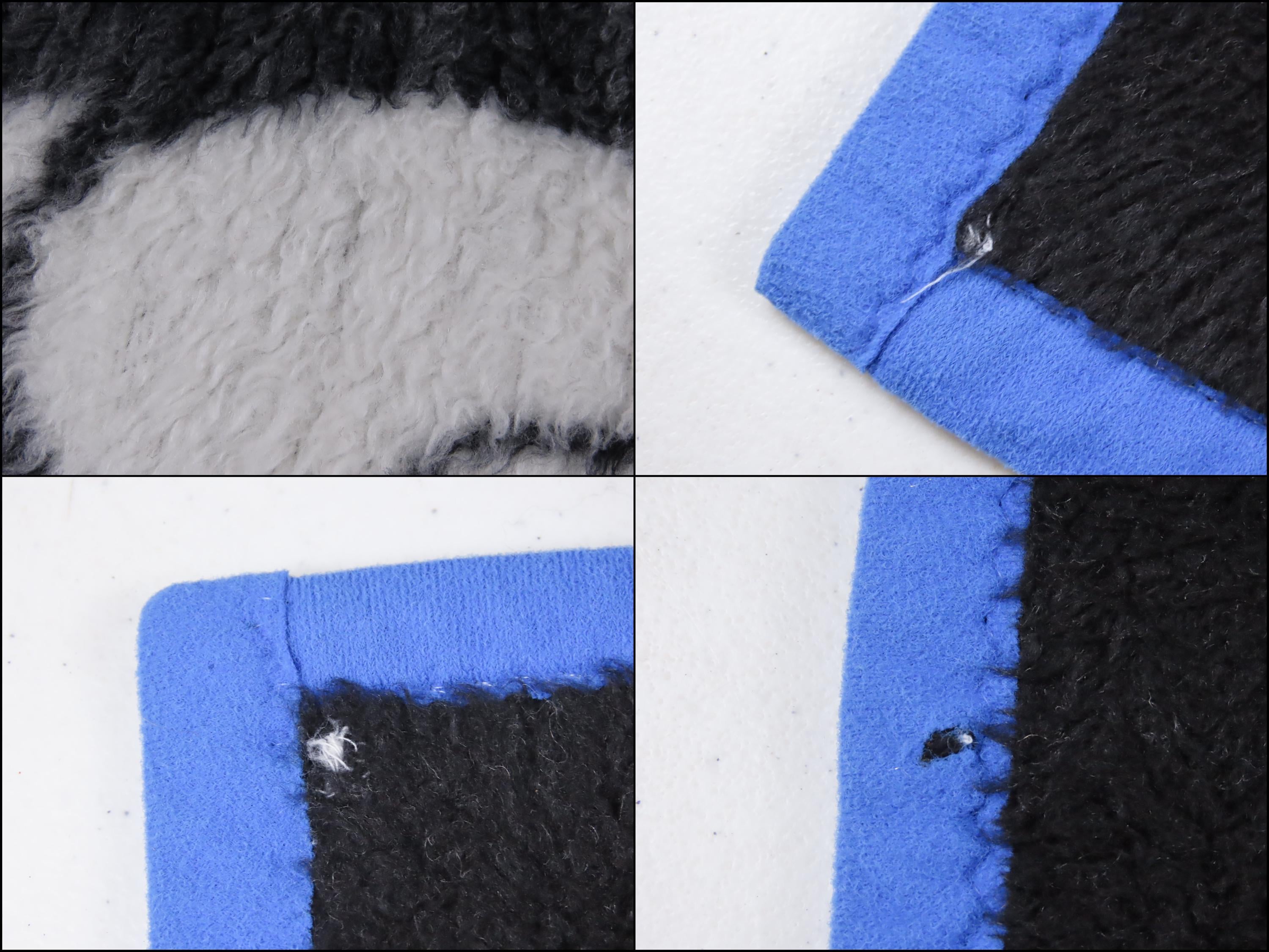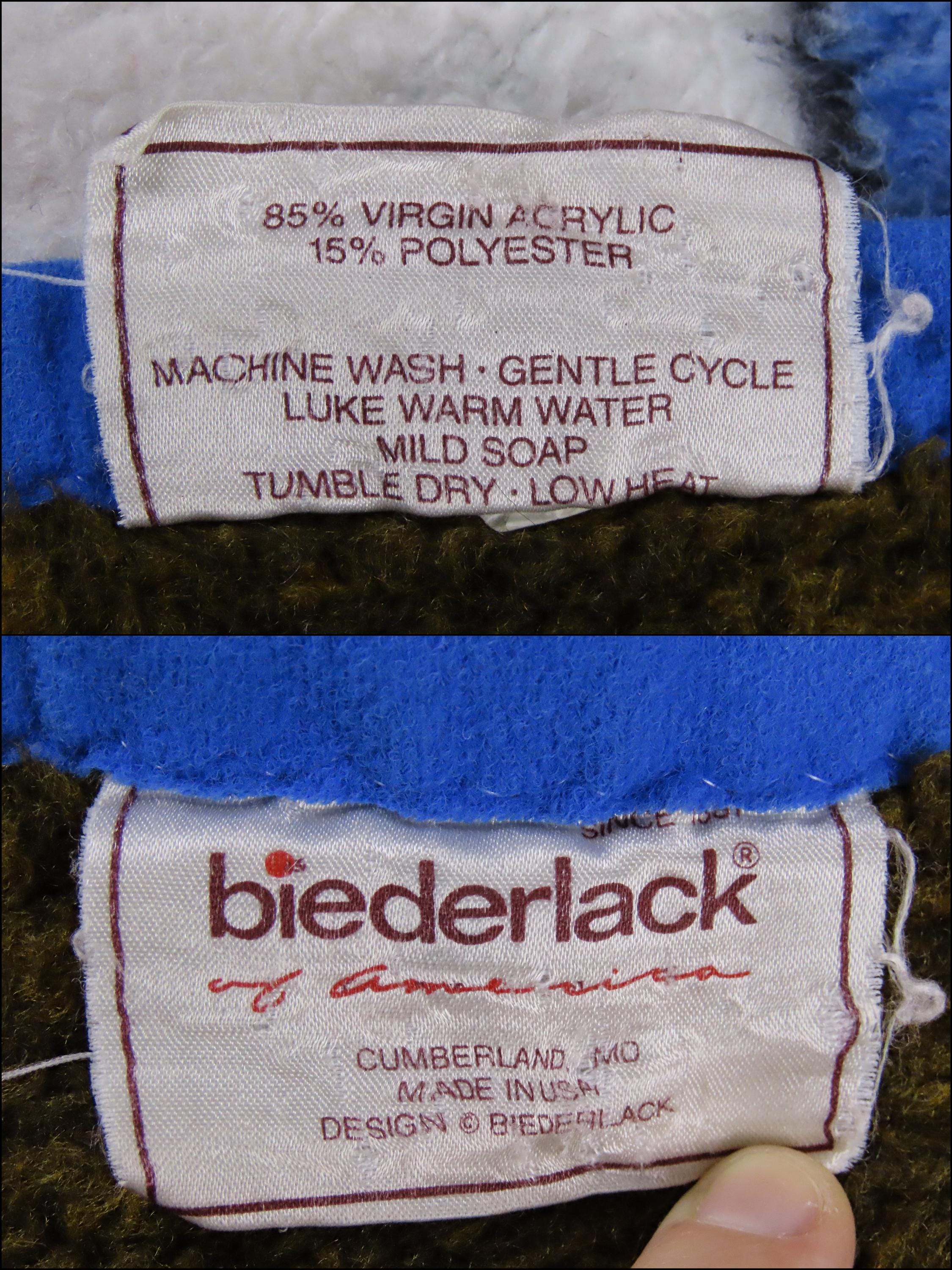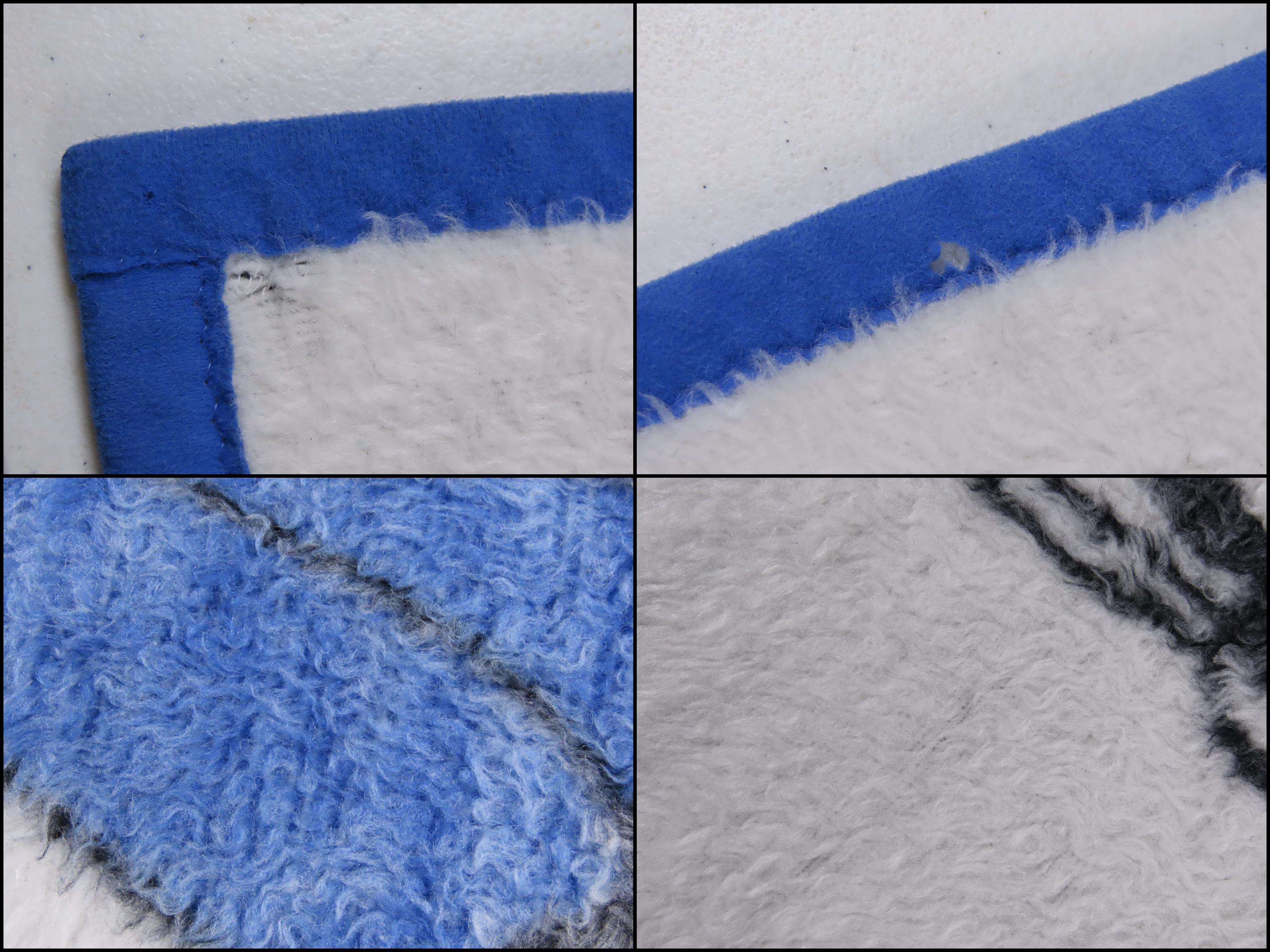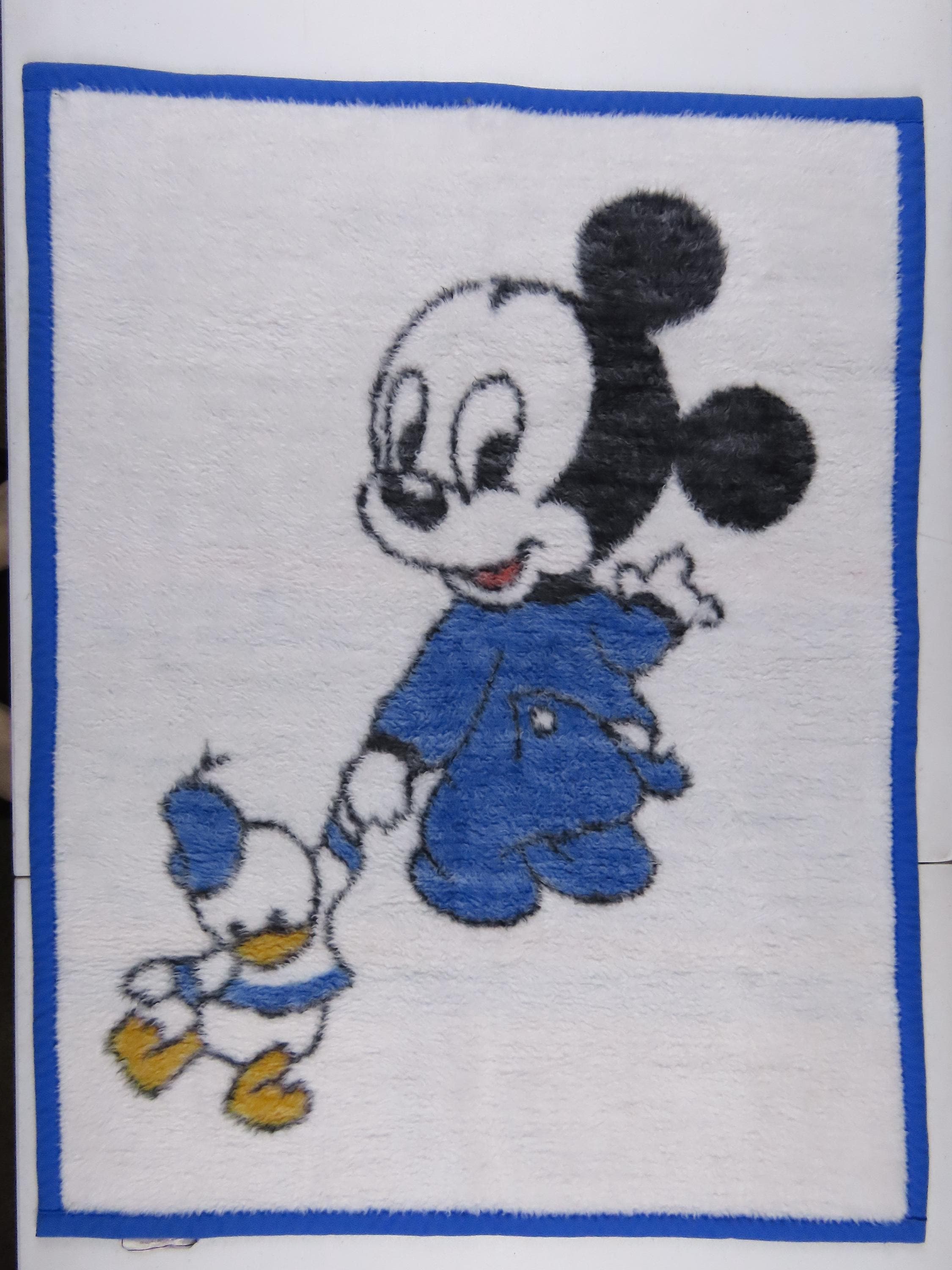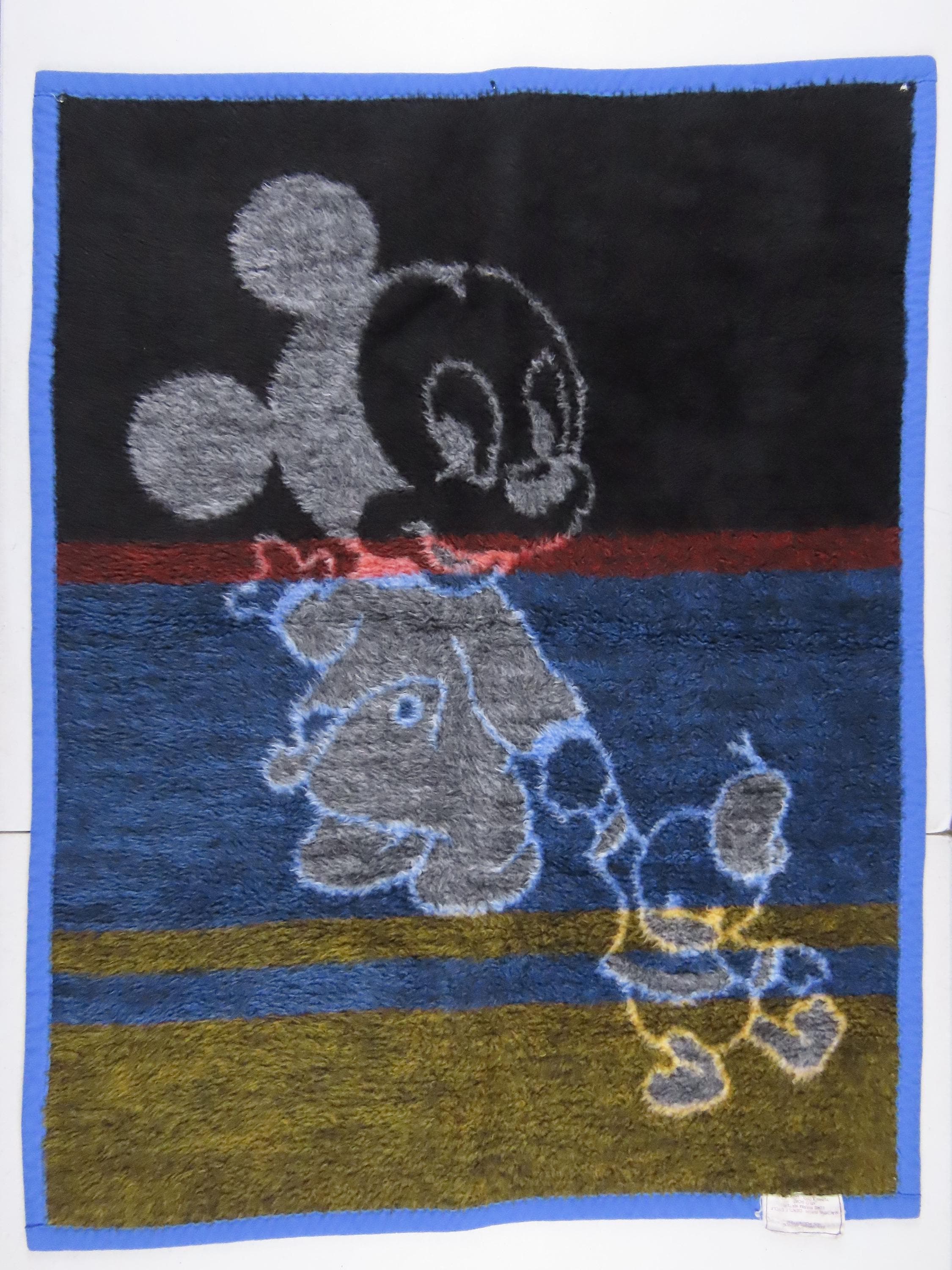 Vintage Mickey Mouse Biederlack small plush blanket which is 85% acrylic and 15% polyester. It is about 36" tall by 27" wide (92 cm by 69 cm). It is worn along the edges, the colors are streaky, and the edges aren't completely square most likely from some stretching. It has some small holes on the binding, and thin spots that are close to being holes that go all the way through the blanket. It has missing fiber spots, a few hard creases, and some of the colors on the opposite side can be seen through the white.