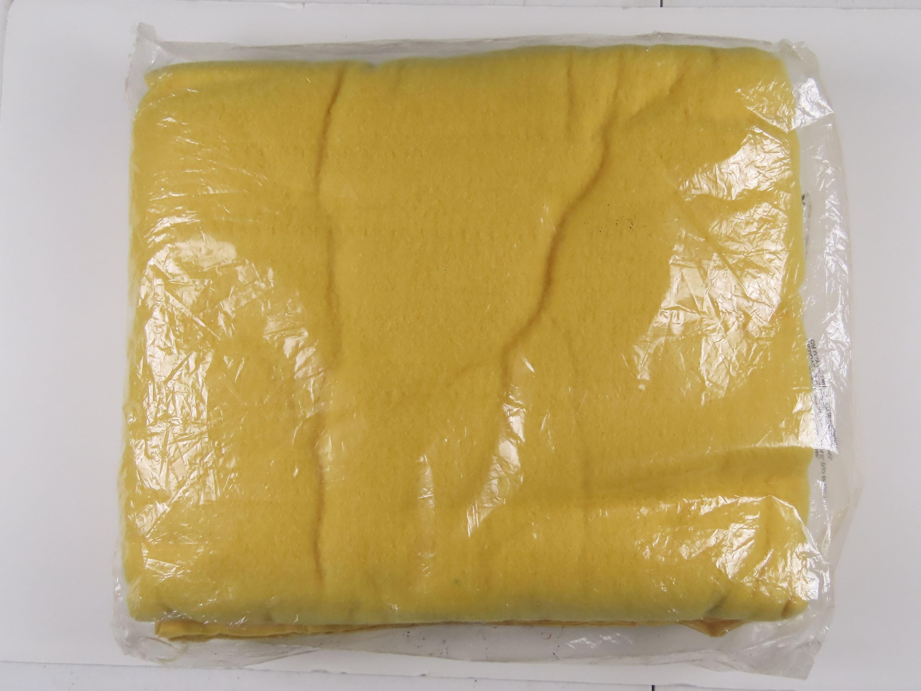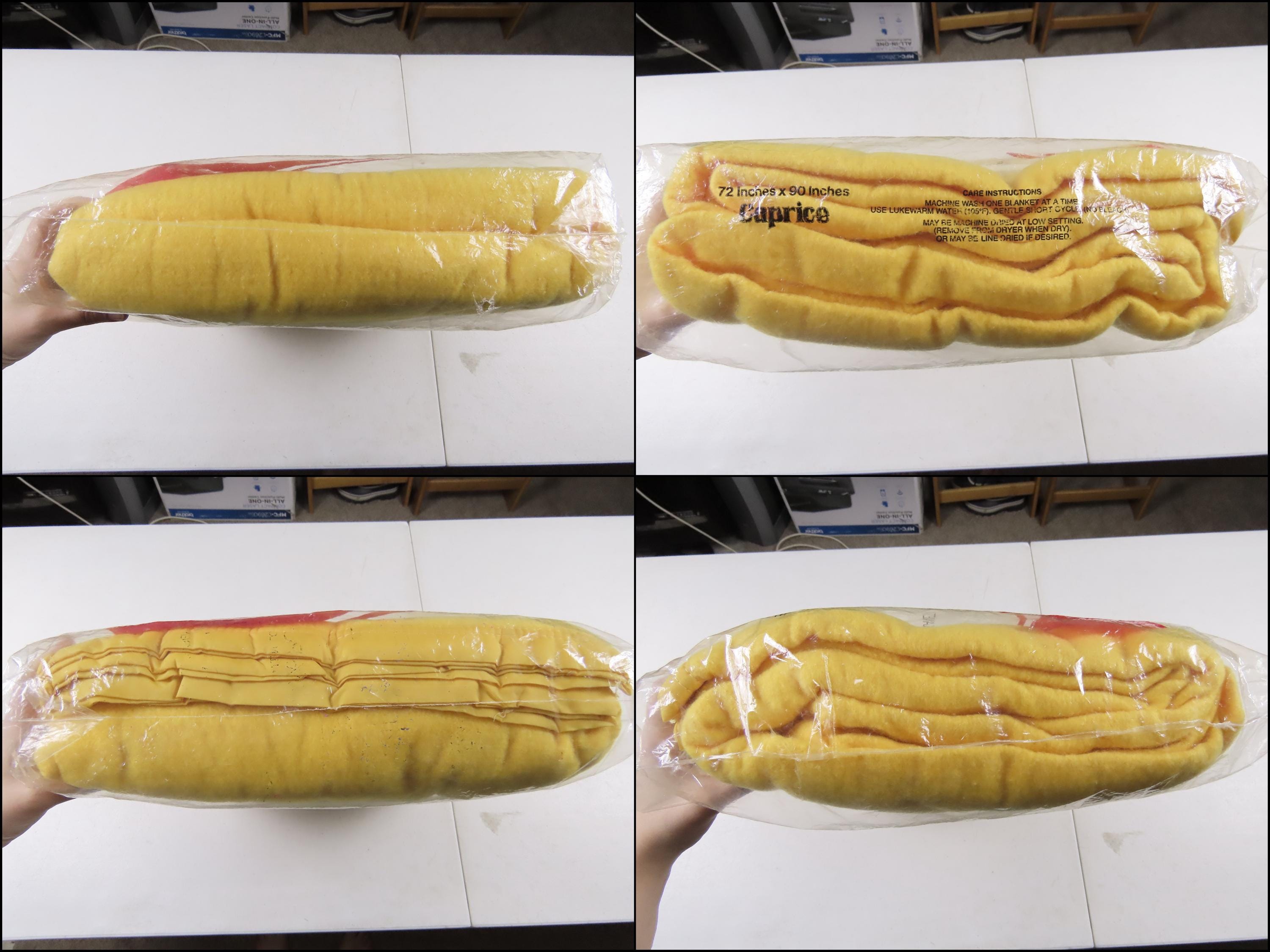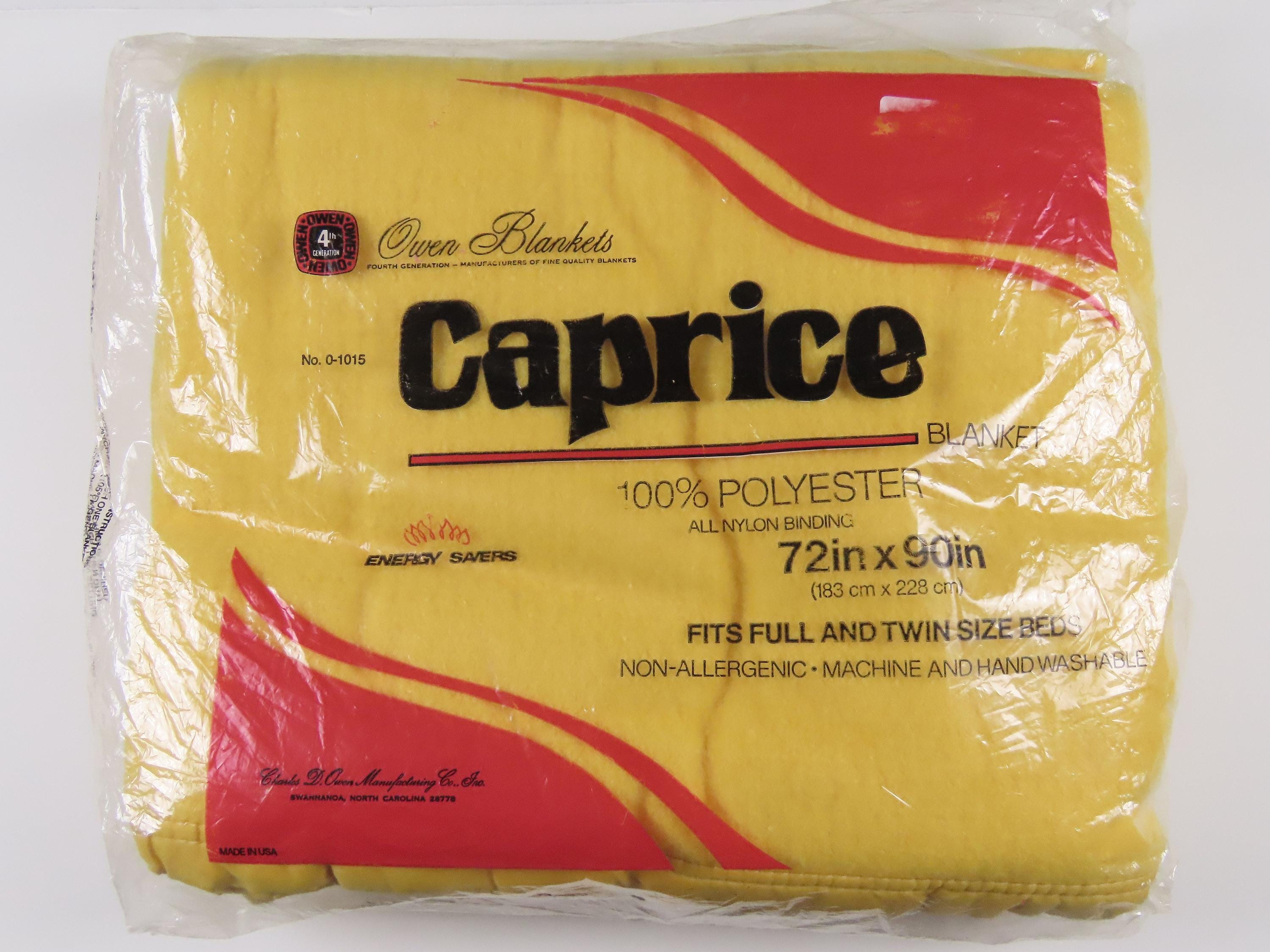 Vintage Owen Blankets brand Caprice blanket for a full or twin sized bed which is new in the package. It is 100% polyester with nylon binding, and it is 90" by 72" (230 cm by 183 cm). My camera had a very hard time picking up the exact colors. I really can't tell if it is a yellowish orange or a orangish yellow.