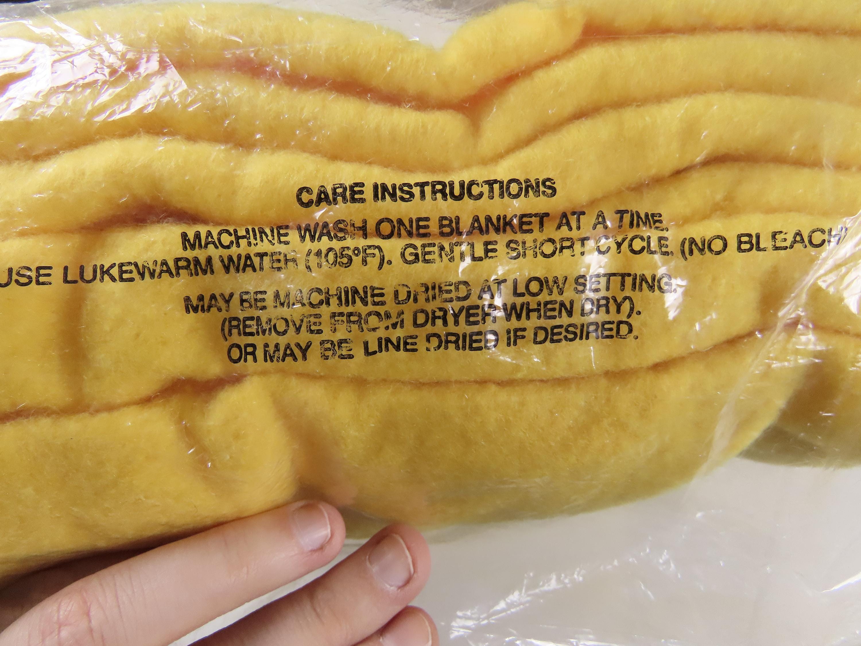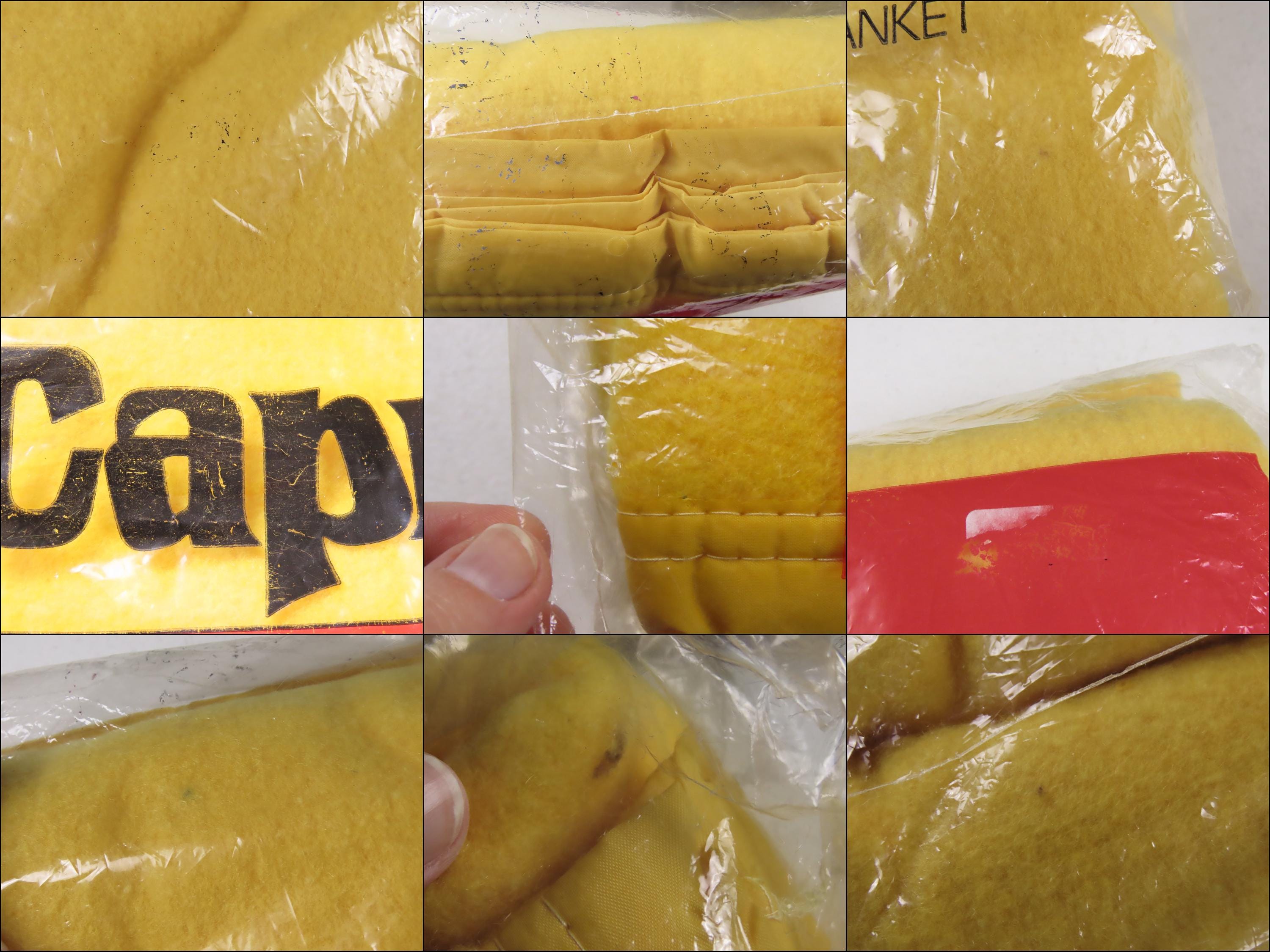 The plastic packaging is worn with a couple small holes, old sticker residue, and missing/worn off ink. Some ink has transferred to multiple areas of the plastic leaving small red and black marks. The blanket has some small areas of lint, or small marks (it is hard to tell).