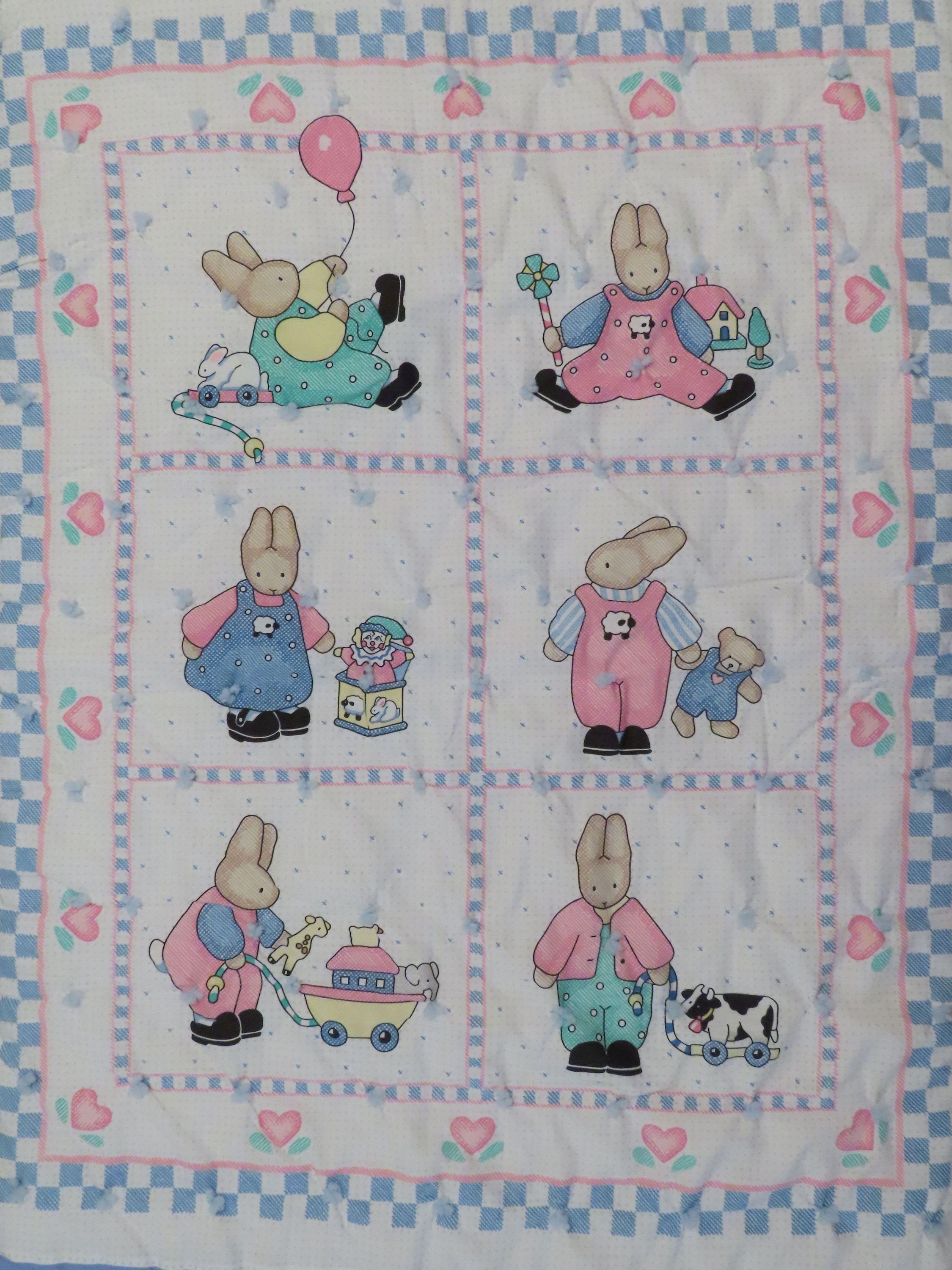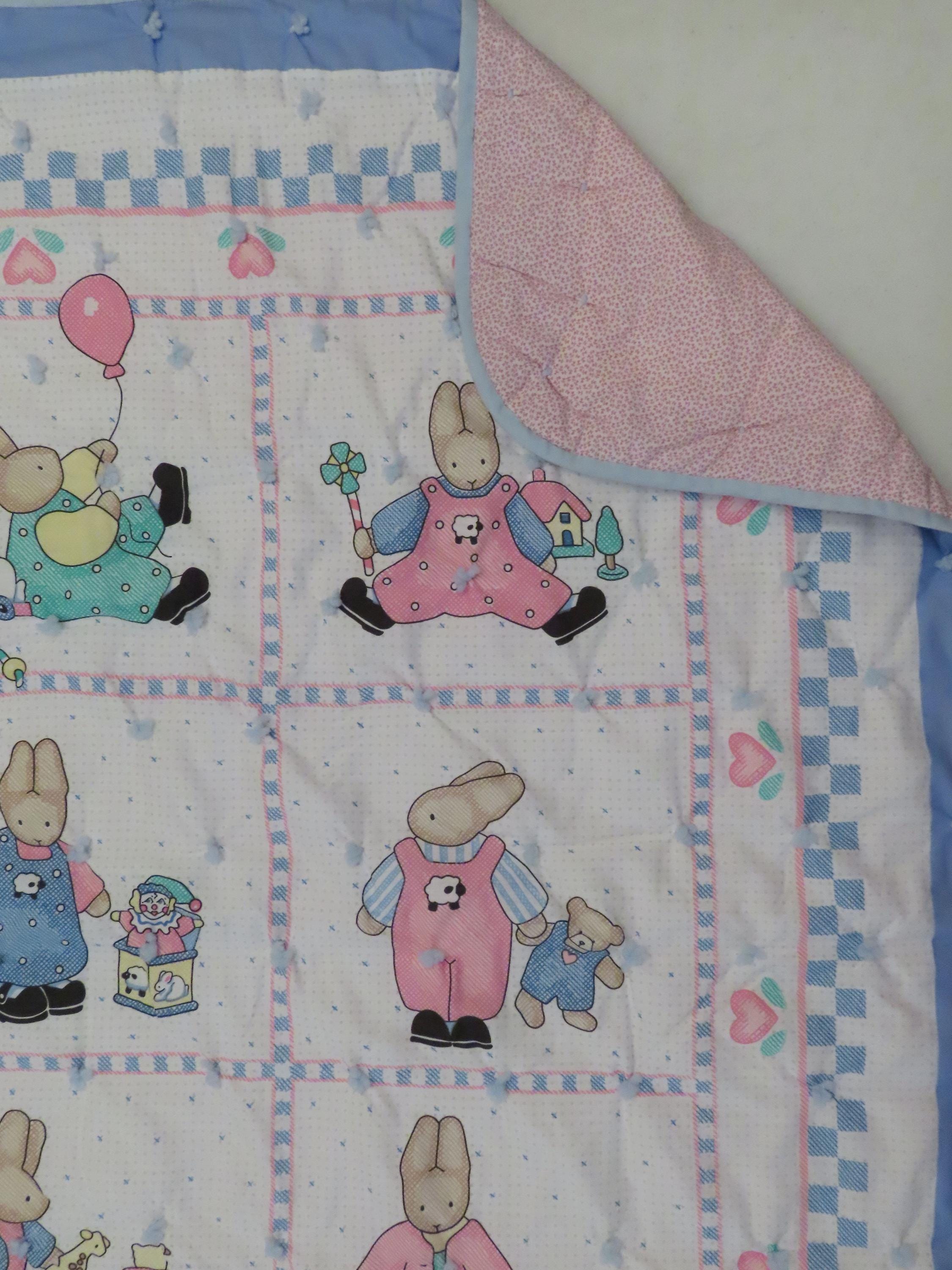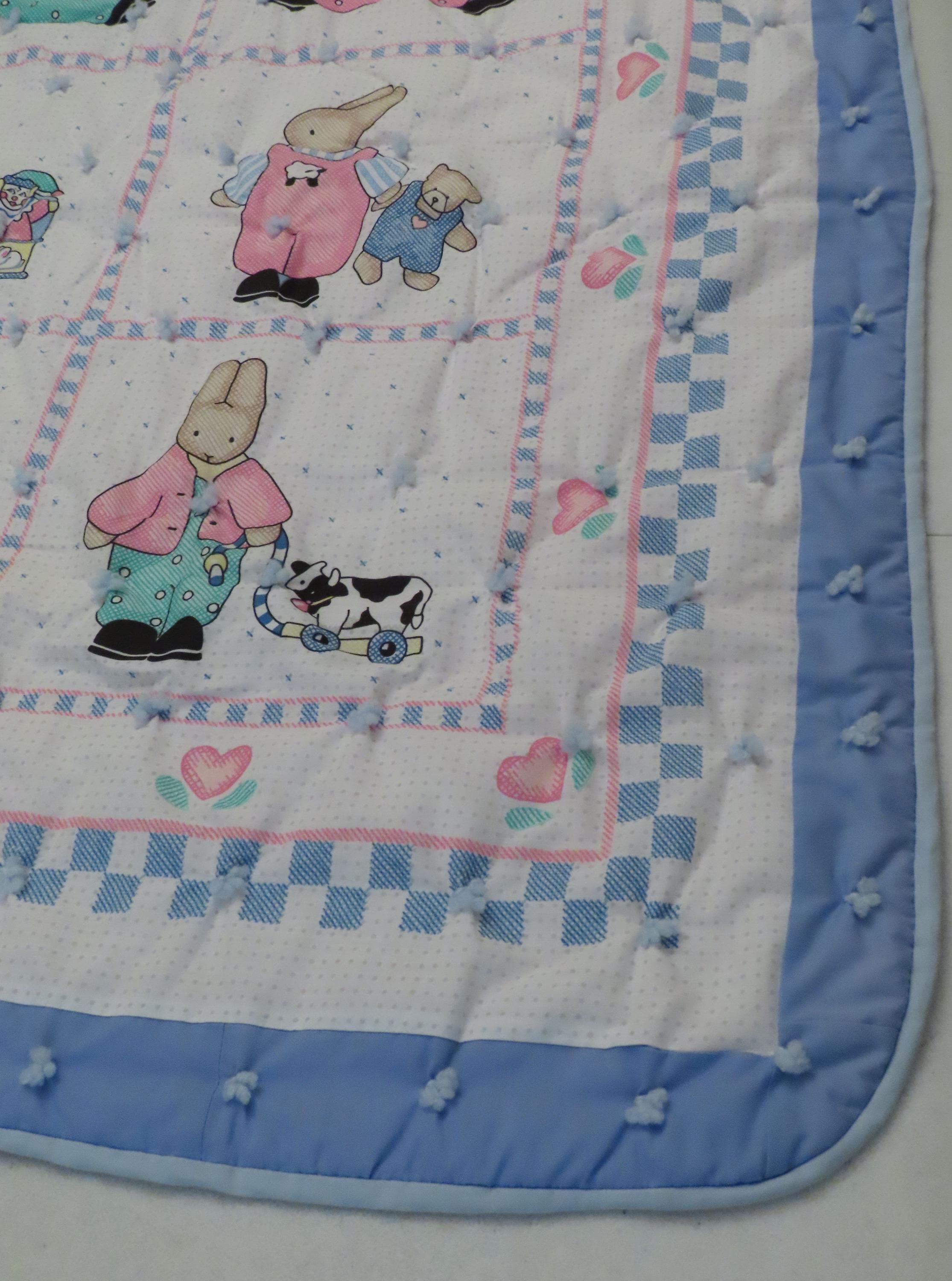 Vintage Cute Bunnies small blanket which is about 46.5" tall by 38.5" wide (119 cm by 97 cm). The edges are sewn a little unevenly, and the fabric bunches up around the yarn ties some. It has a few tiny holes, thread snags, and a small hole in the stitching which has formed a hole.