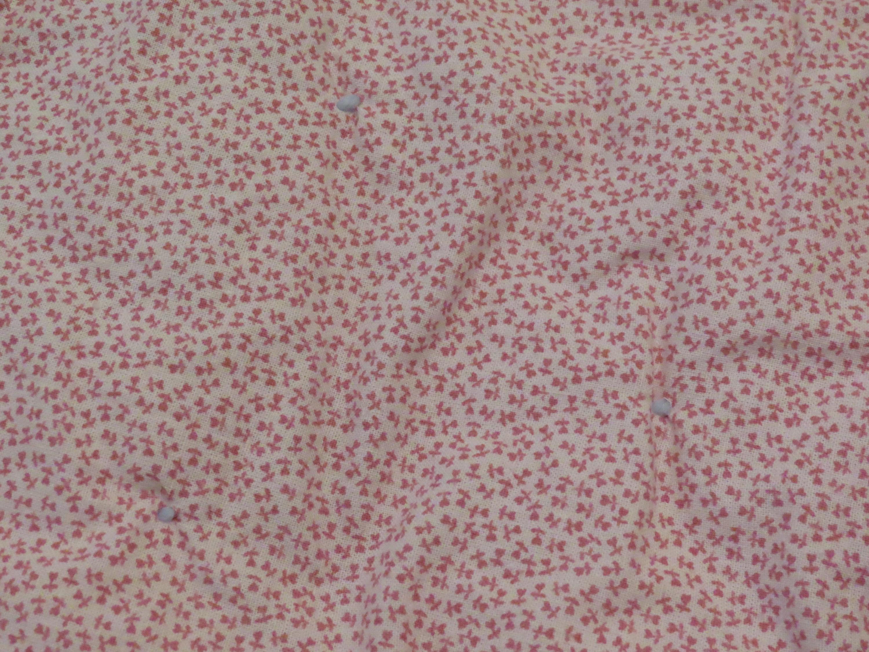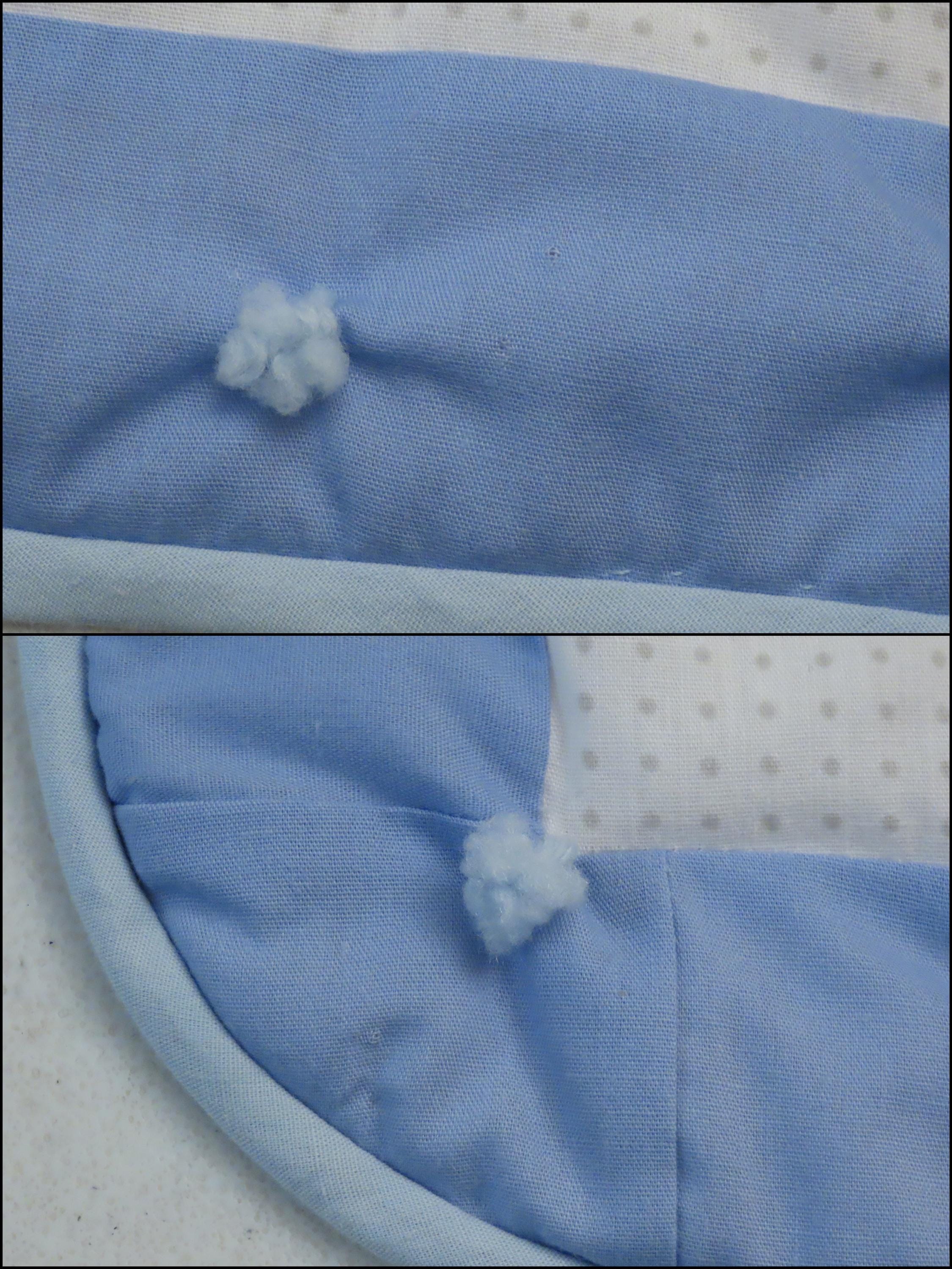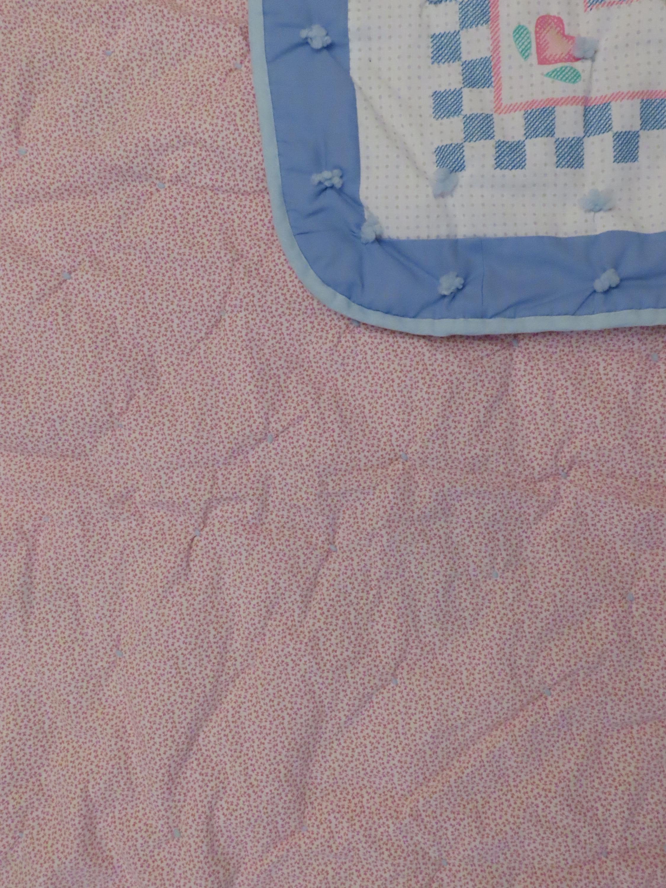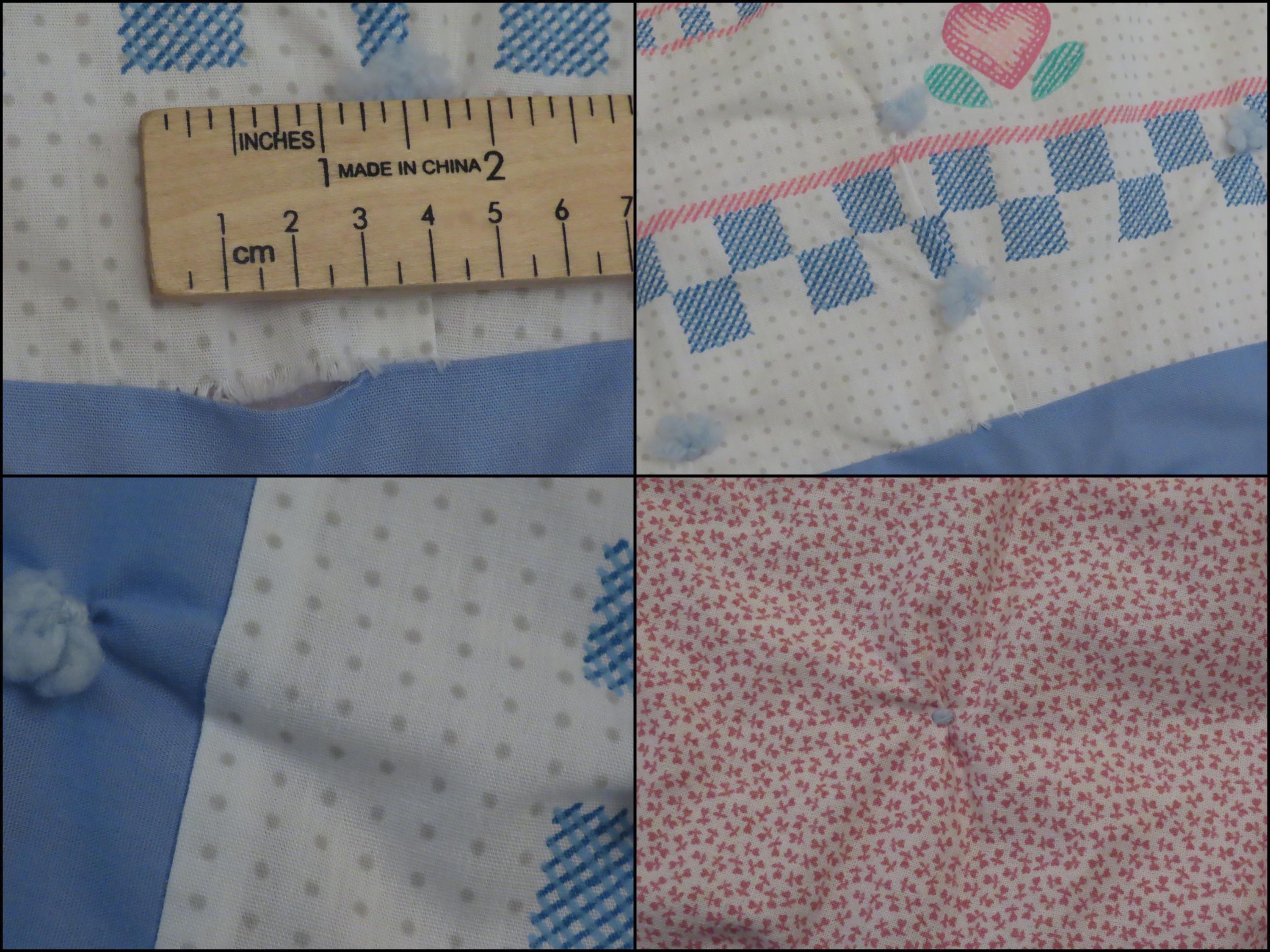 Vintage Cute Bunnies small blanket which is about 46.5" tall by 38.5" wide (119 cm by 97 cm). The edges are sewn a little unevenly, and the fabric bunches up around the yarn ties some. It has a few tiny holes, thread snags, and a small hole in the stitching which has formed a hole.