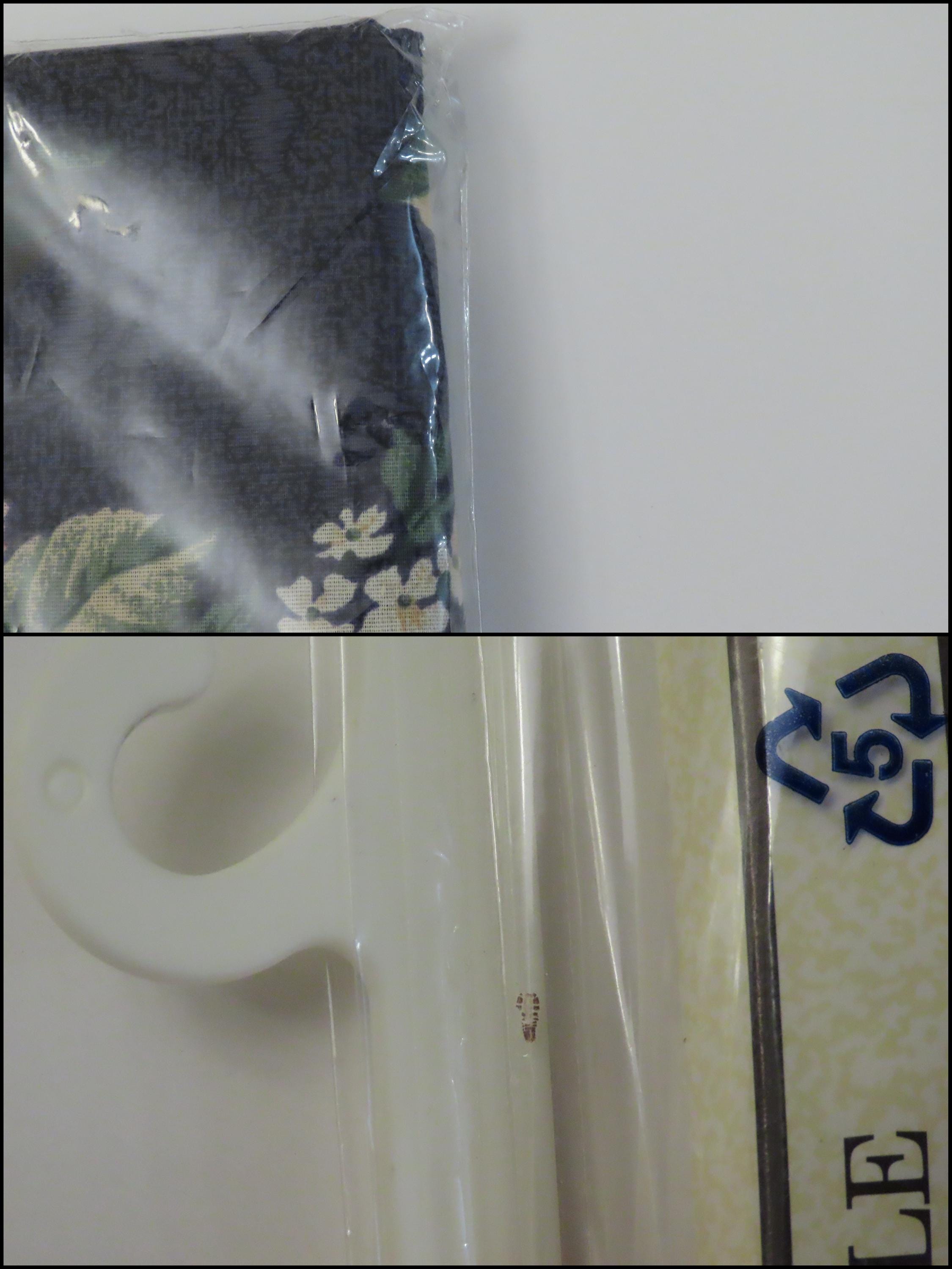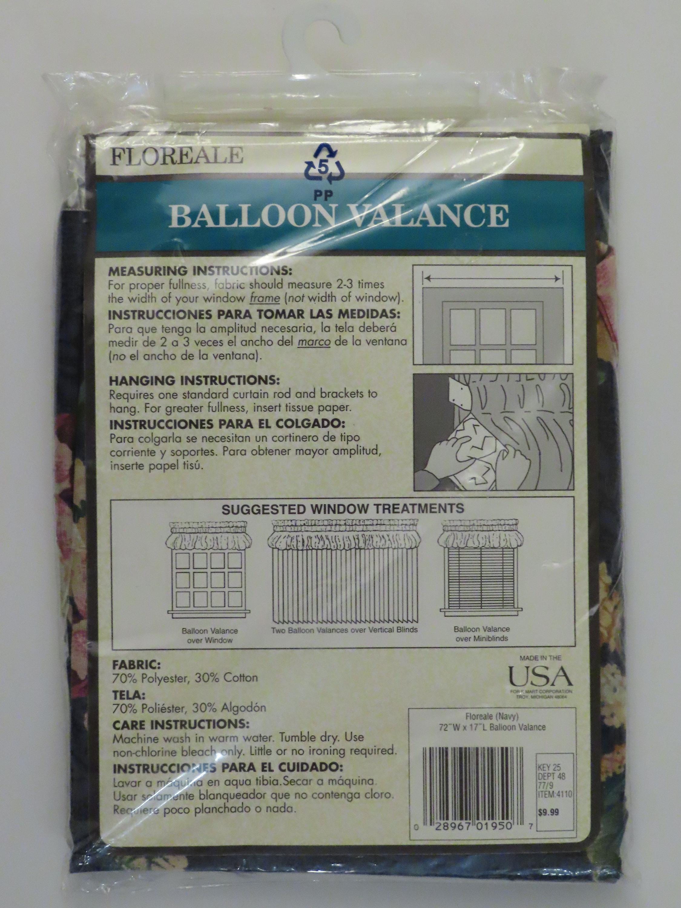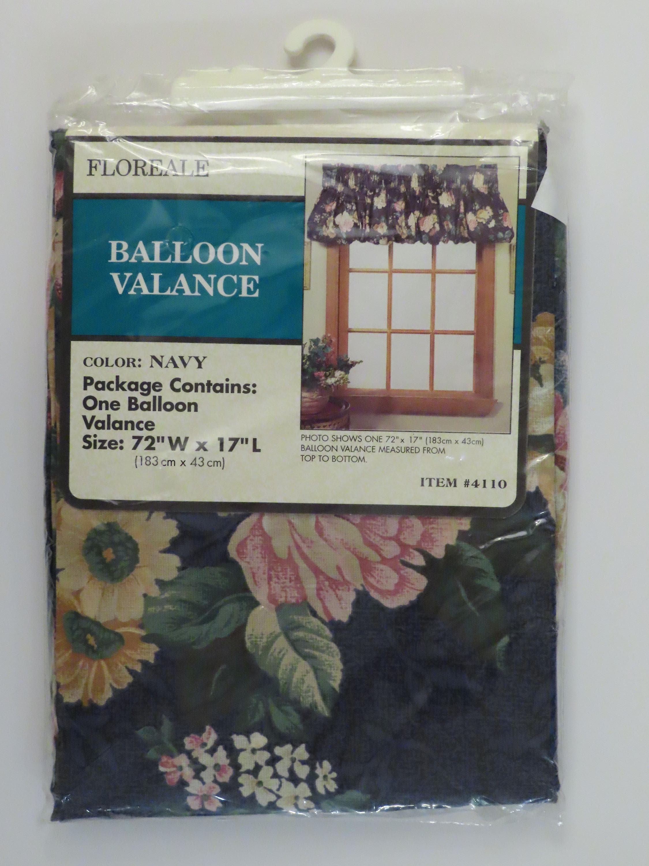 Vintage Floreale brand floral balloon valance which is new in the package. It is 70% polyester/30% cotton, and is 72" w by 17" long (183 cm by 43 cm). The plastic packaging is a little worn. The plastic packaging has a small mark and some creases.