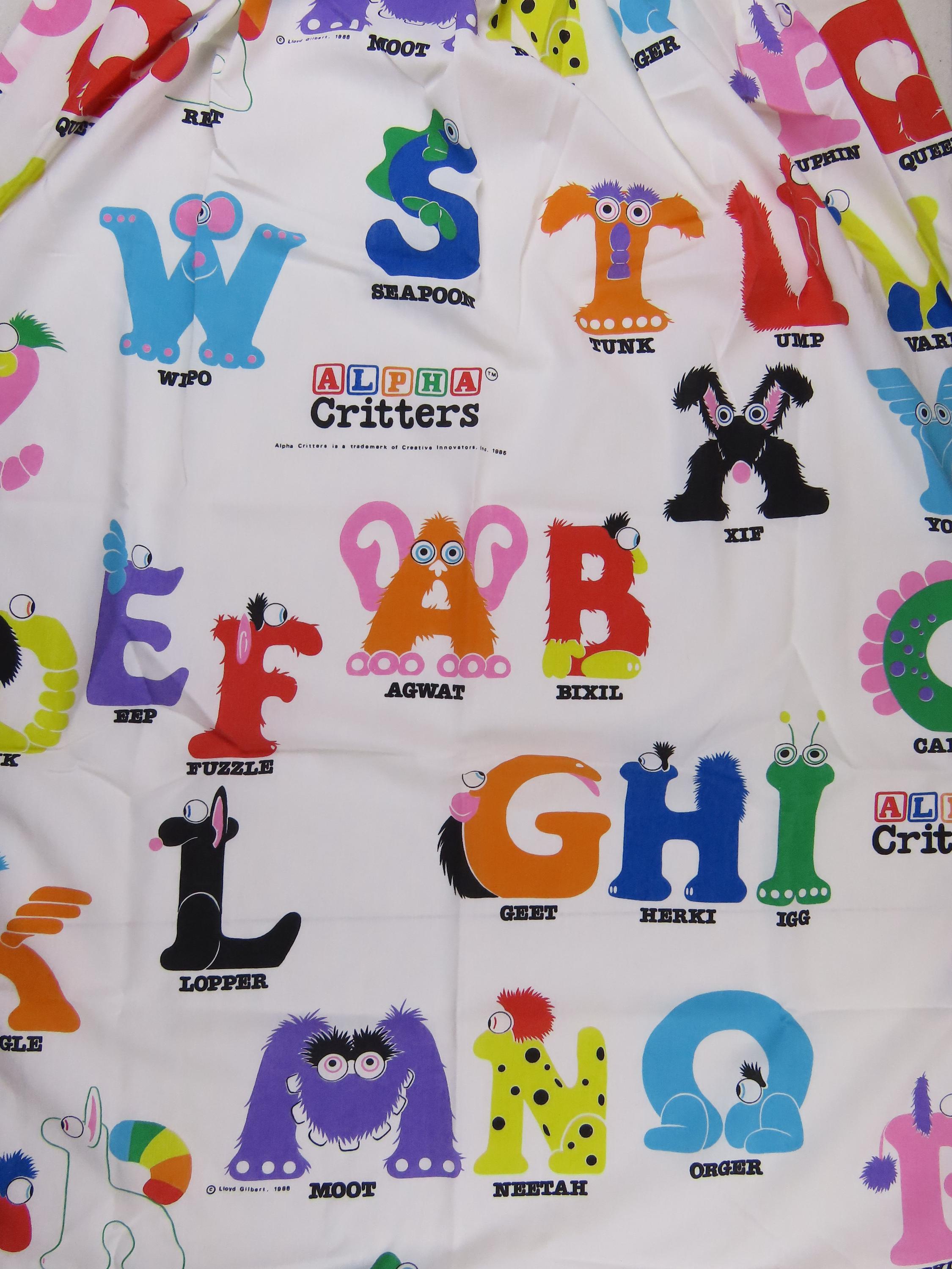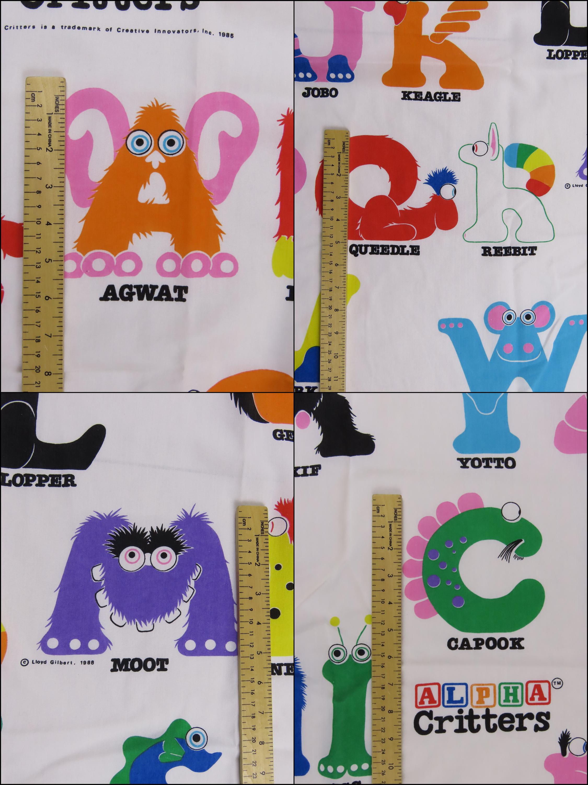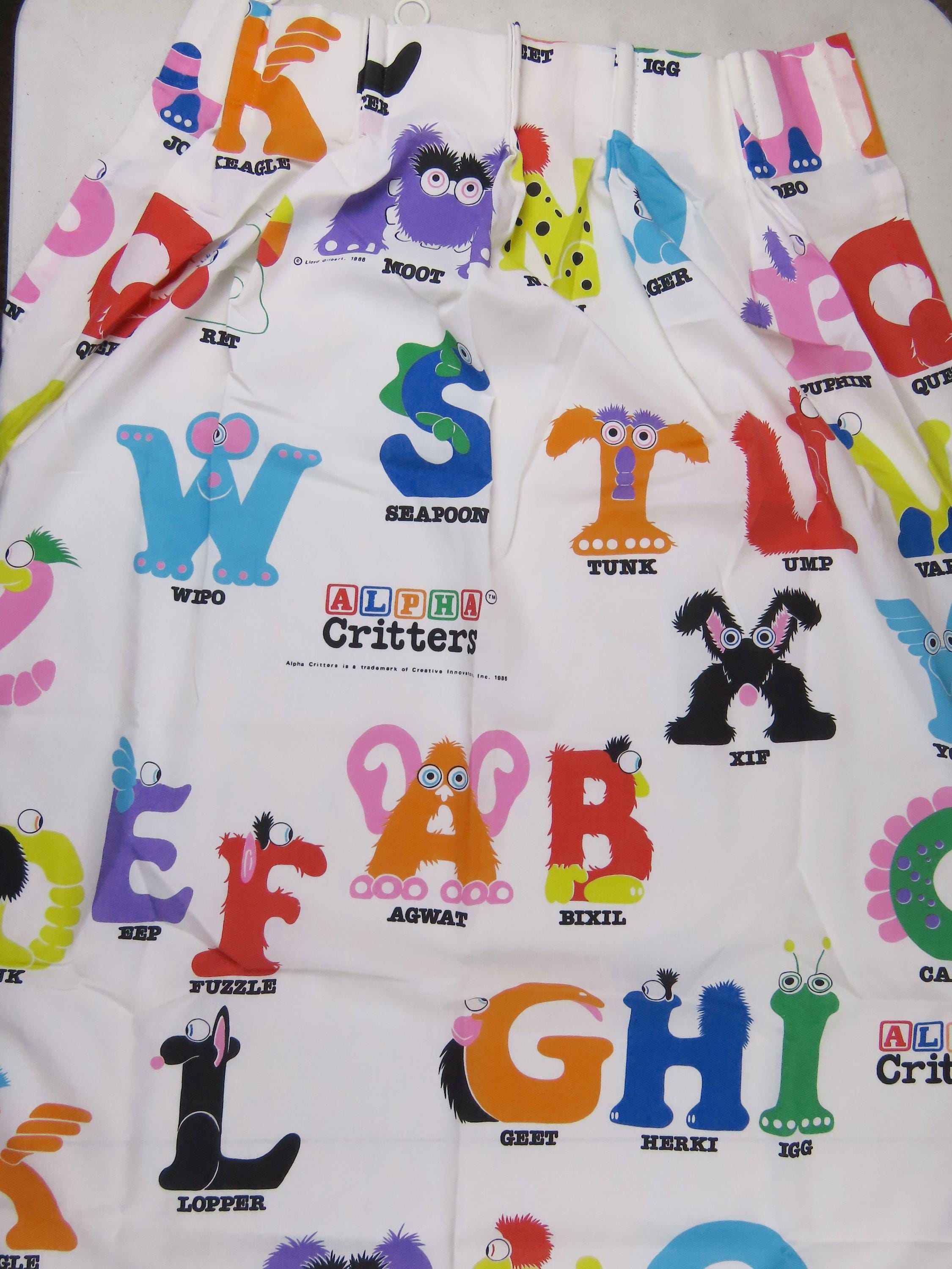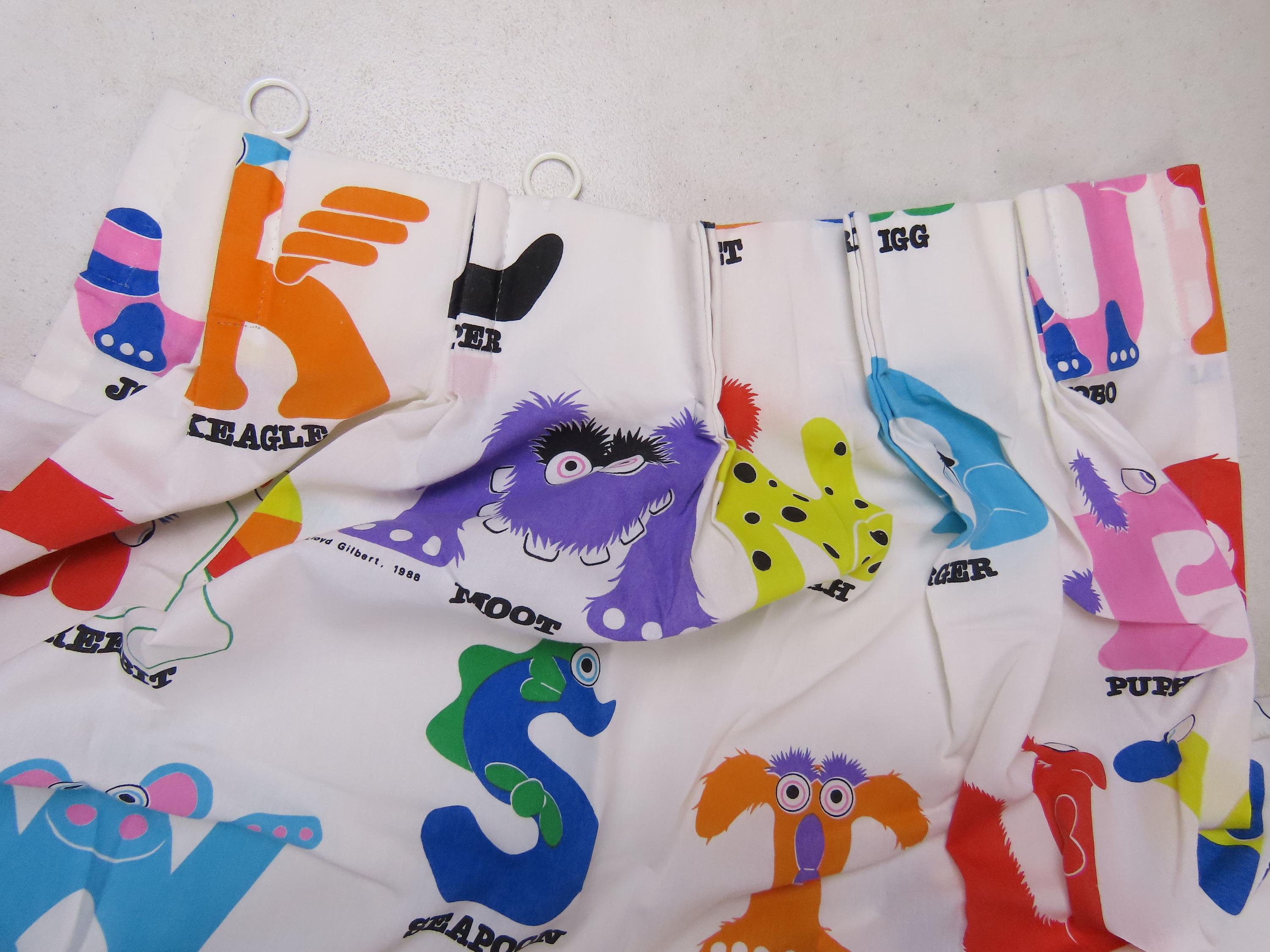 Set of 4 vintage Alpha Critters pinch pleat curtain panels from 1986. They are about 27.5" long by 42" wide at the bottom (160 cm by 107 cm). They are 23.5" wide at the top (60 cm). There are some plastic rings sewn along the top, but a lot are missing. They all have some loose threads, tiny white marks, and some tiny marks (looks like printing errors). They have thread snags, some thin spots, and the darker colors are a little worn. The area where it is pleated seems slightly discolored. They are worn along the edges/stitching.
