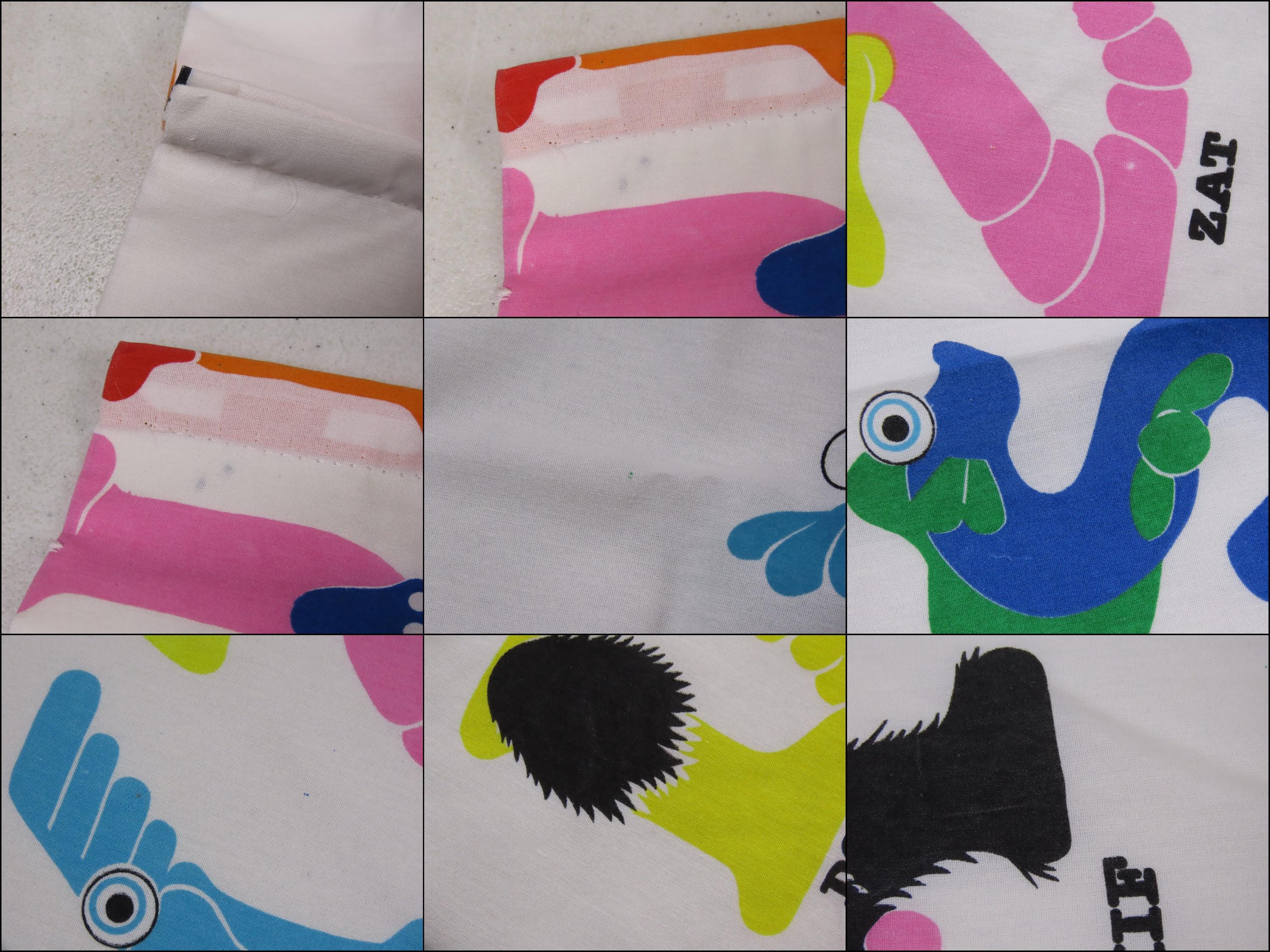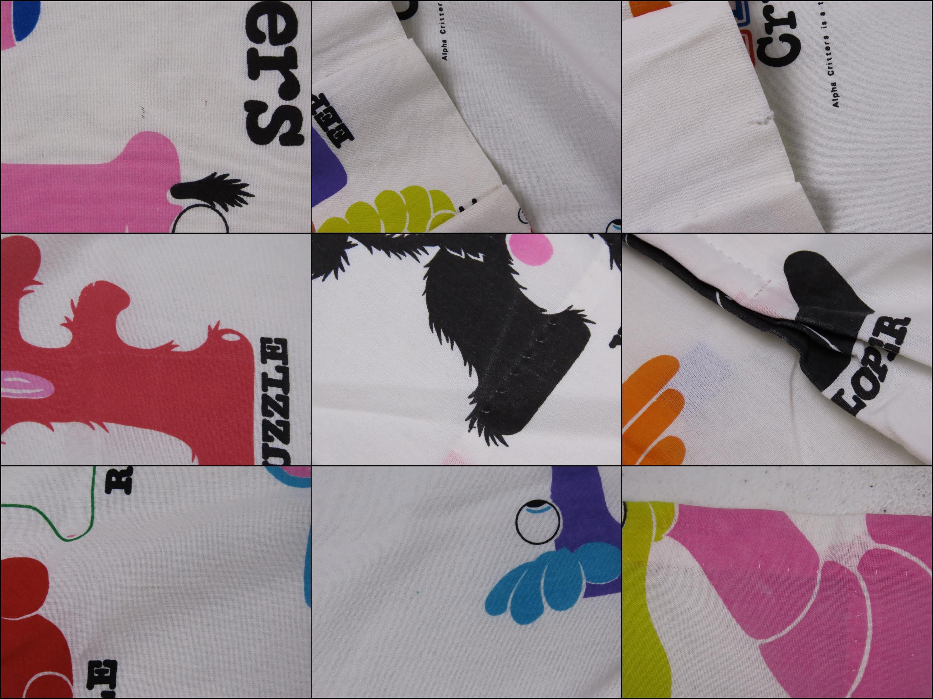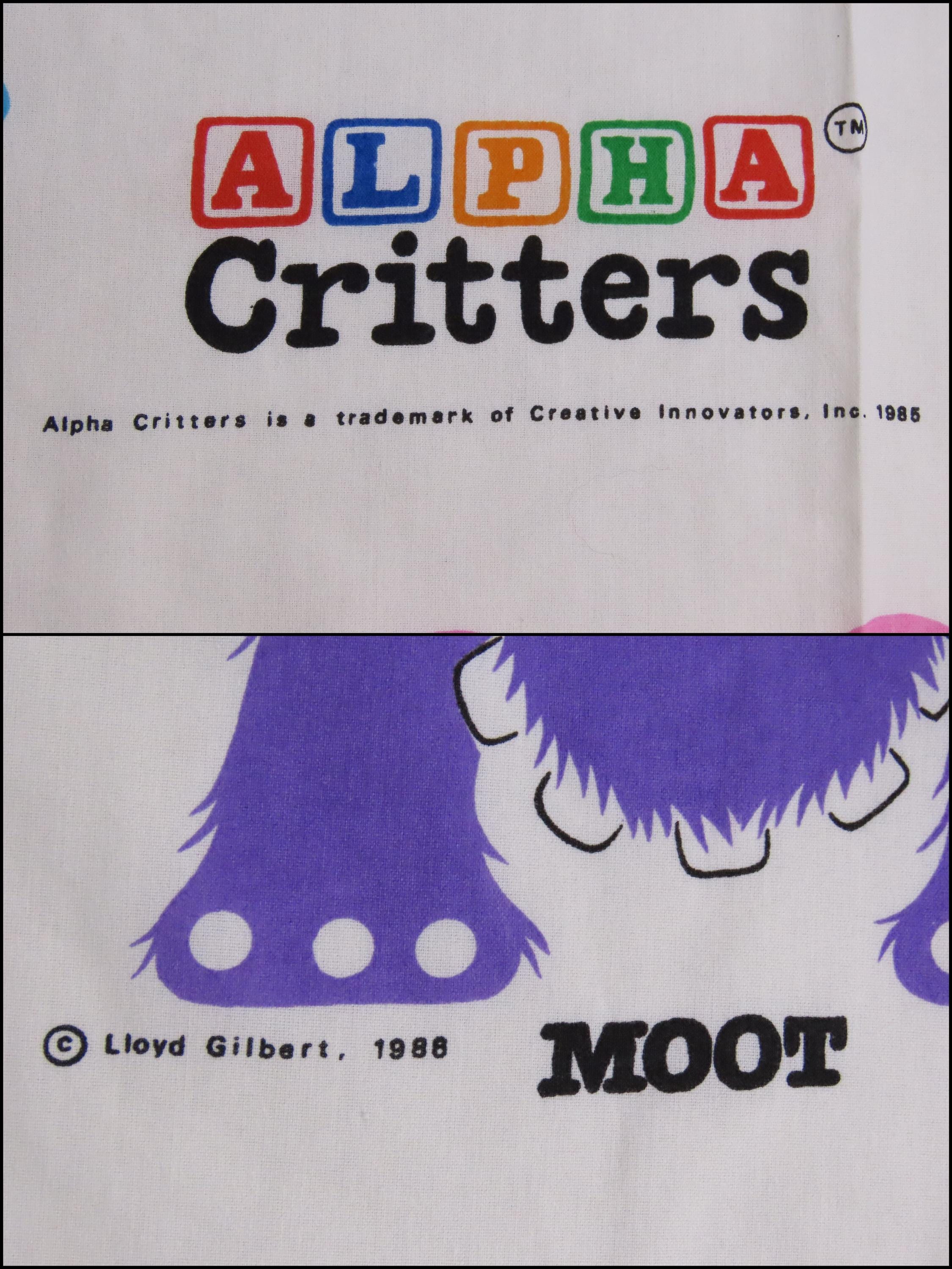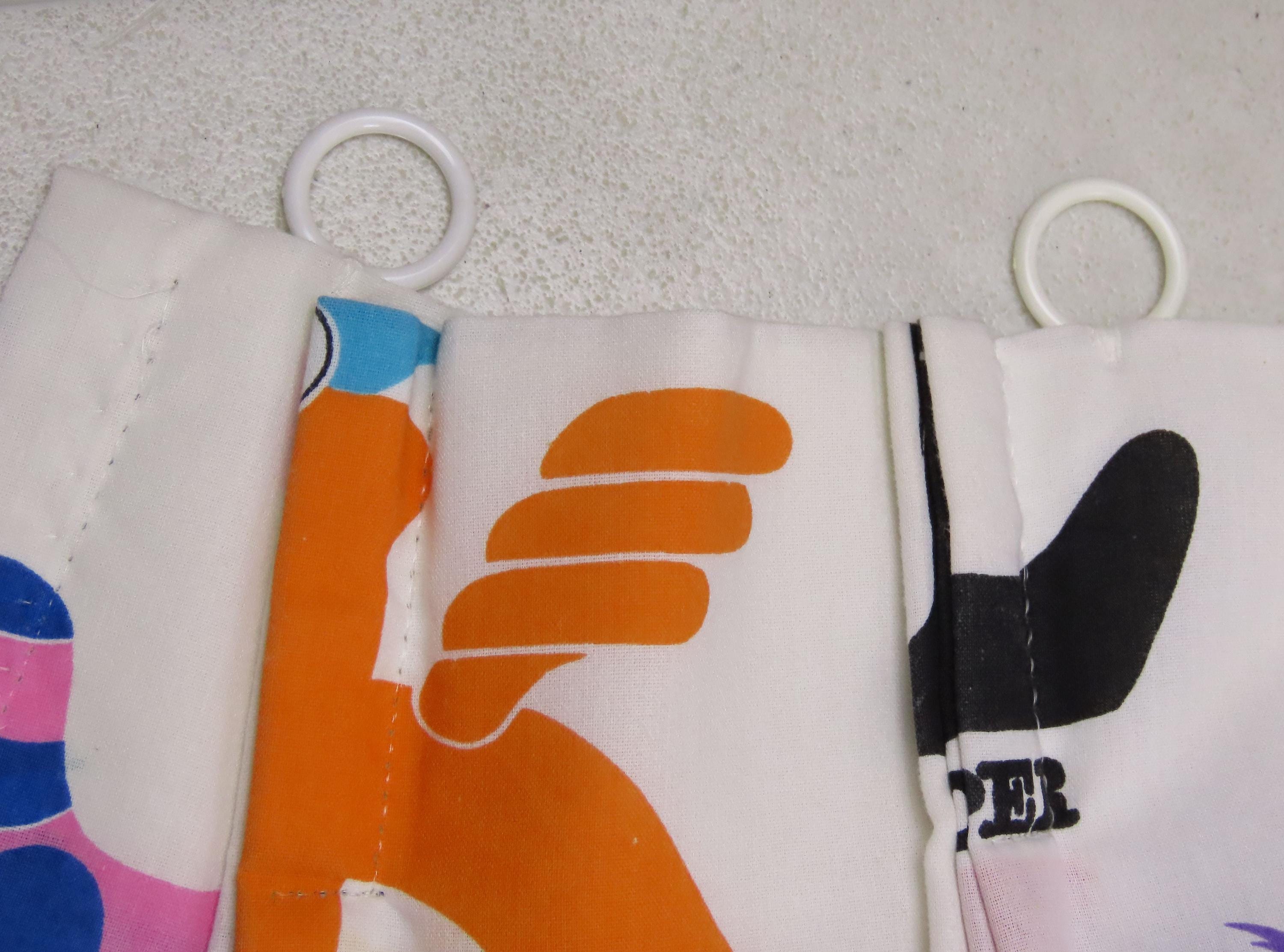 Set of 4 vintage Alpha Critters pinch pleat curtain panels from 1986. They are about 27.5" long by 42" wide at the bottom (160 cm by 107 cm). They are 23.5" wide at the top (60 cm). There are some plastic rings sewn along the top, but a lot are missing. They all have some loose threads, tiny white marks, and some tiny marks (looks like printing errors). They have thread snags, some thin spots, and the darker colors are a little worn. The area where it is pleated seems slightly discolored. They are worn along the edges/stitching.