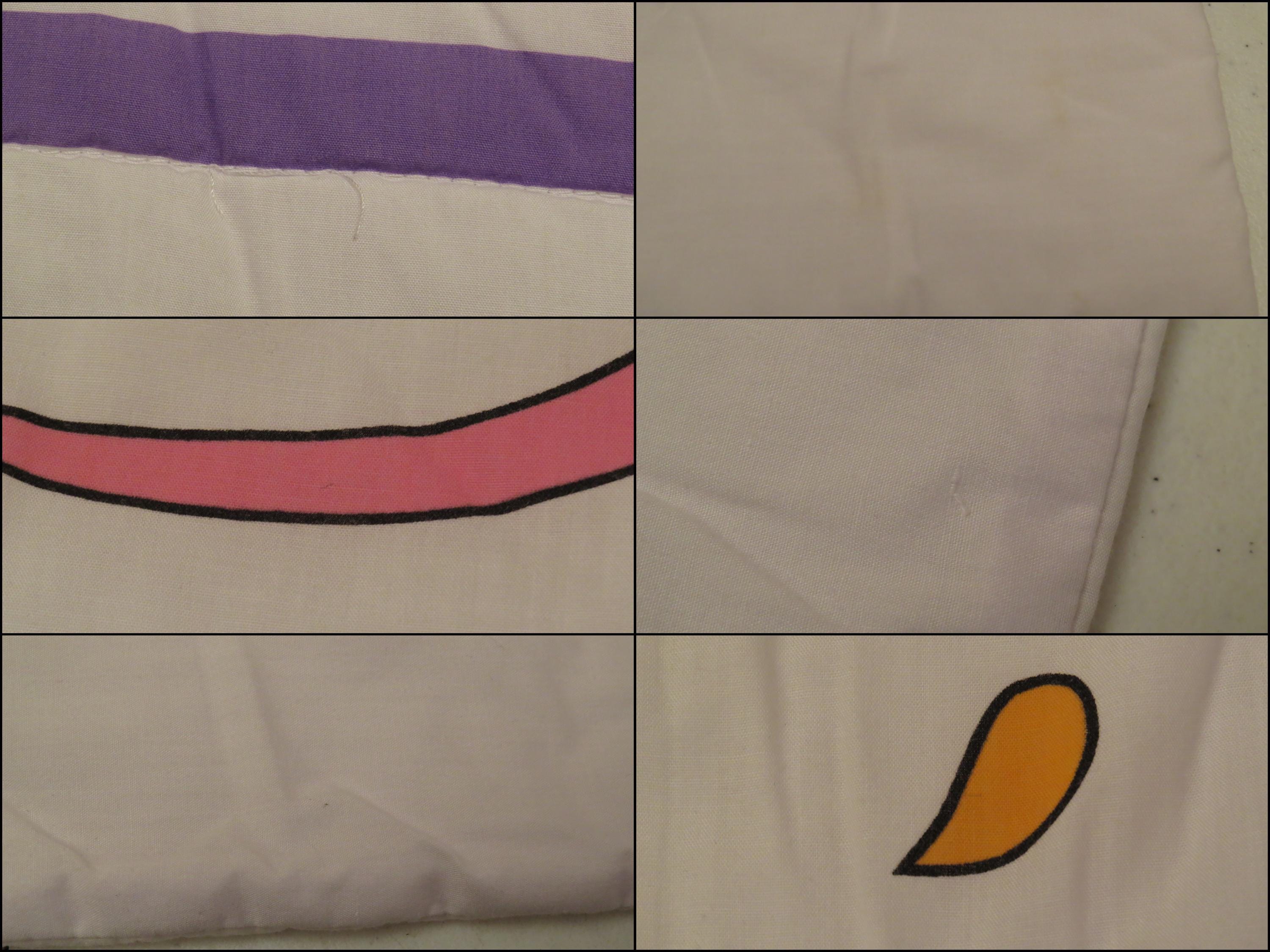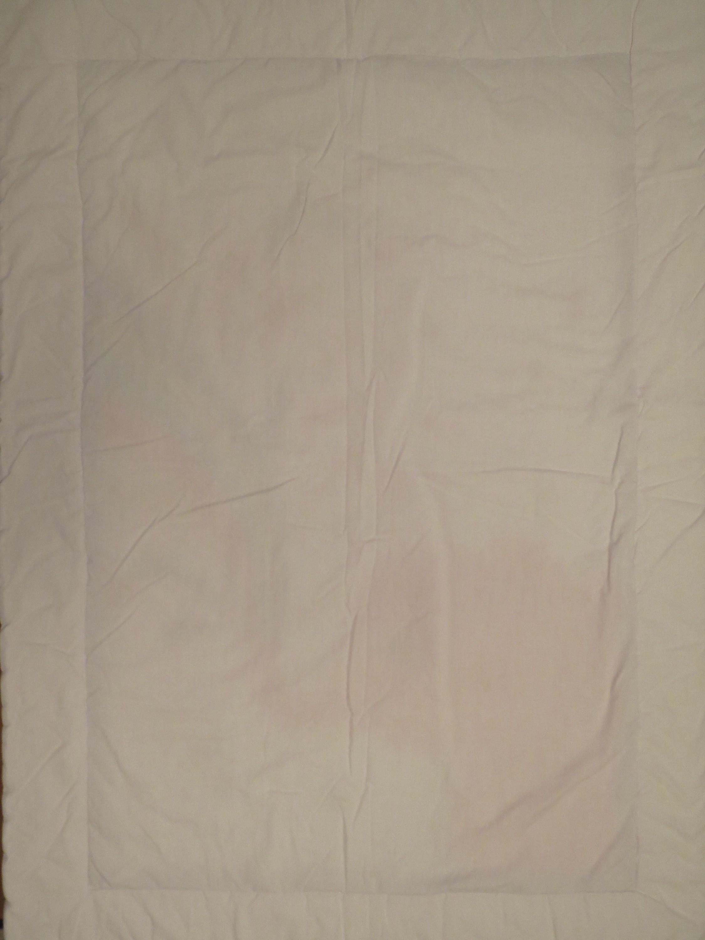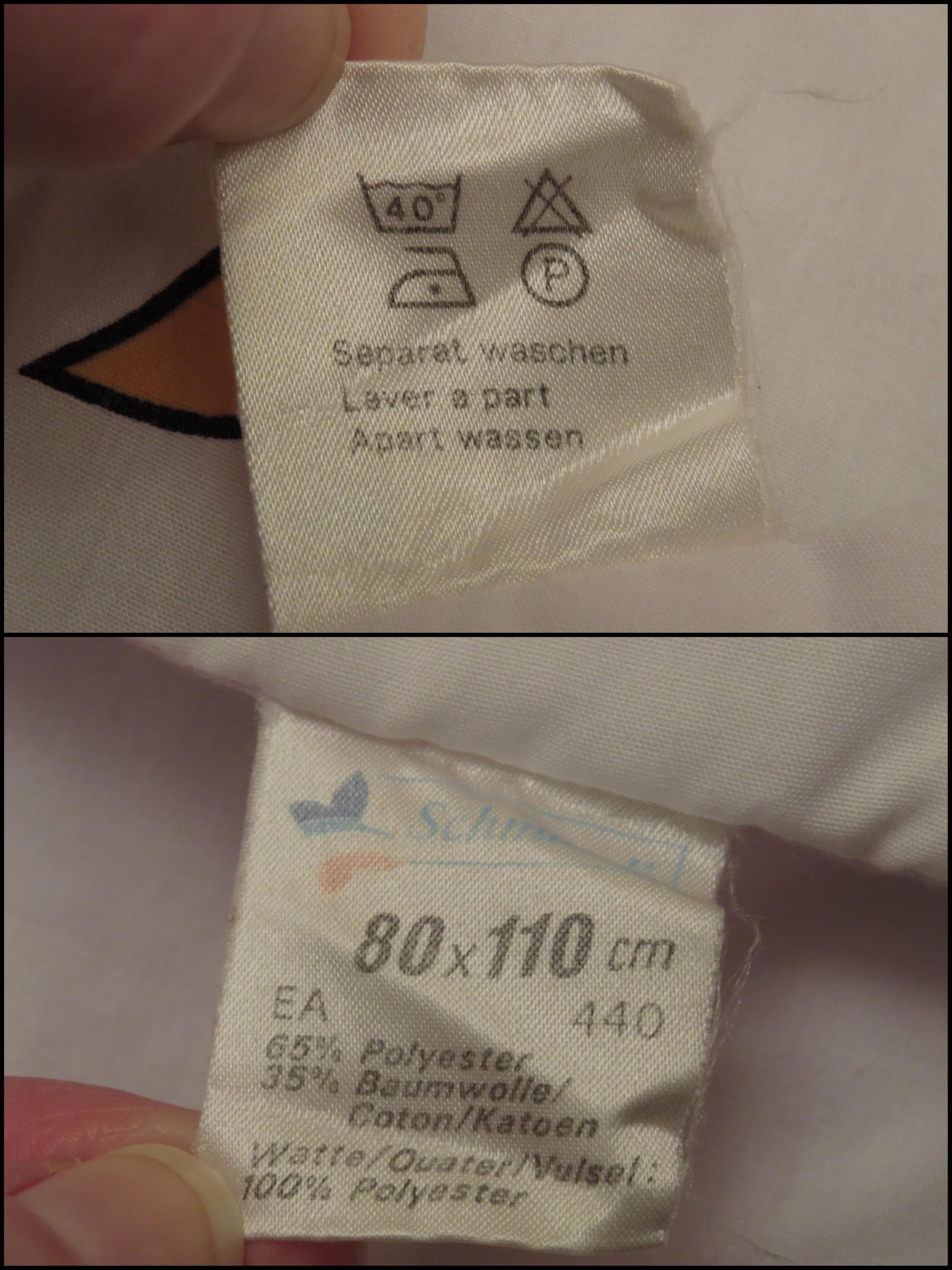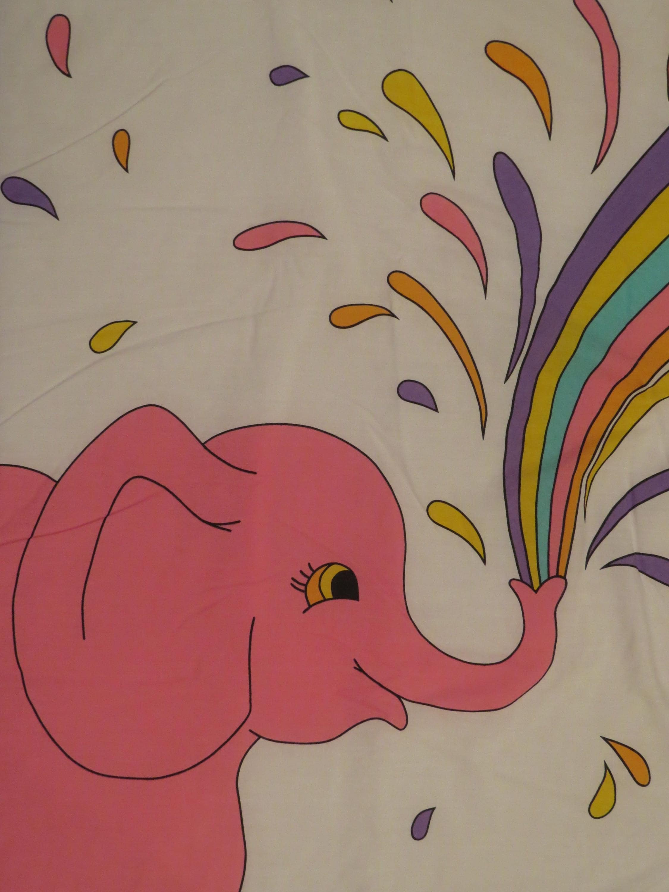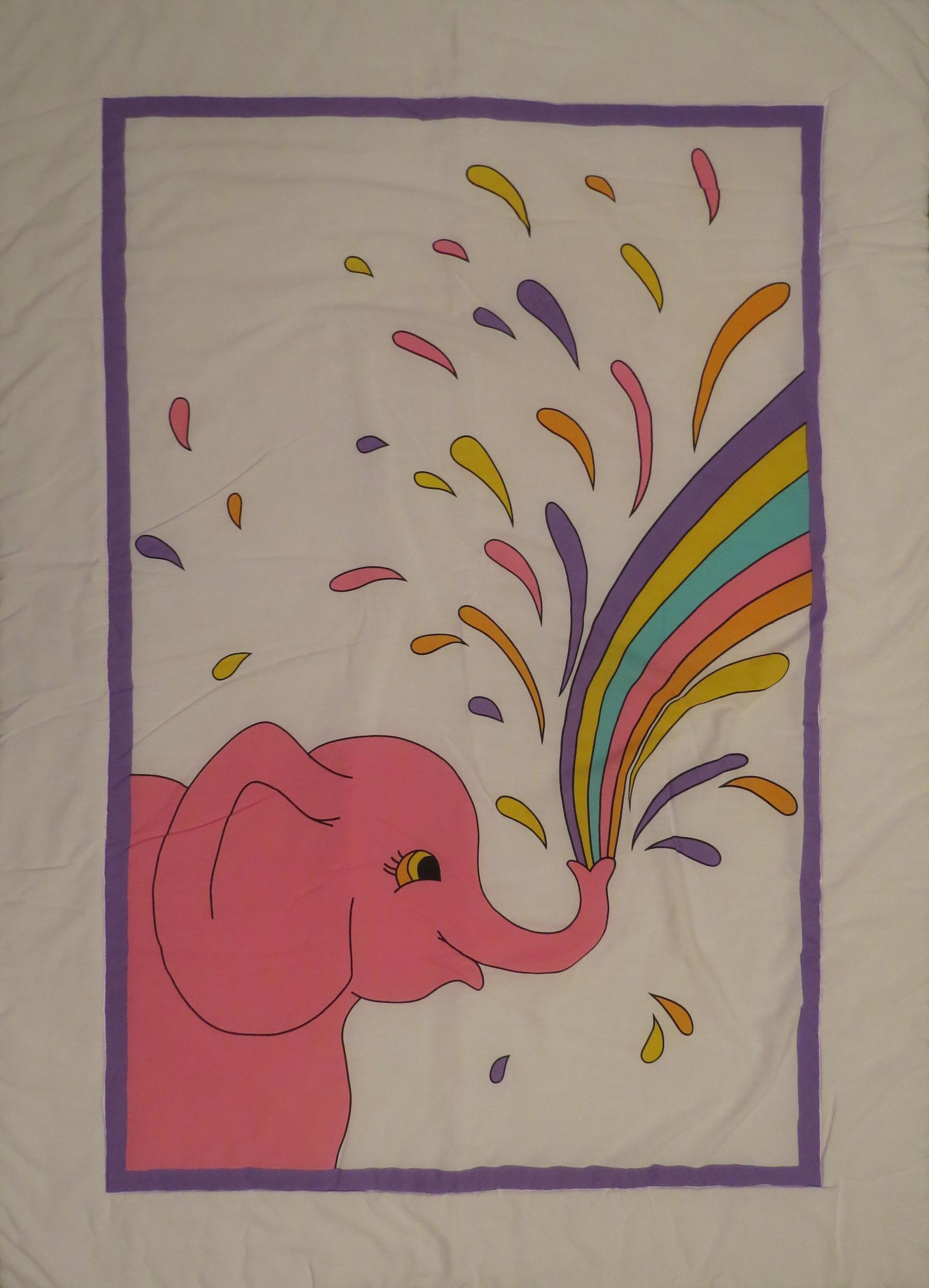 Vintage pink elephant crib comforter by Schmuseli which is 65% polyester and 35% cotton. It is about 43" tall by 31" wide. The filling/batting has settled unevenly and has folded over itself inside. It has a pinhole, thread snag, and the white looks like it might be slightly discolored in areas. There are some loose threads, tiny marks, and small light stains. It is a little bunched up along the stitching.