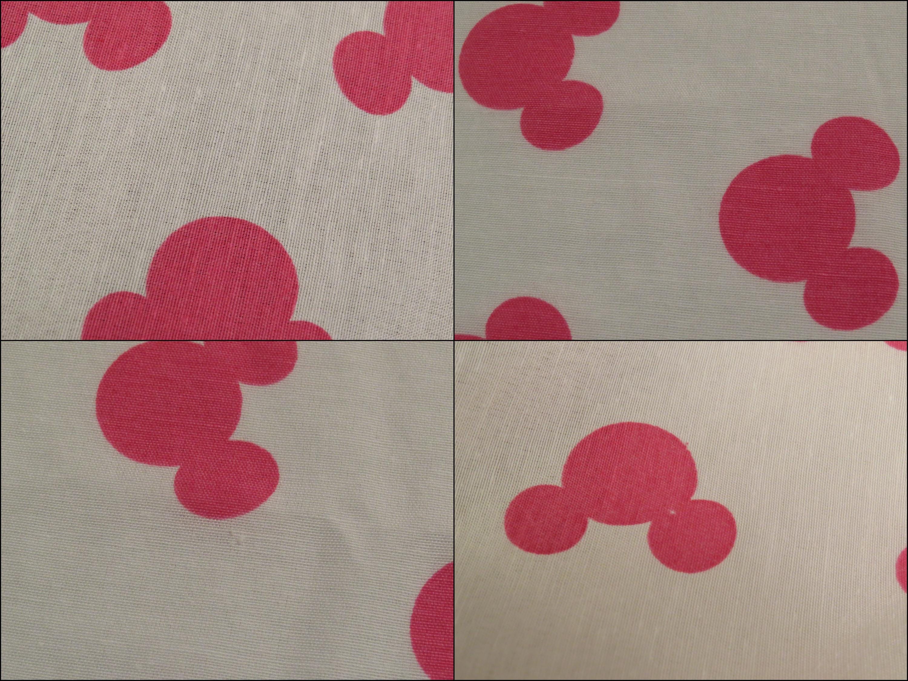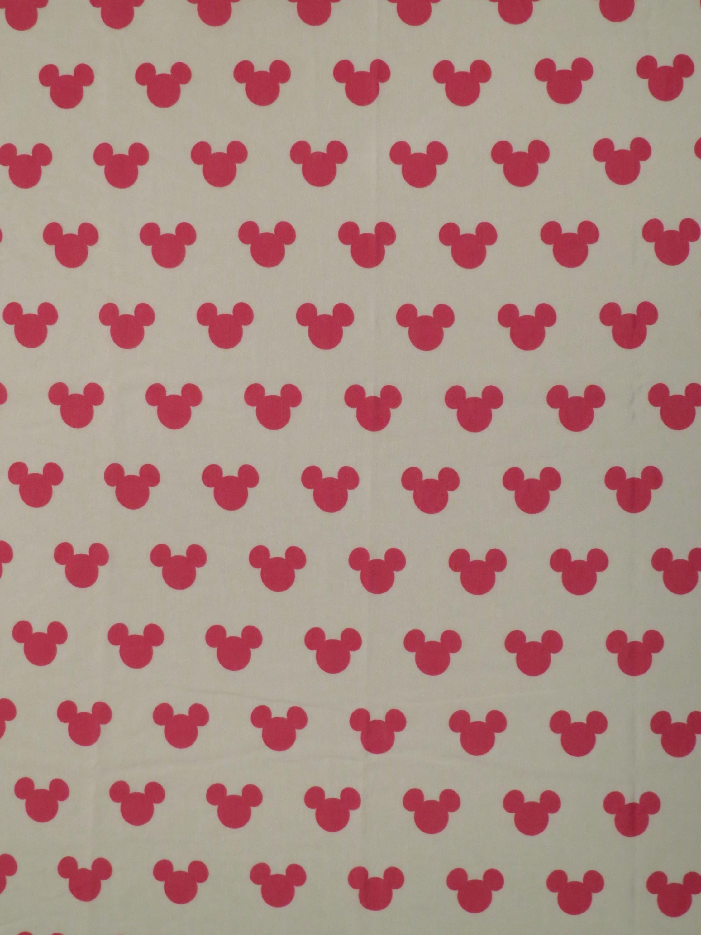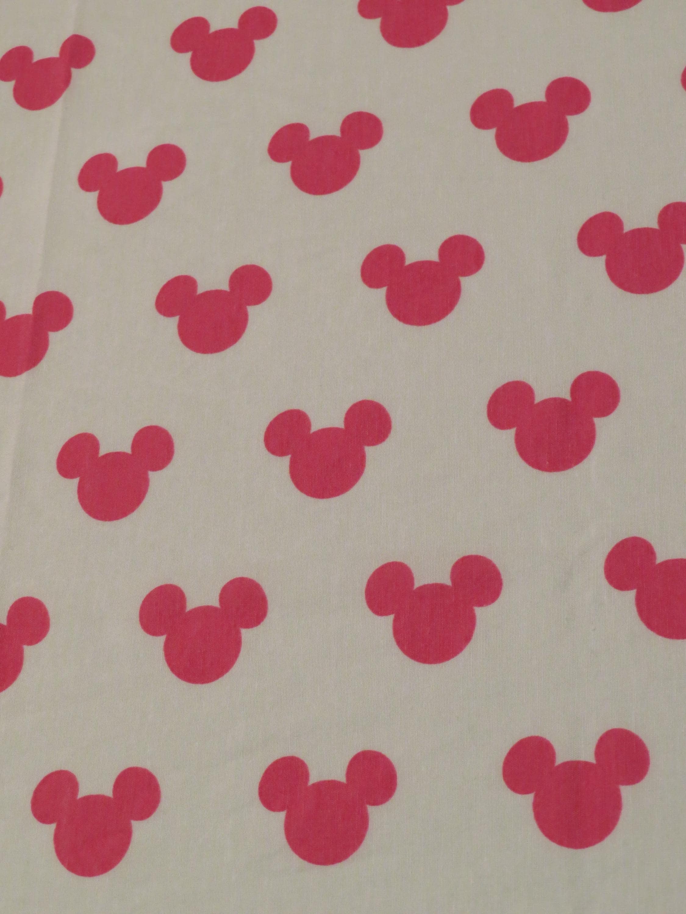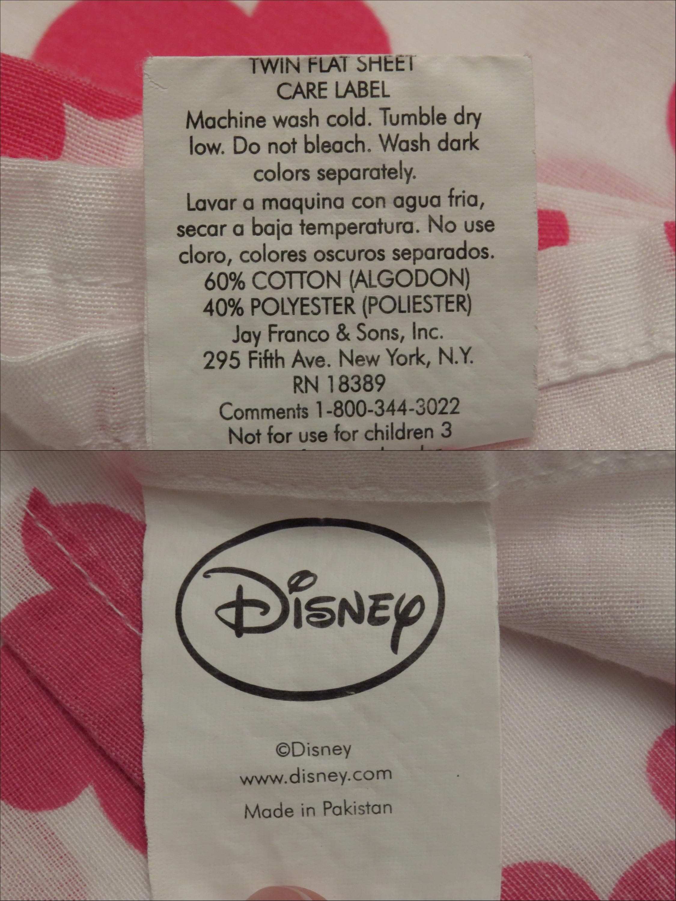 Vintage Mickey Mouse twin flat sheet which is 60% cotton and 40% polyester. There are thread snags, thin spots, and tiny white marks. It has a hard crease, and the colors are slightly streaky. There are fold/crease lines along the edges.