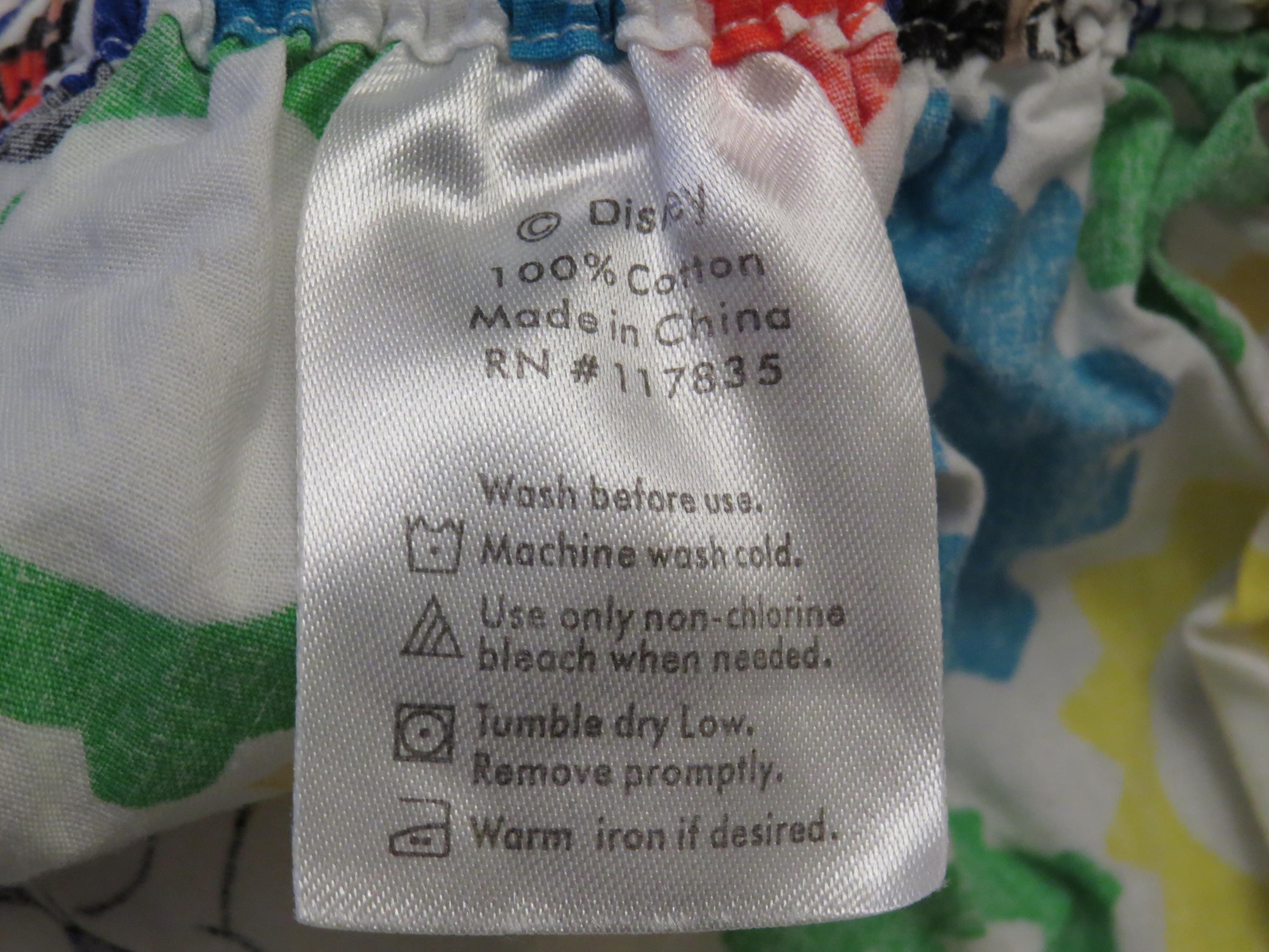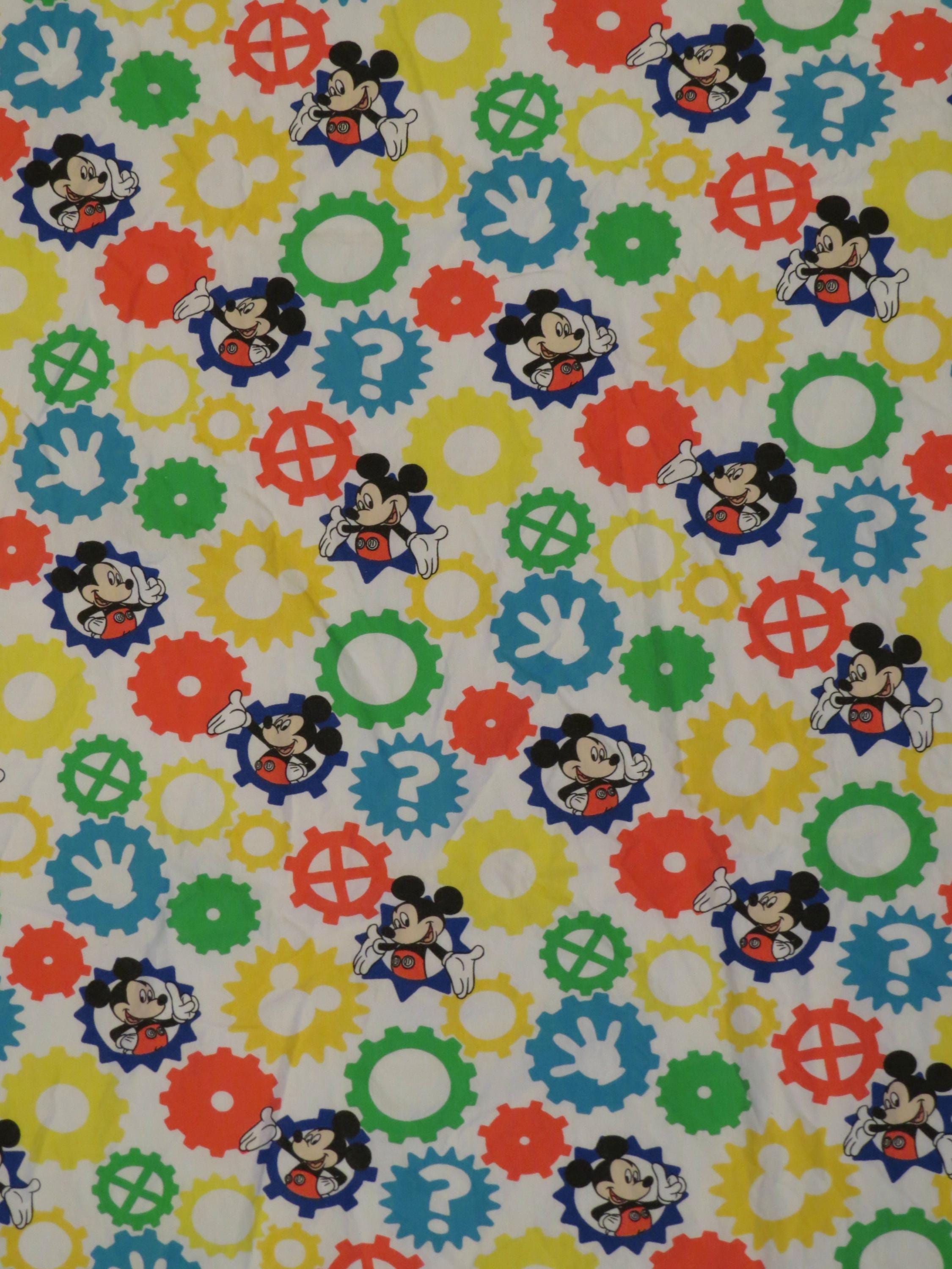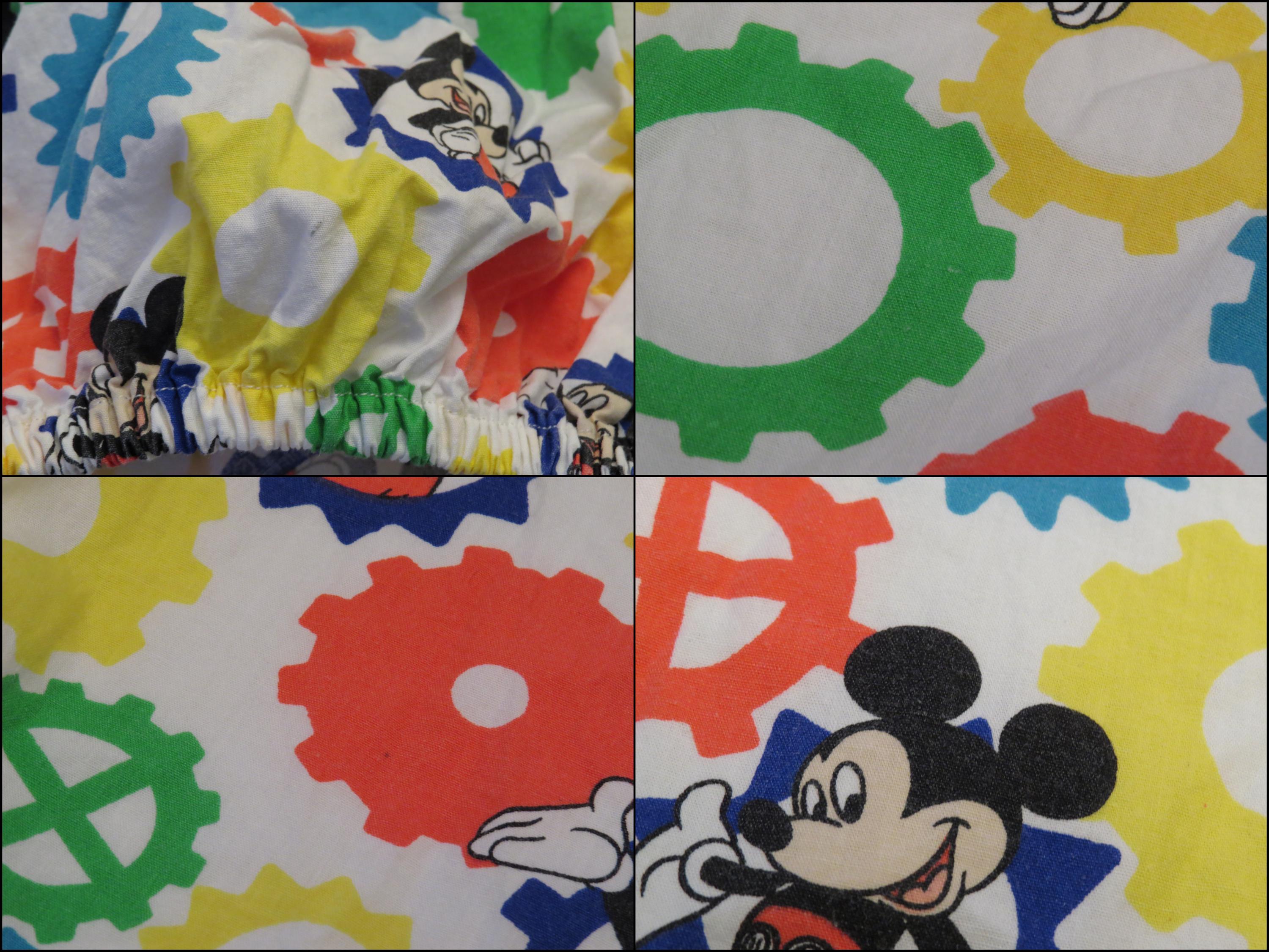 Vintage Mickey Mouse toddler top sheet which is 100% cotton. The bottom two corners are fitted. The fabric is a little worn, especially on the darker colors. It has a few tiny marks, and a few thread snags. There is a small mark near the edge.