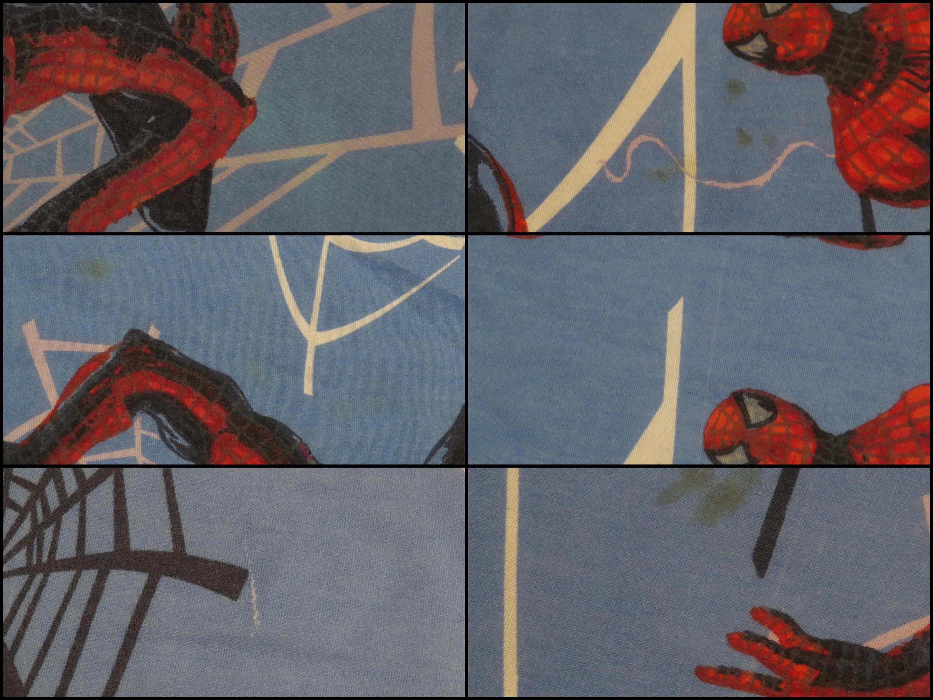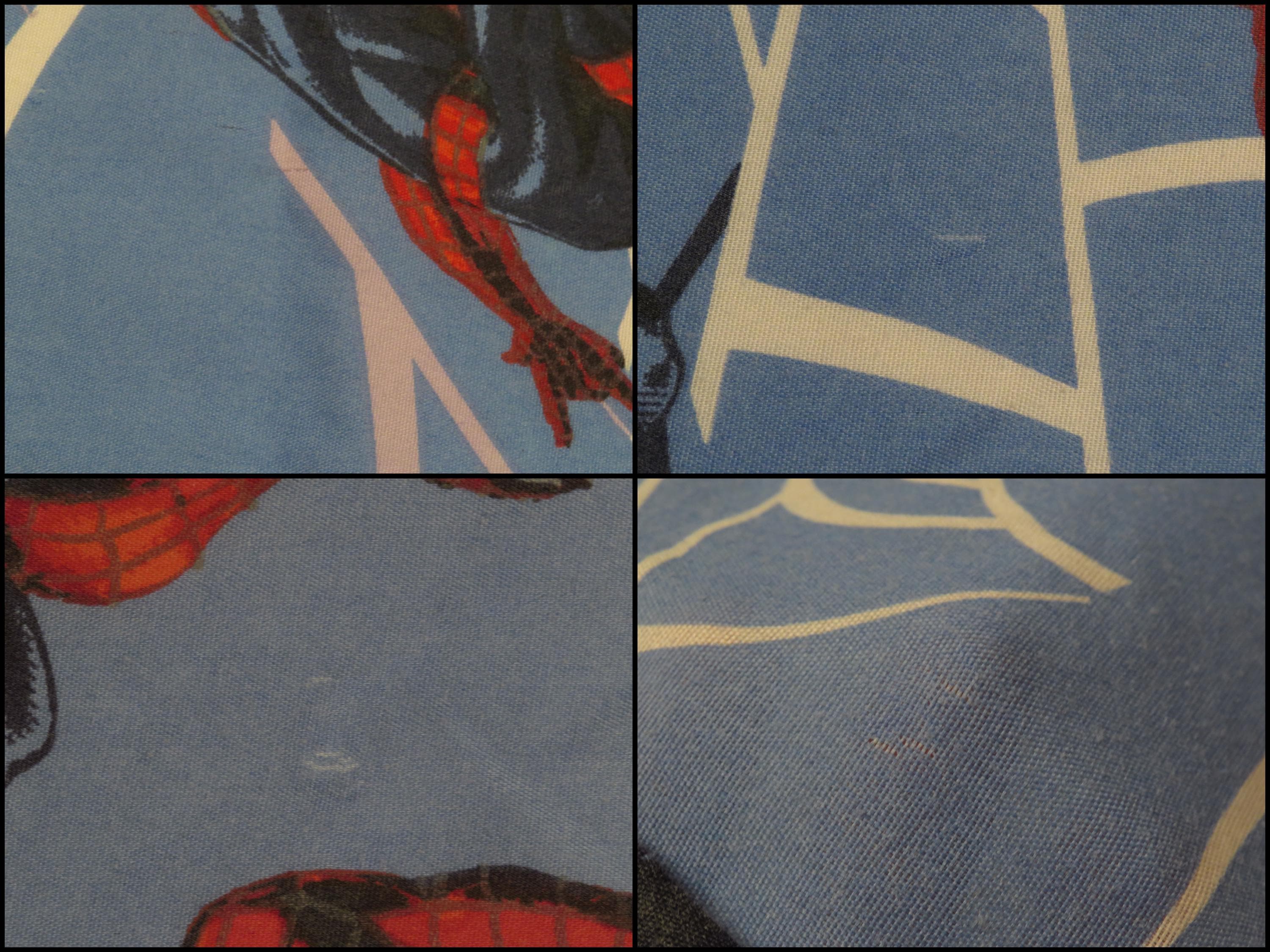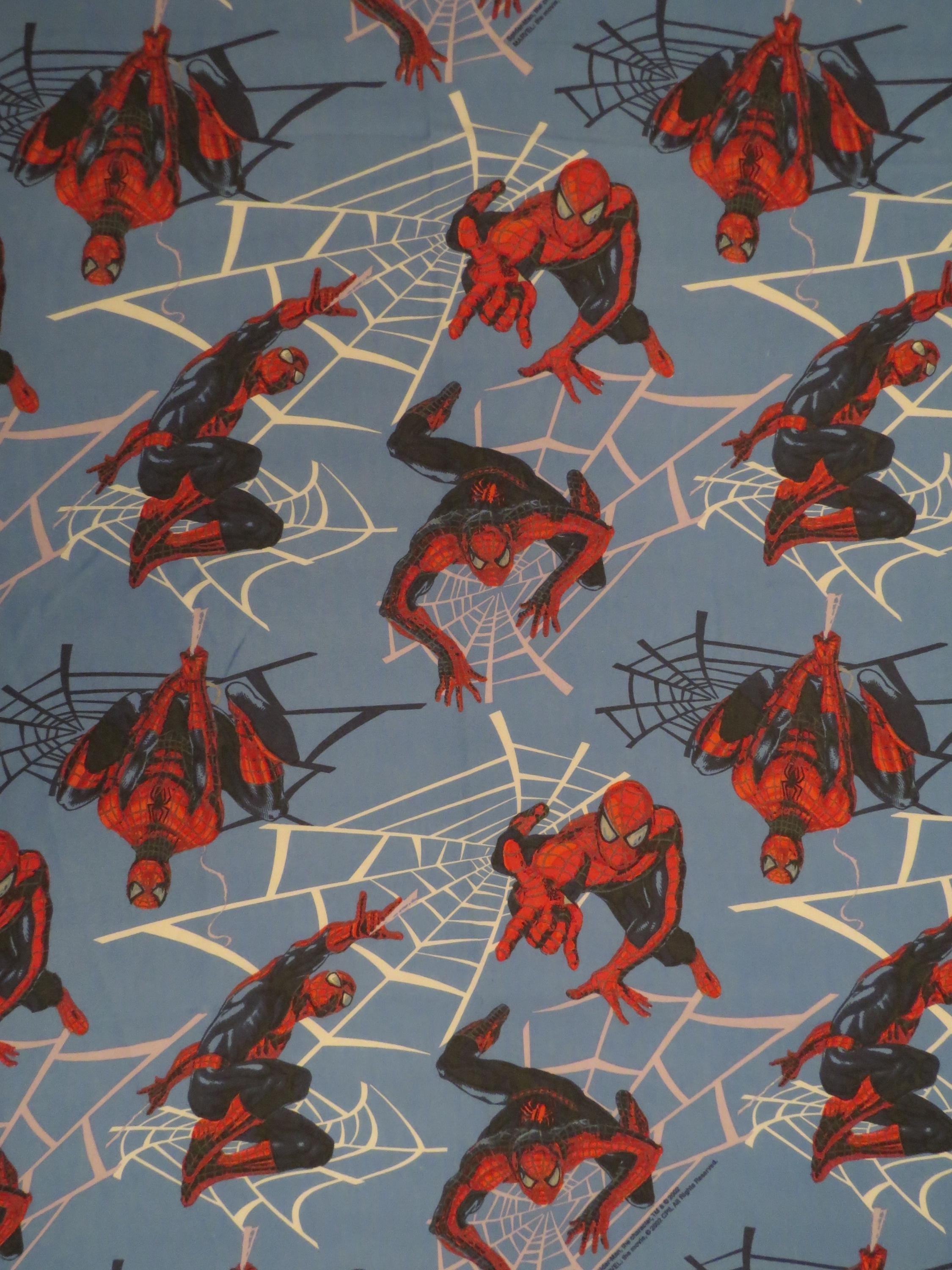 Vintage Spider-man twin flat and fitted sheets from 2002 which are 70% polyester and 30% cotton. The flat sheet has some thread snags, missing thread spots, and fold/crease lines along the edges. It has a small stain, thin spots that are almost holes/forming holes, and extremely light pilling in areas. The fitted sheet multiple small stains, missing thread spots, and fold/crease lines. The elastic is mostly worn out, and the sheet is worn along the edges.