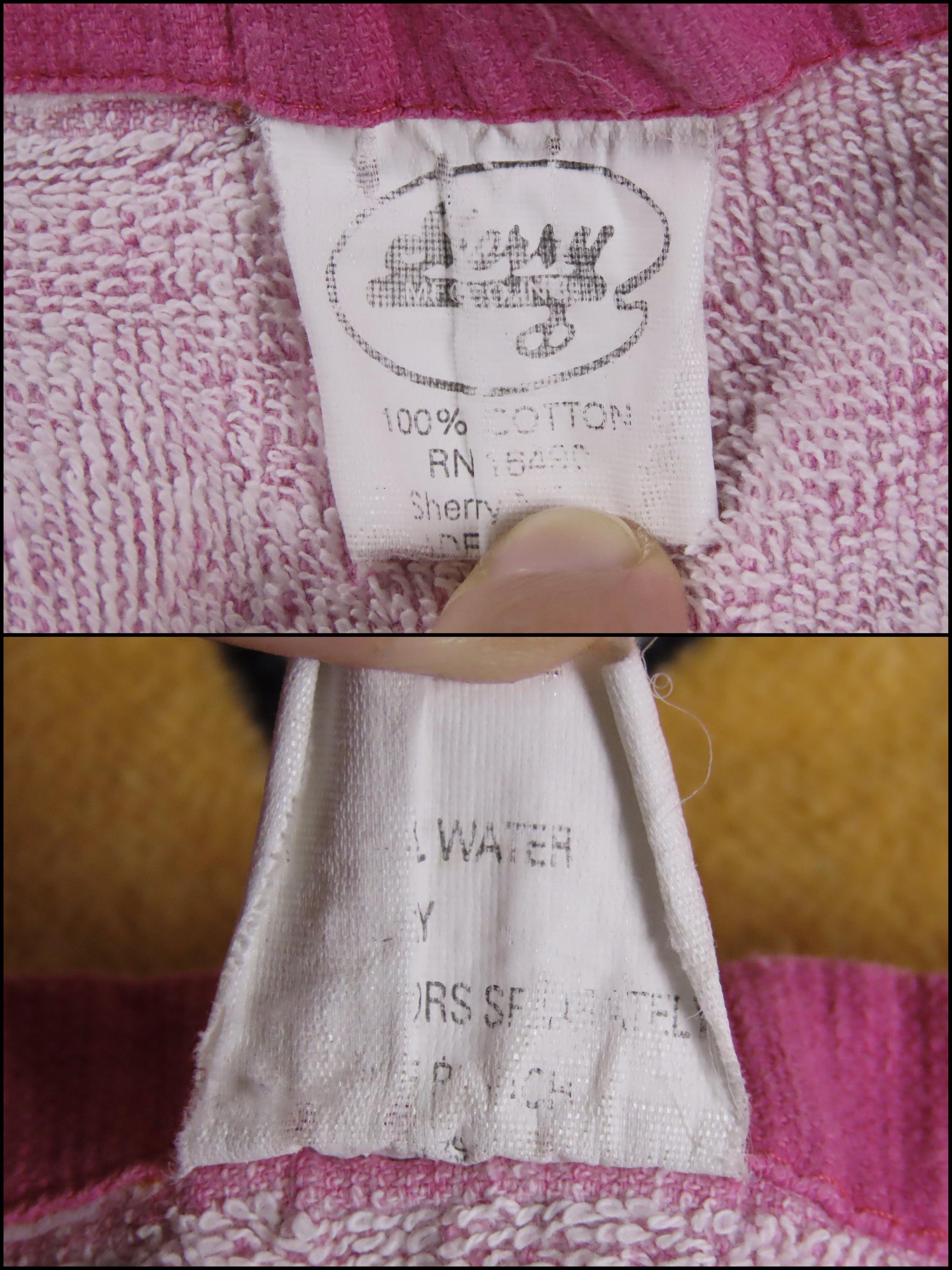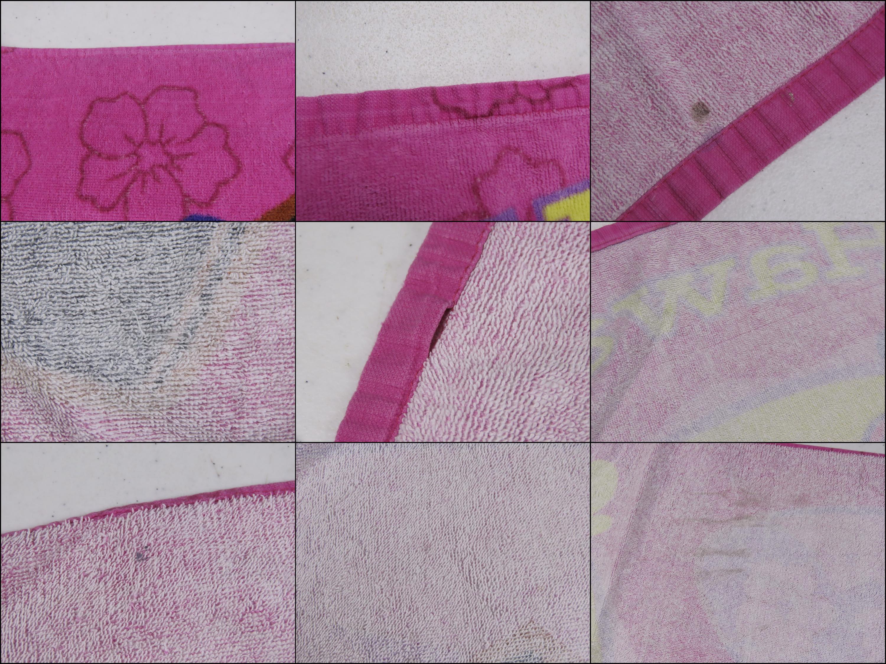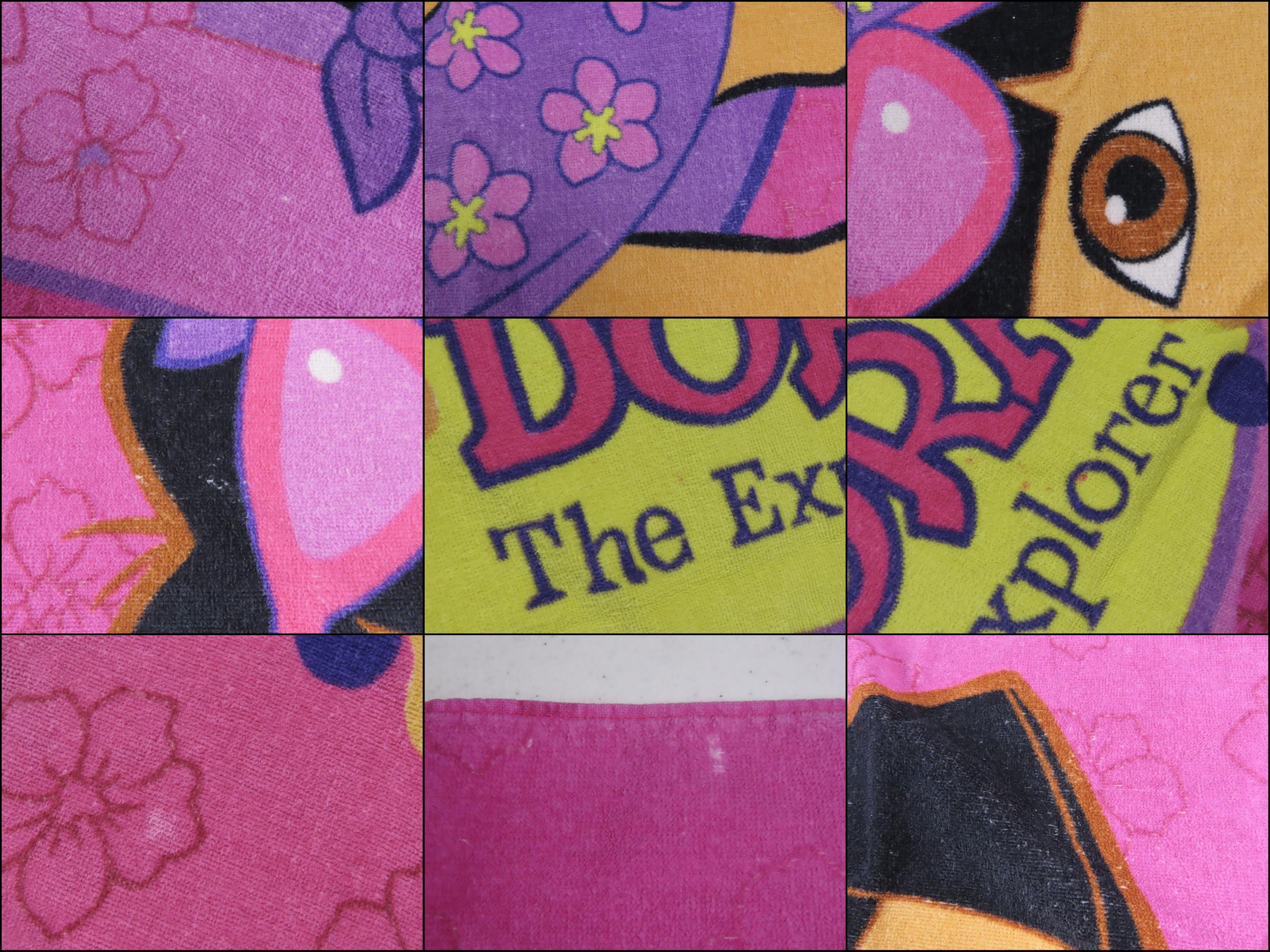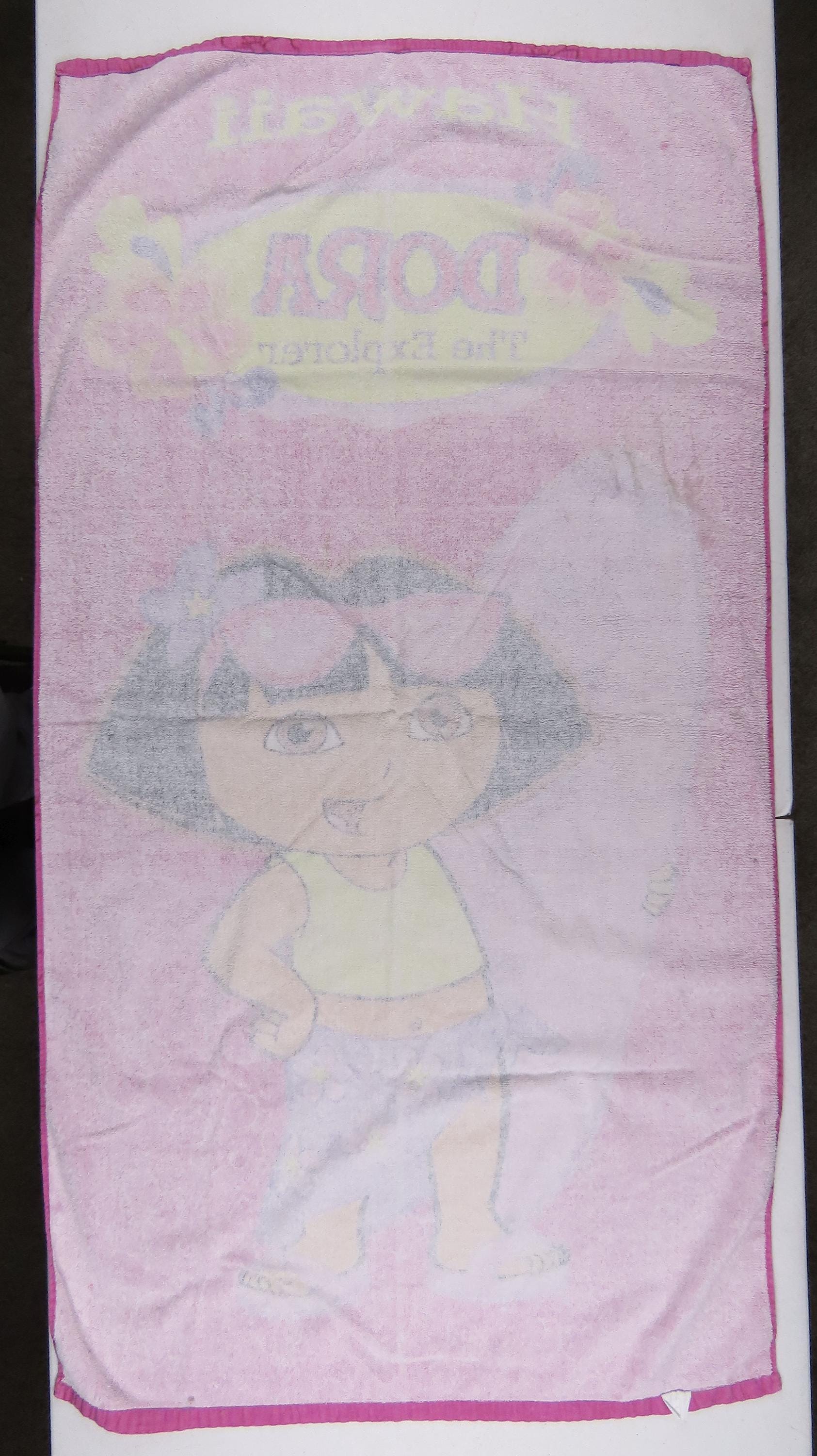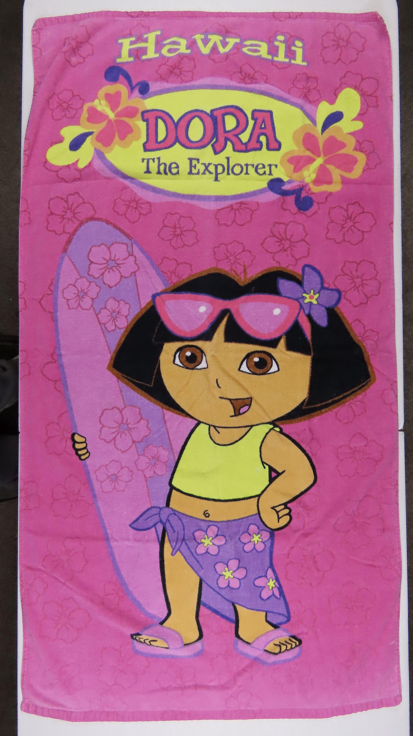 Vintage Dora the Explorer beach towel which 100% cotton. It is about 55" tall by 29" wide (140 cm by 74 cm). My camera had a hard time picking up the exact colors. It is worn along the edges/stitching, and it doesn't want to lay completely flat. The colors are streaky (from towel stretching over time) and a little faded. There are tiny white marks, missing fiber spots, and pulled/loose fibers. It has fold/crease lines along the edges, and a small area of stitching is undone along the edge. There are some small/tiny stains on the yellow background around the "Dora the Explorer" text. The backside has a couple small nail polish marks/stains, a few other small stains, and a larger stain.