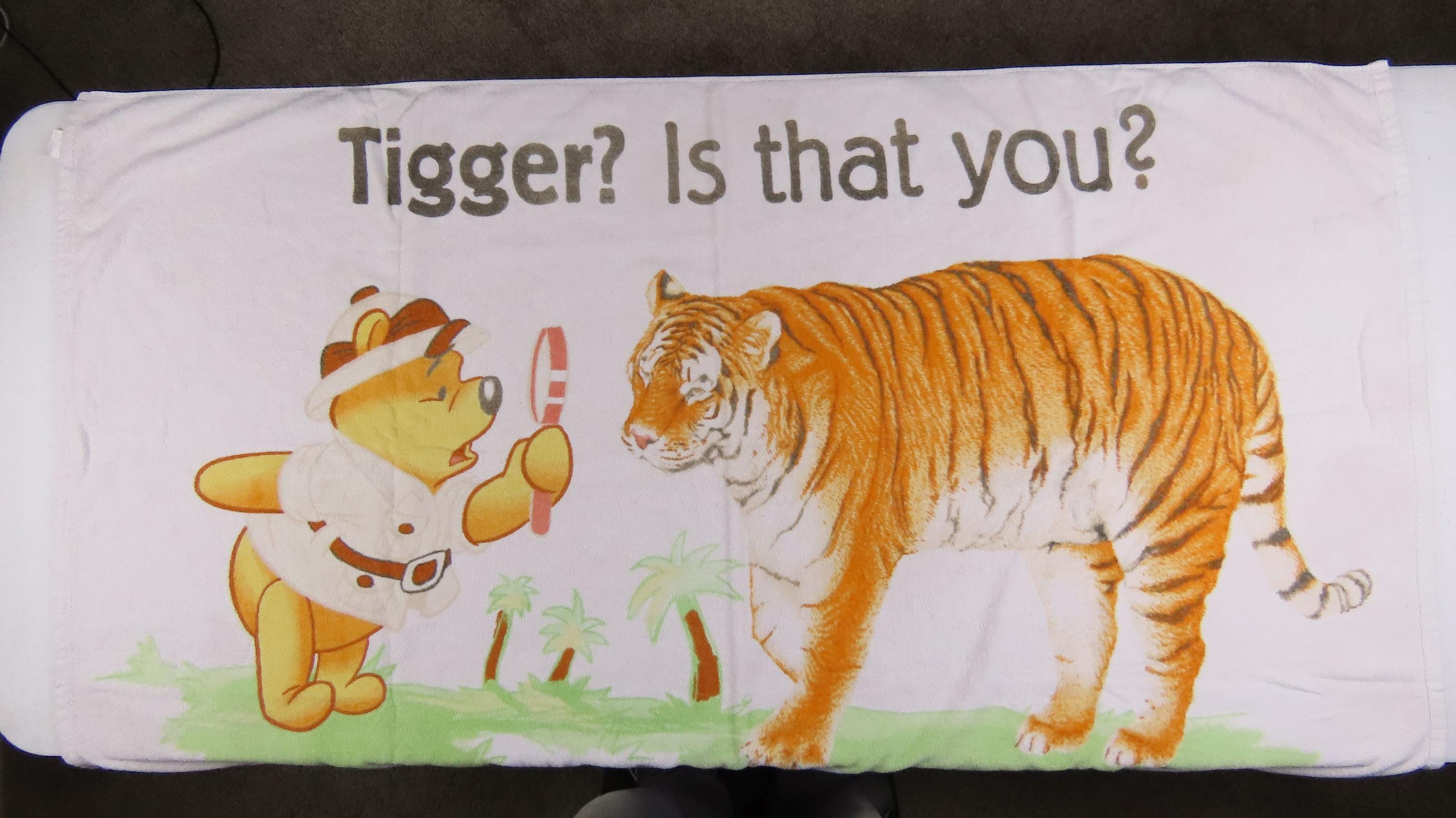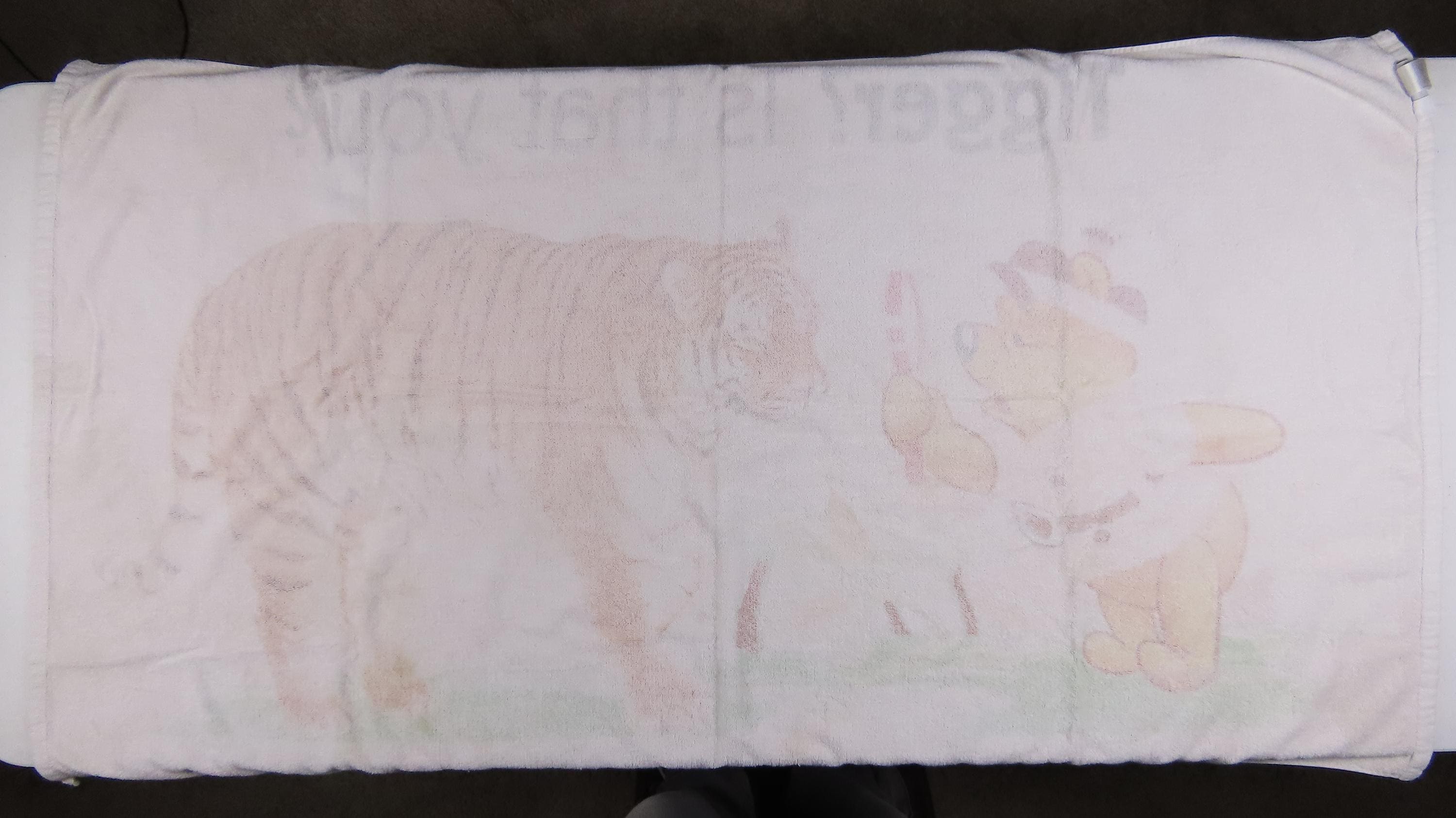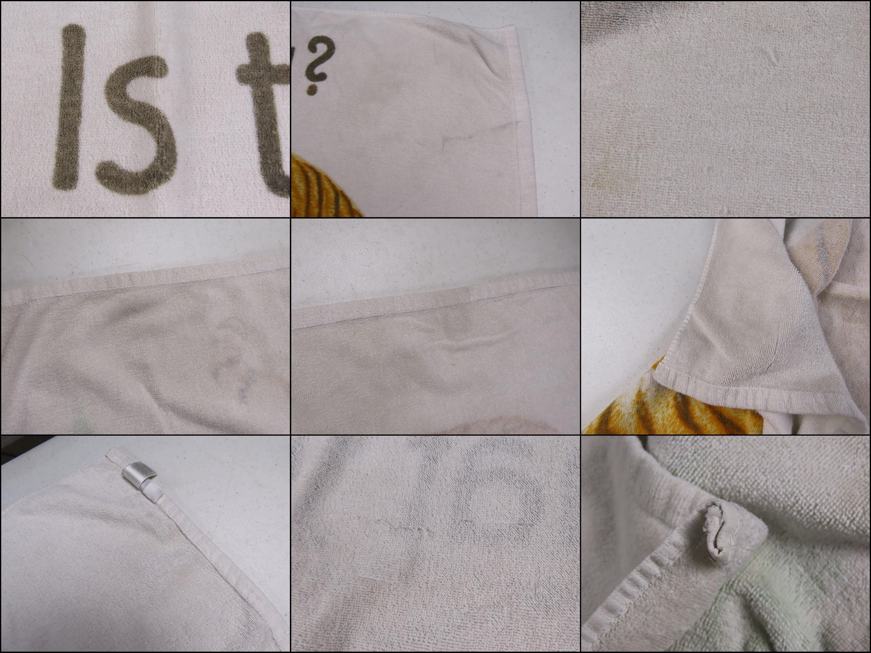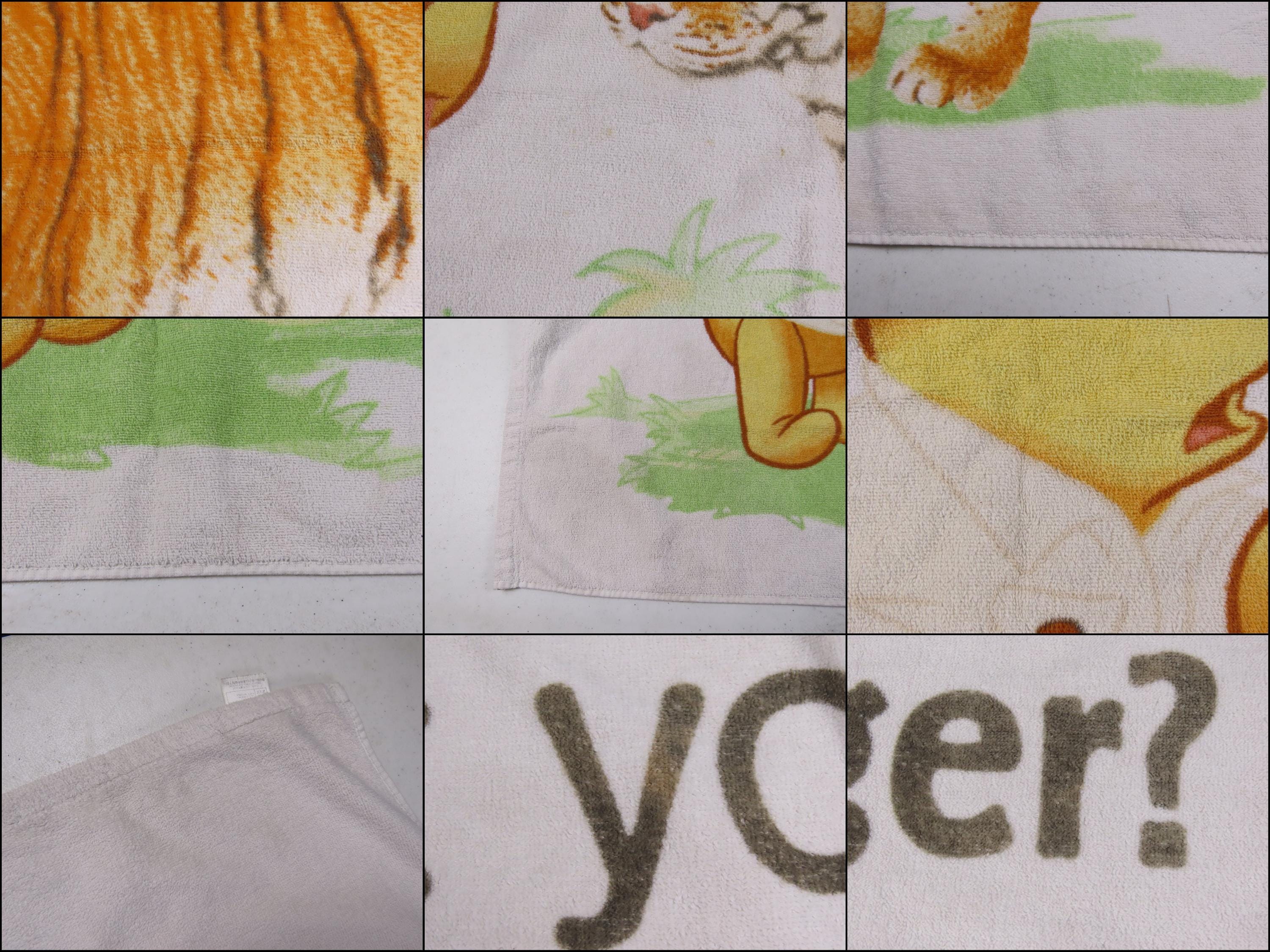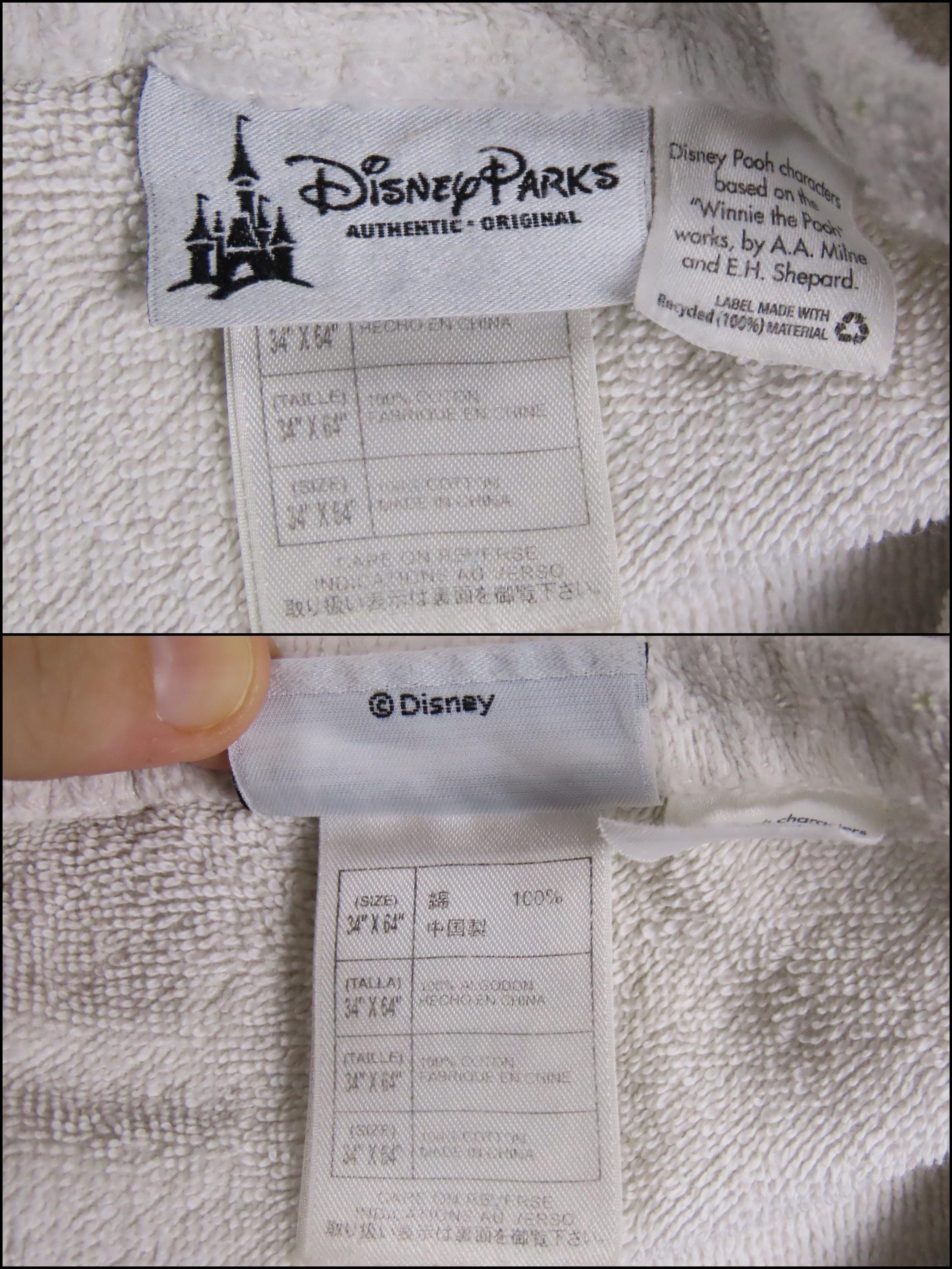 Vintage Winnie the Pooh beach towel which is 100% cotton. It is about 60" wide by 34" tall (152 cm by 86 cm). My camera had a hard time picking up the exact colors. It is faded, worn along the edges, and discolored in areas (especially along the edges). It has some small stains towards the middle of the towel, larger light stains, and a large line mark. There are missing fiber spots and pulled/lose fibers. The wording is faded/discolored from what looks like bleach stains. There is a small area of stitching undone on the hem.