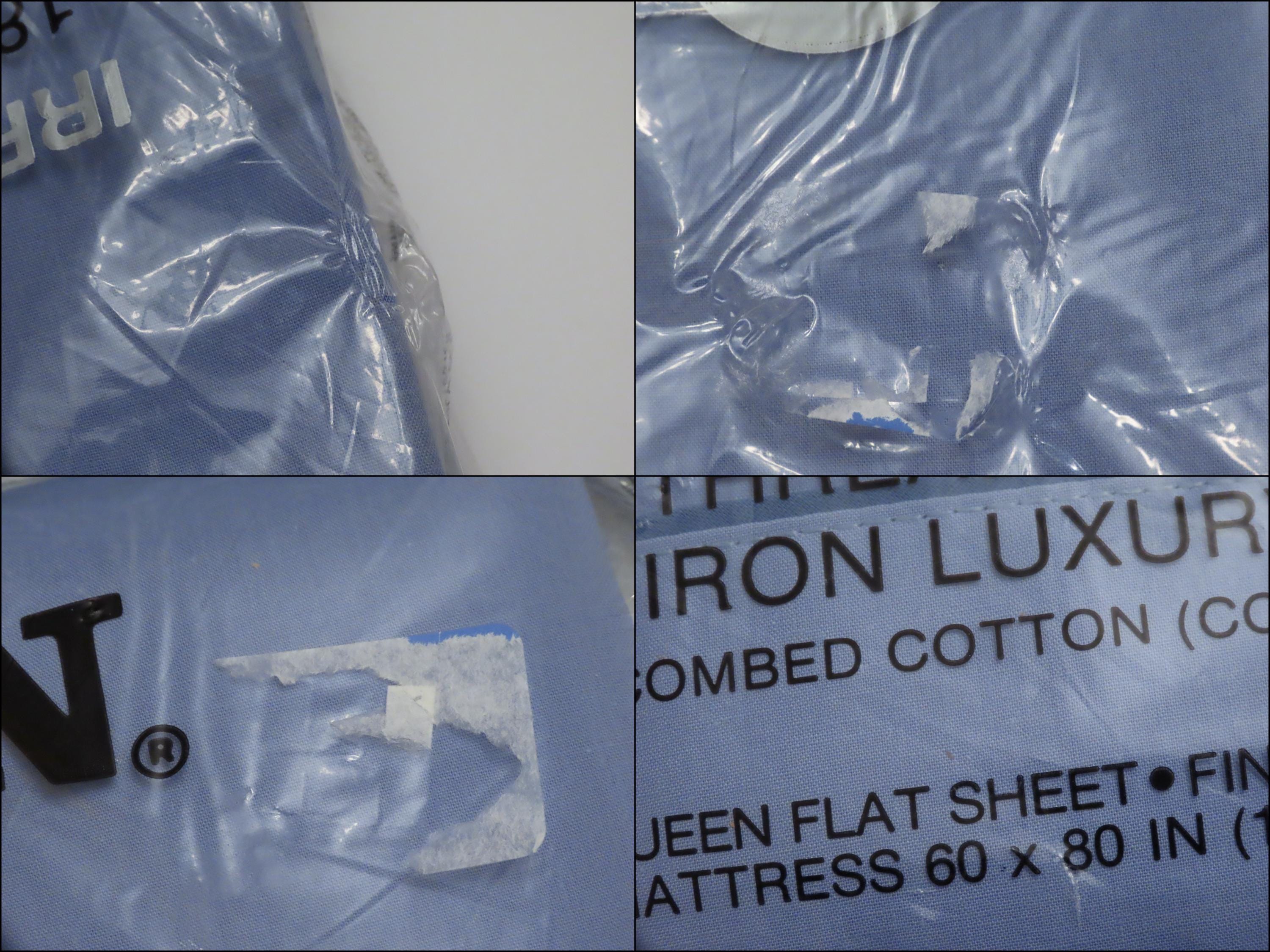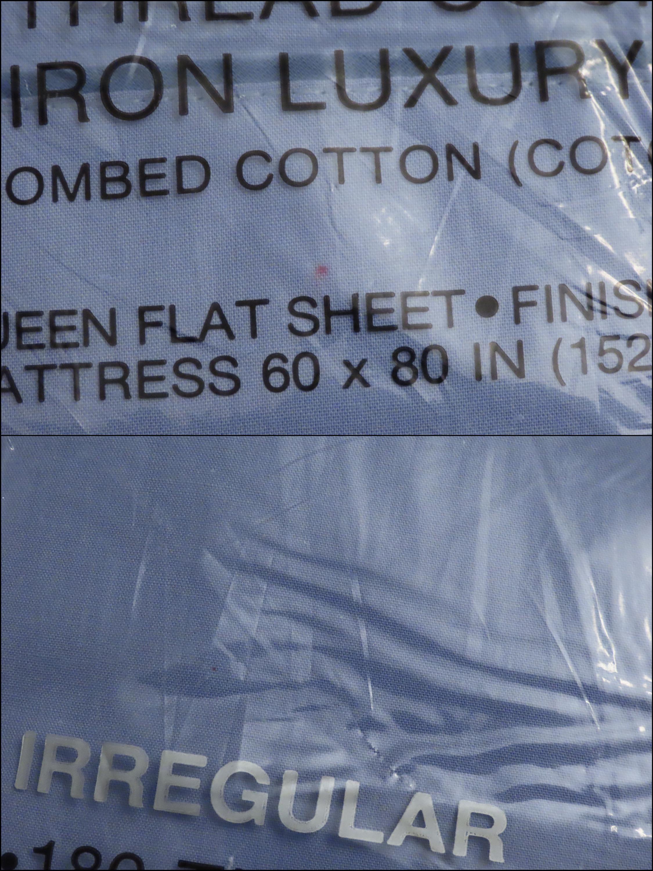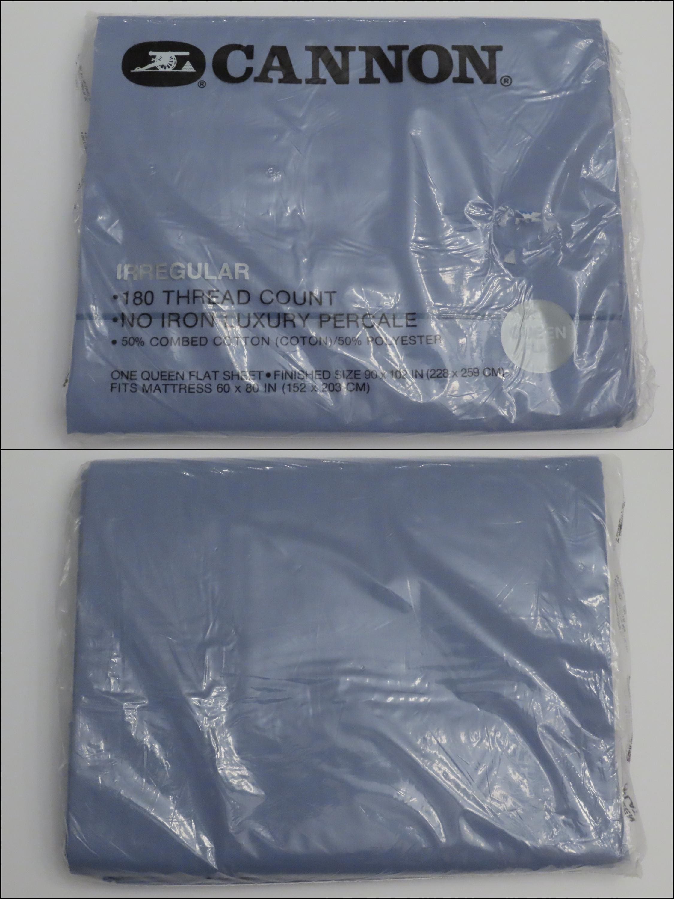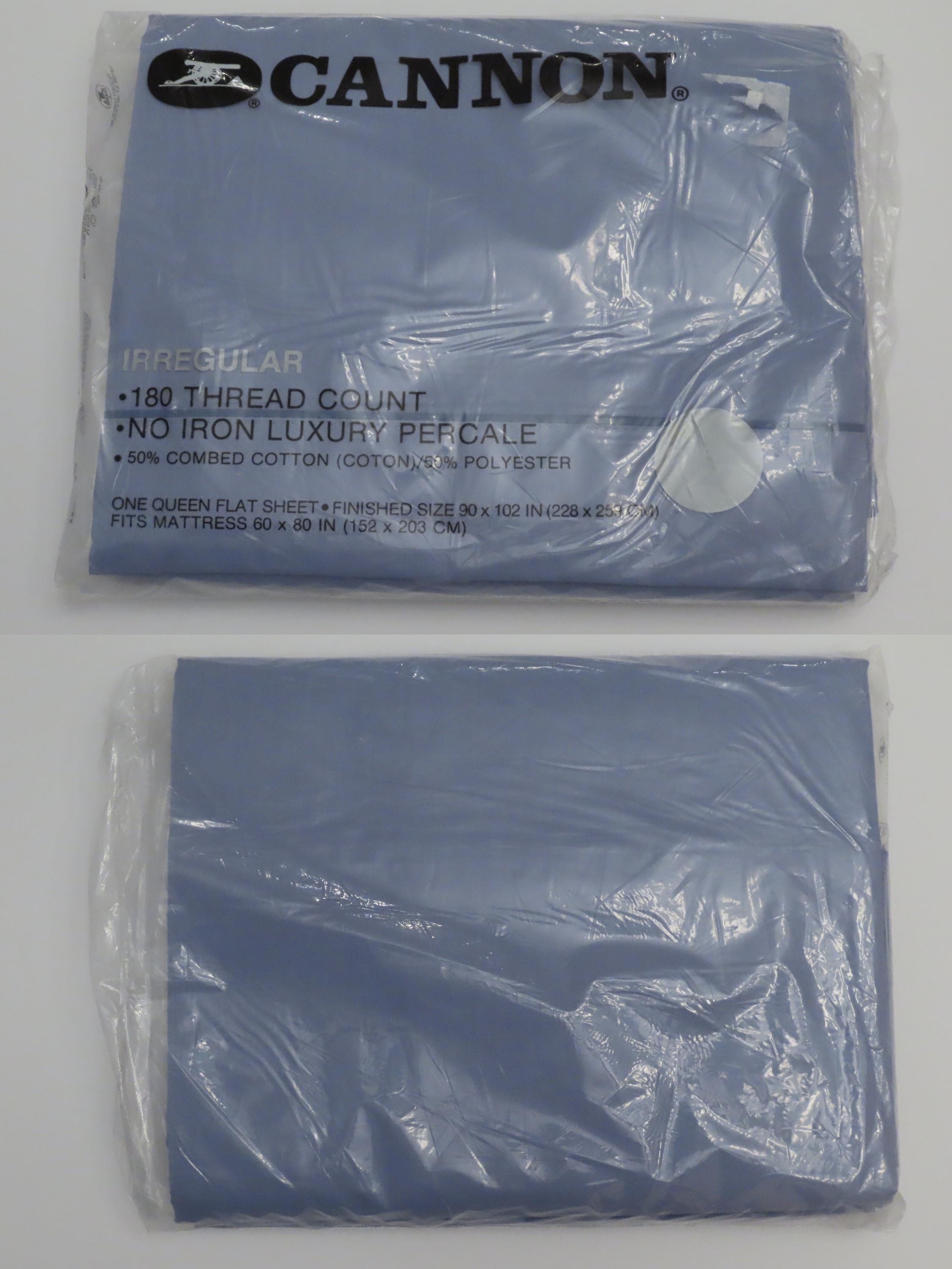 Vintage Cannon Irregular queen sized flat sheet which is new in the package. It is 50% cotton and 50% polyester with a 180 thread count. My camera had a hard time picking up the exact colors. The plastic packaging is a little worn, and there is some loose dust/debris inside of the plastic. There is old sticker residue, and a few small holes in the plastic. The sheet has small/tiny visible red marks on the fabric. It is possible that this is throughout the sheet, since it is marked as "irregular".