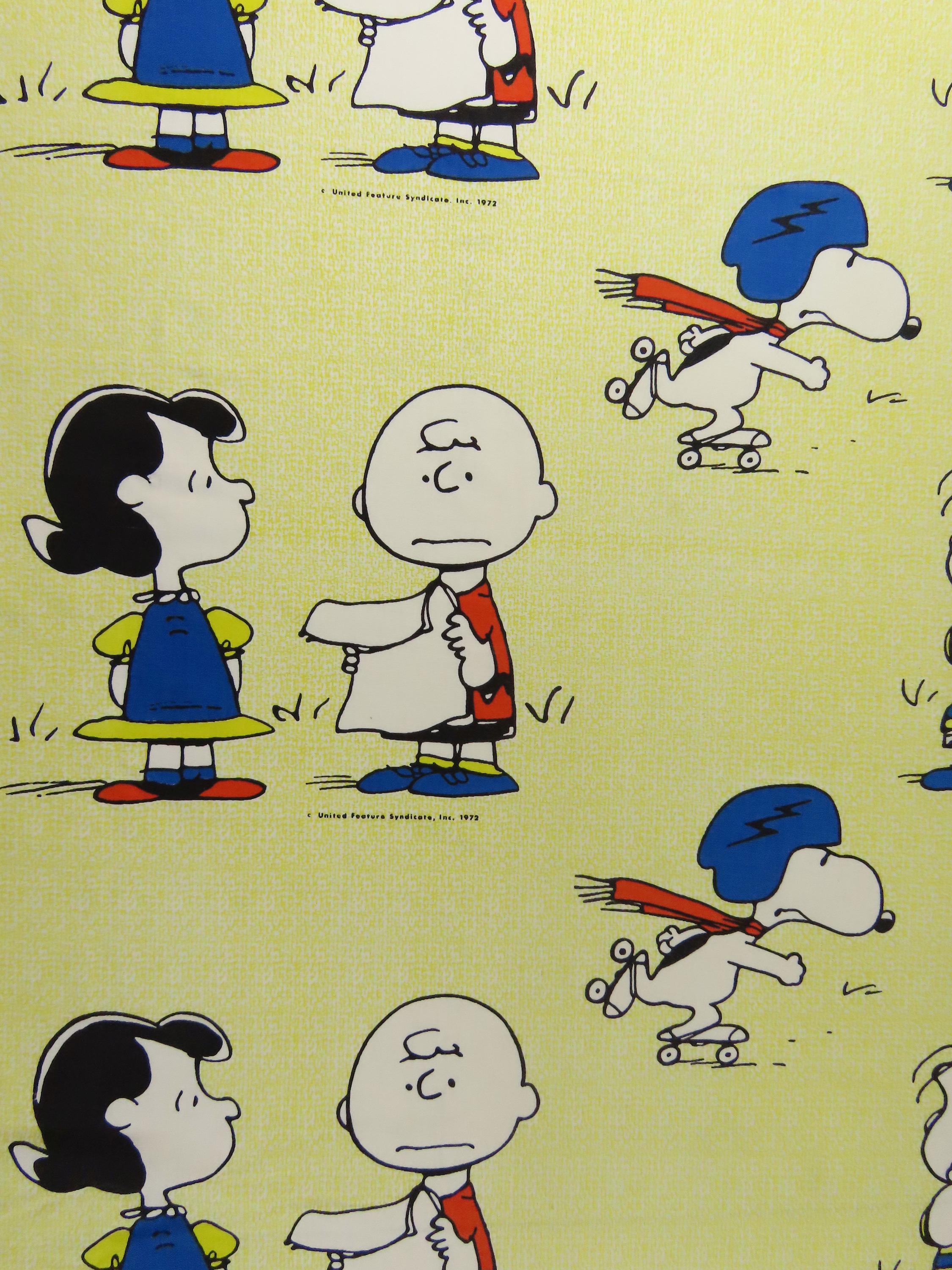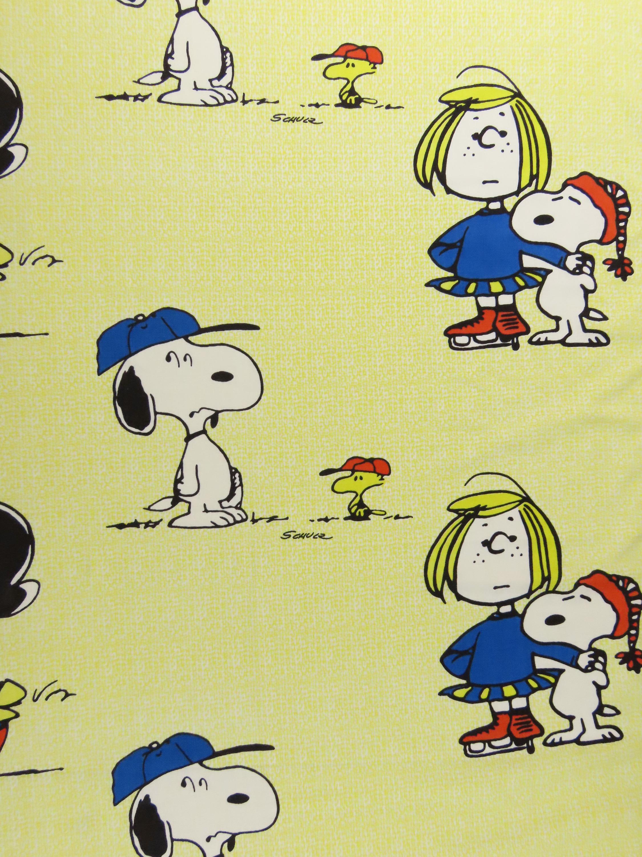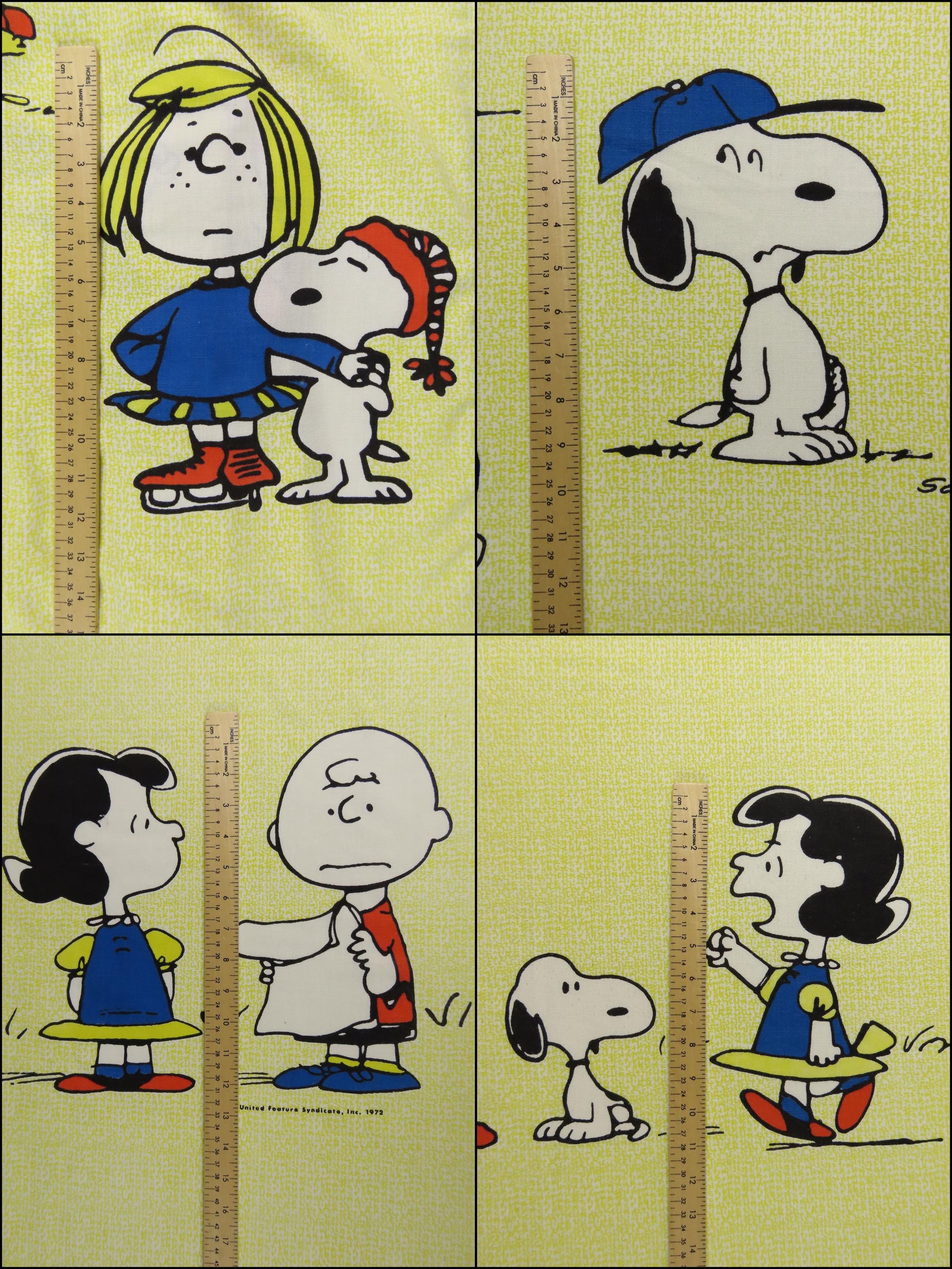 Peanuts coverlet from 1972 which is about 104.5" long by 78" wide (265 cm by 196 cm). I think it is for a twin sized bed. It is lightweight, but it has a different texture compared to a regular sheet. The bottom corners are rounded. My camera had a hard time picking up the exact colors.