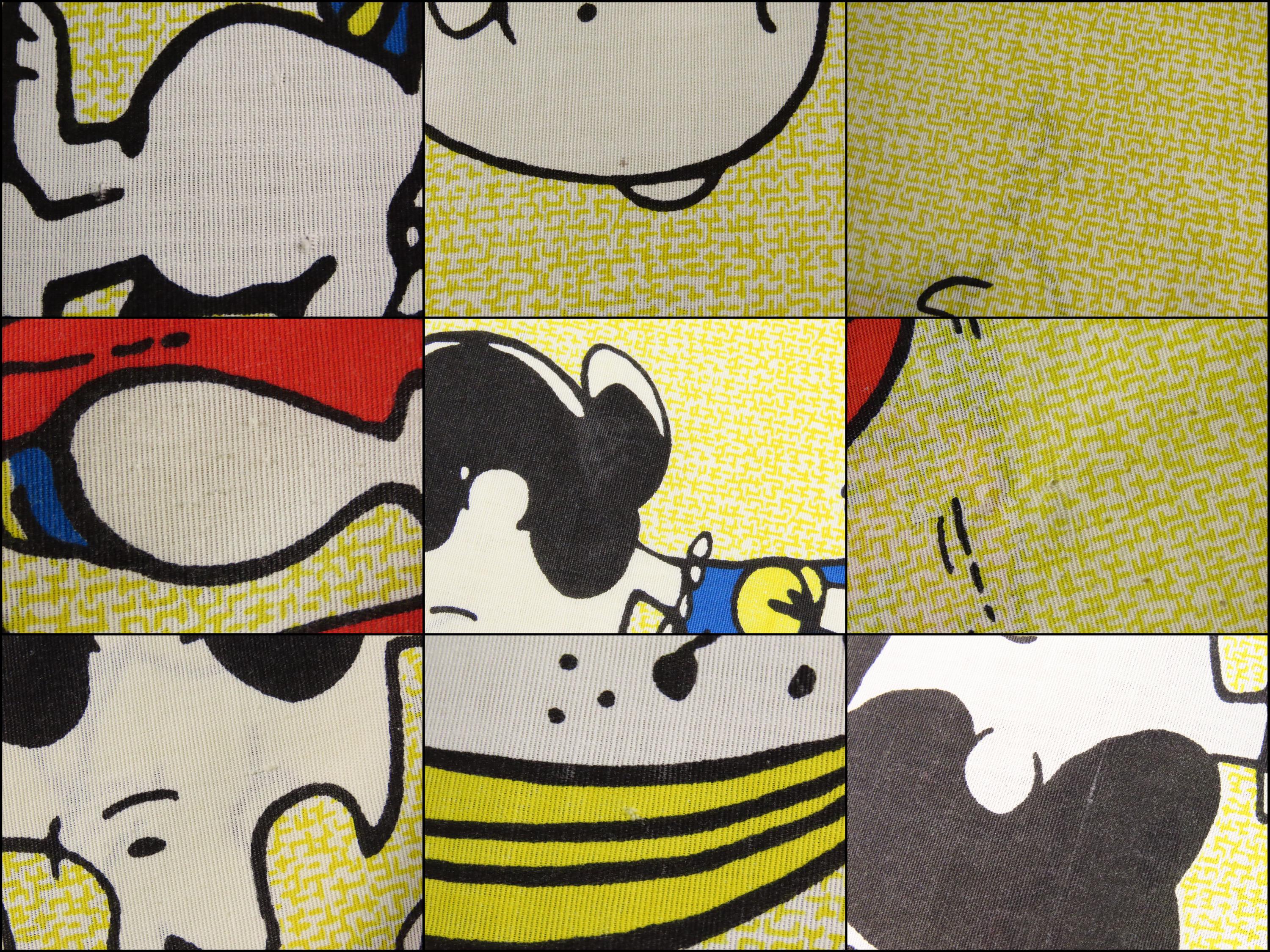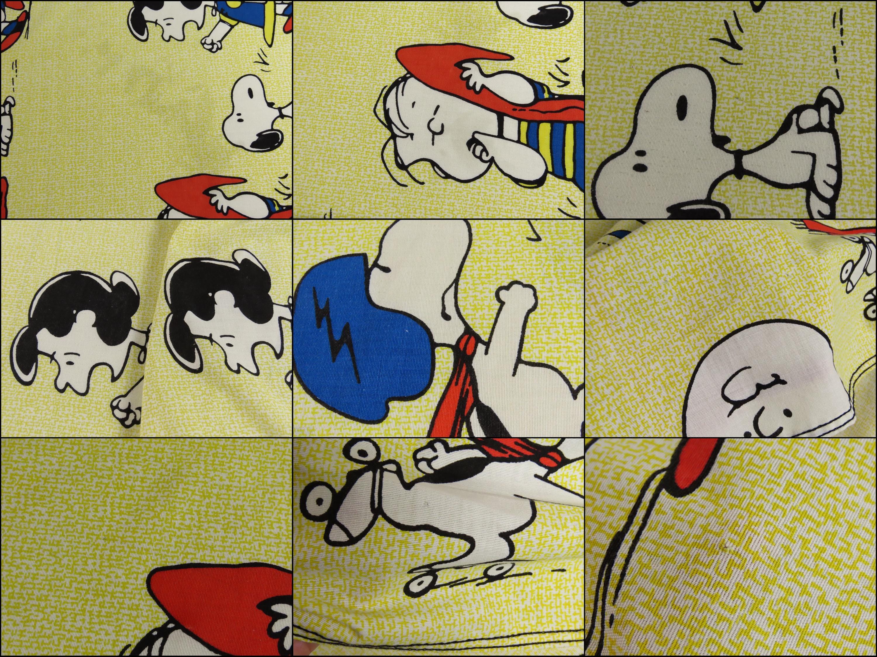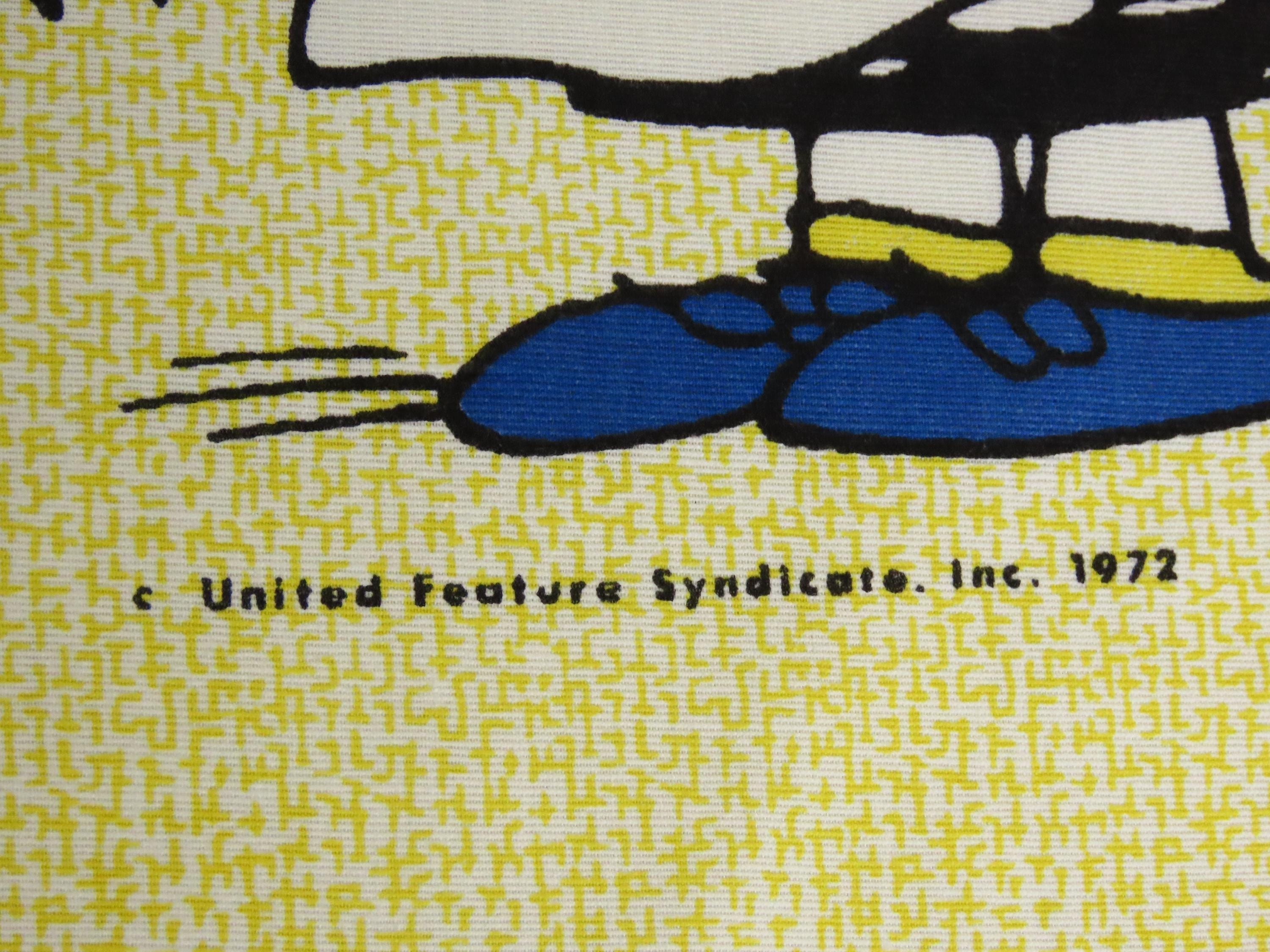 Peanuts coverlet from 1972 which is about 104.5" long by 78" wide (265 cm by 196 cm). I think it is for a twin sized bed. It is lightweight, but it has a different texture compared to a regular sheet. The bottom corners are rounded. My camera had a hard time picking up the exact colors.