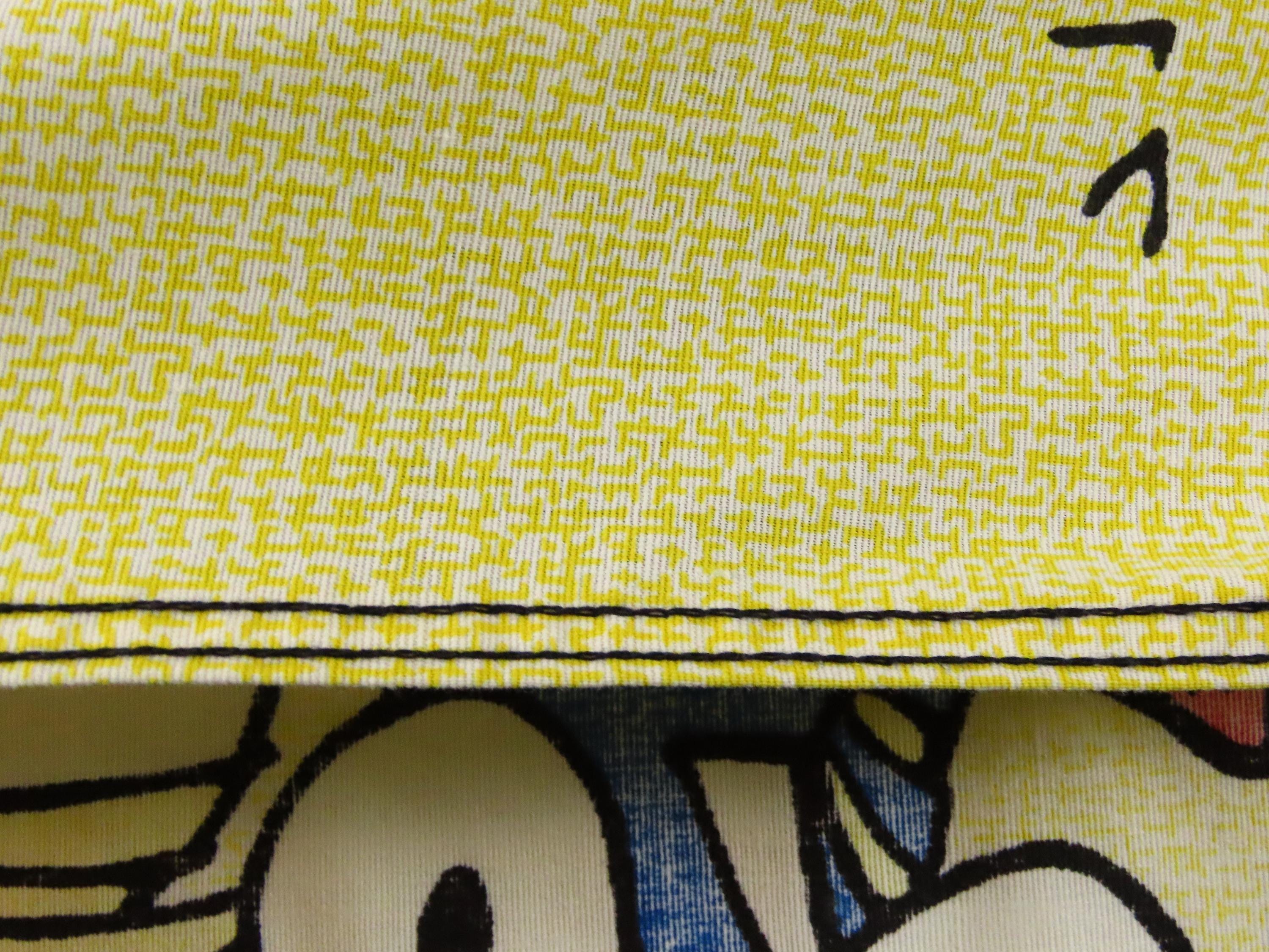 It is pilling in areas, and the colors are a little faded both mostly towards the middle. There are thread snags, a few missing thread spots, and tiny white marks. It has a large stain/discolored area, a light whitish mark, and a small mark. There are a few line marks, some small/tiny holes, and thin spots.