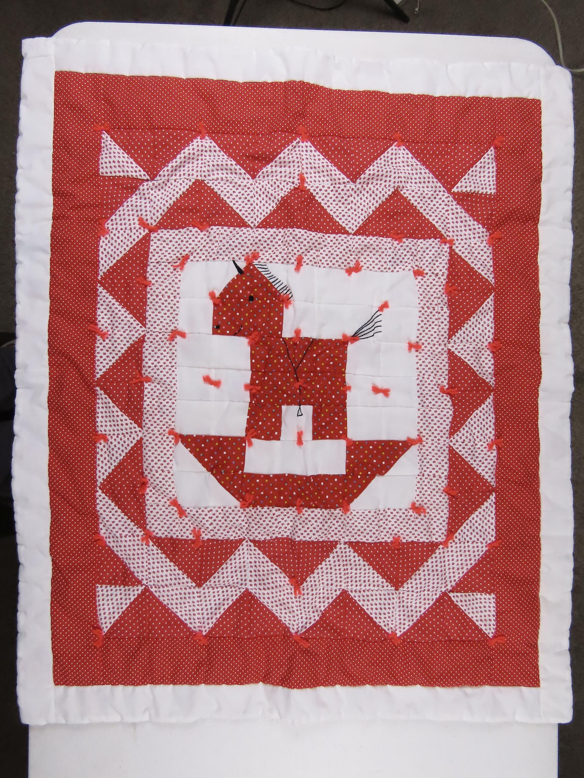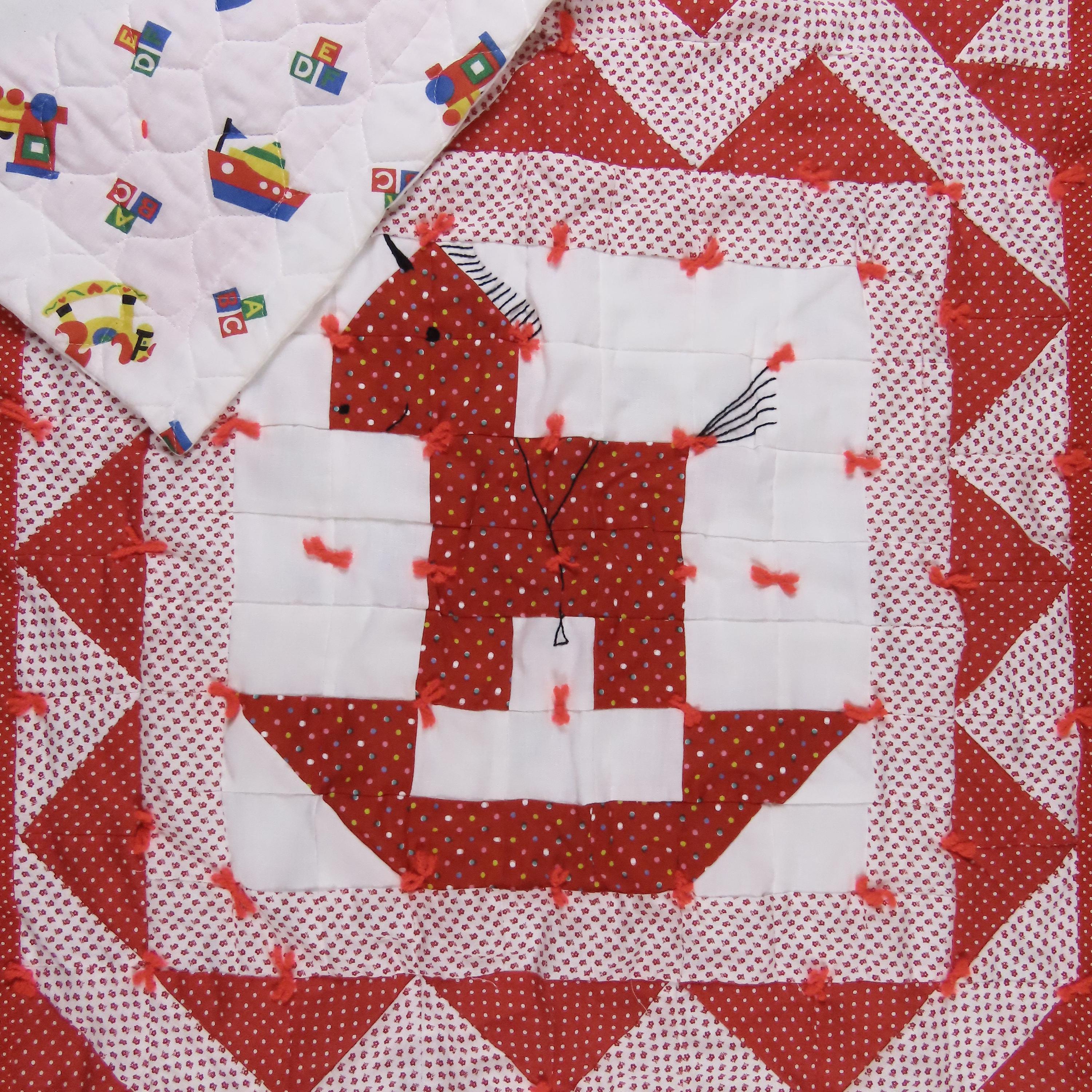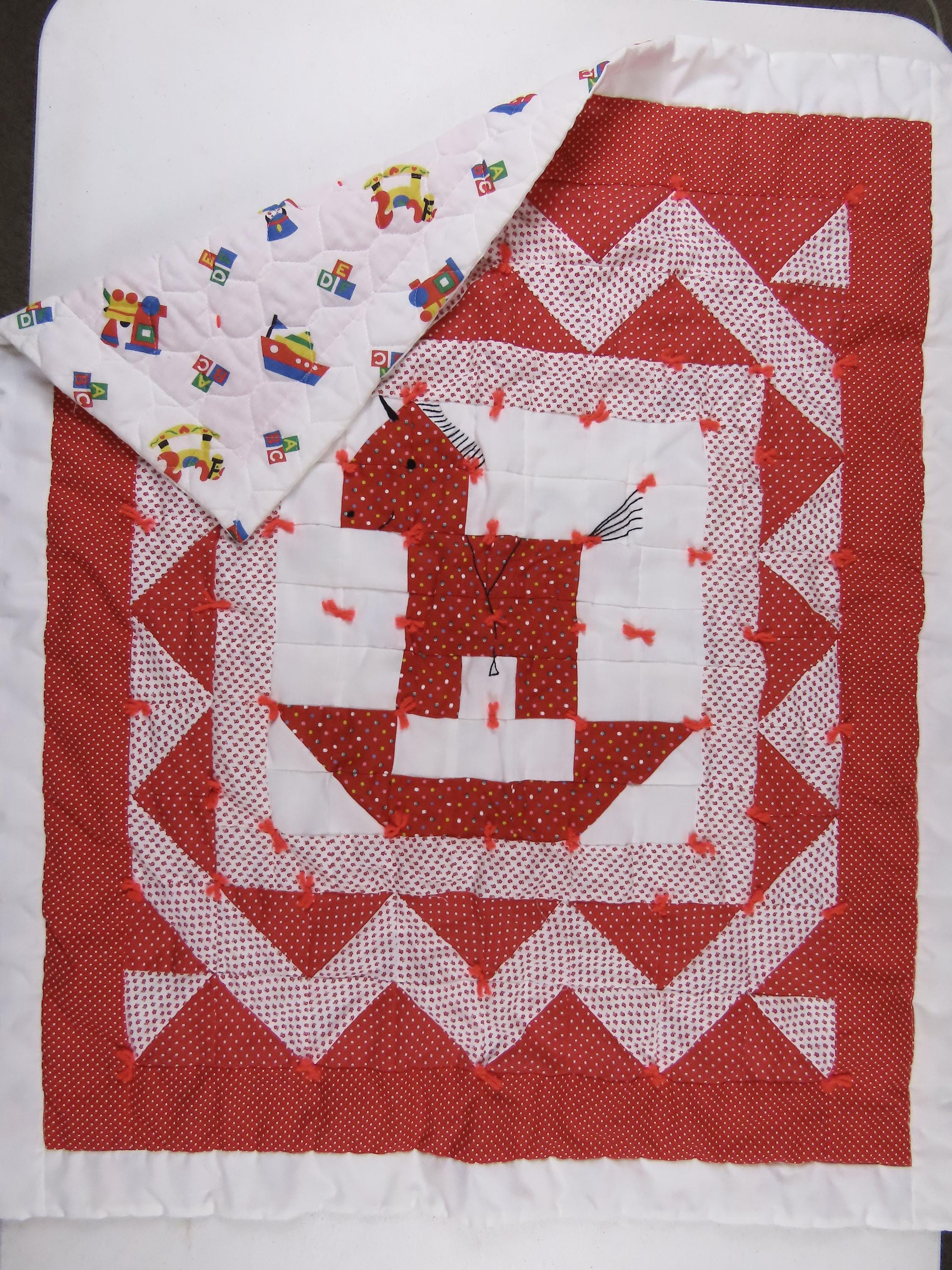 Vintage rocking horse/unicorn small quilted blanket which is about 38" tall by 31" wide (97 cm by 79 cm). My camera had a hard time picking up the exact colors. It is sewn slightly unevenly in areas, and the top fabric pools up some (doesn't want to lay completely flat). There are thread snags, thin spots, and some loose threads. It has a few tiny holes in the corner. The backside has a small stain cluster and a tiny stain.