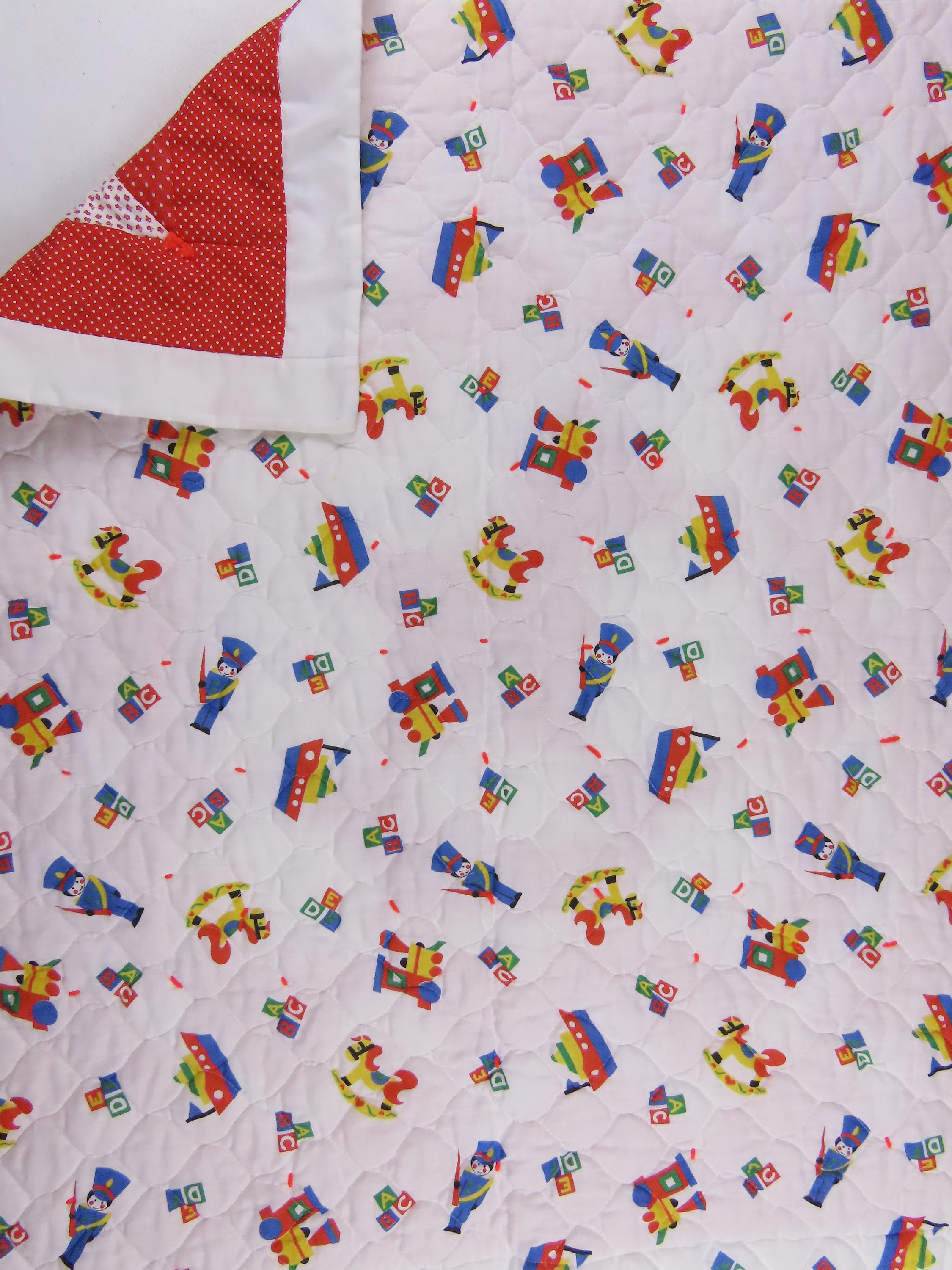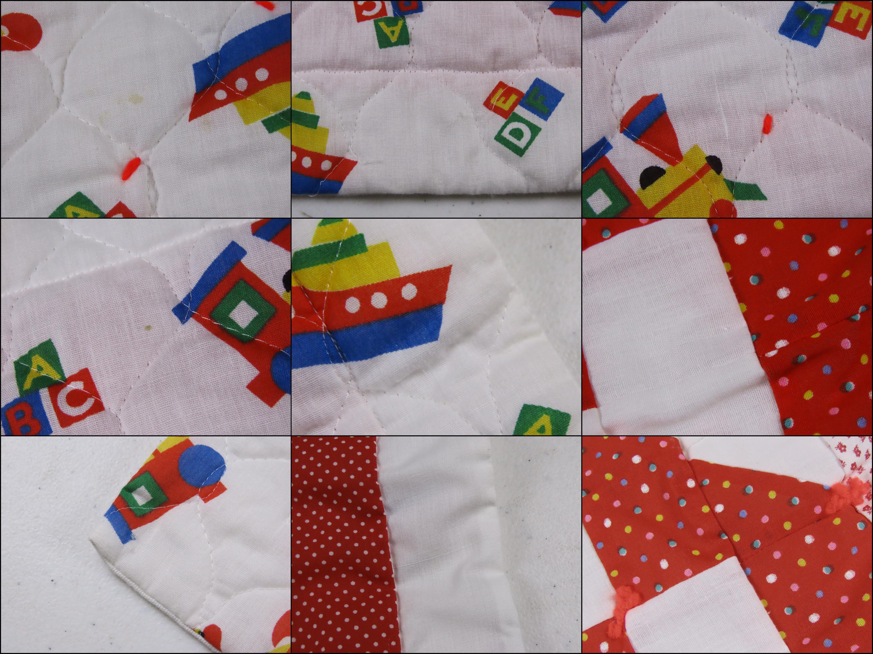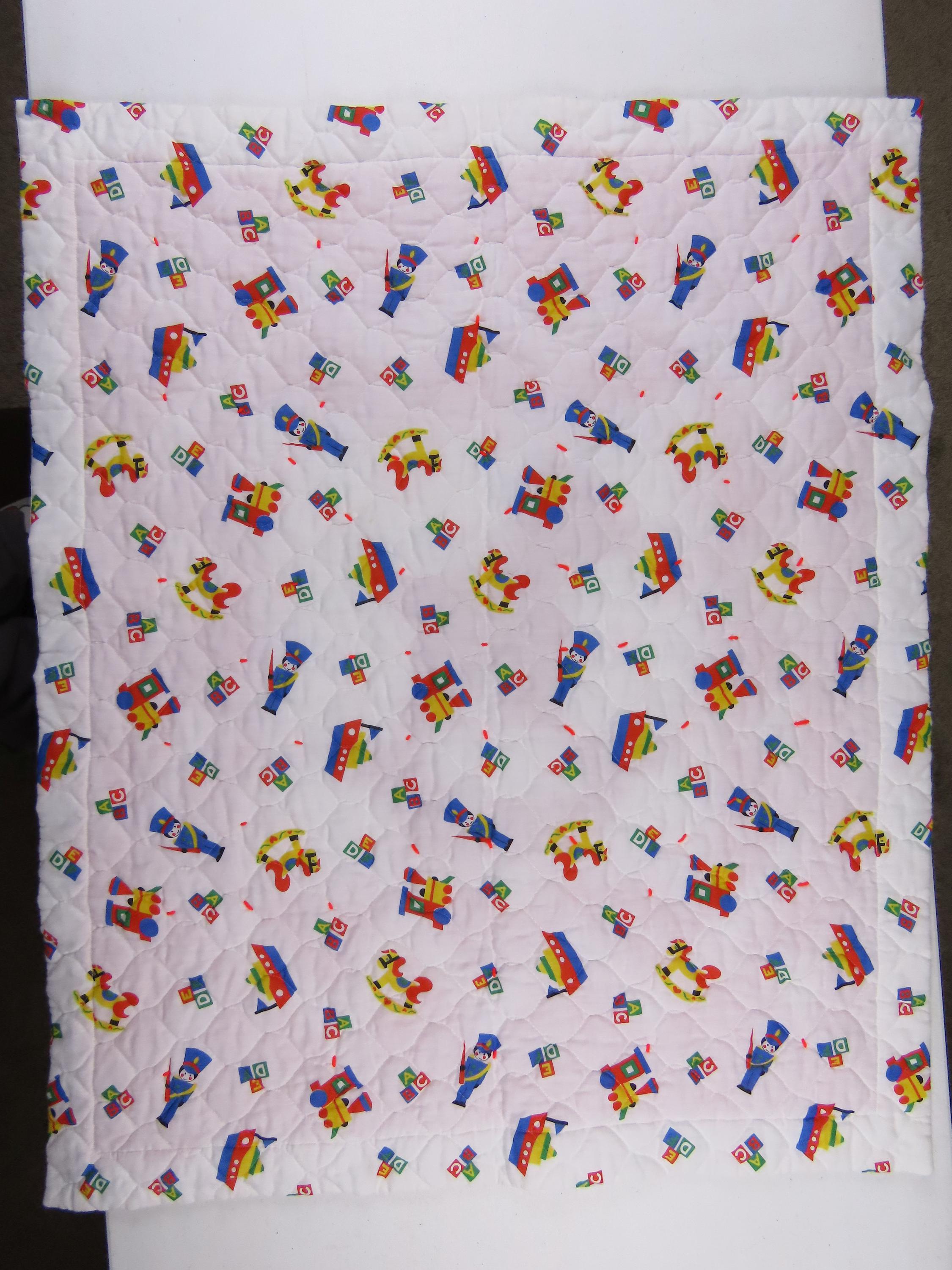 Vintage rocking horse/unicorn small quilted blanket which is about 38" tall by 31" wide (97 cm by 79 cm). My camera had a hard time picking up the exact colors. It is sewn slightly unevenly in areas, and the top fabric pools up some (doesn't want to lay completely flat). There are thread snags, thin spots, and some loose threads. It has a few tiny holes in the corner. The backside has a small stain cluster and a tiny stain.