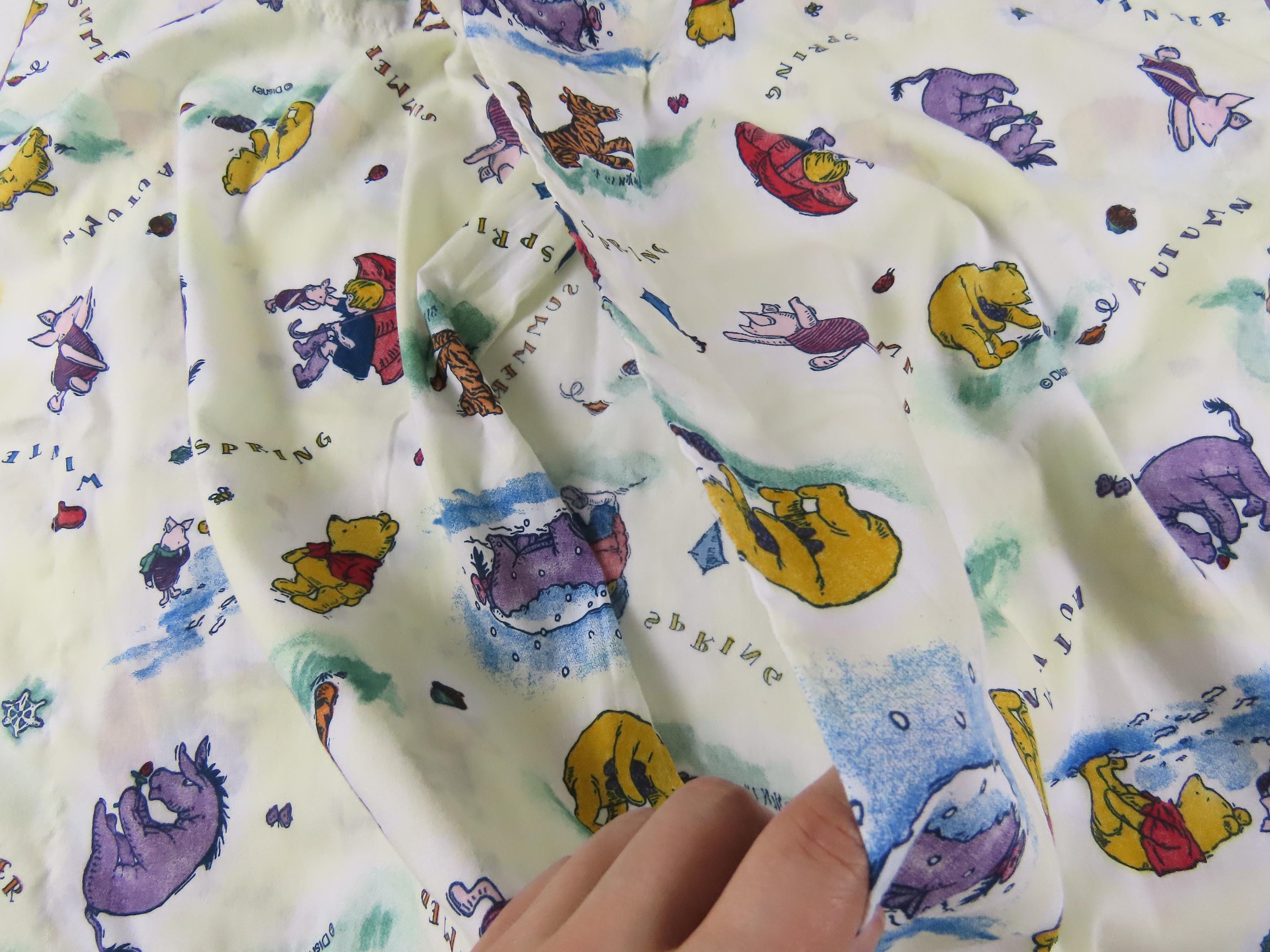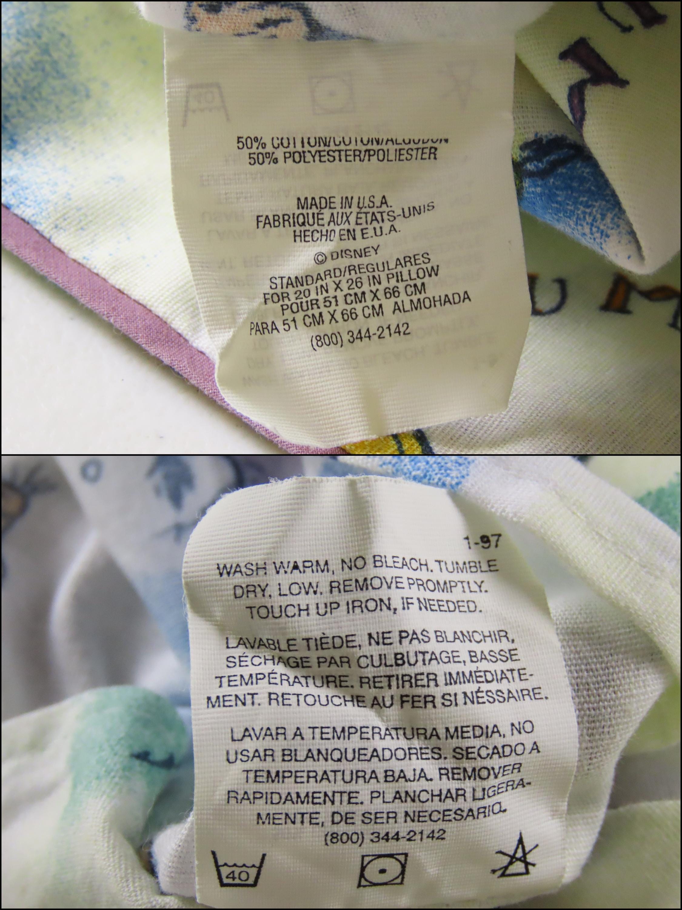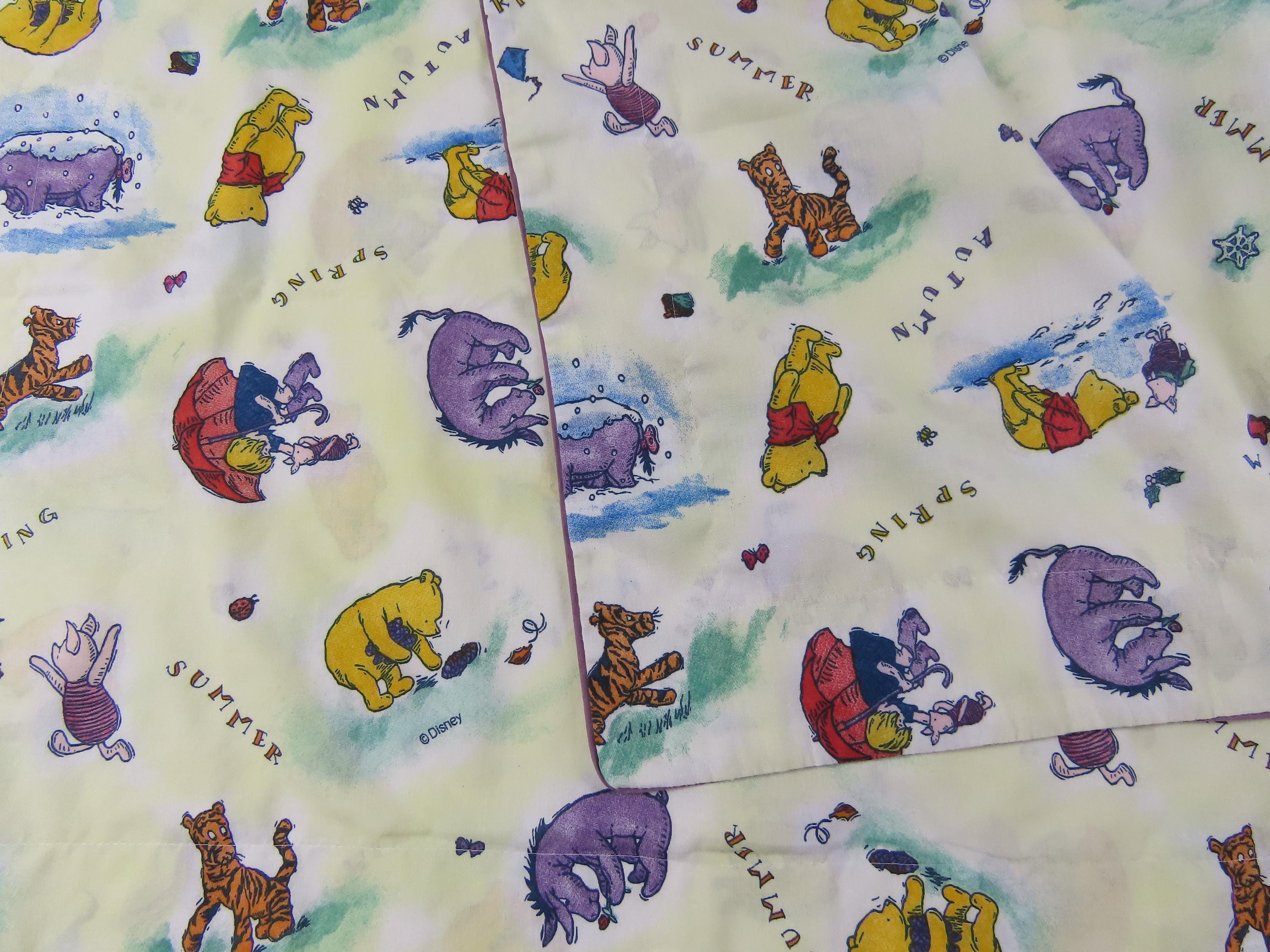 Set of 2 vintage classic Winnie the Pooh standard pillow shams from 1997 which are 50% cotton and 50% polyester. They are about 31.5" wide by 25" tall (80 cm by 64 cm), and the opening is about 26" wide by 19.5" tall (66 cm by 50 cm). My camera had a hard time picking up the exact colors. Both pillow shams have thread snags, tiny marks, and are worn along the edges. The first sham seems a little faded in comparison to the other. For example, the yellow in the background is more noticeable on the second sham.