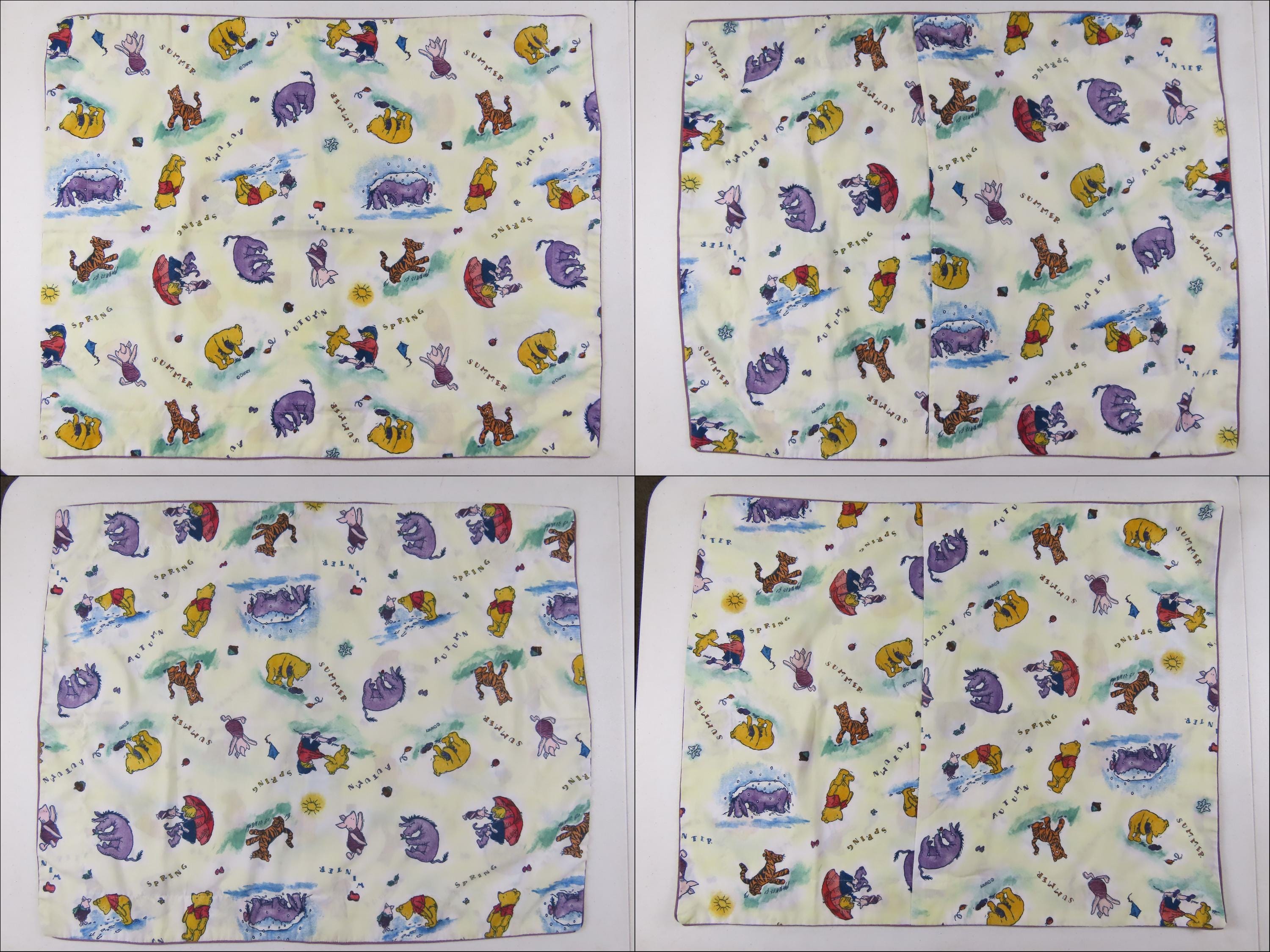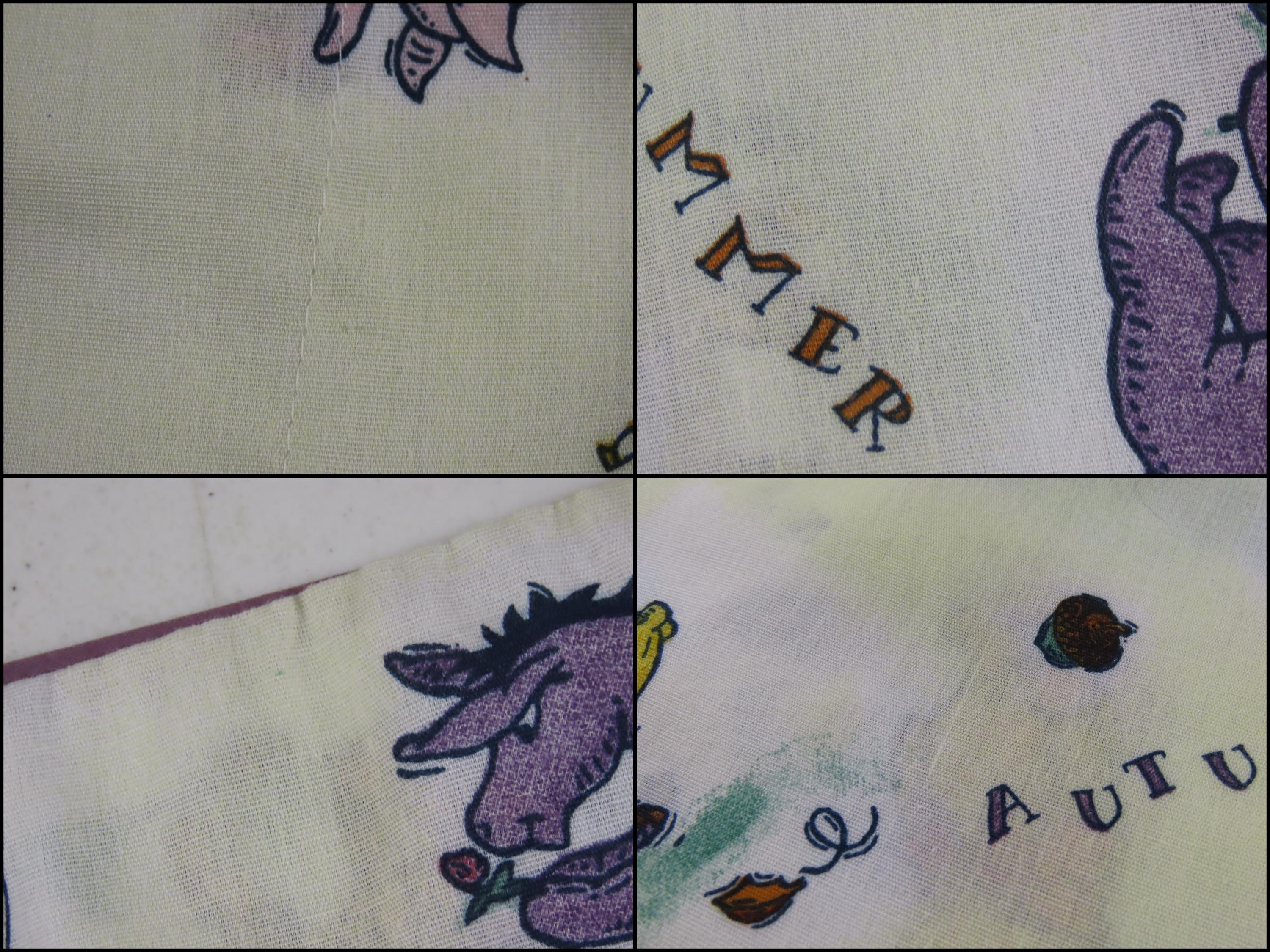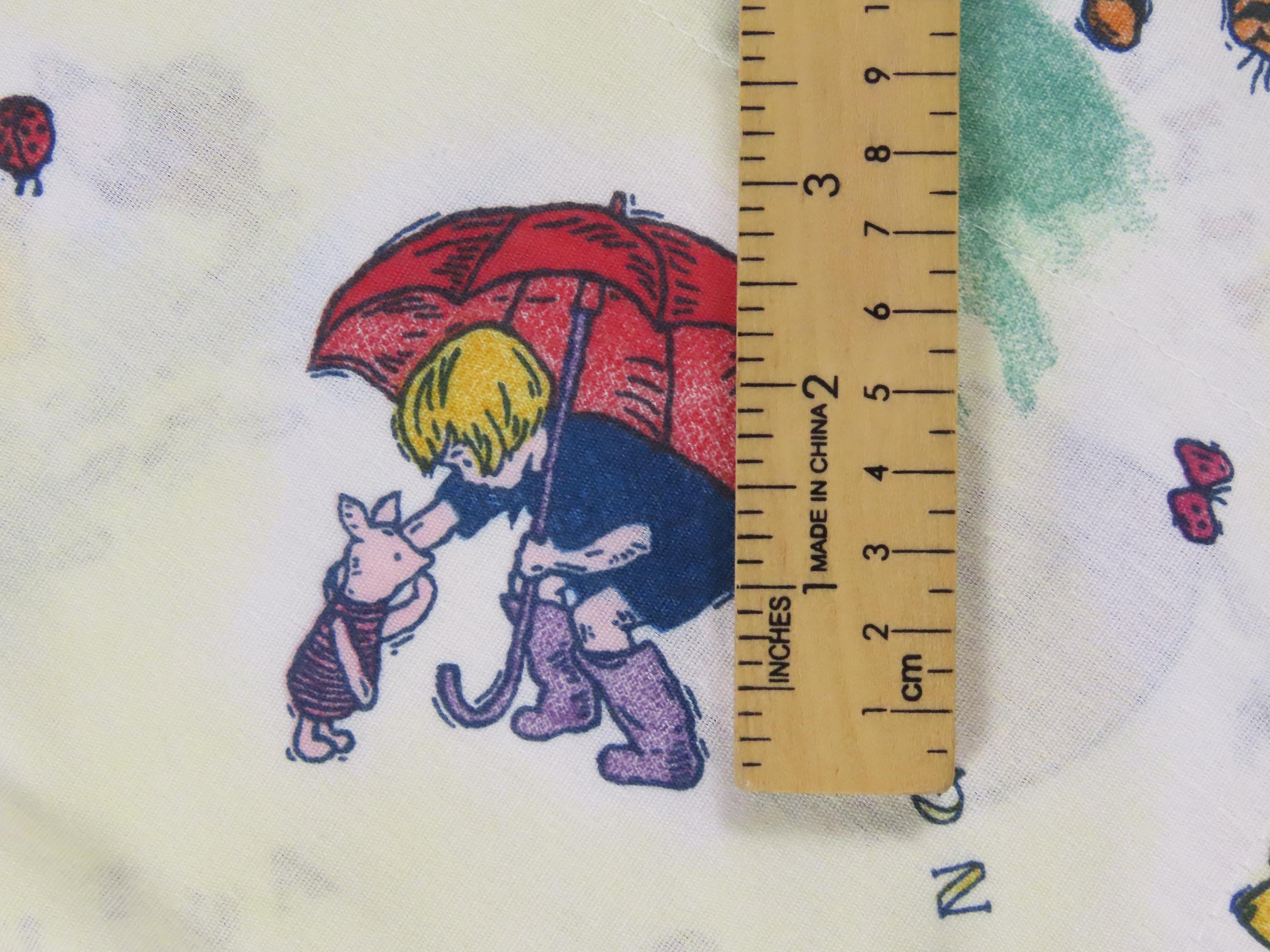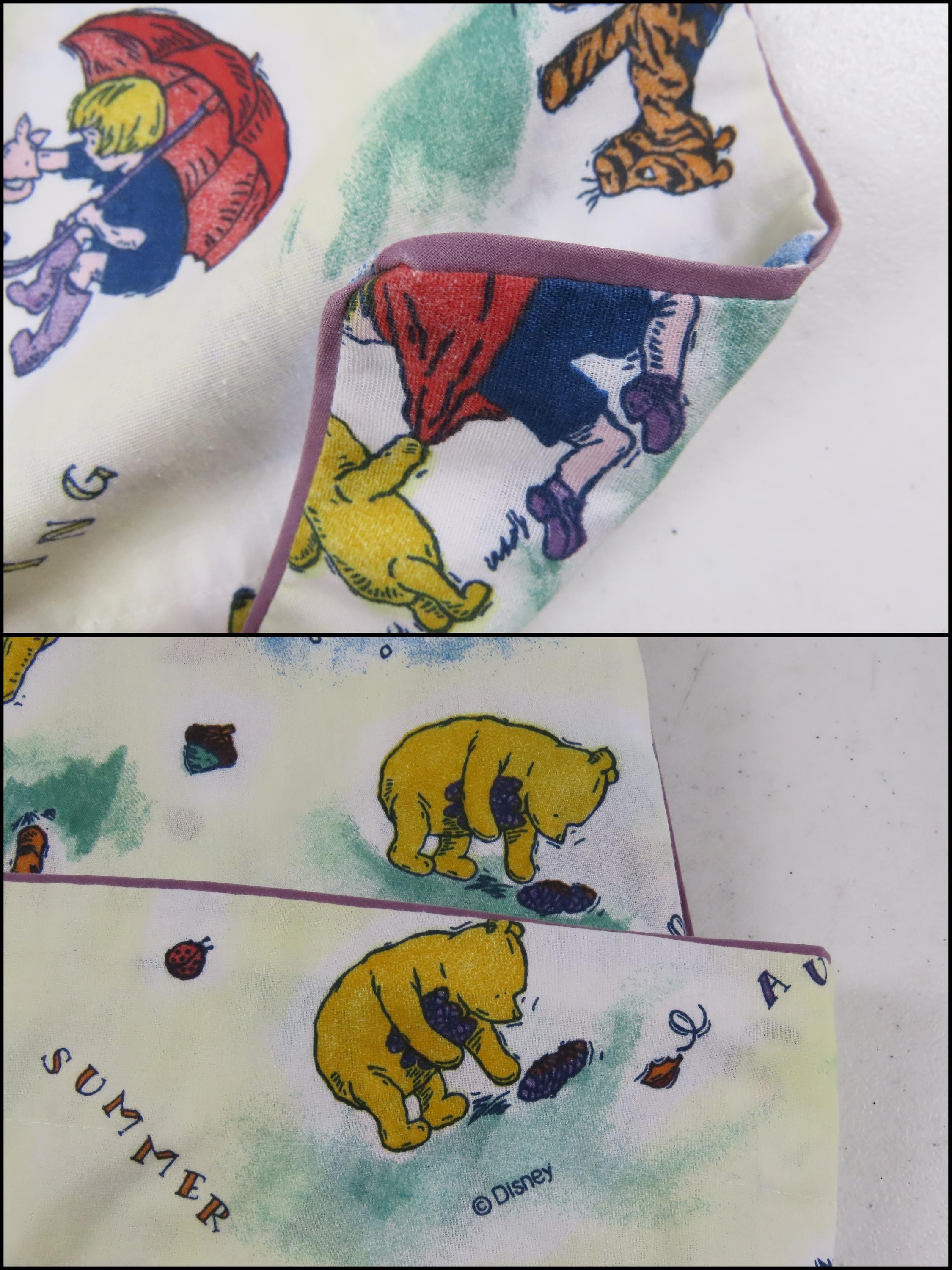 Set of 2 vintage classic Winnie the Pooh standard pillow shams from 1997 which are 50% cotton and 50% polyester. They are about 31.5" wide by 25" tall (80 cm by 64 cm), and the opening is about 26" wide by 19.5" tall (66 cm by 50 cm). My camera had a hard time picking up the exact colors. Both pillow shams have thread snags, tiny marks, and are worn along the edges. The first sham seems a little faded in comparison to the other. For example, the yellow in the background is more noticeable on the second sham.