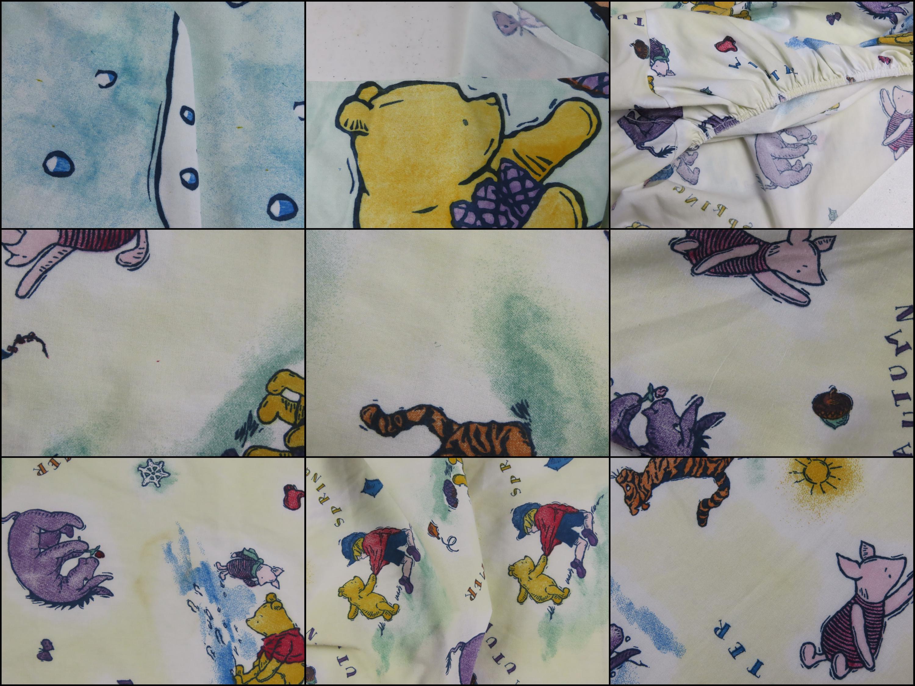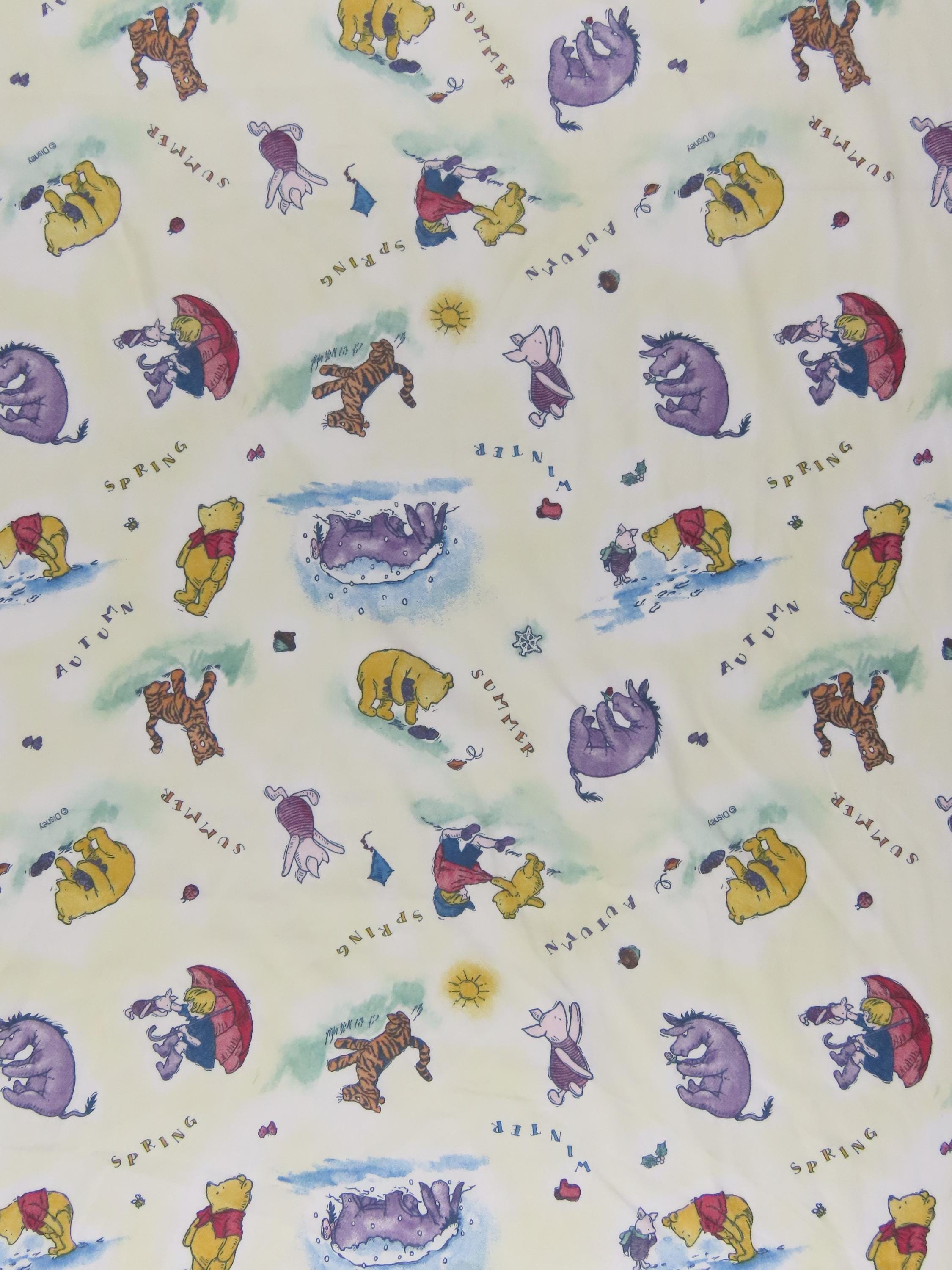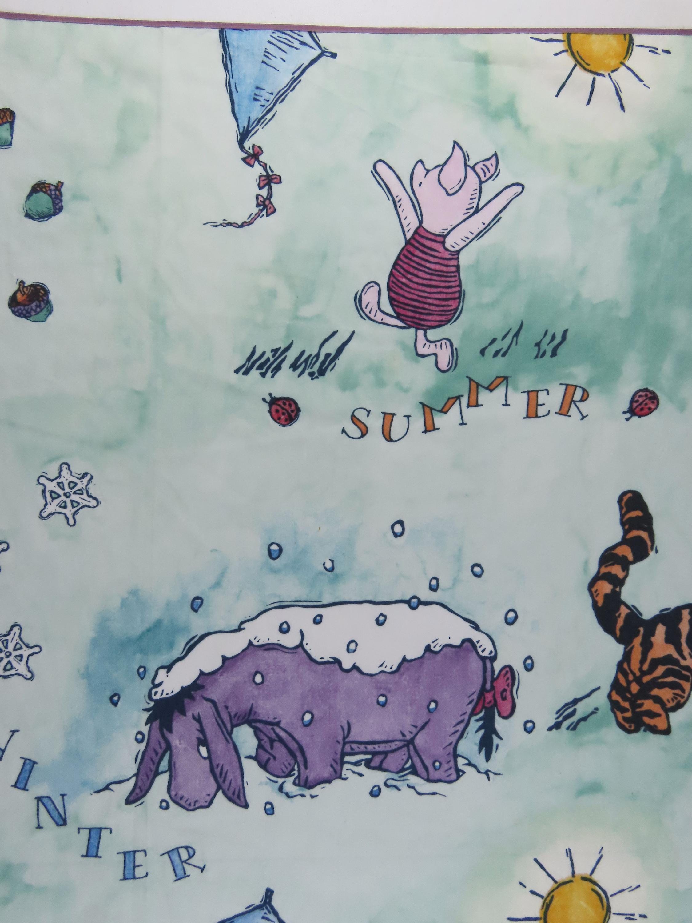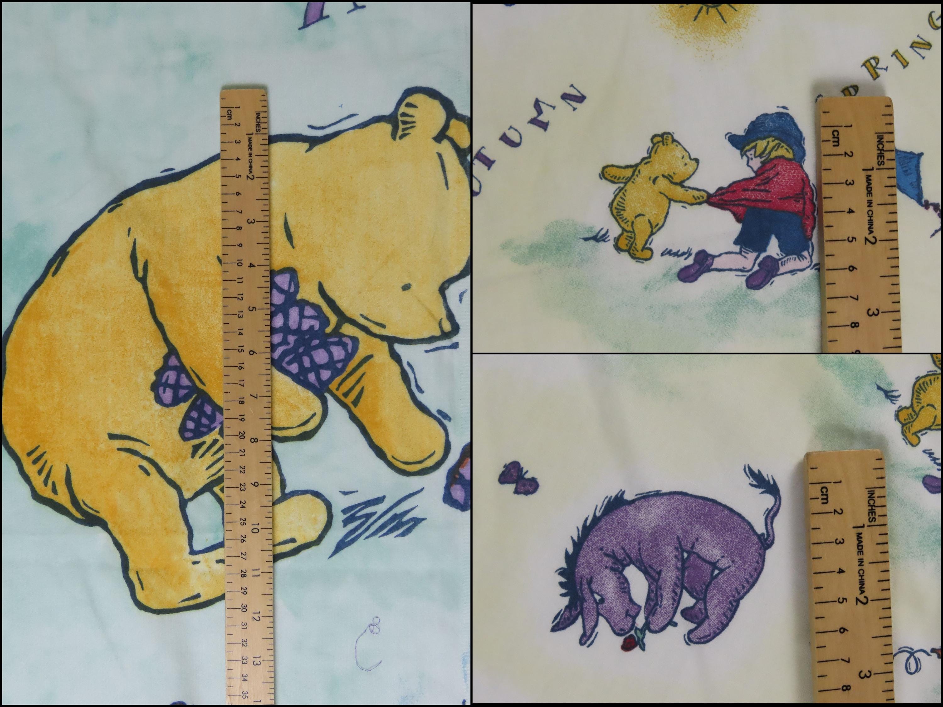 Vintage Classic Winnie the Pooh twin sheet set from 1997 which includes the flat sheet, fitted sheet, and pillowcase. They are 50% cotton and 50% polyester. My camera had a hard time picking up the exact colors.