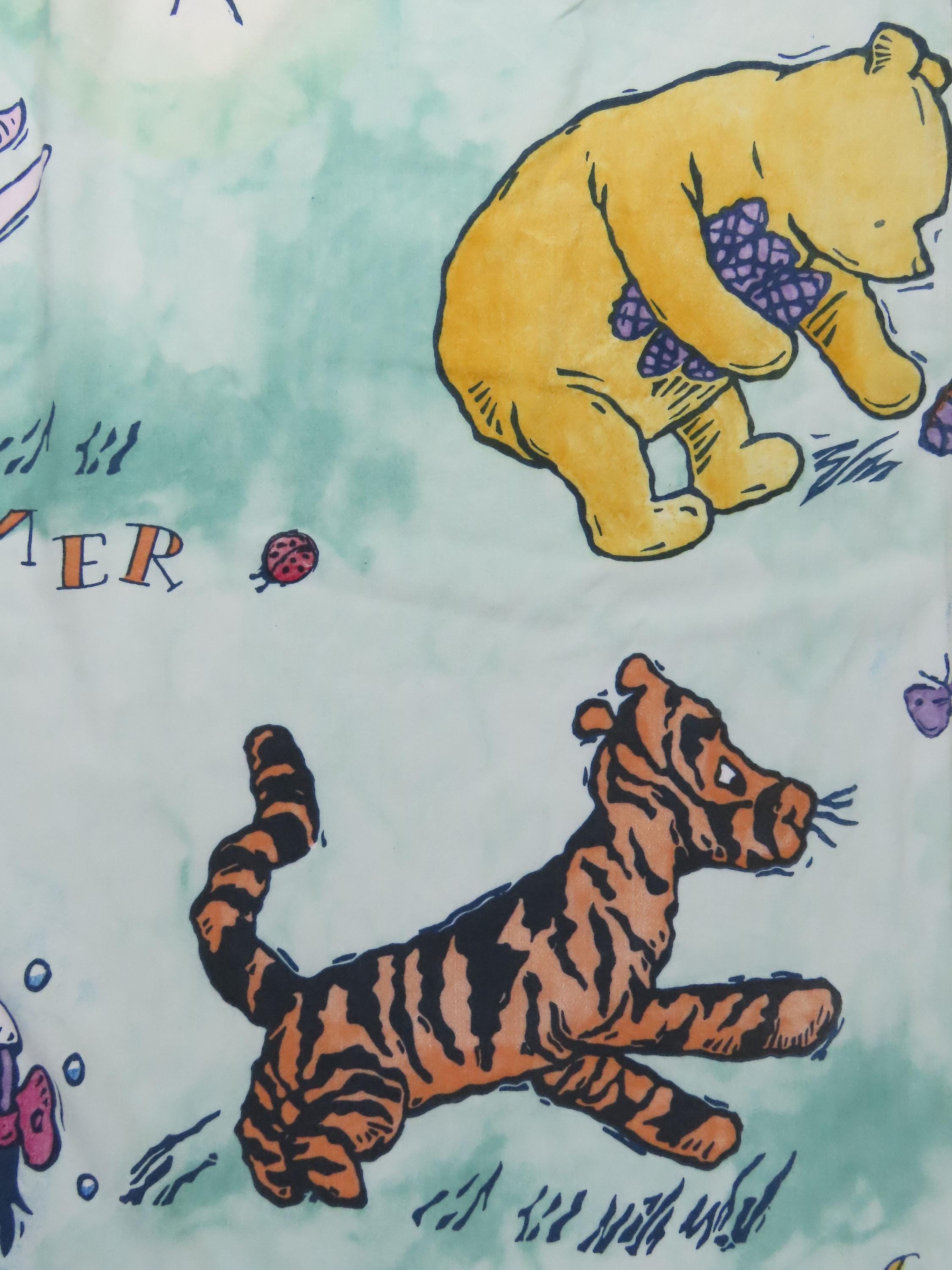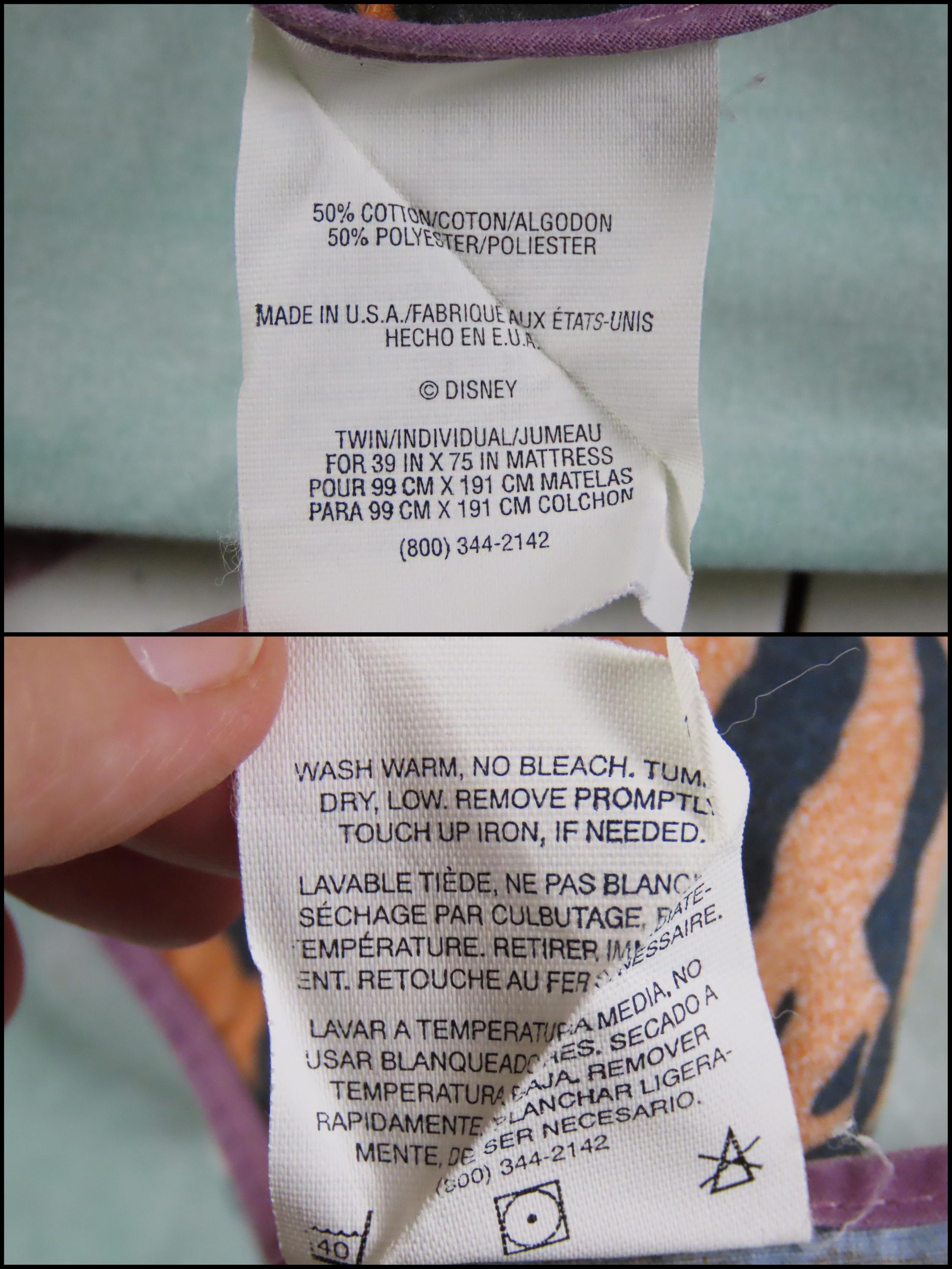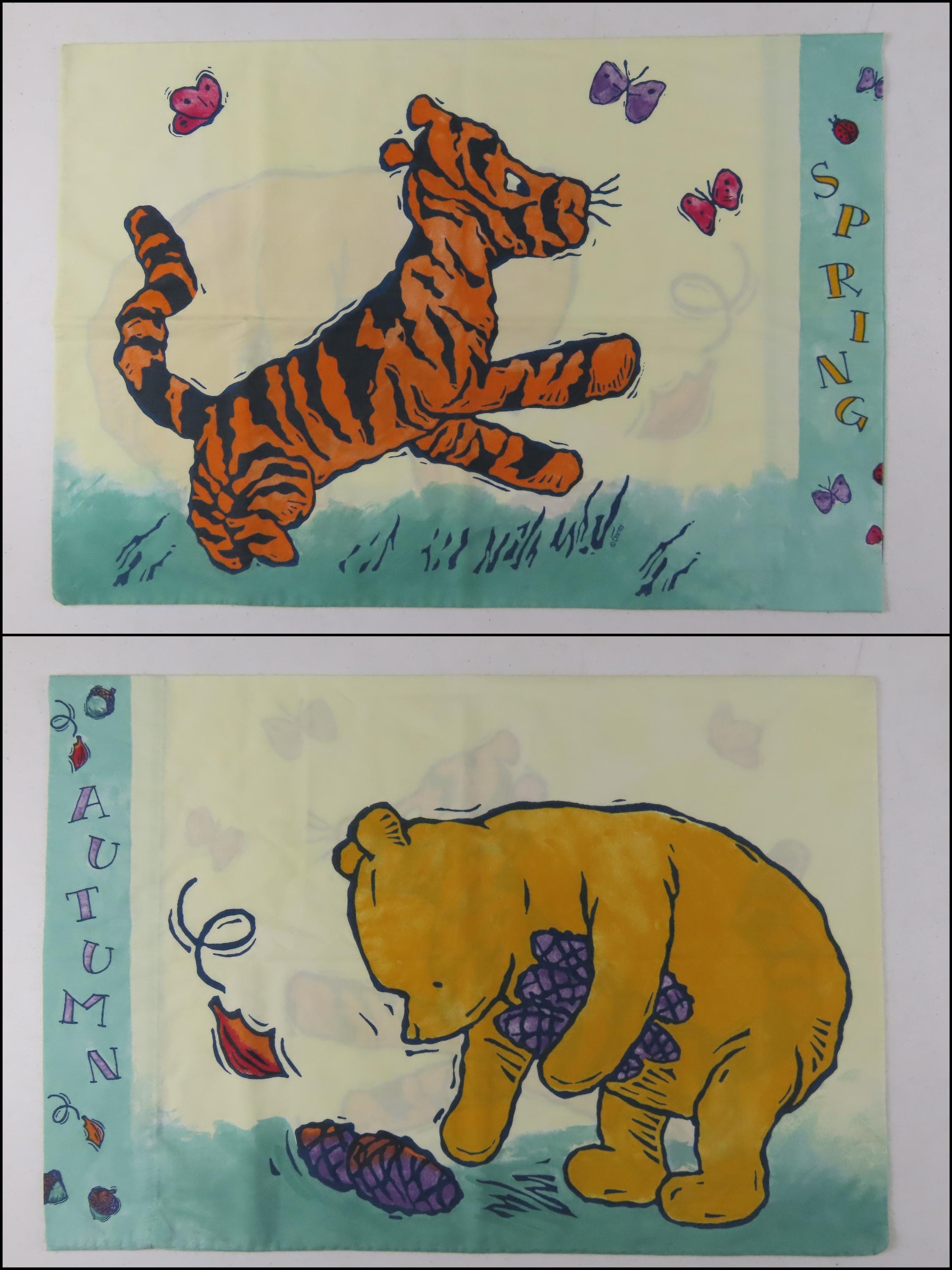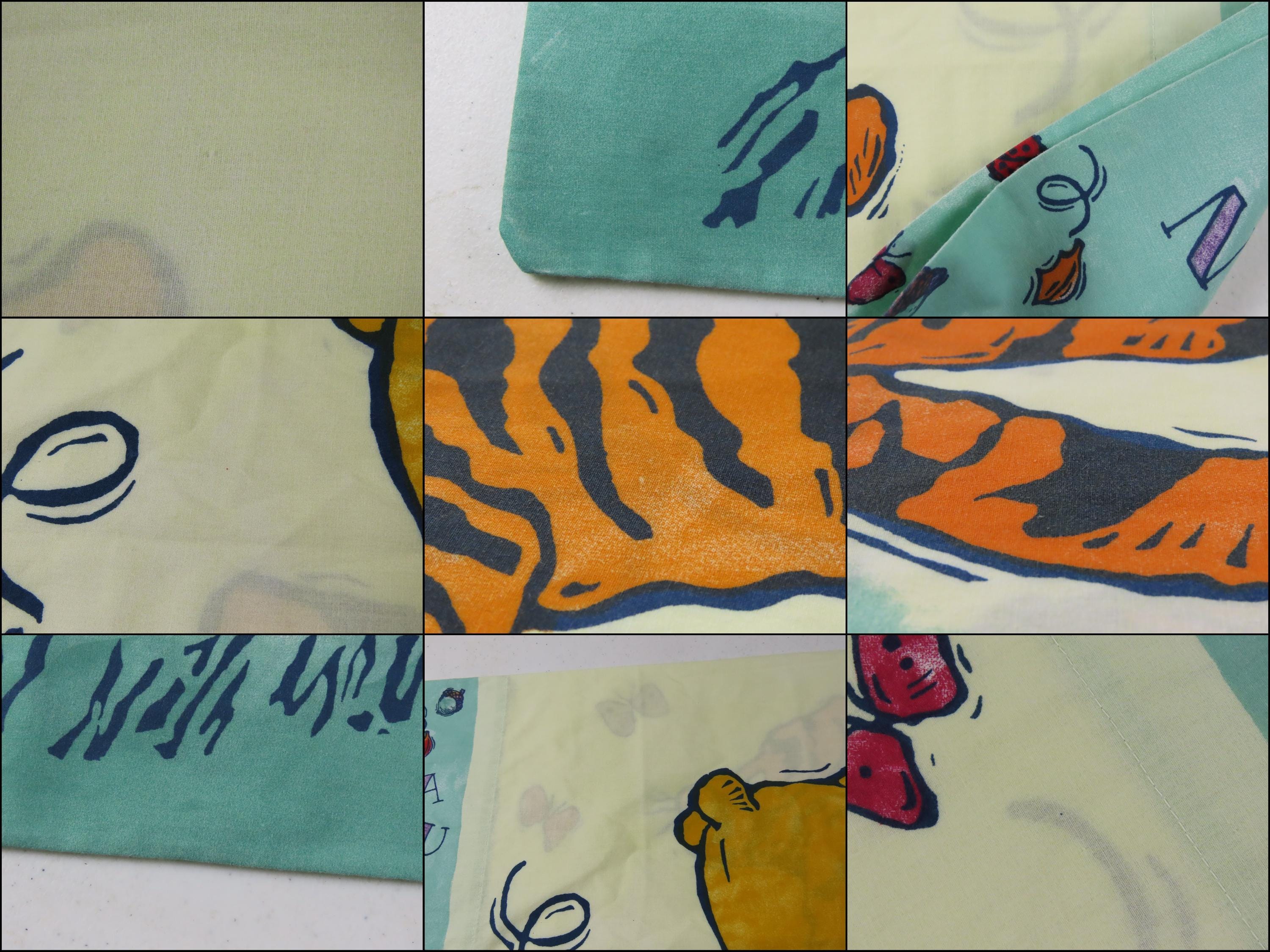 Vintage Classic Winnie the Pooh twin sheet set from 1997 which includes the flat sheet, fitted sheet, and pillowcase. They are 50% cotton and 50% polyester. My camera had a hard time picking up the exact colors.