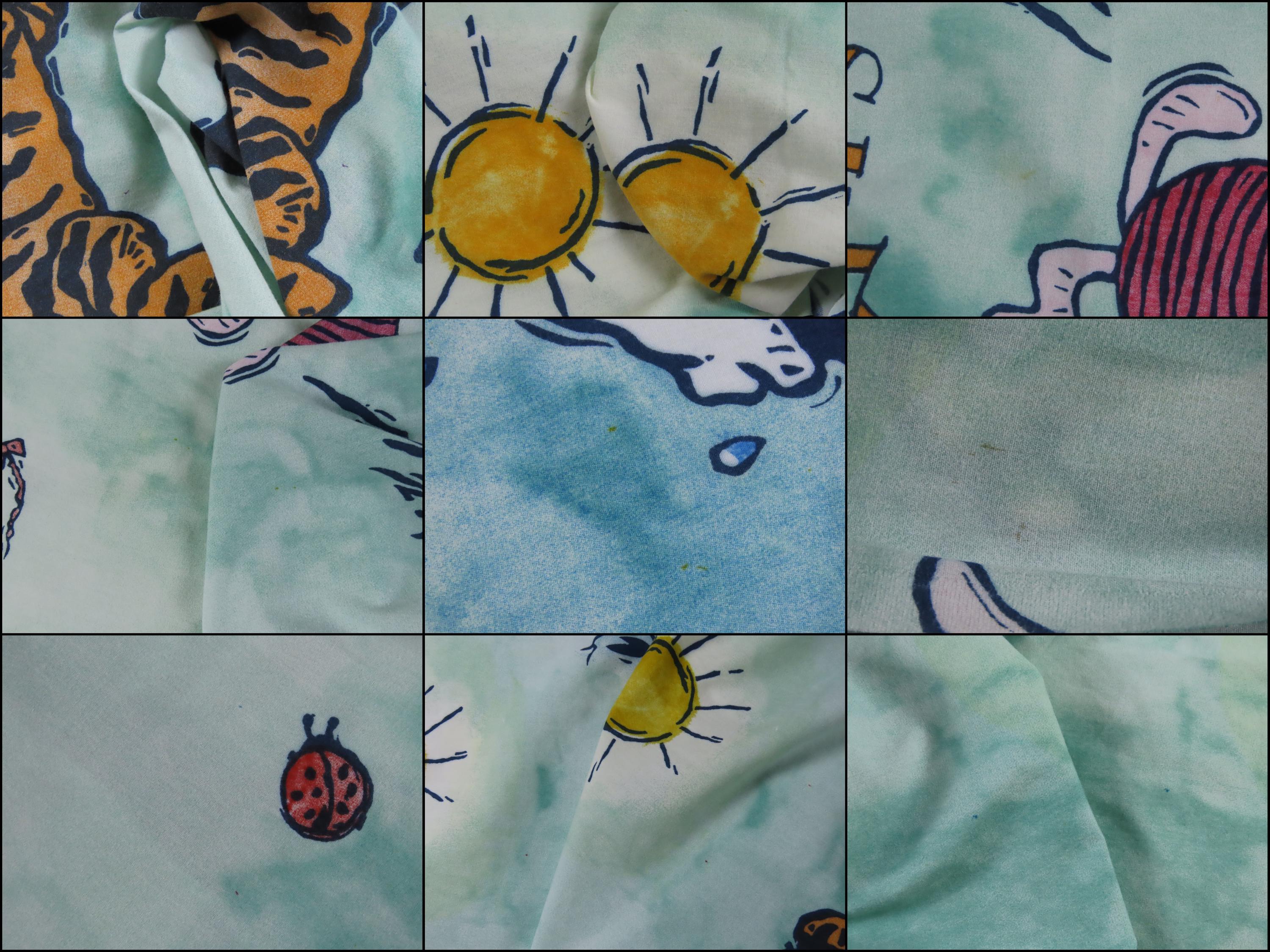 The flat sheet is worn along the edges/stitching and is a little faded near the edge. It has some tiny mark printing errors which repeat in the same spots (at first glance it looked like tiny stains). It has a small stain and some tiny stains.