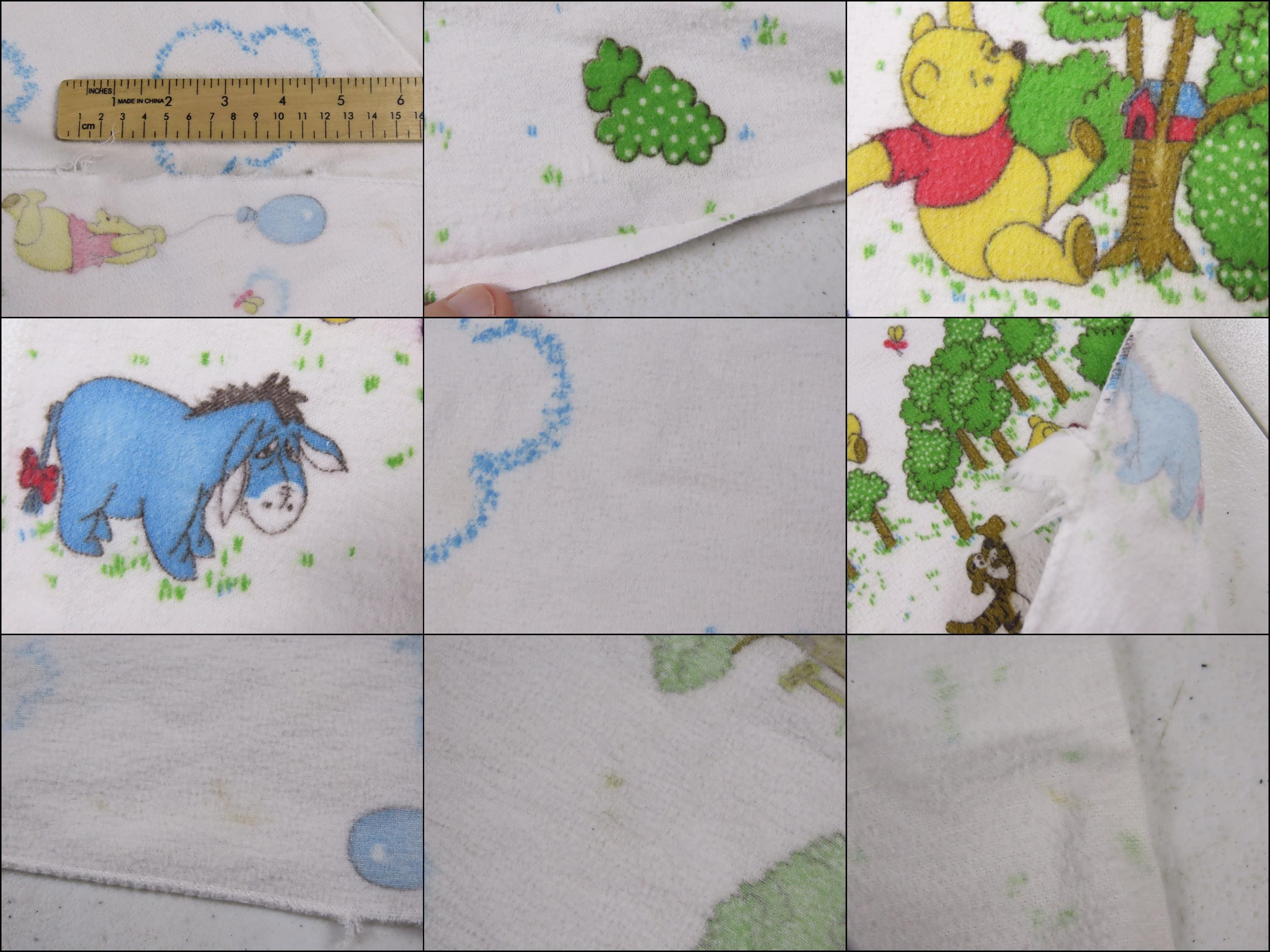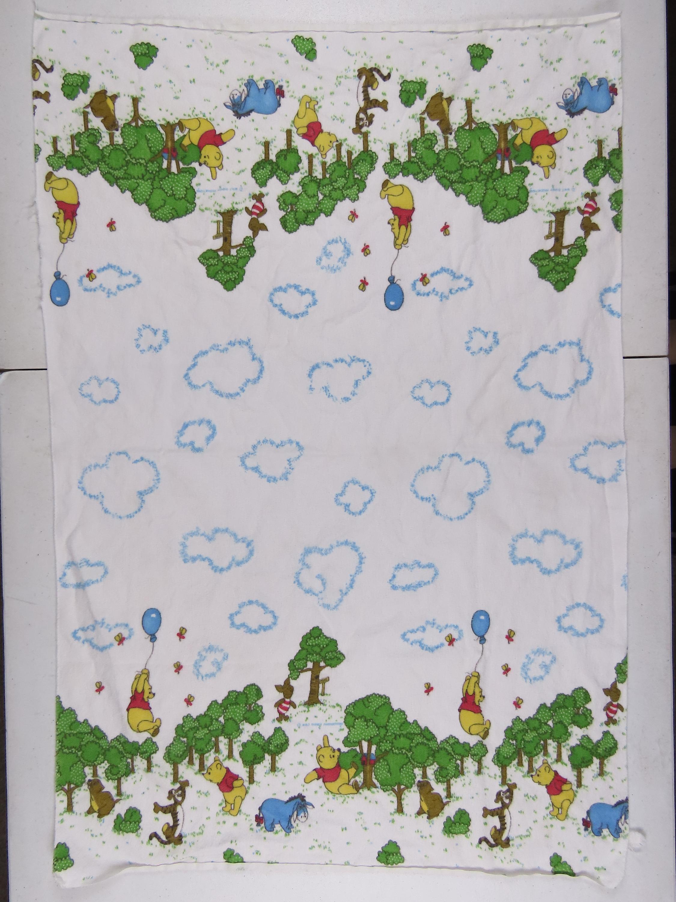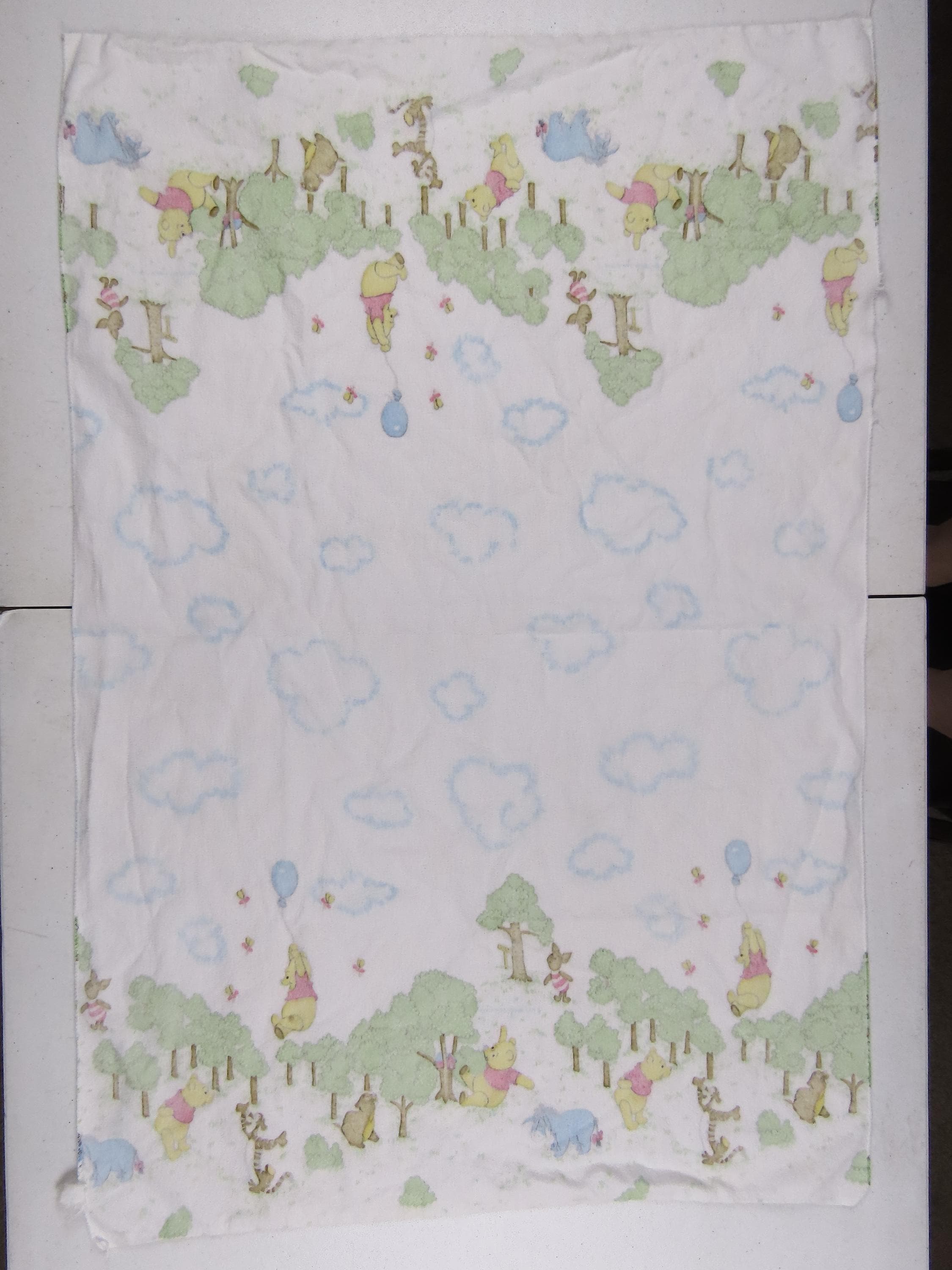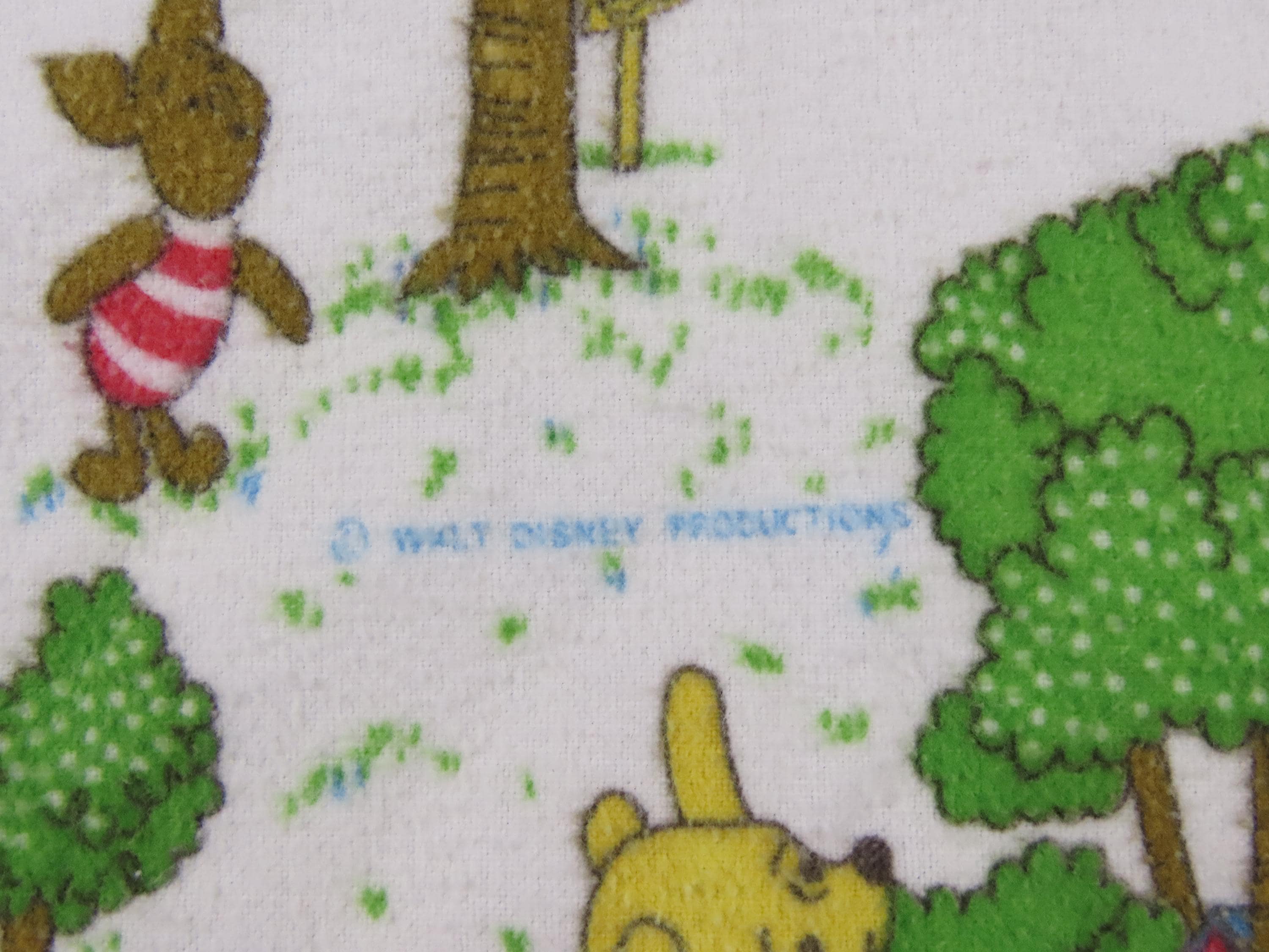 Vintage Winnie the Pooh receiving blanket which is about 38" by 25" (98 cm by 64 cm). The colors are a little faded in areas, it is worn along the edges, and it has heavy pilling. There are thread snags, missing thread spots, and the stitching is undone for about 5 inches along the edge (edge is fraying). It looks slightly discolored in areas, and the backside has some small stains.