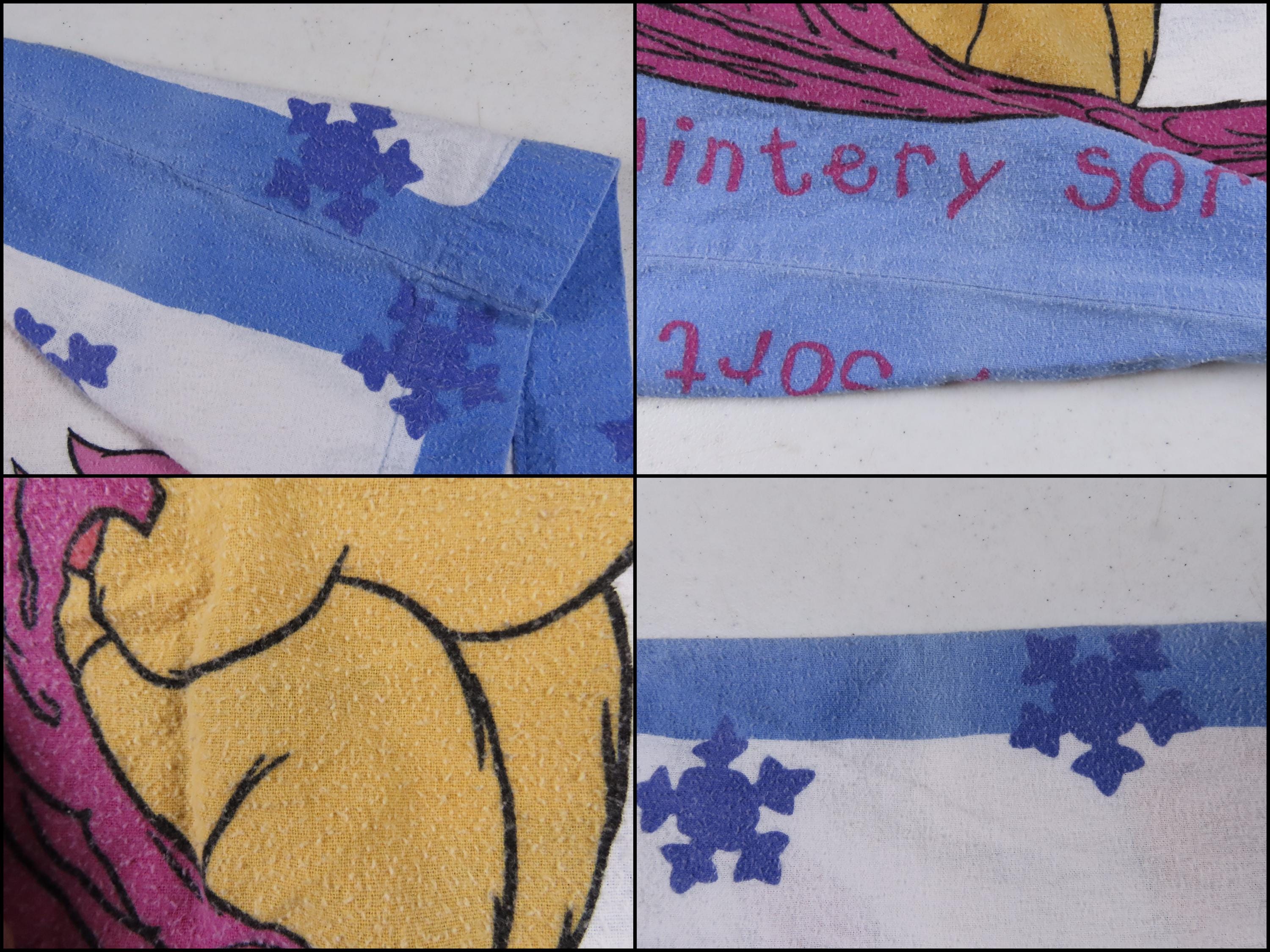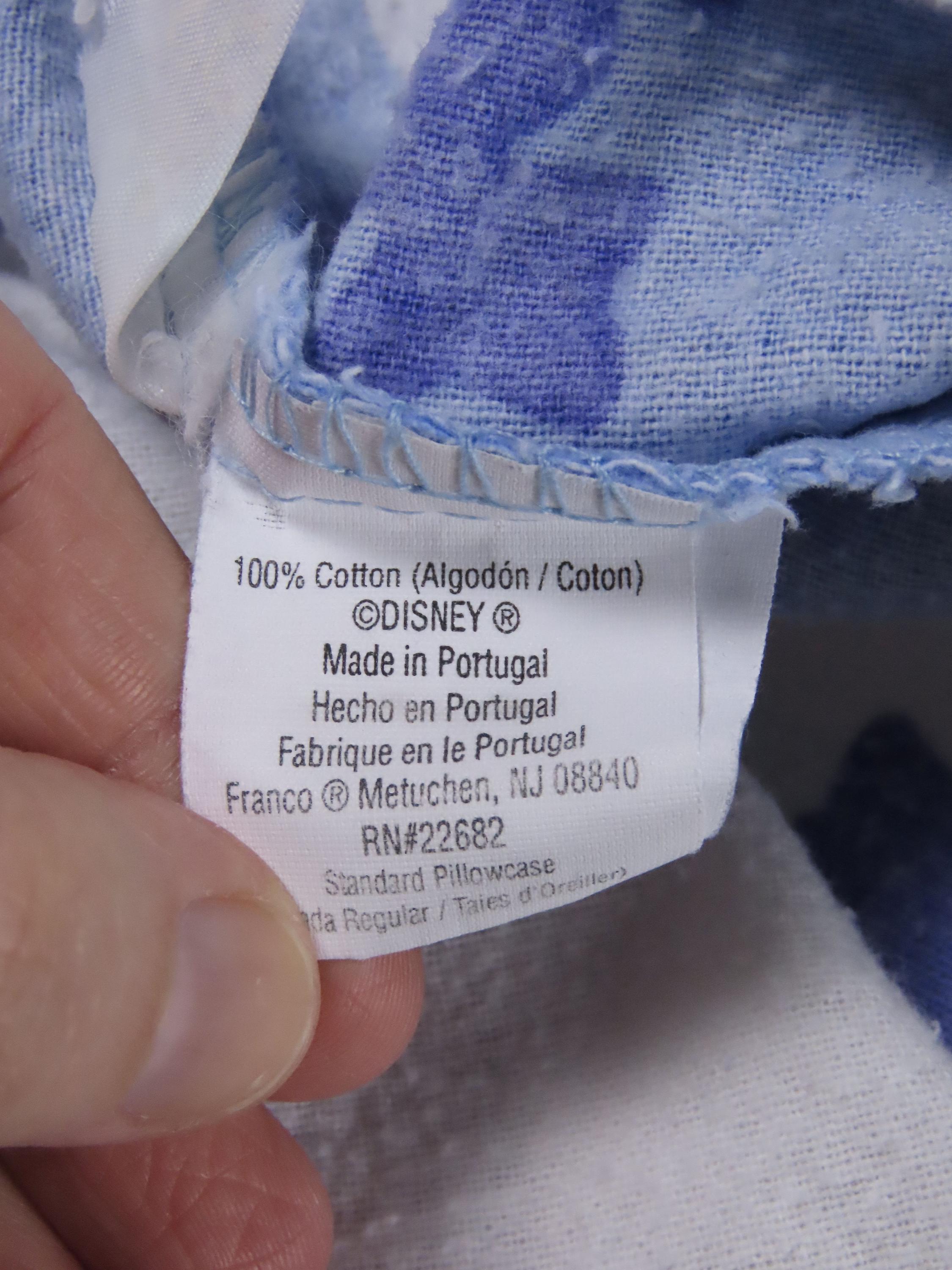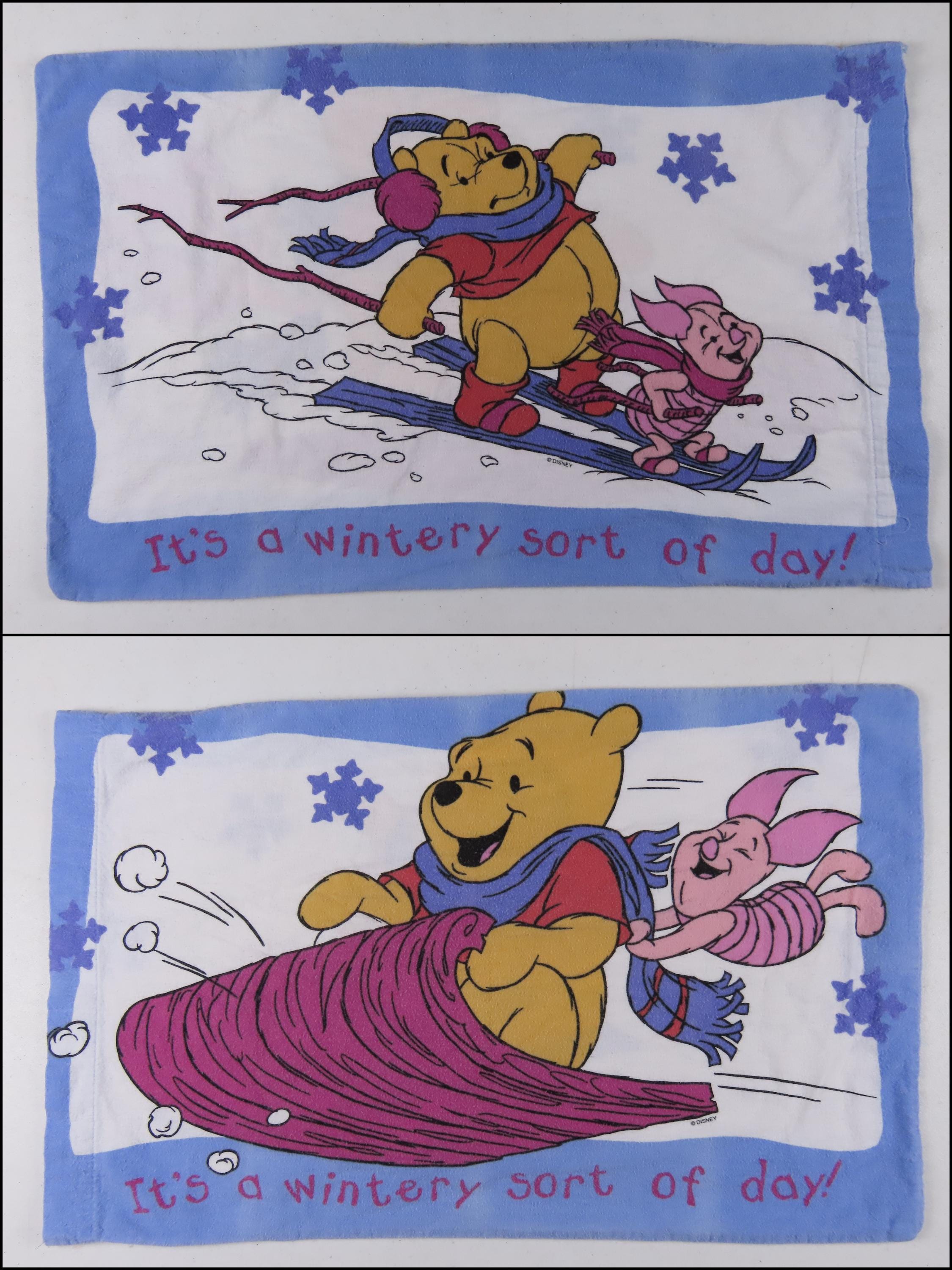 Vintage Winnie the Pooh flannel pillowcase which is 100% cotton. It has heavy pilling. It is worn along the edges/stitching and is faded in areas (especially the blue areas).