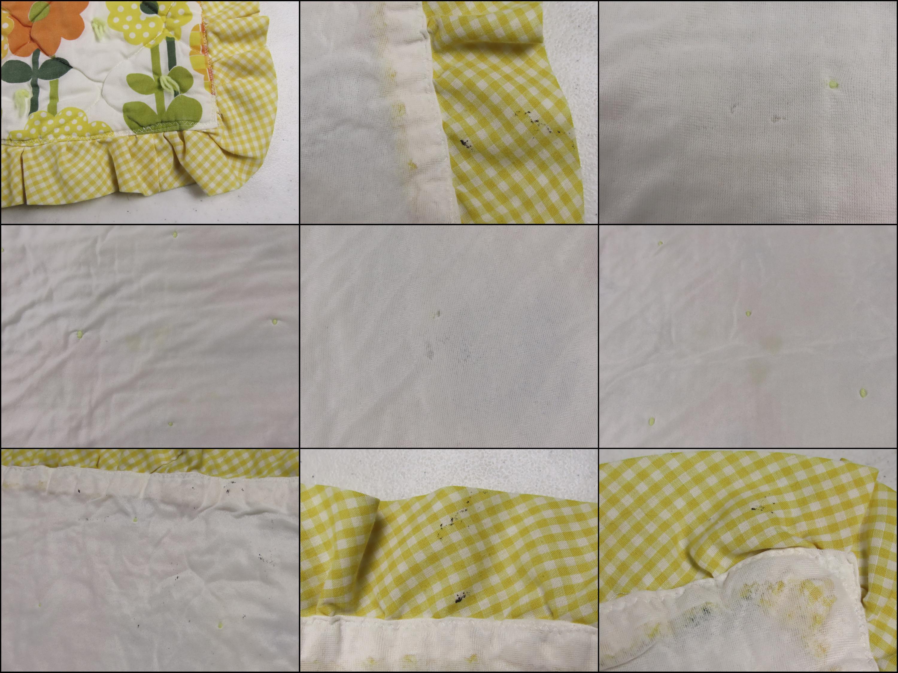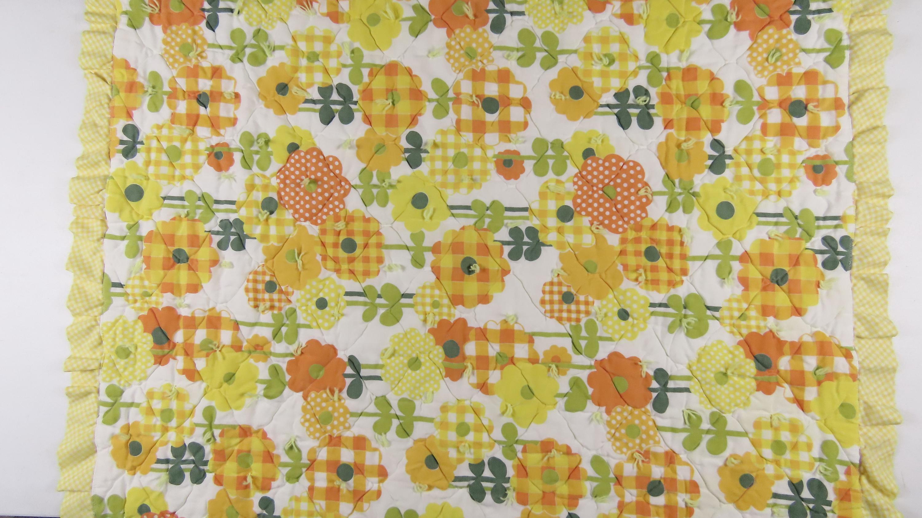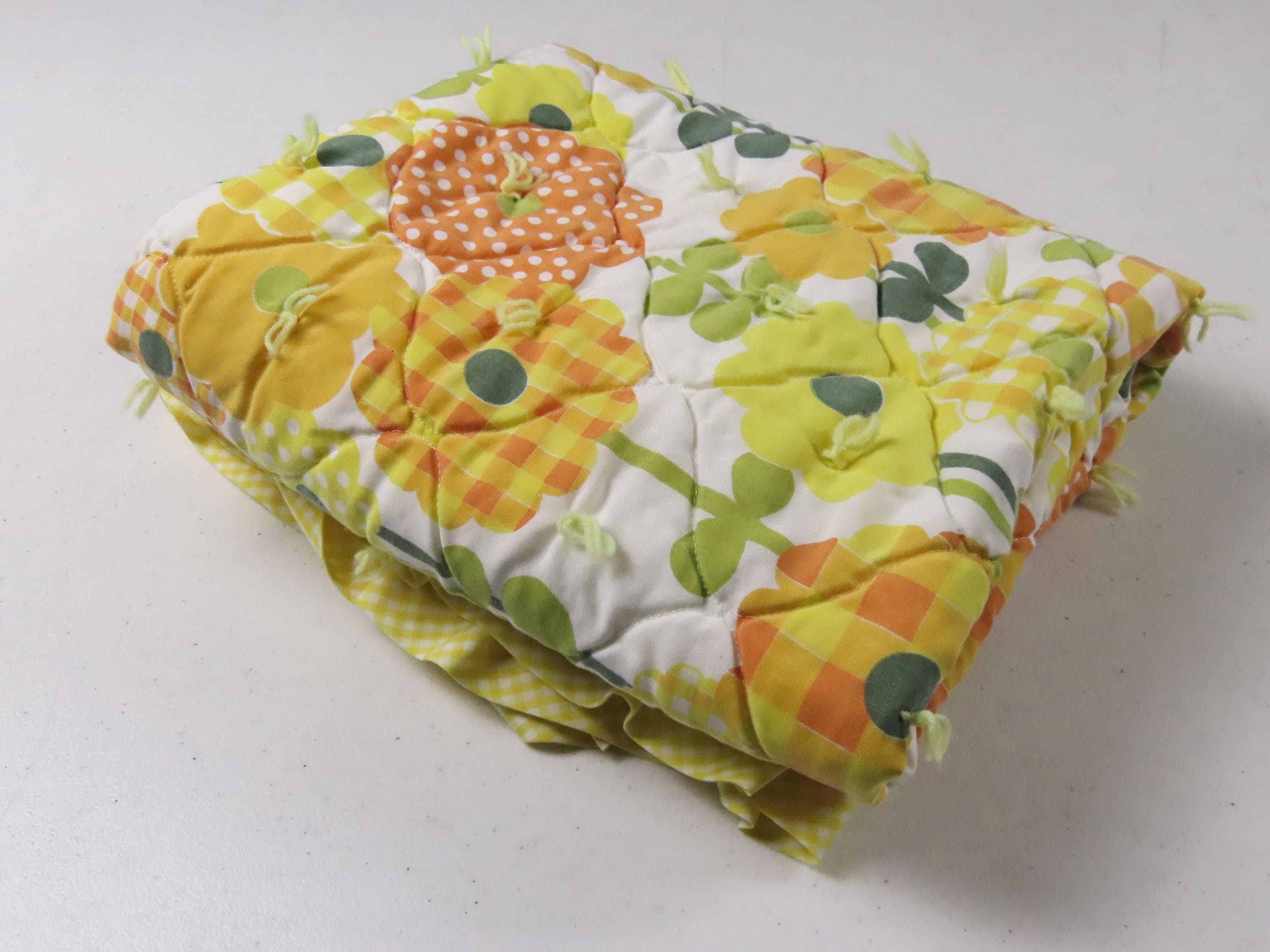 Vintage floral small quilted square blanket which is about 44" long by 44" wide (112 cm by 111 cm) which includes the ruffled edge. My camera had a hard time picking up the exact colors. It is worn along the edges/stitching, the colors are faded/streaky, and it is sewn unevenly in areas. It is pilling in areas (especially the ruffled edge), and some lint has stuck to the tips of the yarn ties. The front has some small and tiny marks/stains, and a cluster of small dark marks on the corner.
