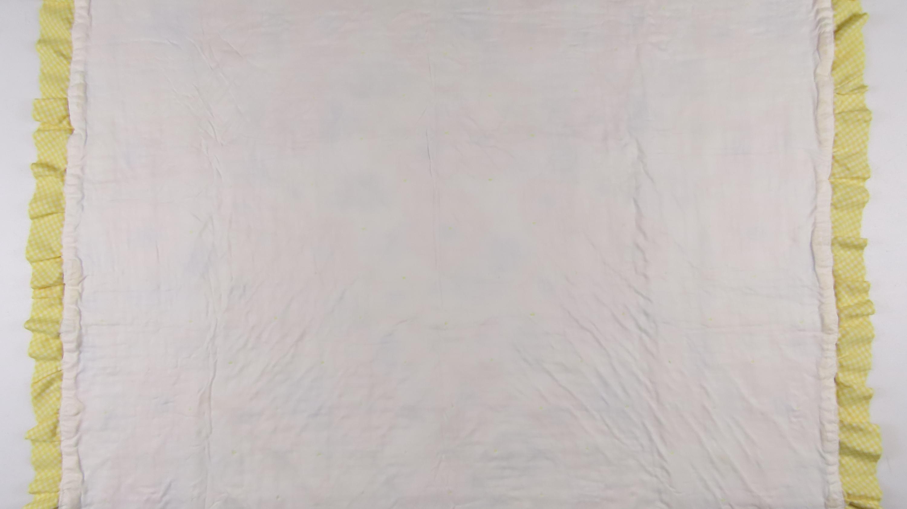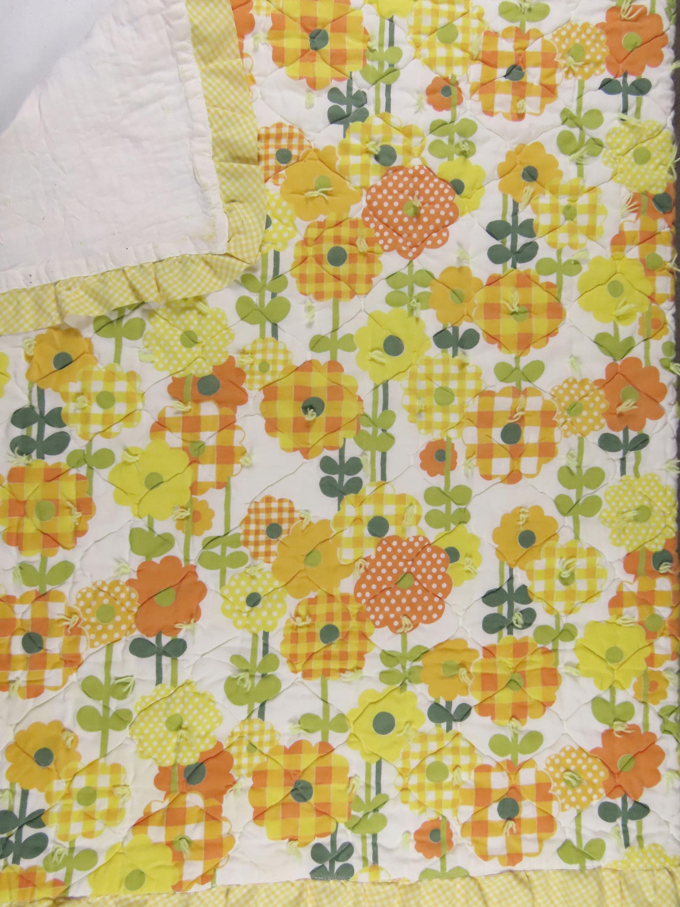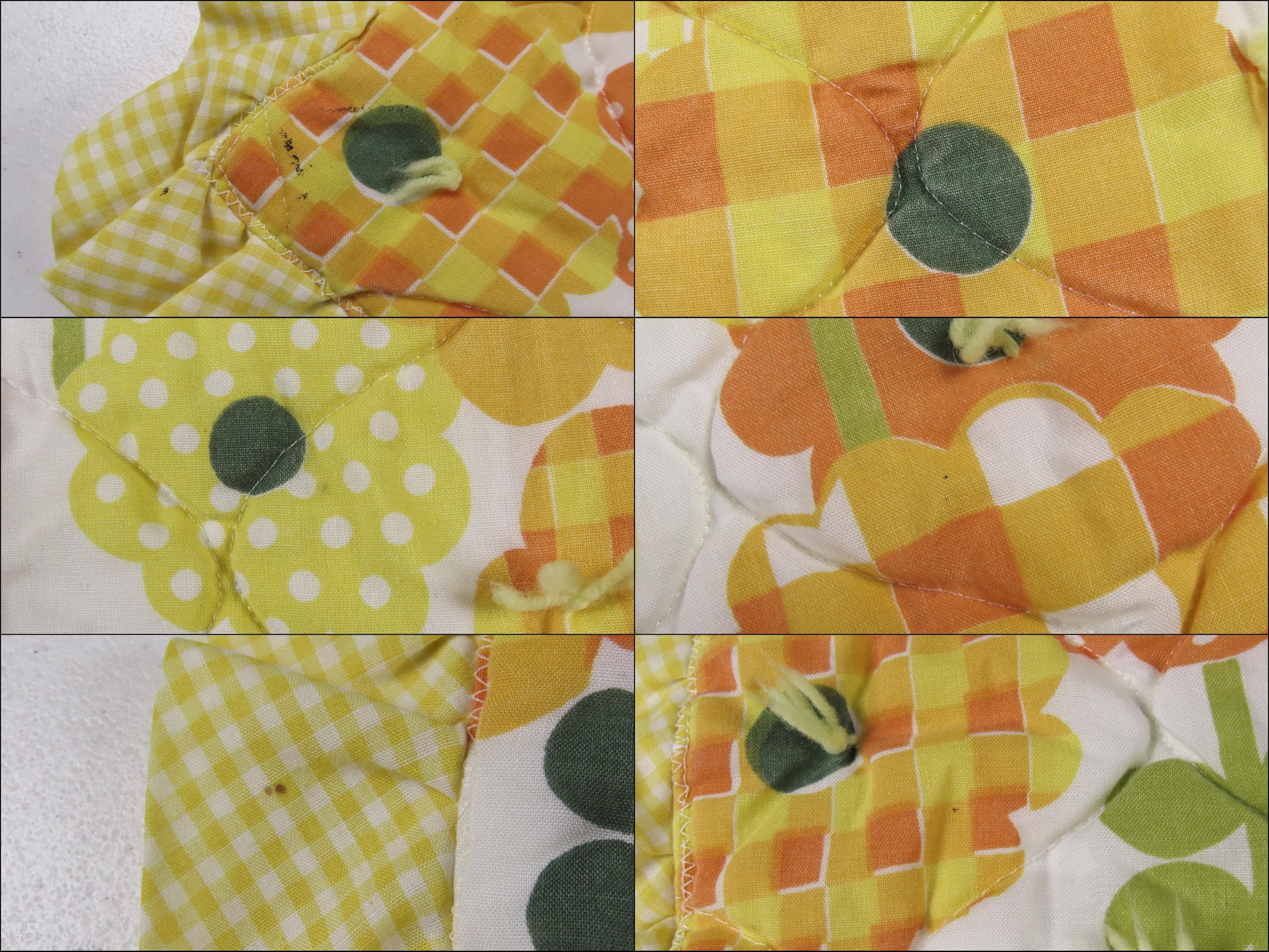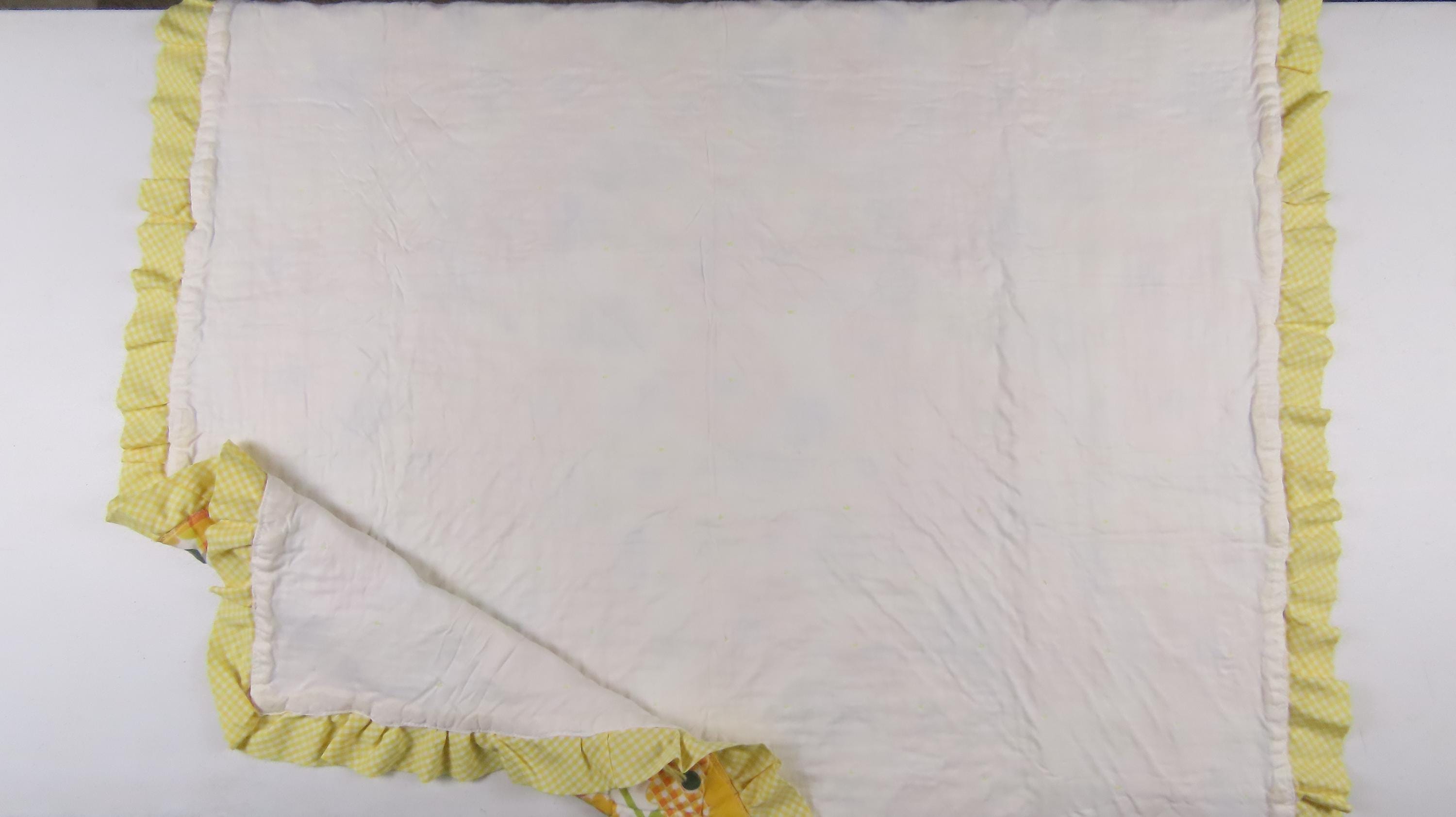 Vintage floral small quilted square blanket which is about 44" long by 44" wide (112 cm by 111 cm) which includes the ruffled edge. My camera had a hard time picking up the exact colors. It is worn along the edges/stitching, the colors are faded/streaky, and it is sewn unevenly in areas. It is pilling in areas (especially the ruffled edge), and some lint has stuck to the tips of the yarn ties. The front has some small and tiny marks/stains, and a cluster of small dark marks on the corner.