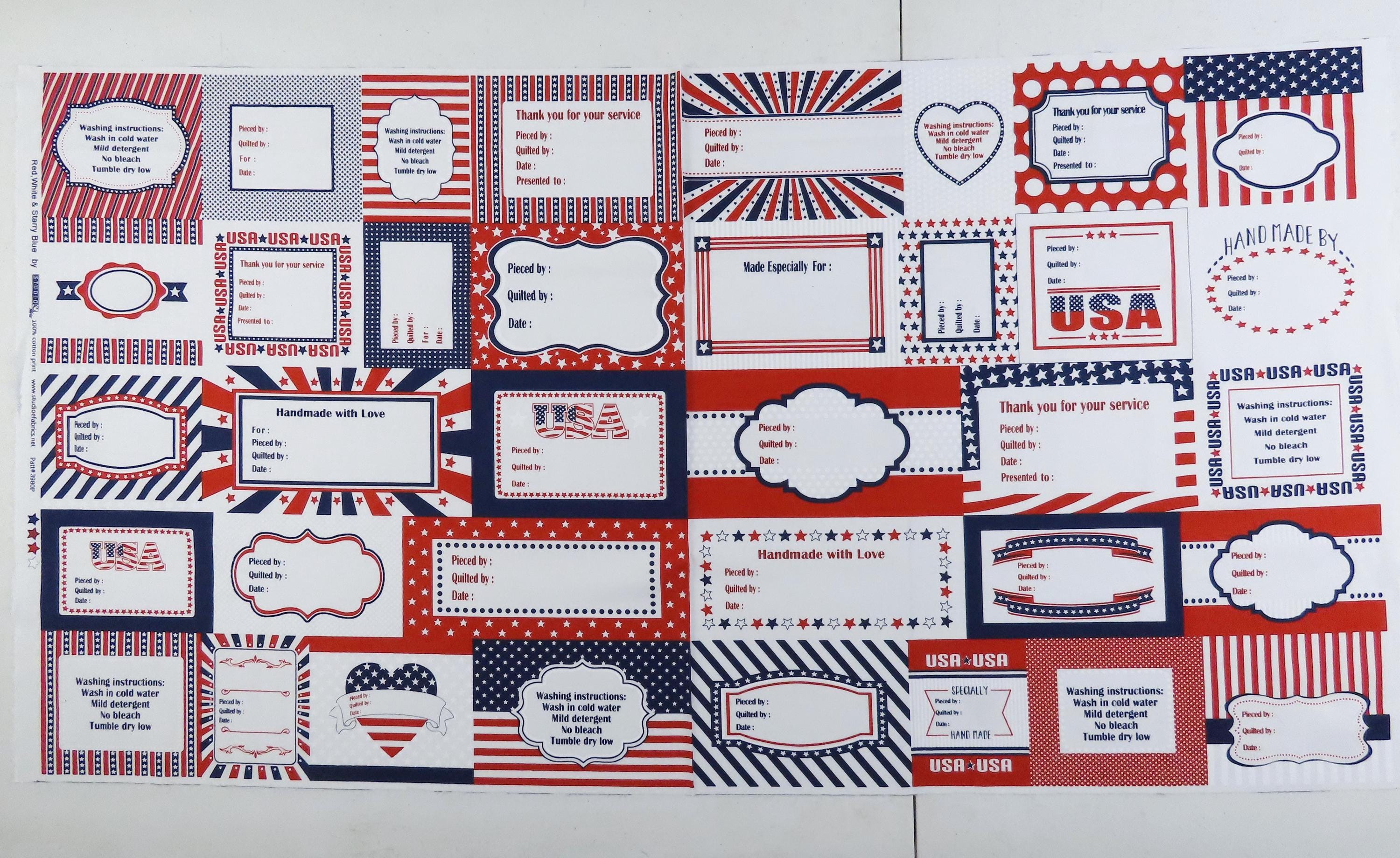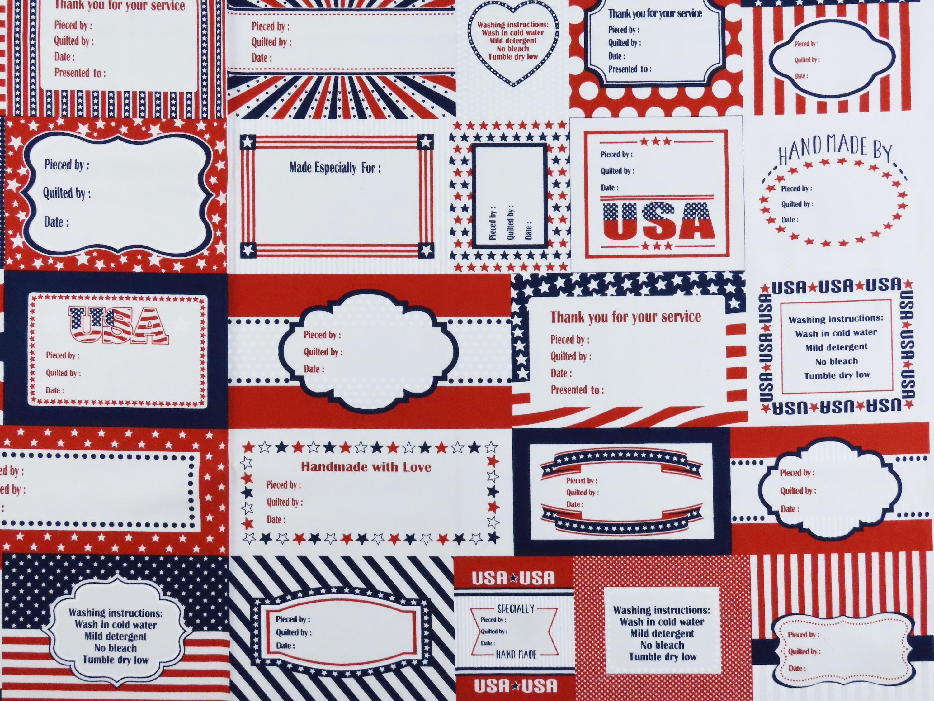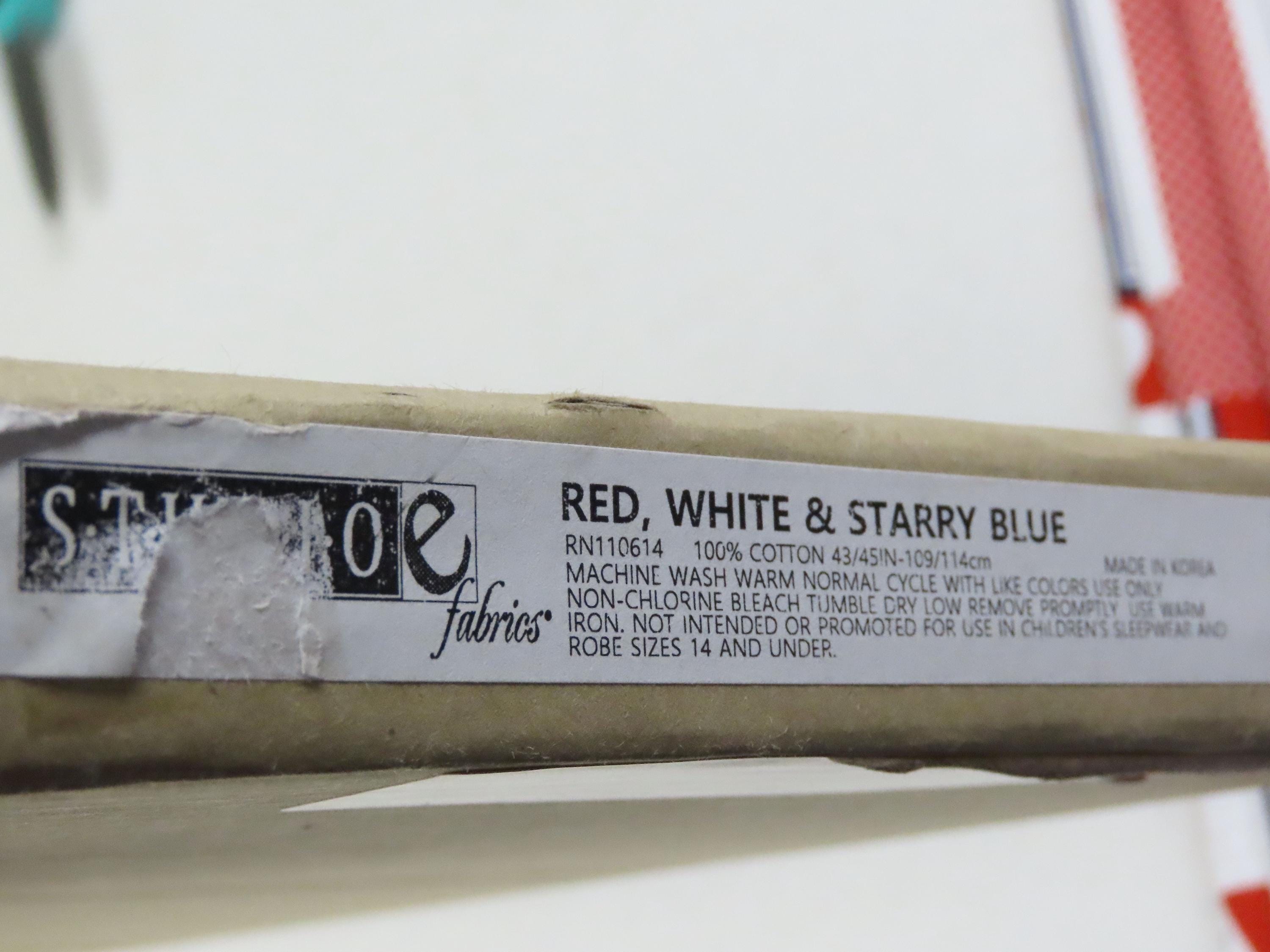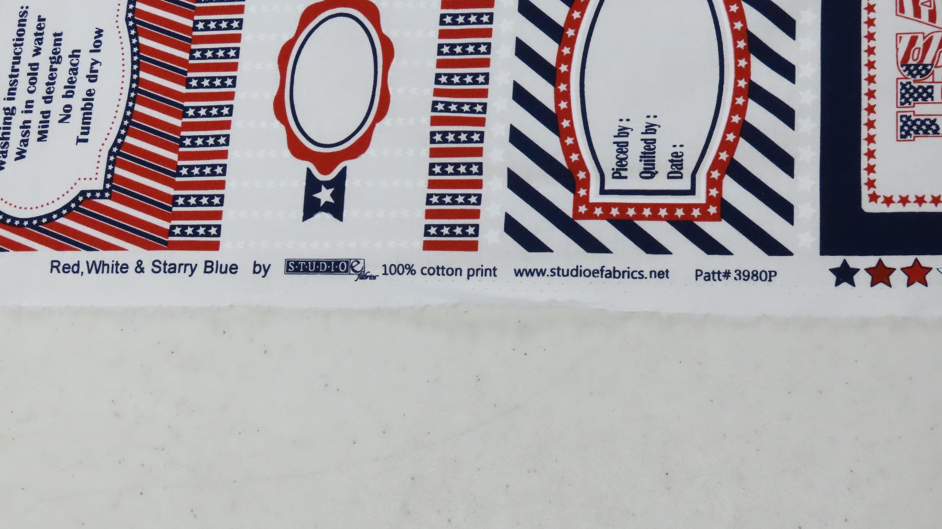 Studio E "Fabrics Red, White, and Starry Blue 3980P -78" fabric panel for quilting which is 100% cotton. The panels are about 23.5" tall by 44" wide. Each panel has 29 quilting labels, and 7 washing instruction labels. It is sold by the panel, but if multiple panels are bought, they will be one continuous piece. The fabric has occasional printing errors and is a little wrinkled/creased in areas (especially towards the end of the bolt).