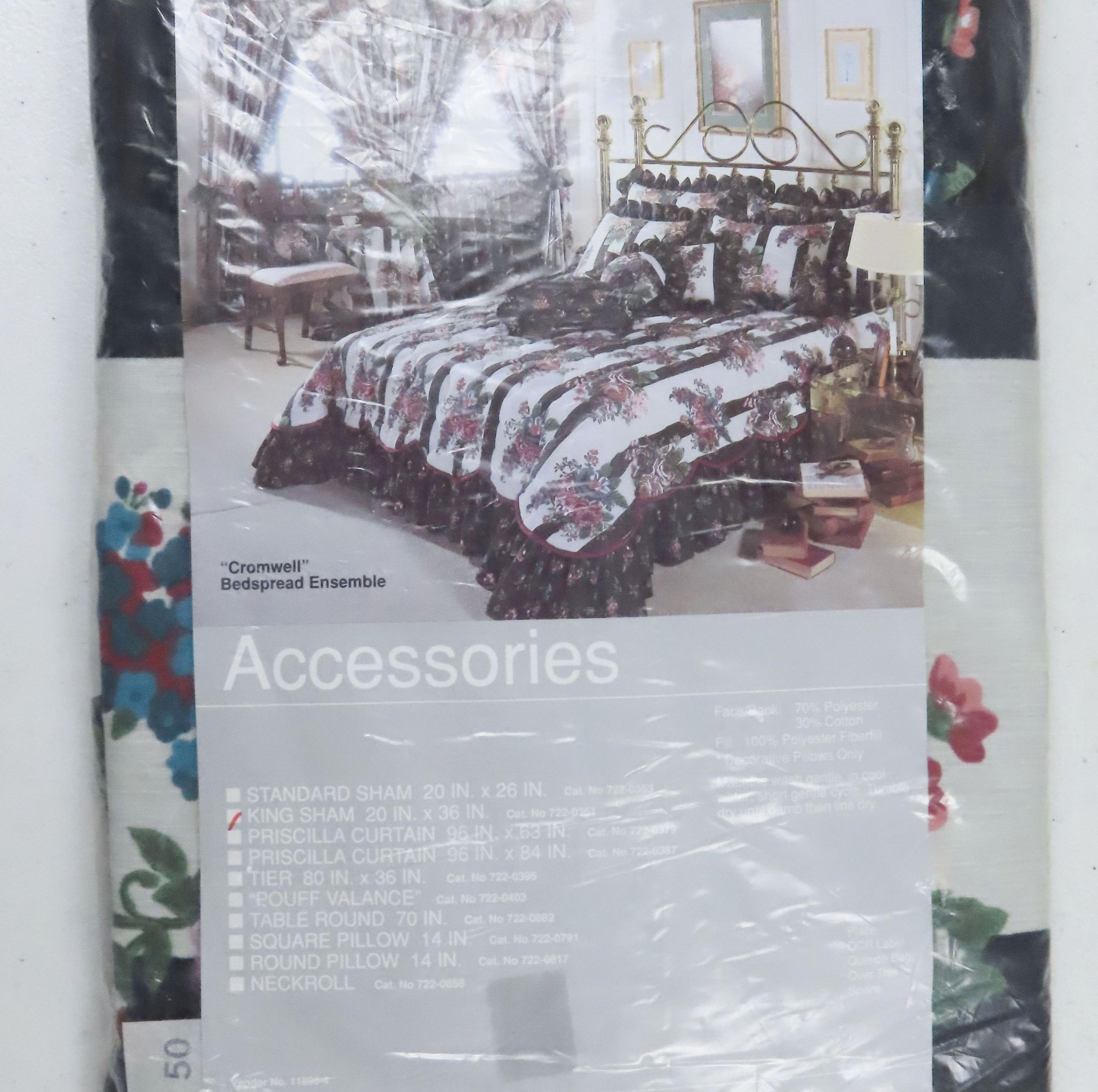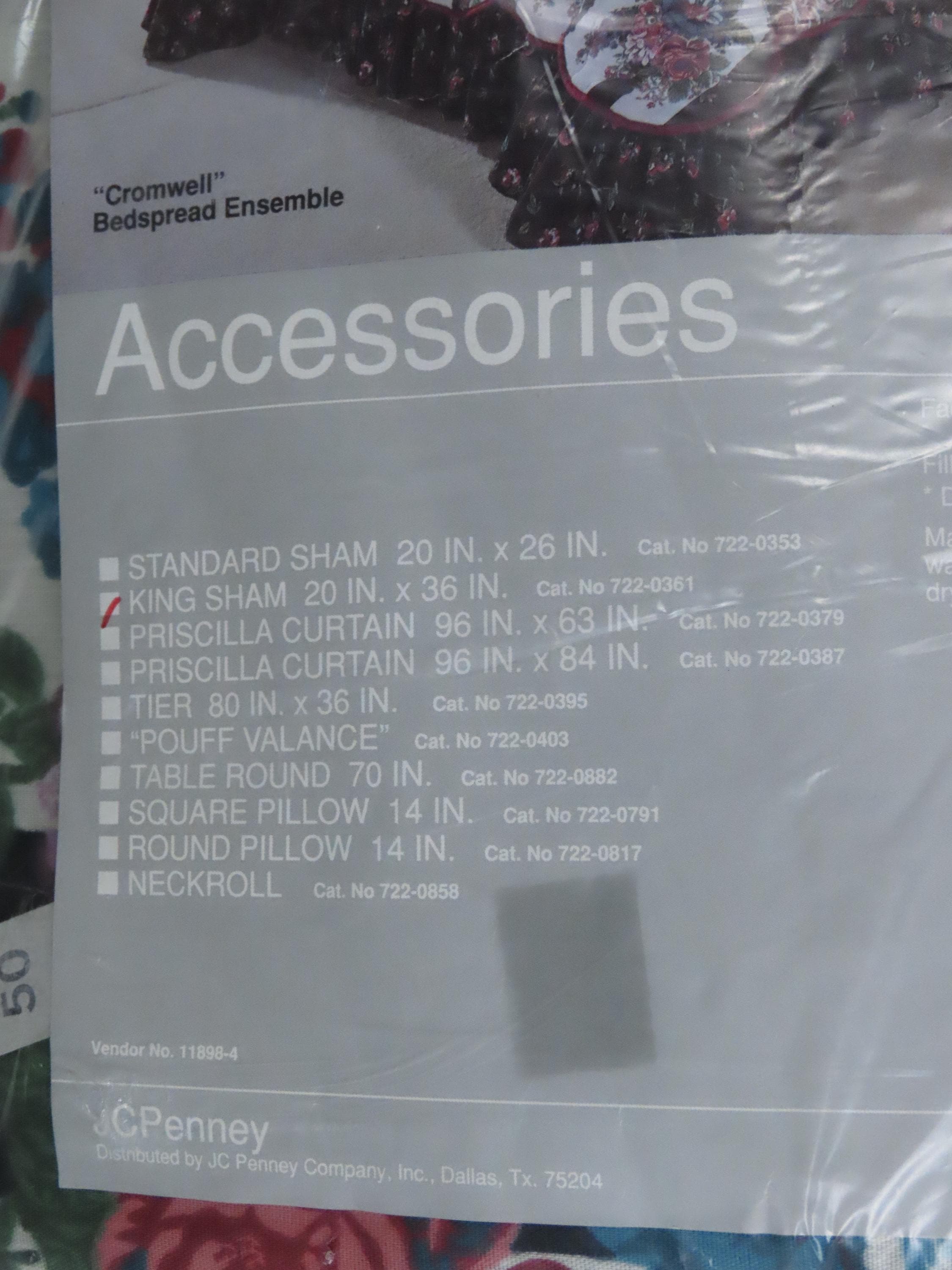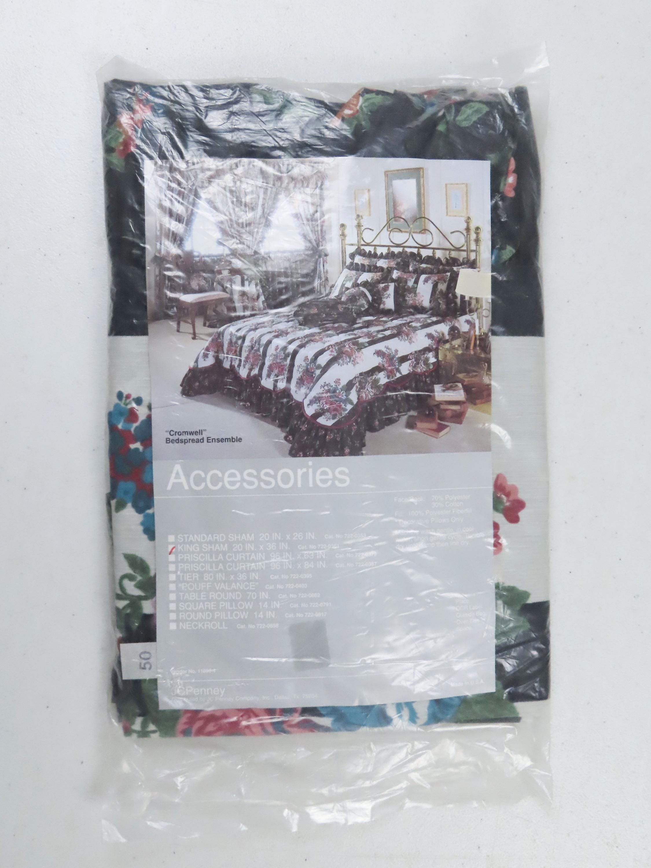 Vintage JC Penney "Cromwell" floral king-sized pillow sham which is new in the package. It is 20" by 36" and is 70% polyester/30% cotton. The plastic packaging is worn. There are some small holes in the plastic, as well as some marks on the plastic packaging.