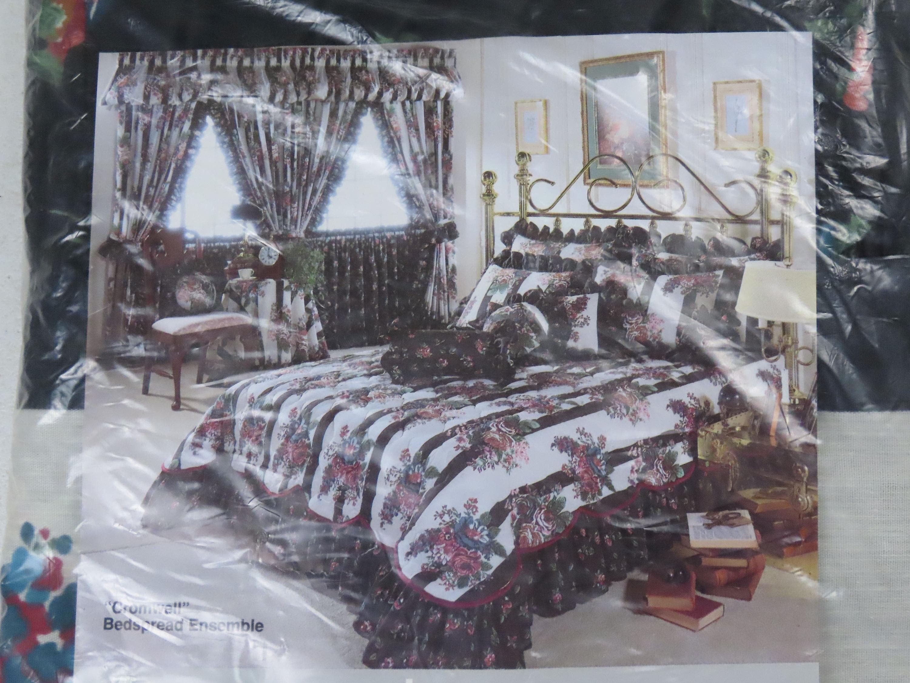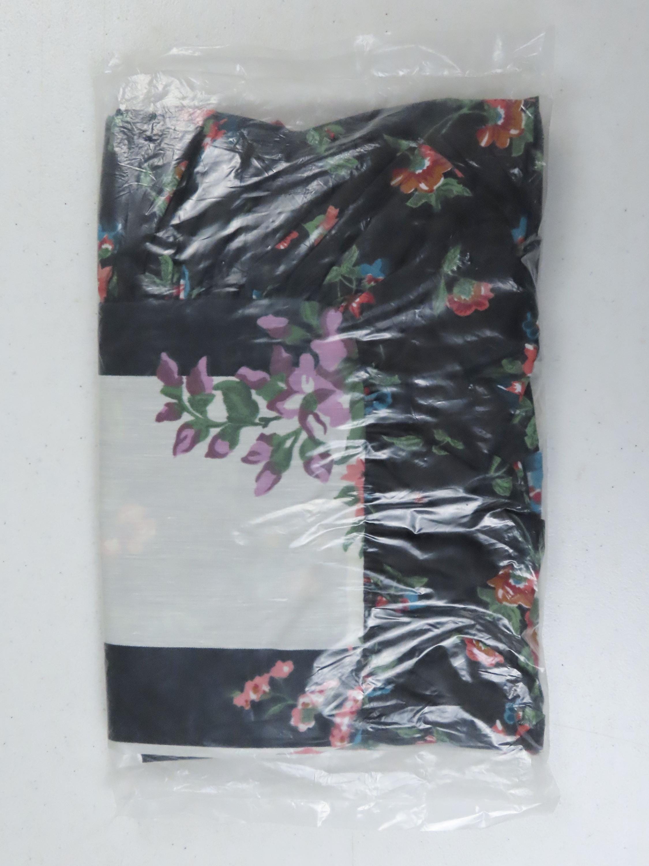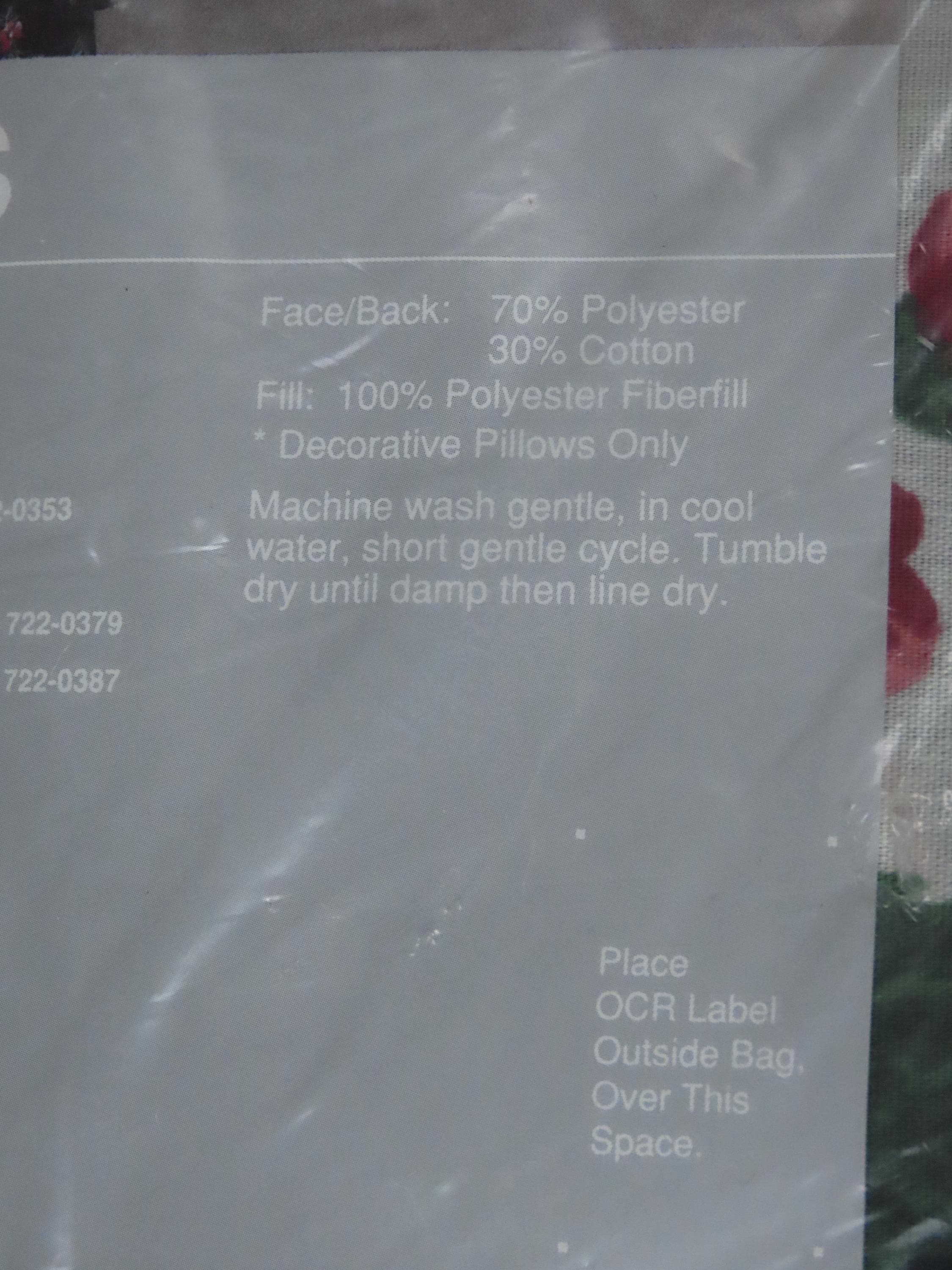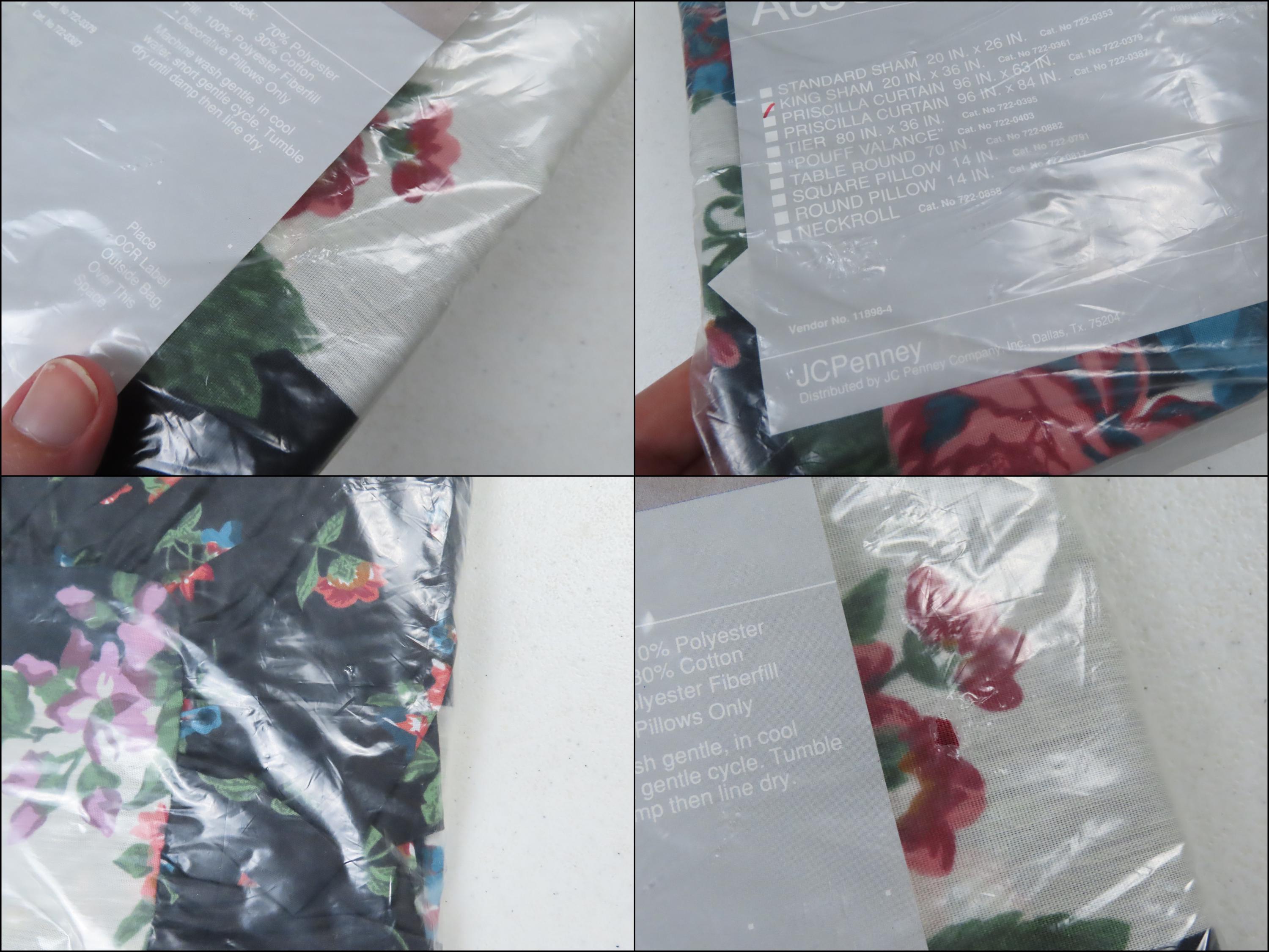 Vintage JC Penney "Cromwell" floral king-sized pillow sham which is new in the package. It is 20" by 36" and is 70% polyester/30% cotton. The plastic packaging is worn. There are some small holes in the plastic, as well as some marks on the plastic packaging.
