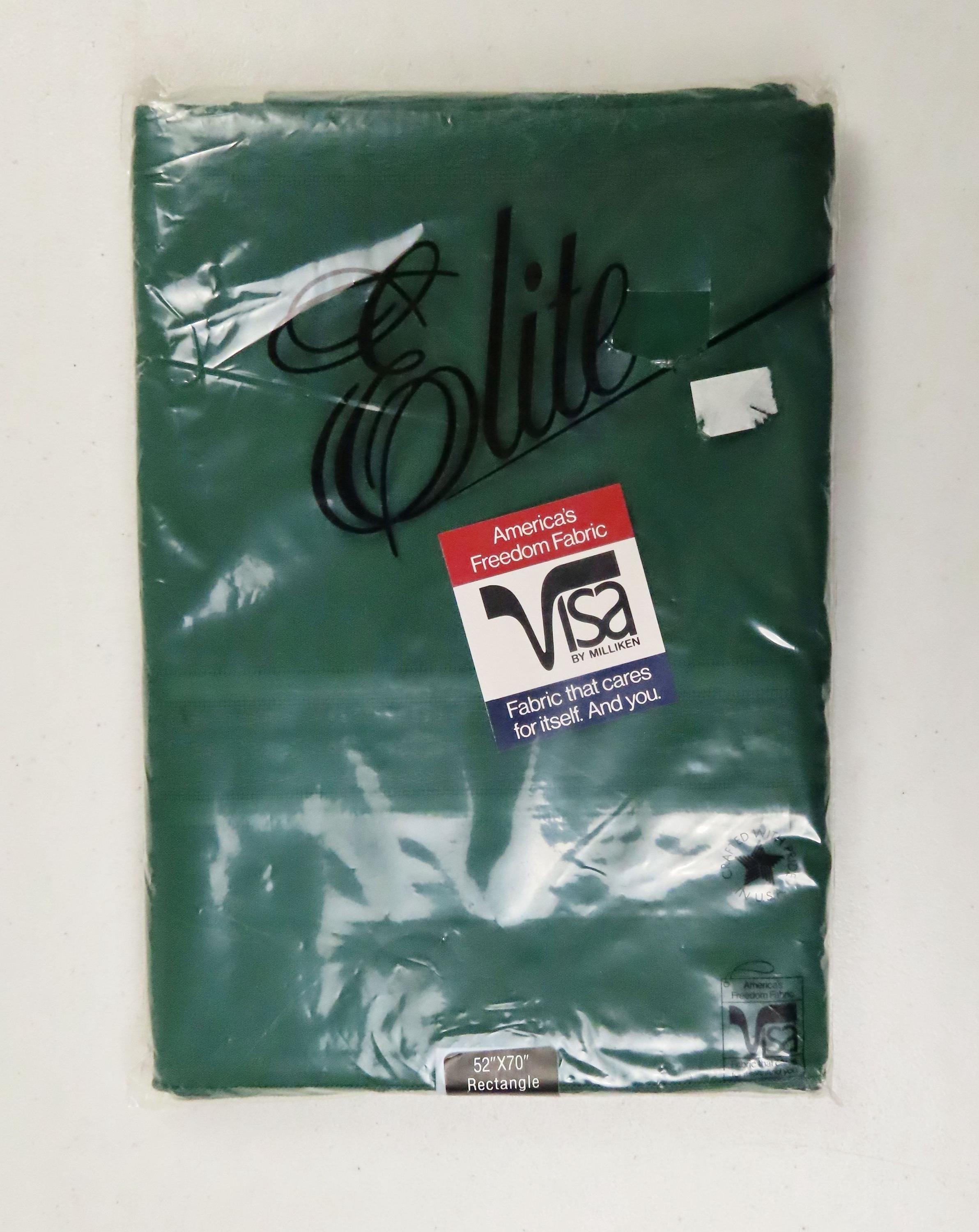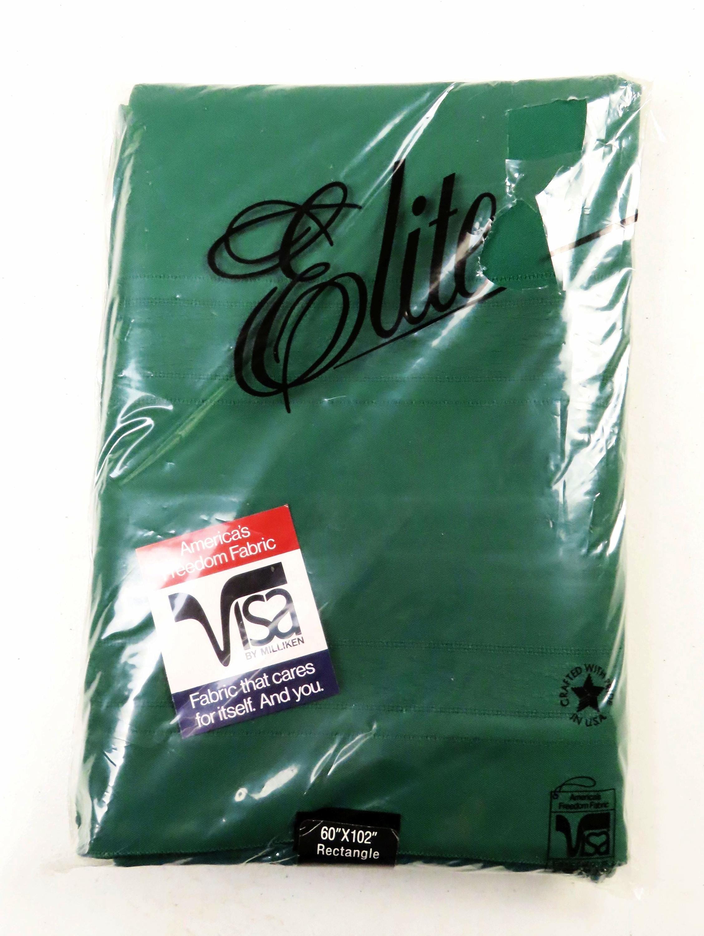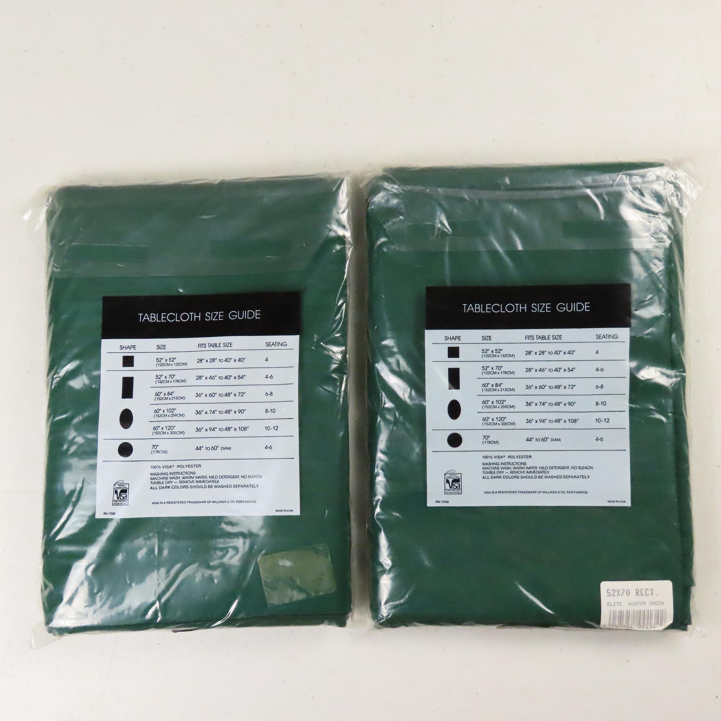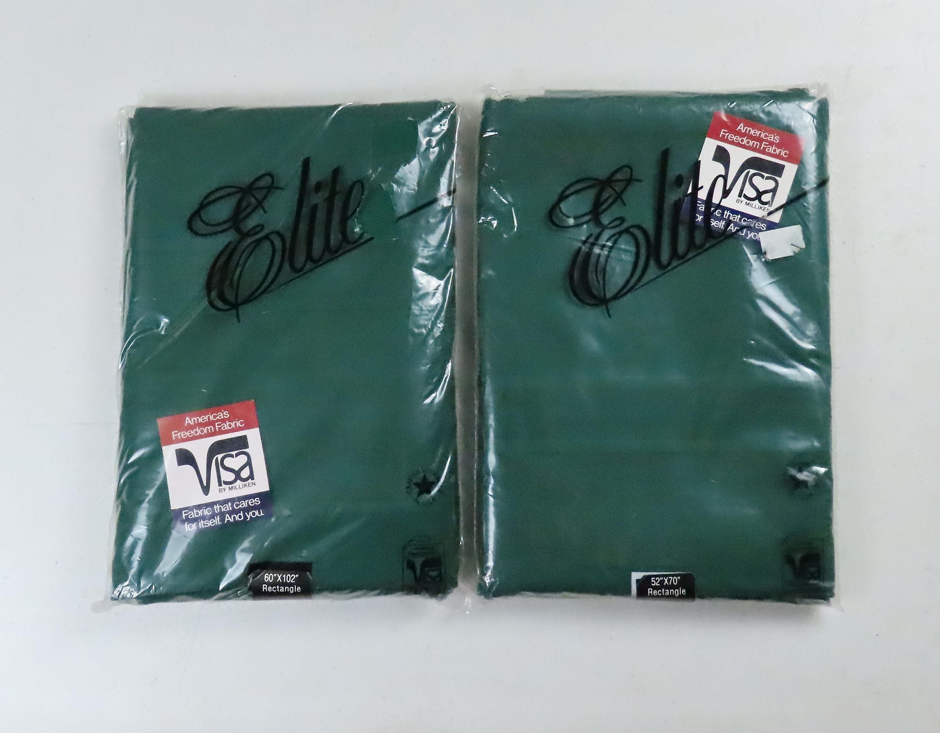 Vintage Elite "Hunter Green" tablecloth in sizes 52" by 70" or 60" by 102". It is 100% polyester. My camera had an extremely hard time picking up the right color. The packaging for both of these is very worn. There are some holes/rectangles cut out of the plastic on the front, old sticker residue, and some scratches on the plastic. It has some sharpie writing on the plastic, and there is some loose dust/debris inside the packaging.