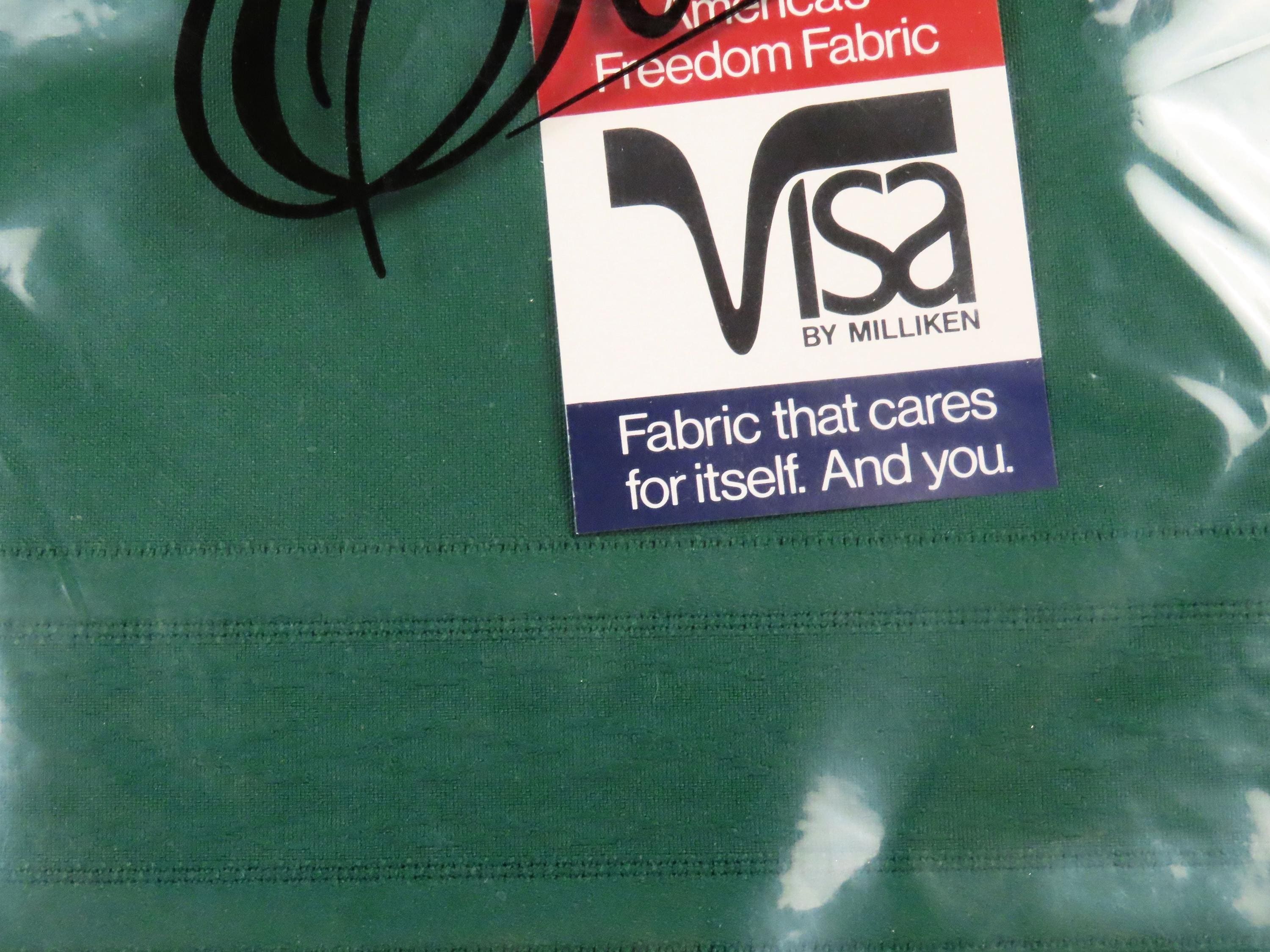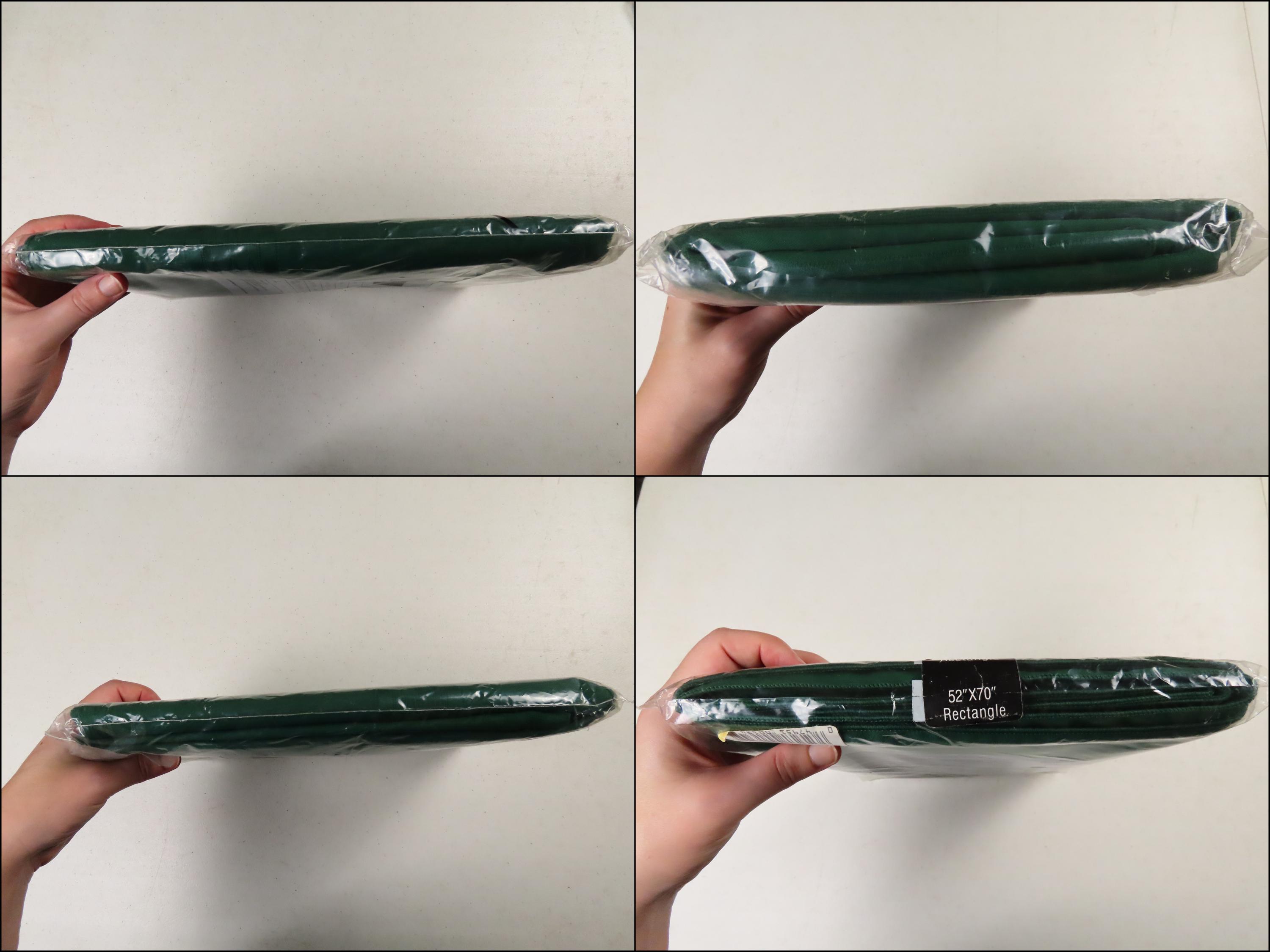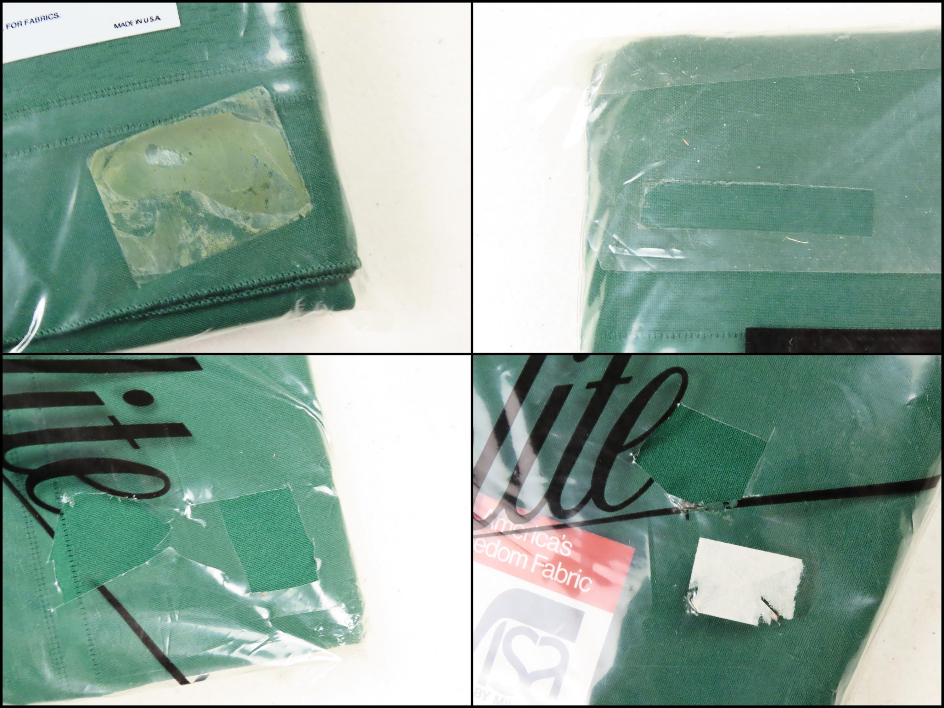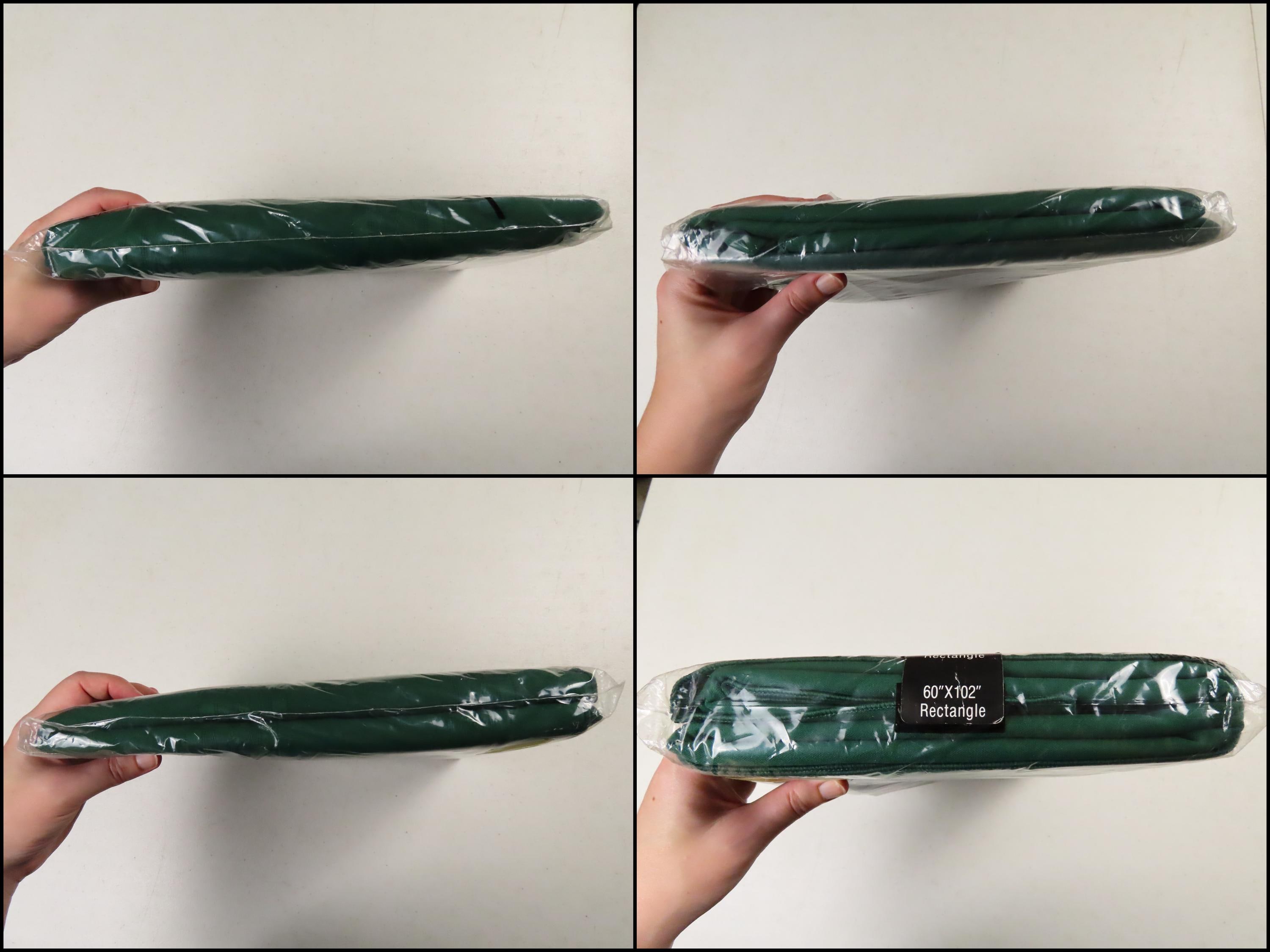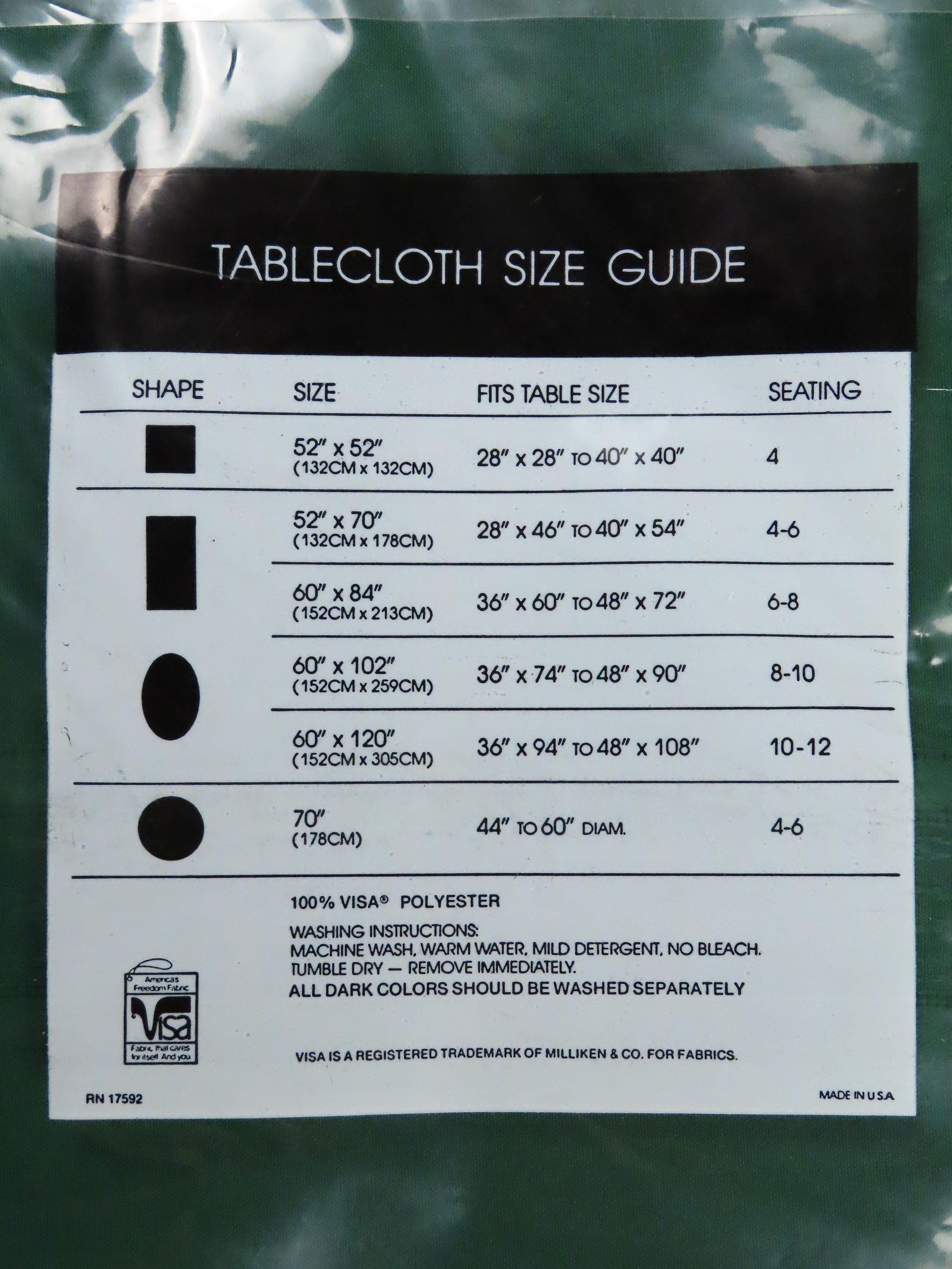 Vintage Elite "Hunter Green" tablecloth in sizes 52" by 70" or 60" by 102". It is 100% polyester. My camera had an extremely hard time picking up the right color. The packaging for both of these is very worn. There are some holes/rectangles cut out of the plastic on the front, old sticker residue, and some scratches on the plastic. It has some sharpie writing on the plastic, and there is some loose dust/debris inside the packaging.