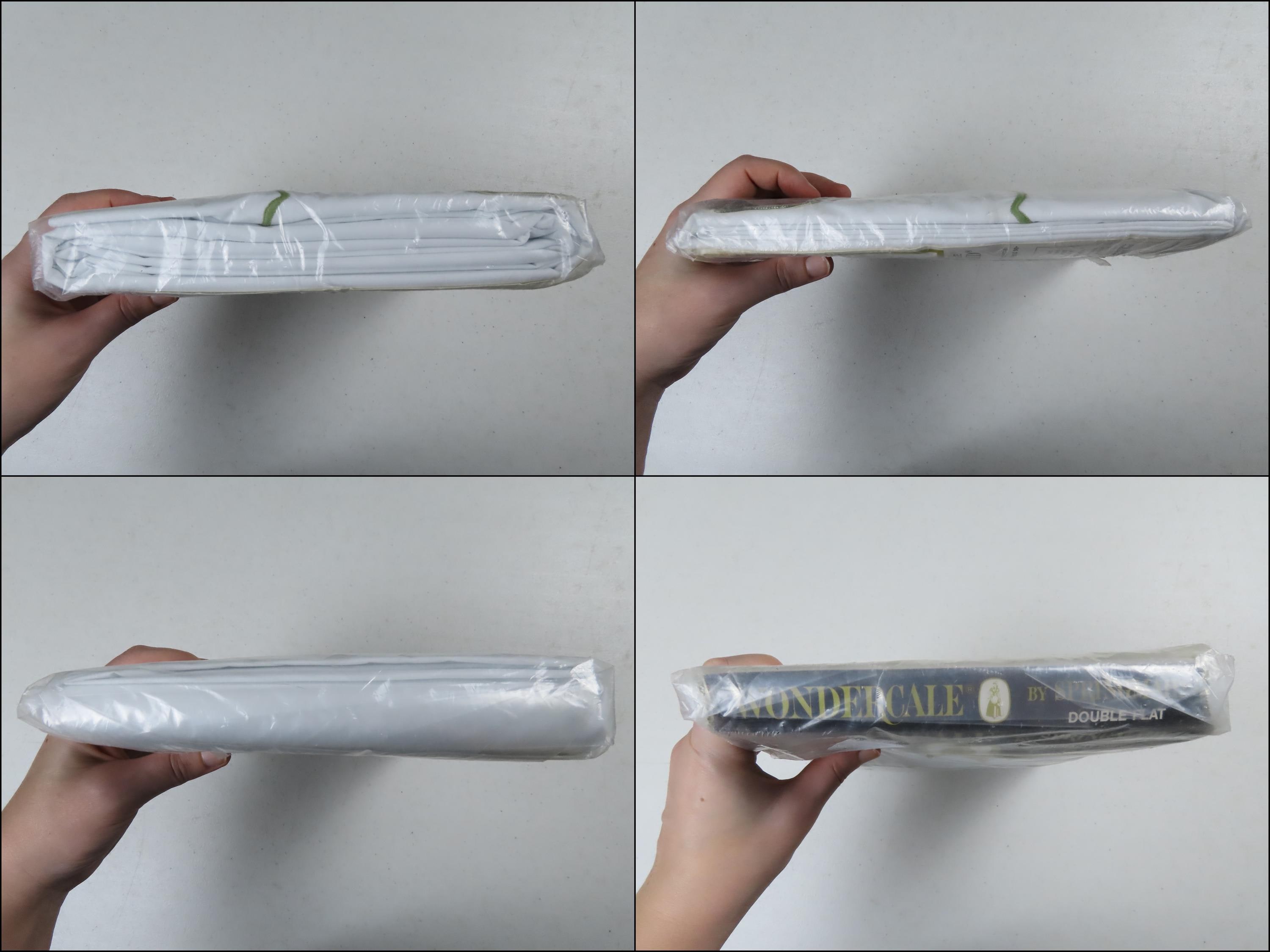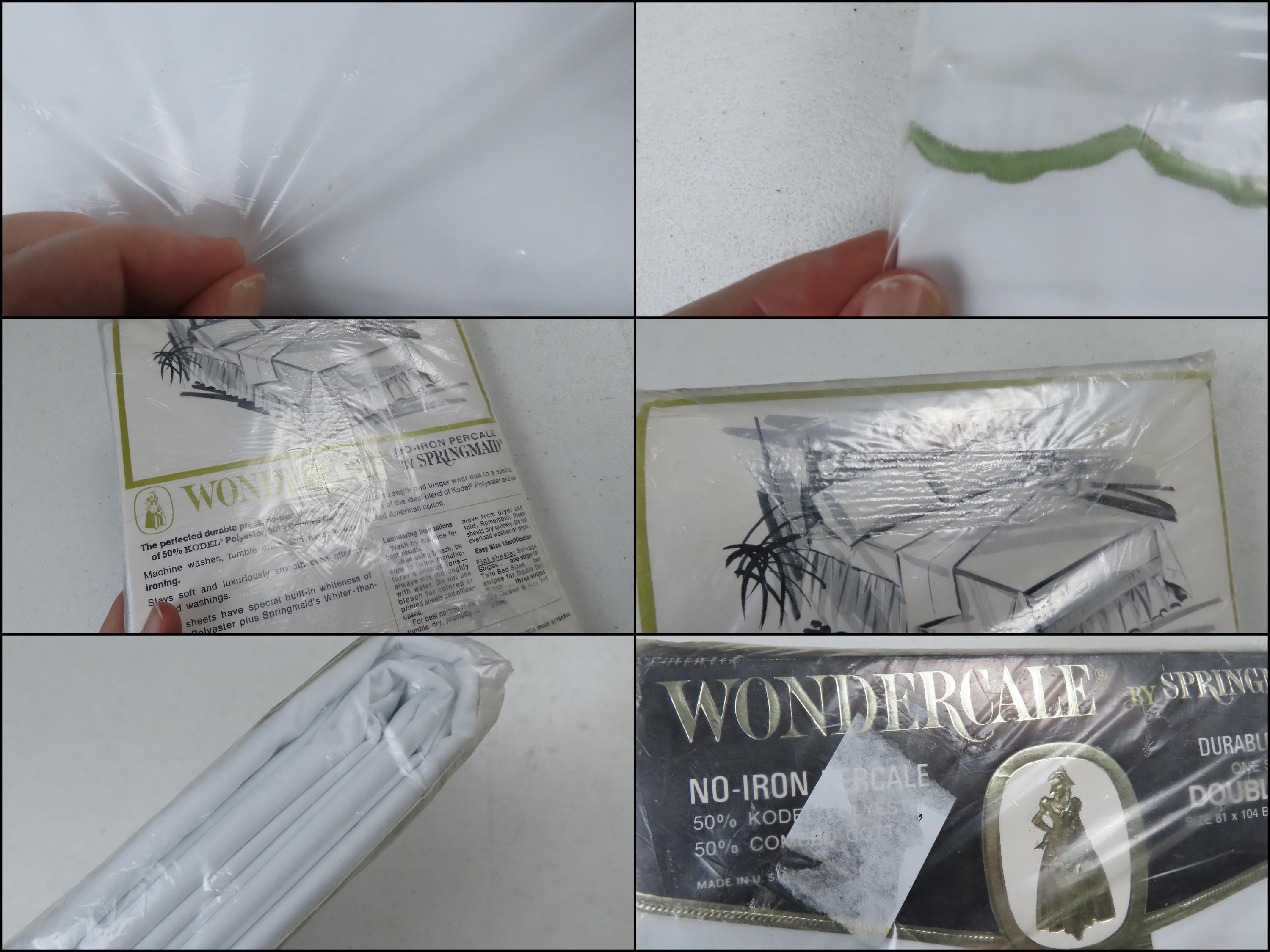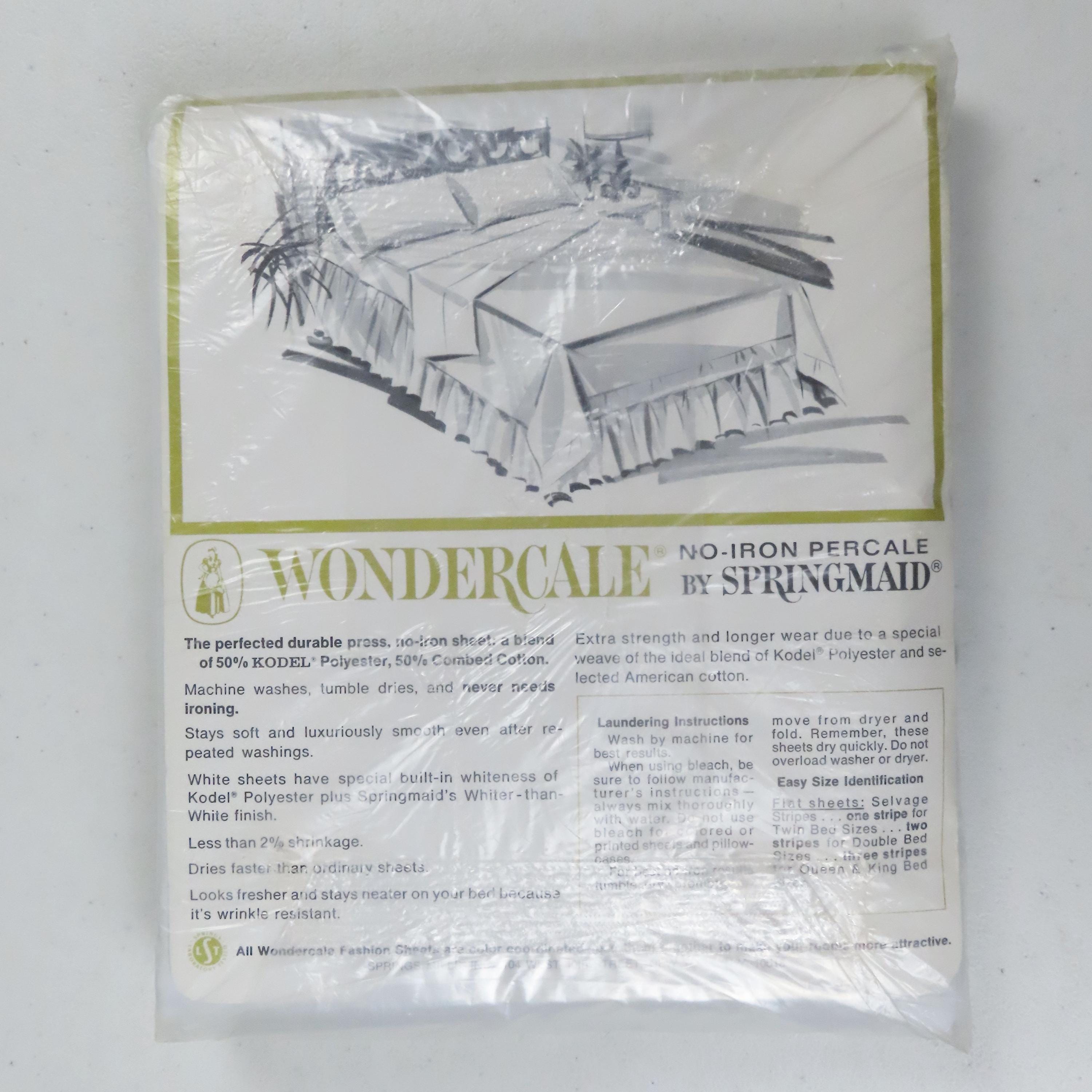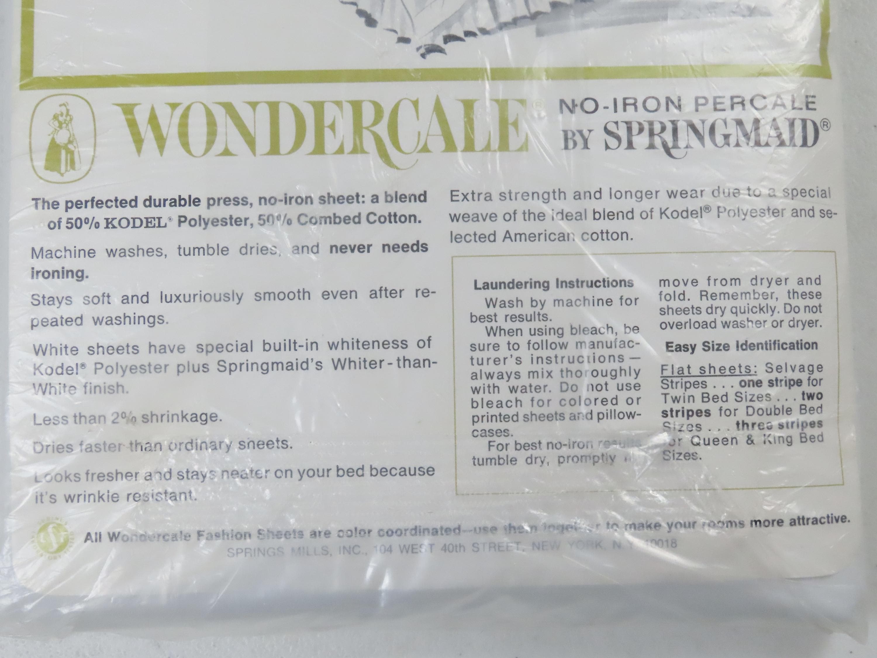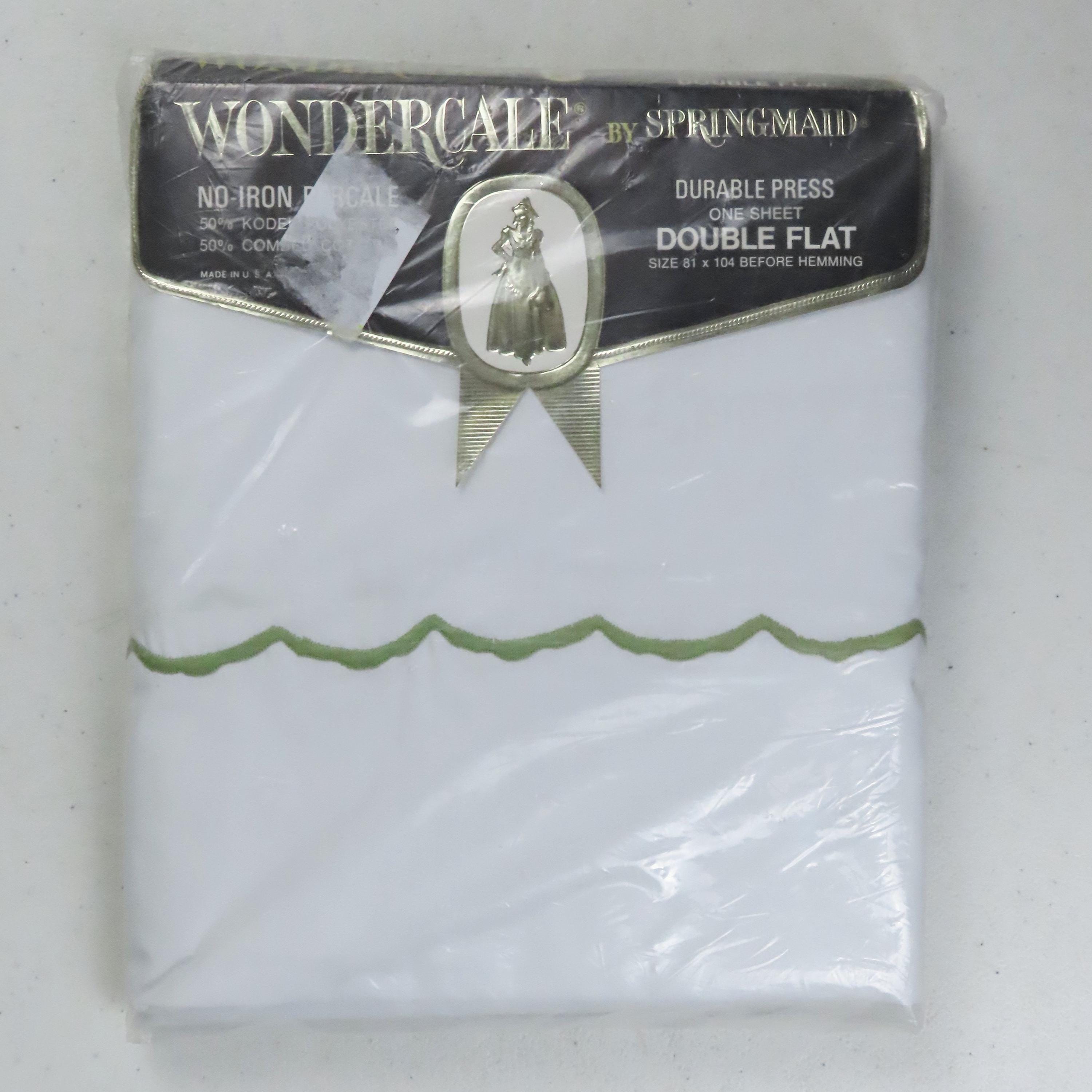 Vintage Springmaid white double flat sheet which is new in the package. It has a decorative green scallop embroidery design along the hem. It is 50% cotton and 50% polyester. The plastic packaging is very worn. The plastic has small holes, old sticker residue, and marks. It also has some scratches, and it is a bit foggy.