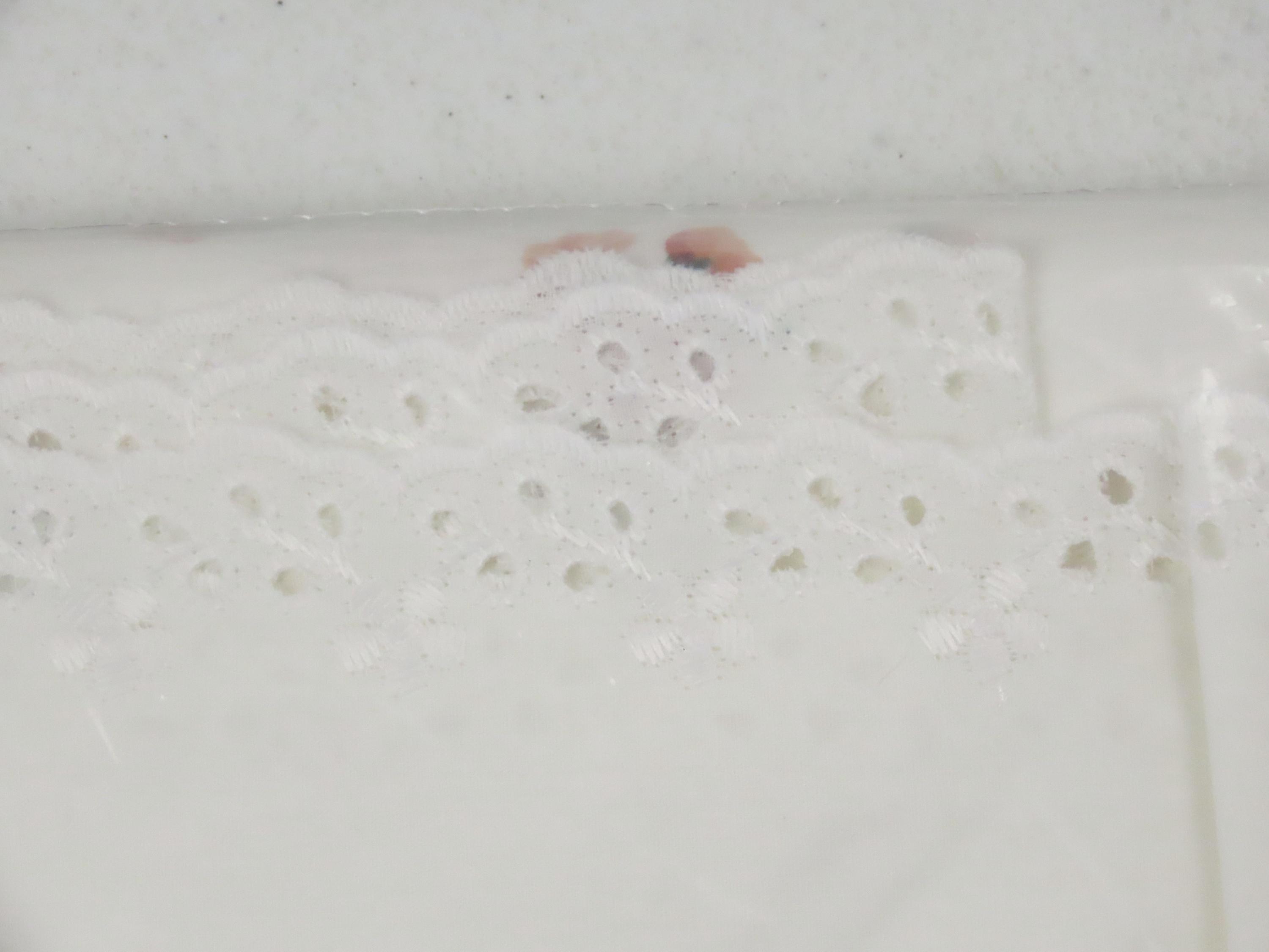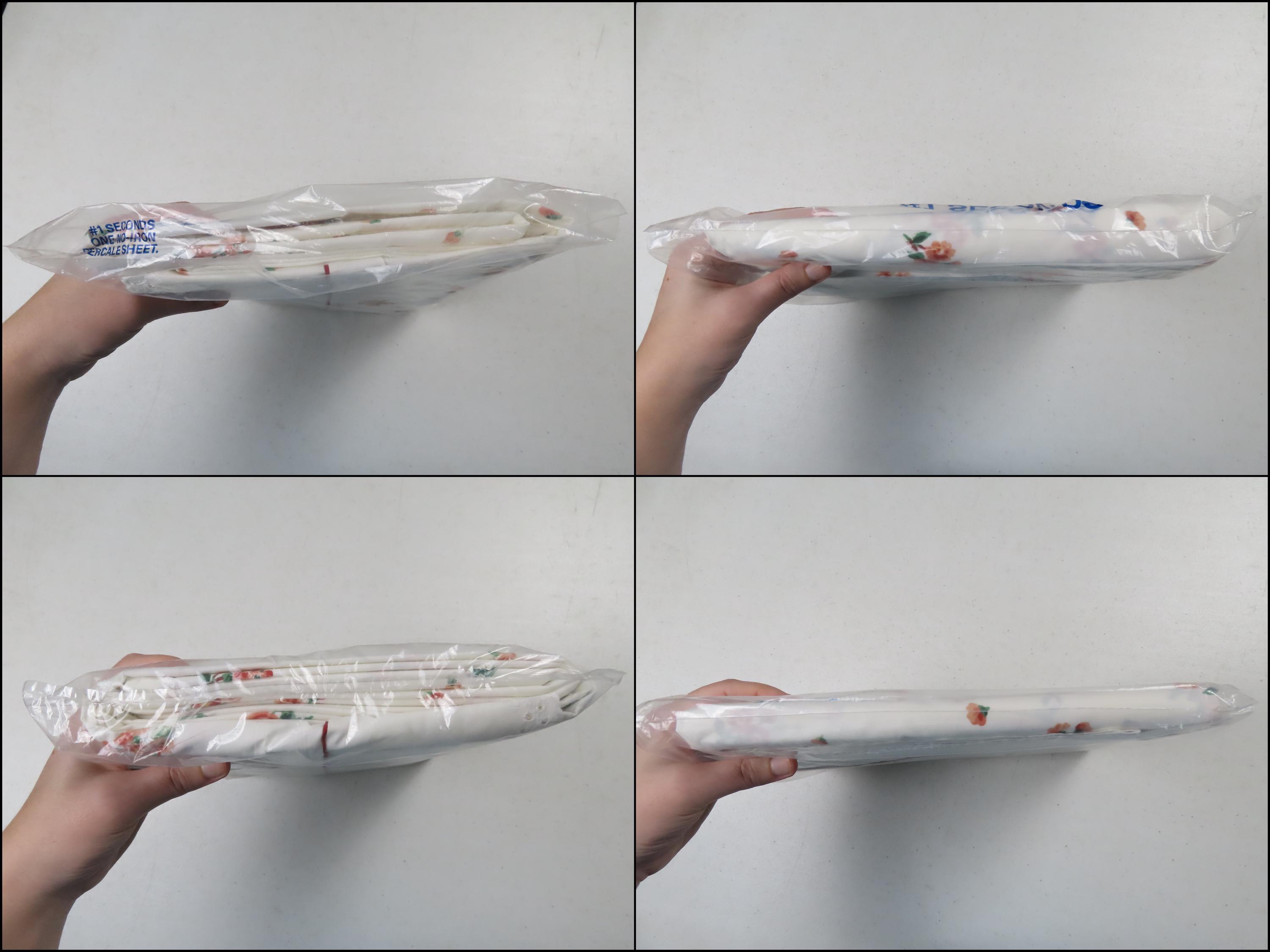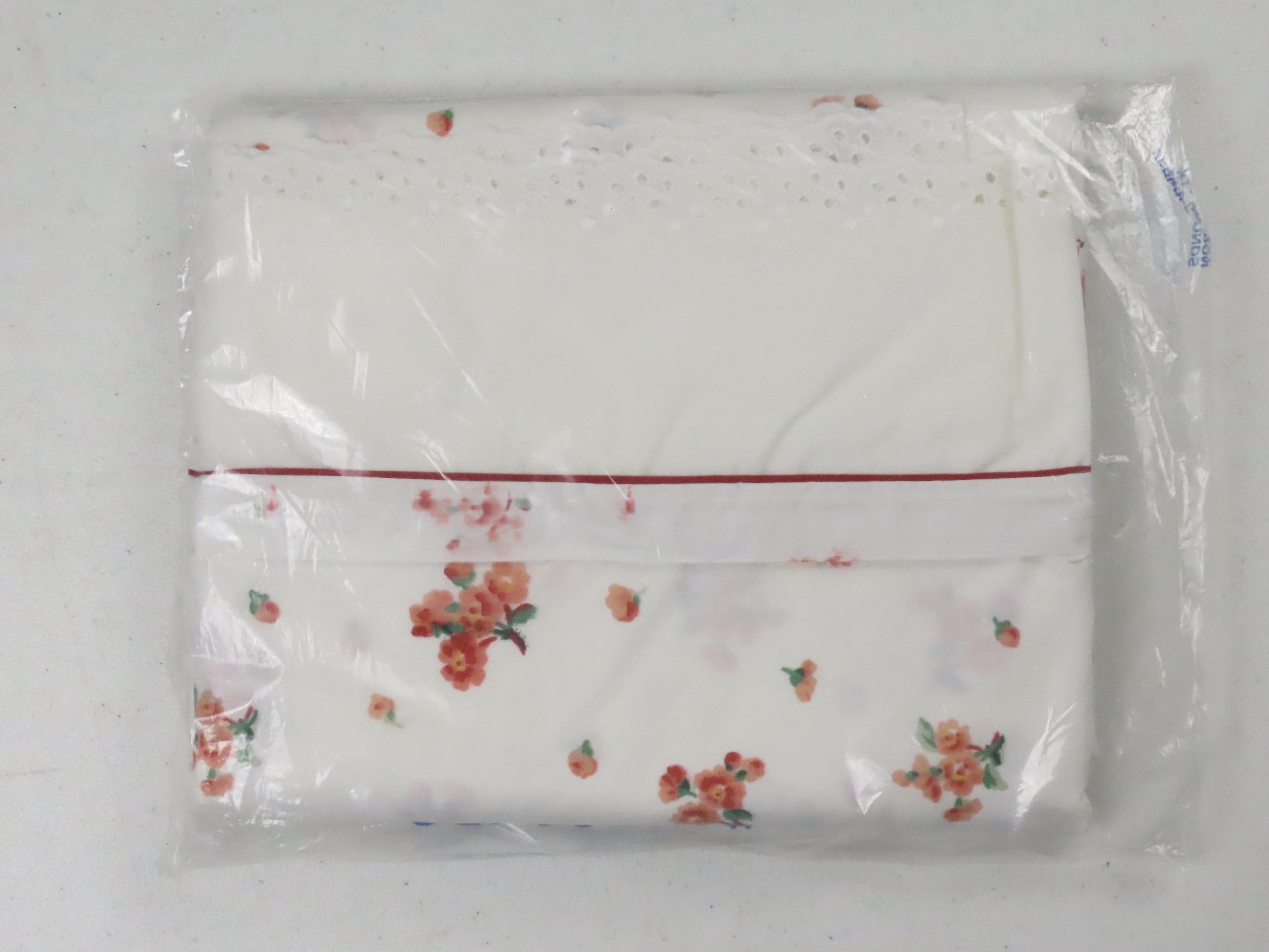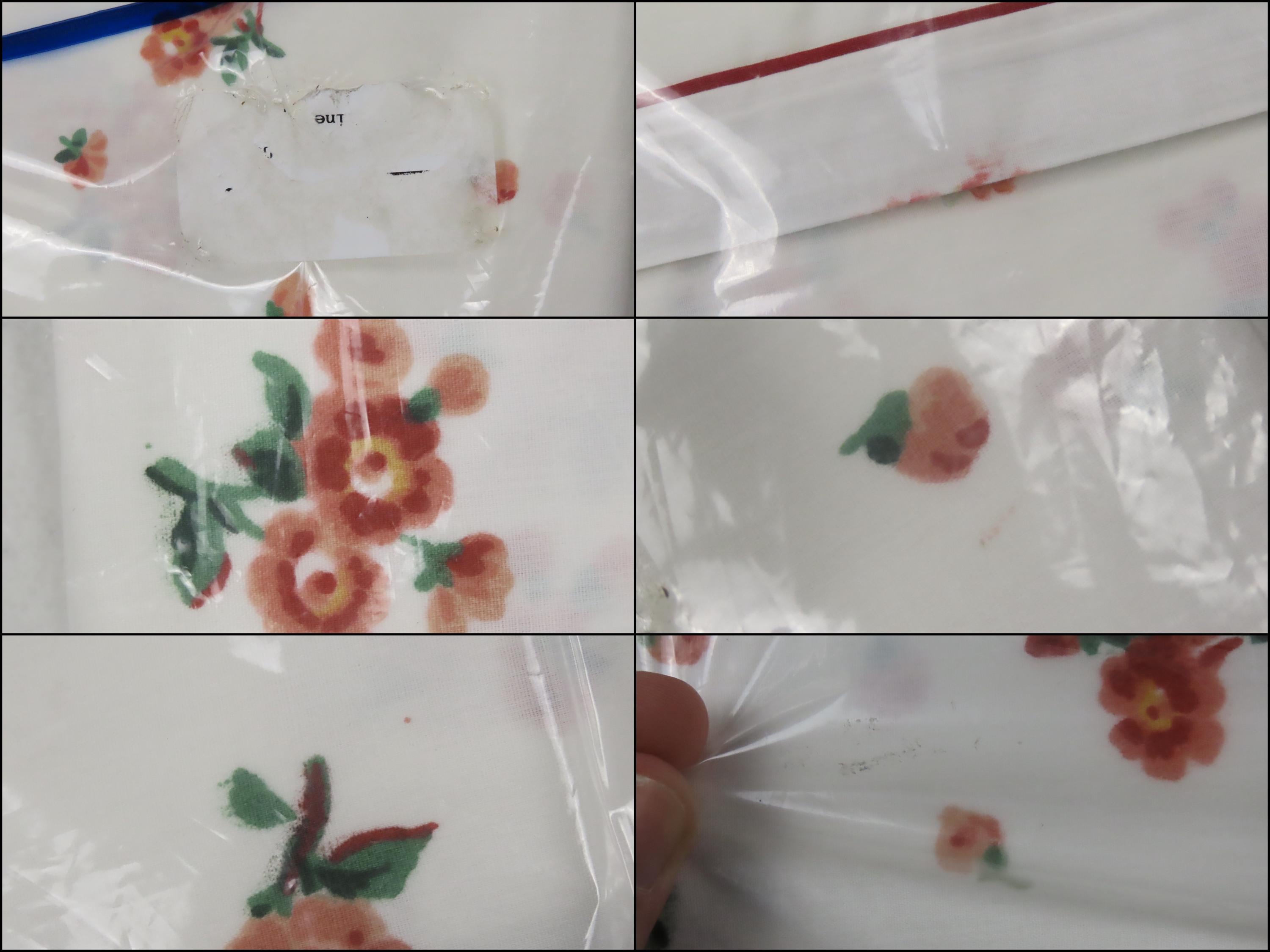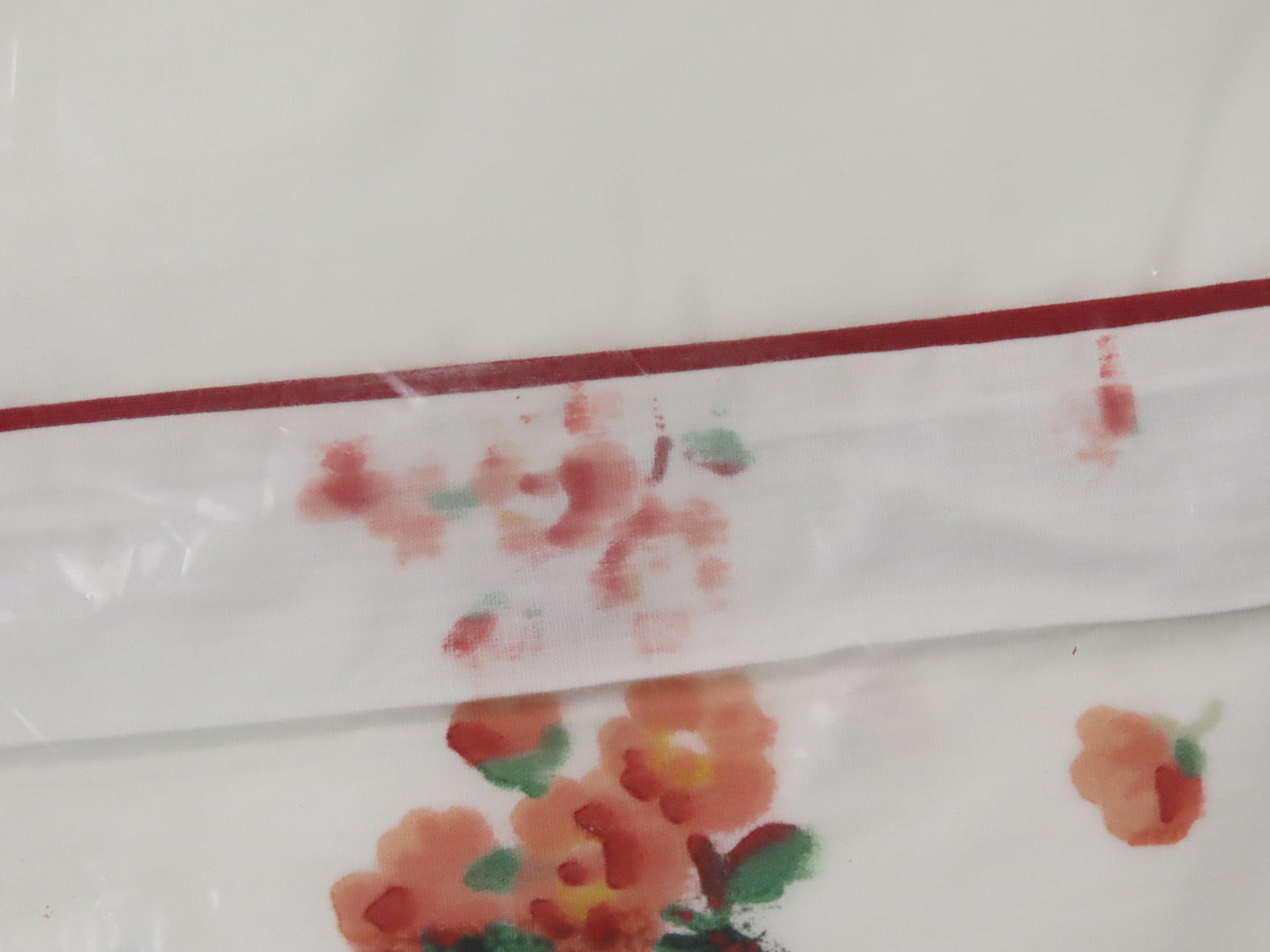 Vintage "Number 1 Seconds" floral twin flat sheet which is new in the package. It is 60% cotton and 40% polyester with a 200 thread count. There is no brand name other than #1 seconds, so I wonder if this company sold the "B" stock of other brands. It has some obvious printing errors with color bleeding that can be seen through the plastic, so the whole sheet is probably like this. The plastic packaging is worn with some marks, tiny holes, and old sticker residue. The white background on the sheet isn't a super bright white, but it isn't quite an off-white either.