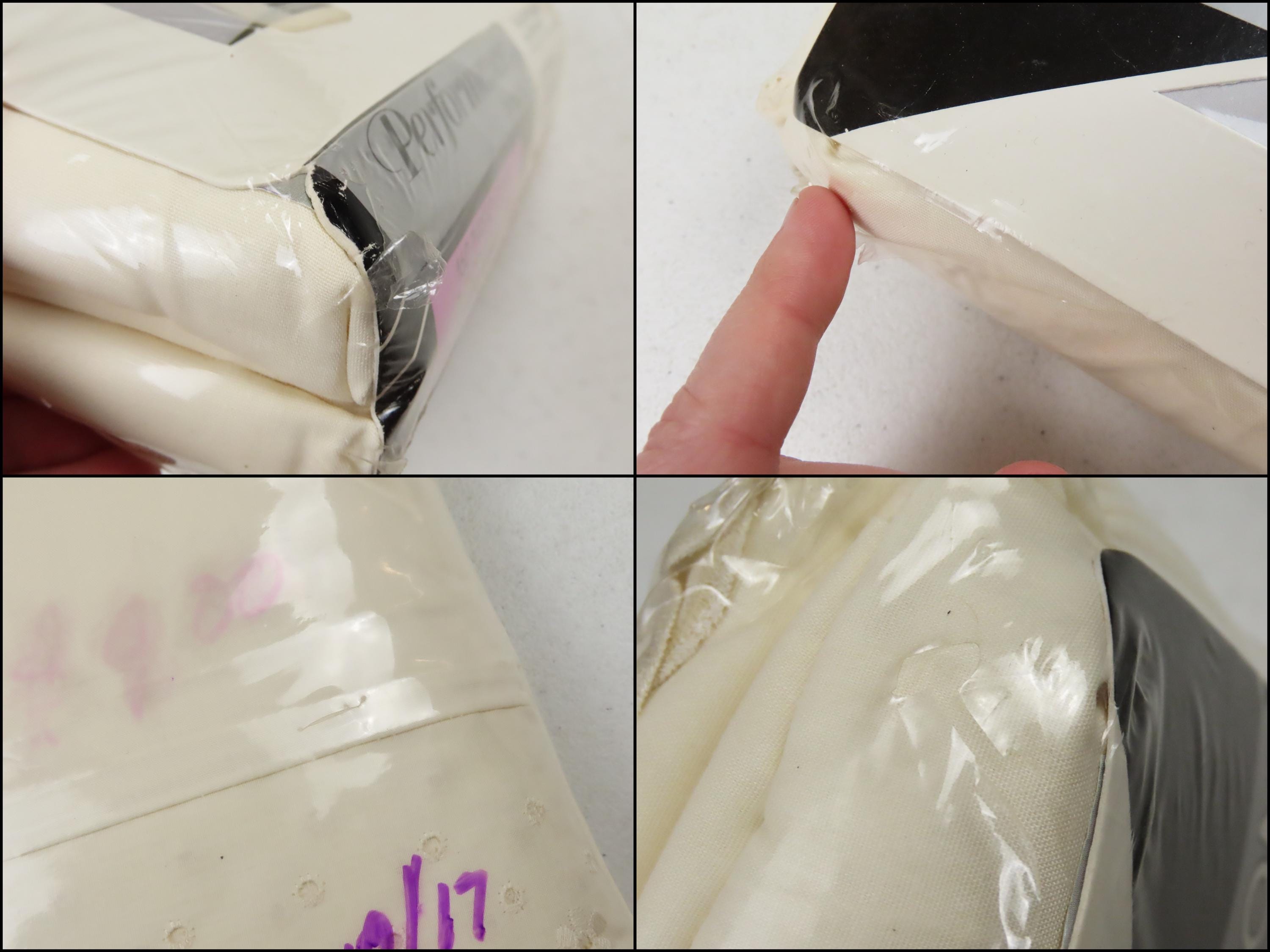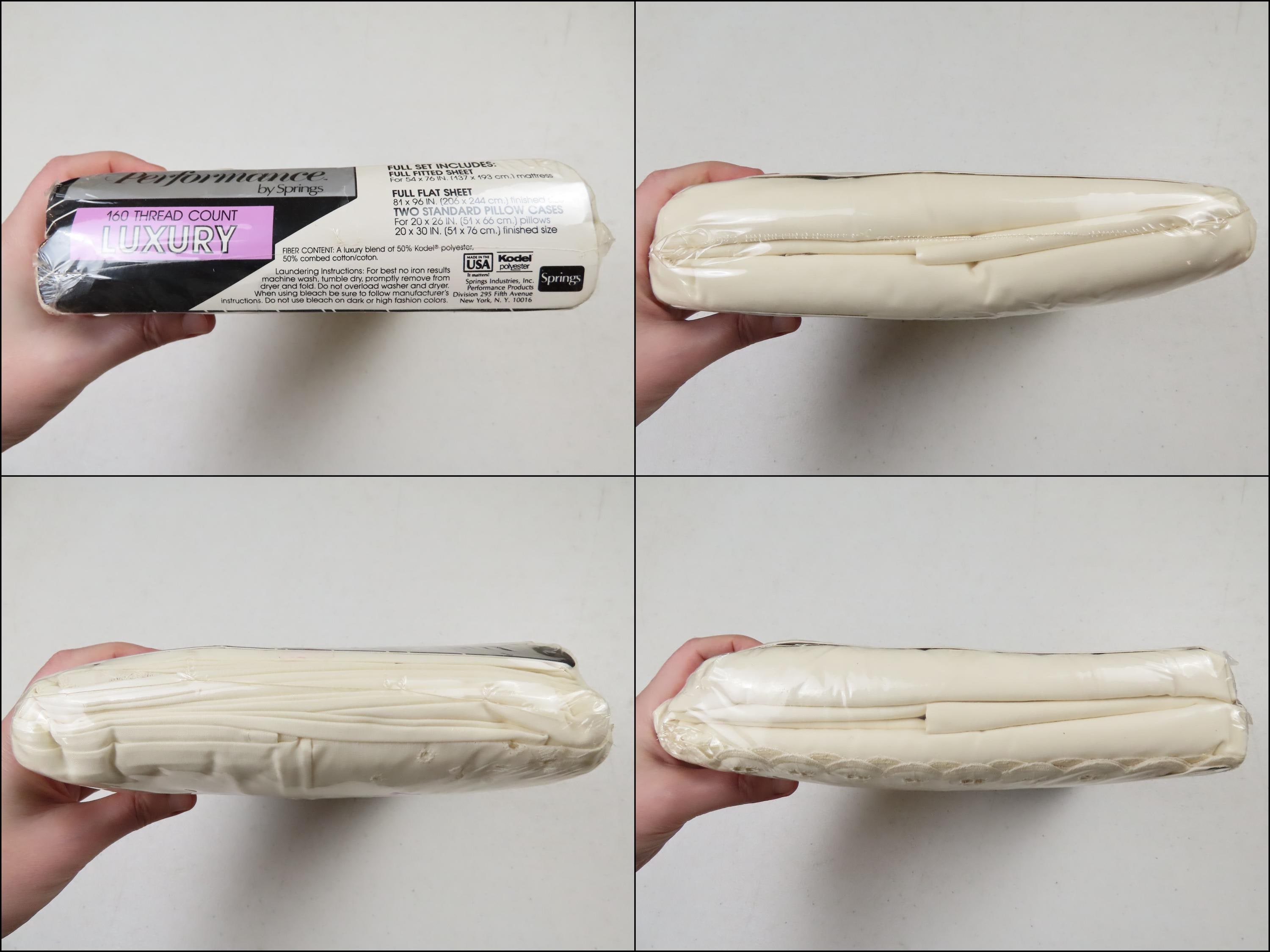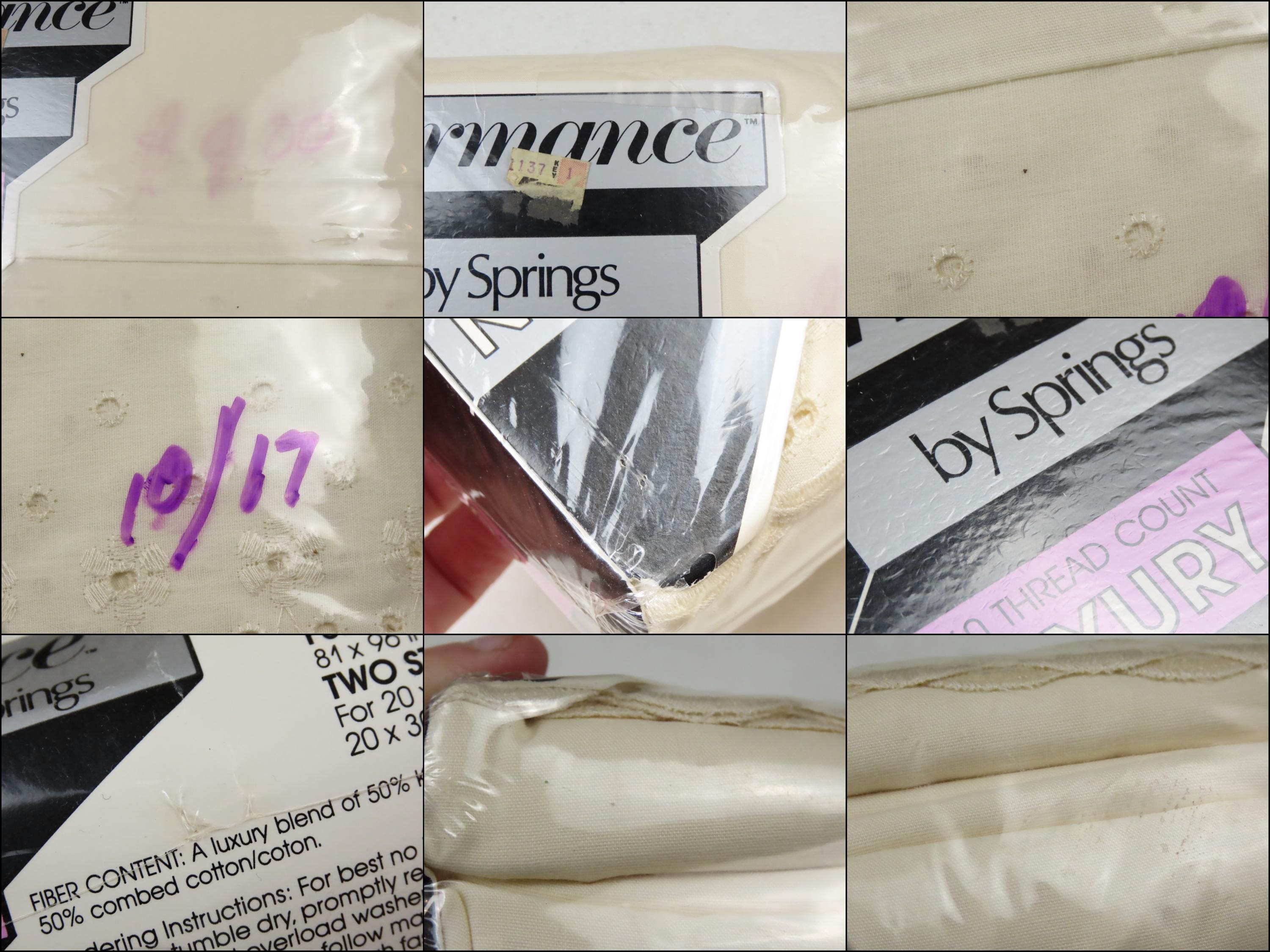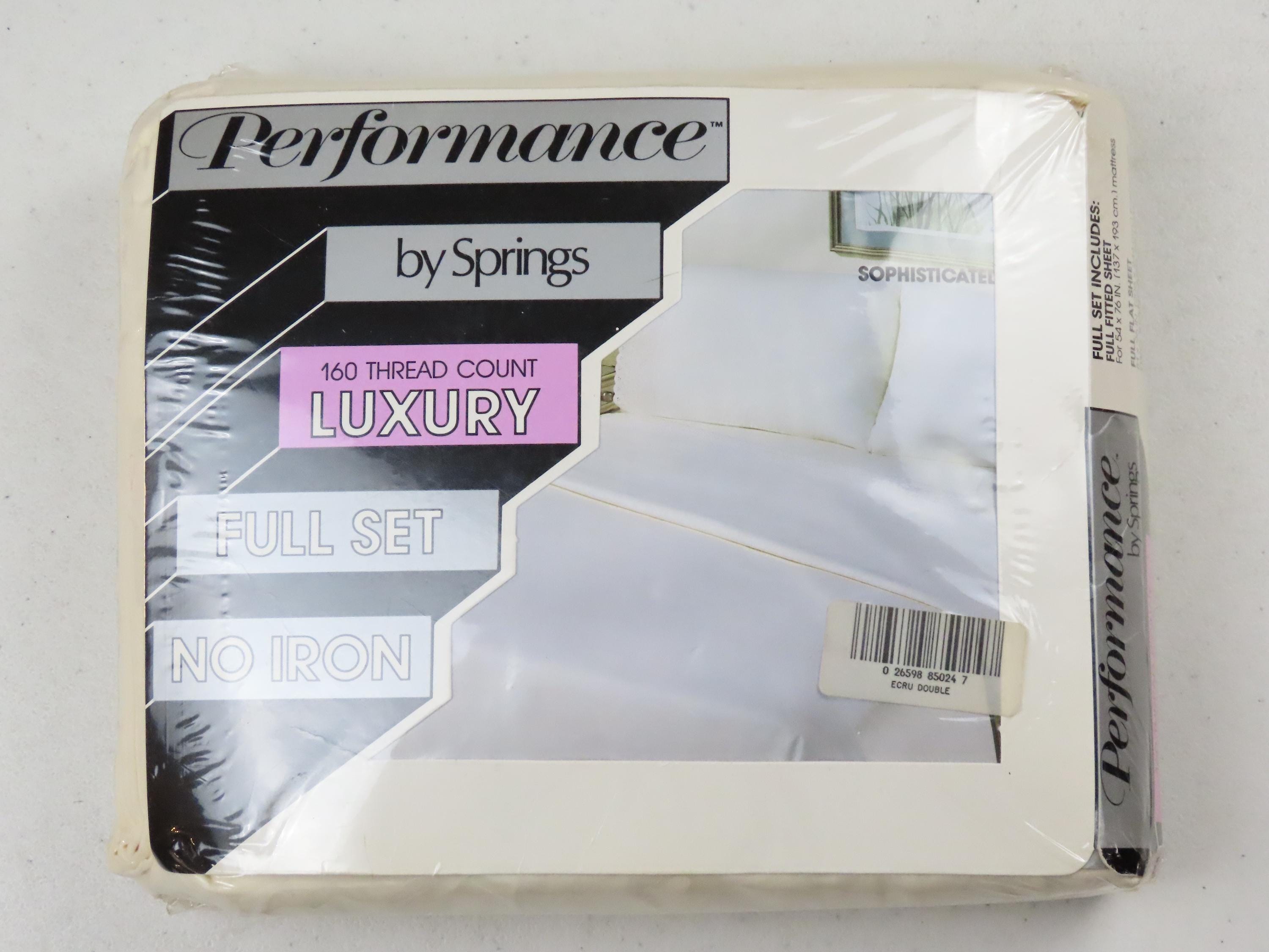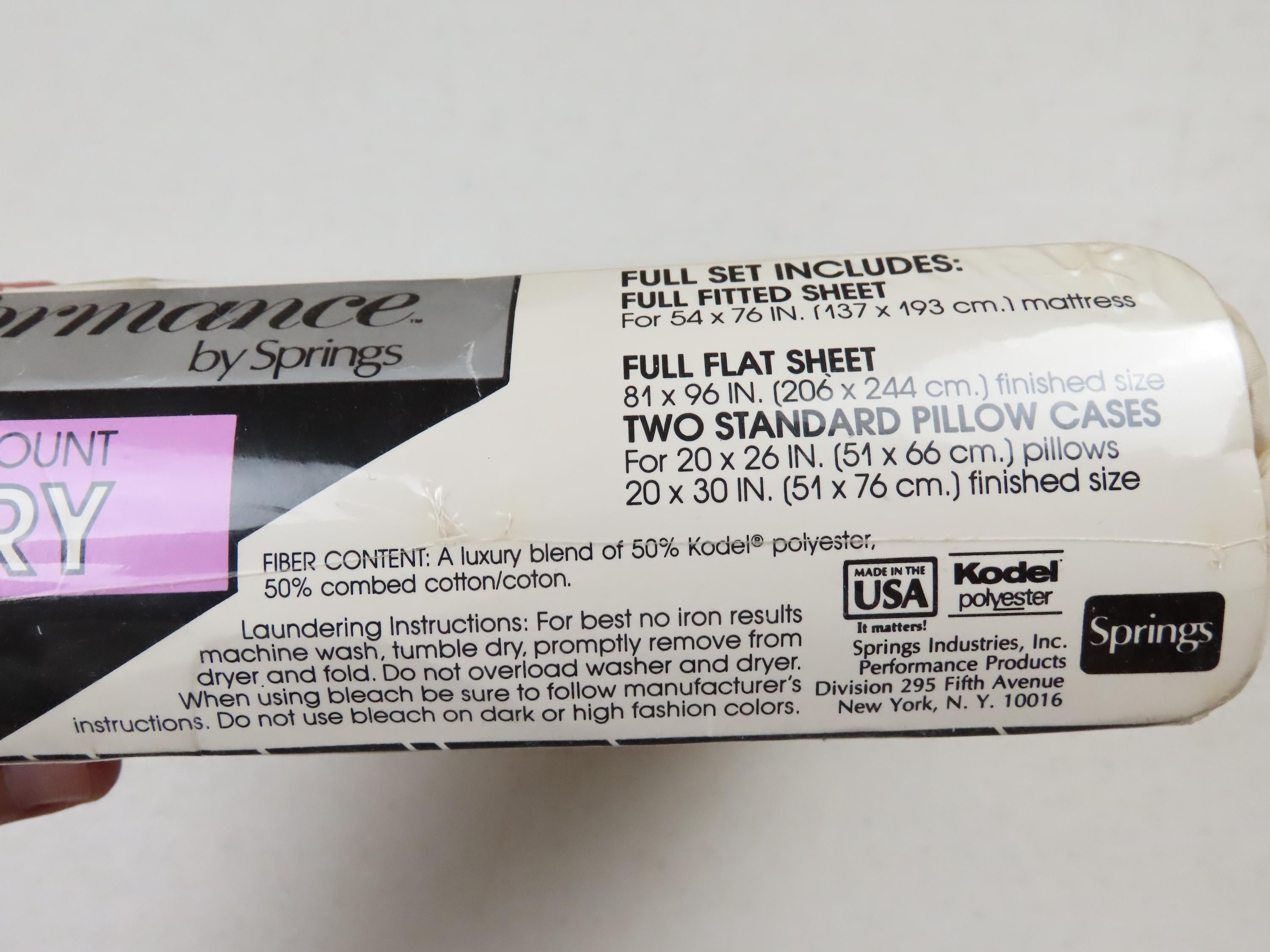 Vintage Performance by Springs Full sized sheet set from which is new in the package. It includes the flat, fitted, and 2 pillowcases. It is 50% polyester and 50% cotton with a 160 thread count. I would describe the color as cream. The plastic packaging and the cardboard insert are worn. There is purple sharpie writing on the plastic as well as old sticker residue and old tape. The plastic has small holes, scratches, and scuffs. It also has a larger hole in the plastic. There is a small light stain on the fabric where there is a small hole in the plastic. It has some loose dust/debris inside the packaging.