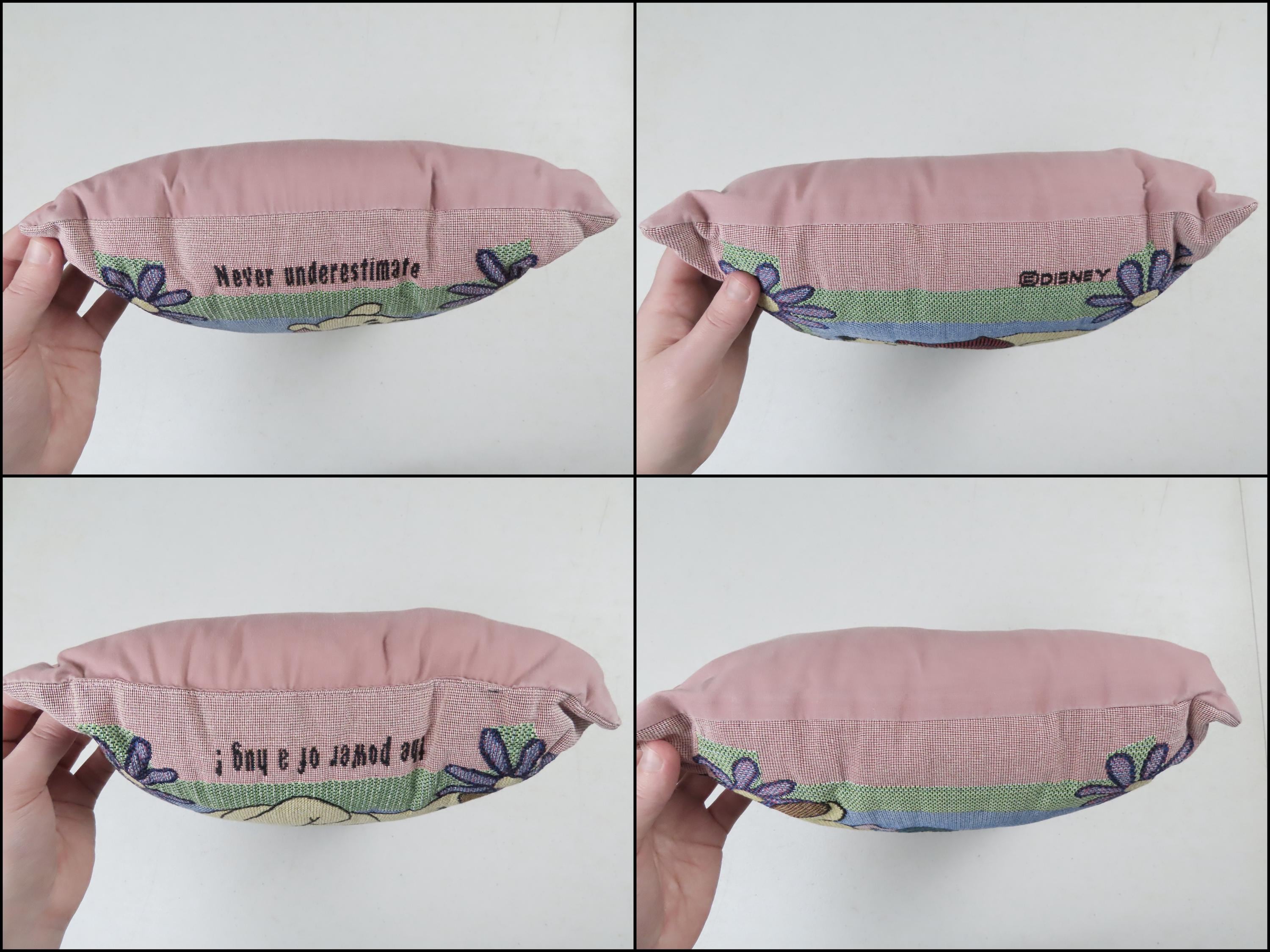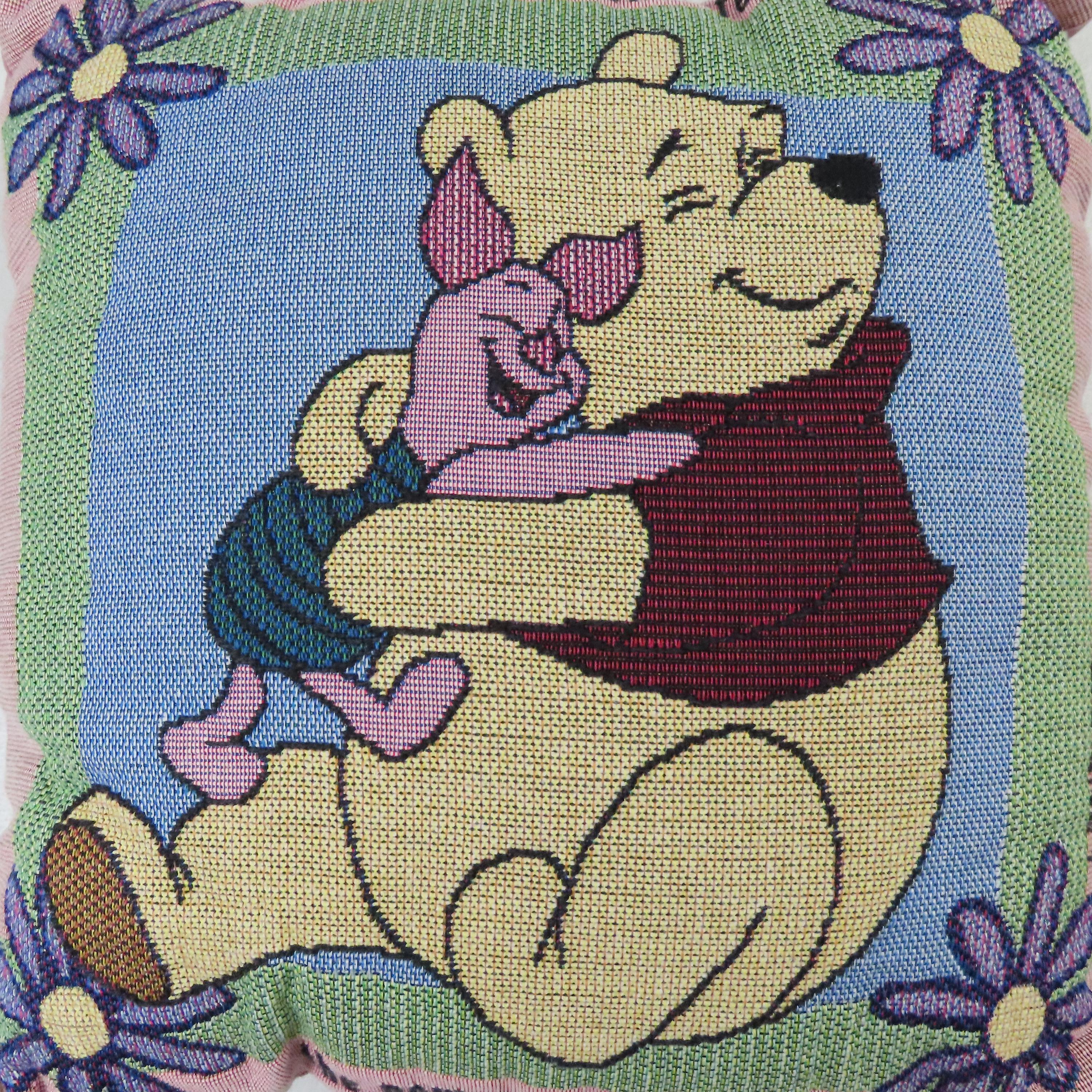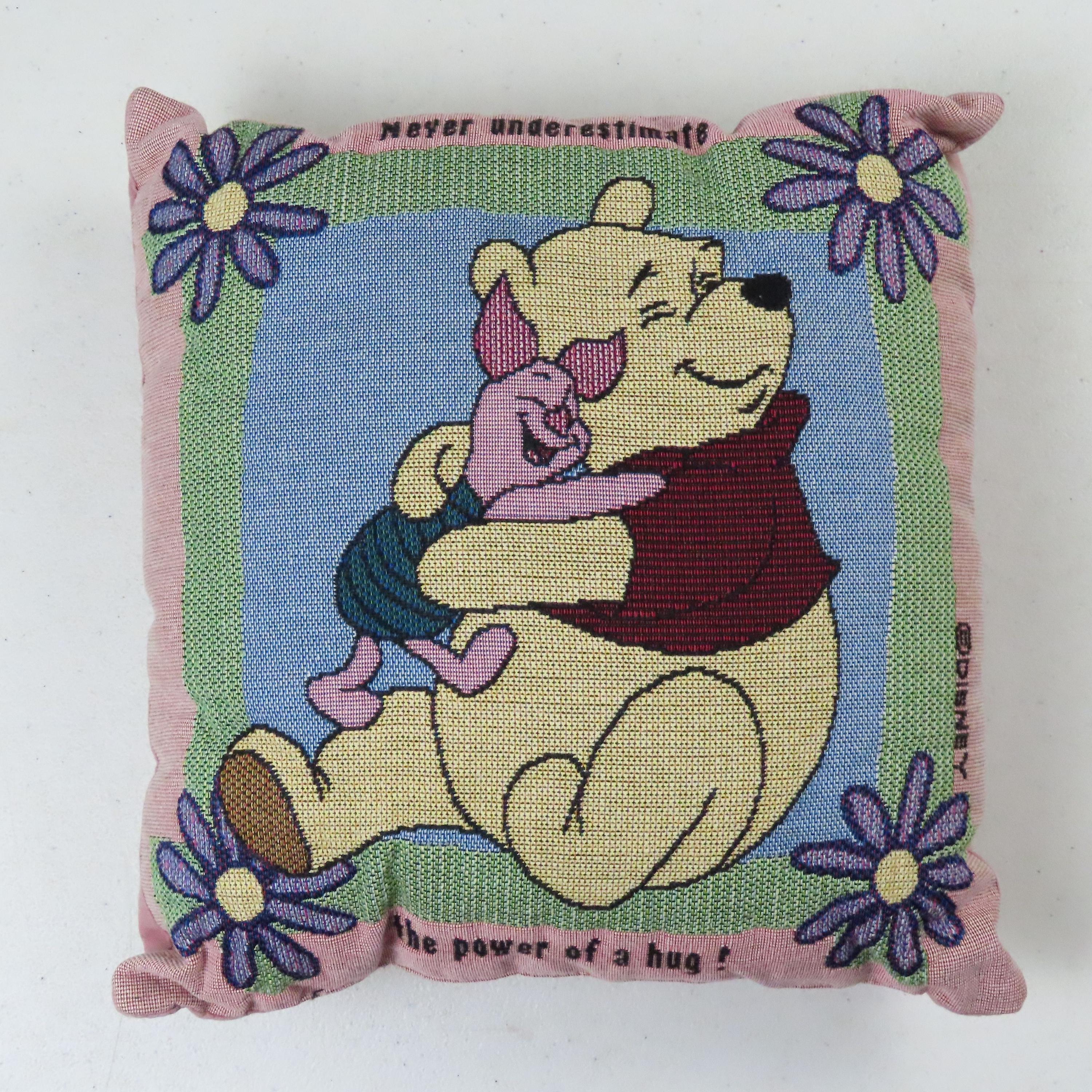 Vintage Winnie the Pooh "Never underestimate the power of a hug" tapestry throw pillow which is about 12" by 11". When stretched out from corner to corner it measures about 13" by 12.5". My camera had a hard time picking up the exact colors. It is very worn along the edges/stitching, and the filling has settled a little unevenly. The backside fabric has light whitish marks, light pilling, and it seems a little faded/discolored in areas. It has some thread snags.