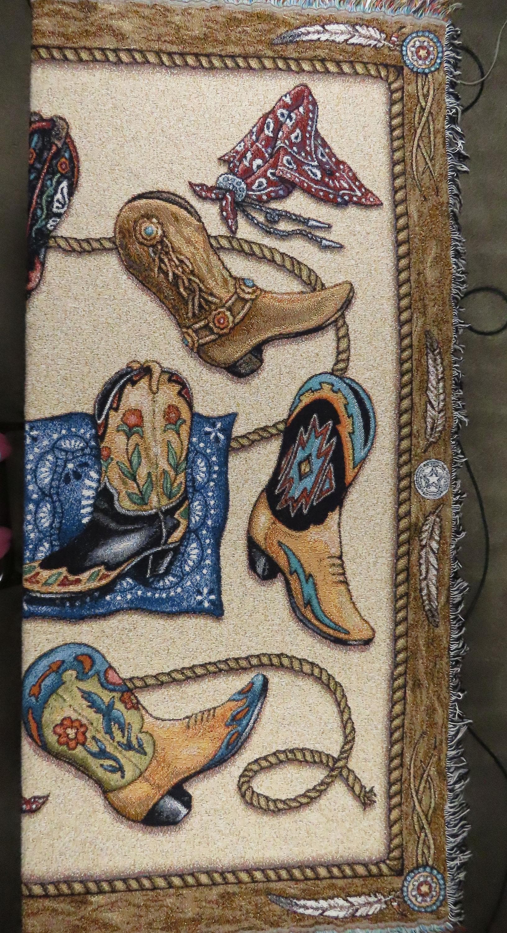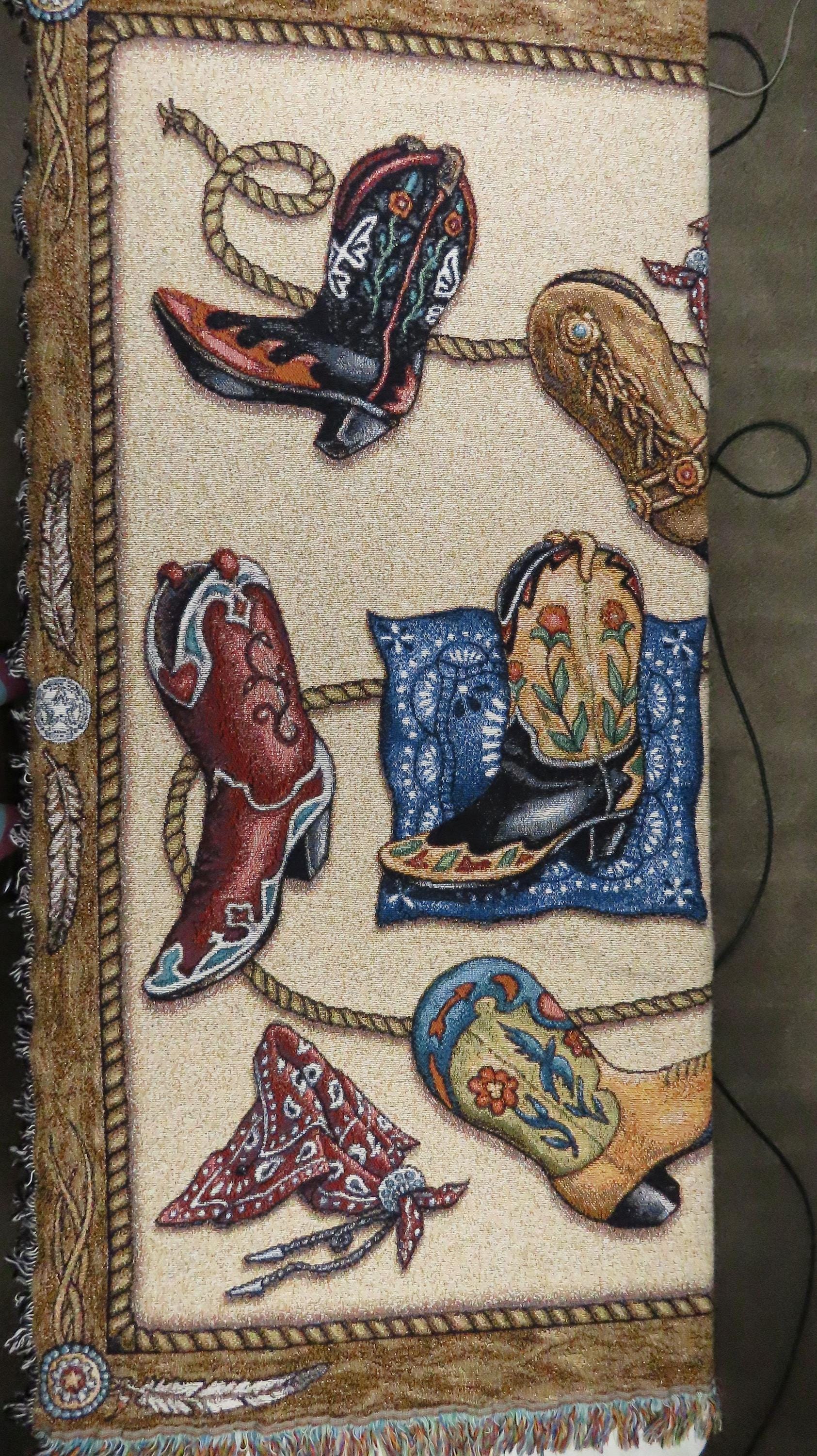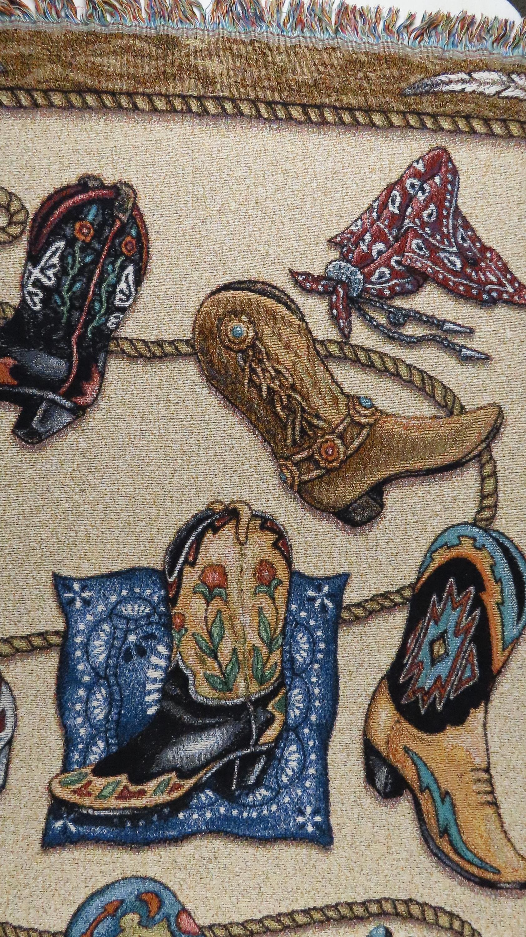 Vintage Cowboy boots woven tapestry blanket which is about 70" tall by 52" wide which includes the decorative fringe edge (175 cm by 132 cm). It has some pulled/loose fibers. The decorative edge is a little tangled and the yarn tips are fraying some.