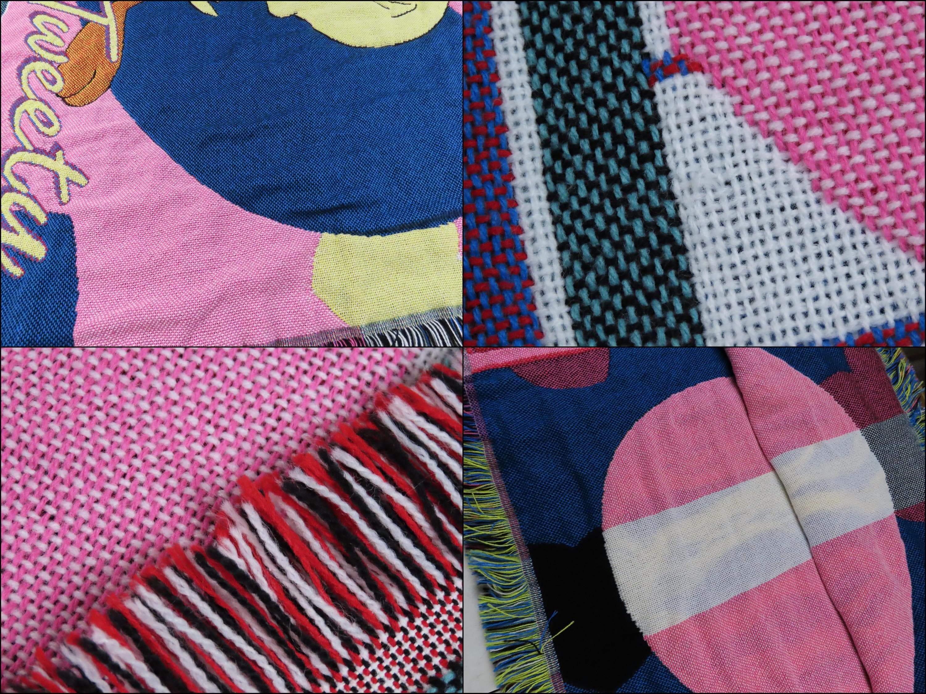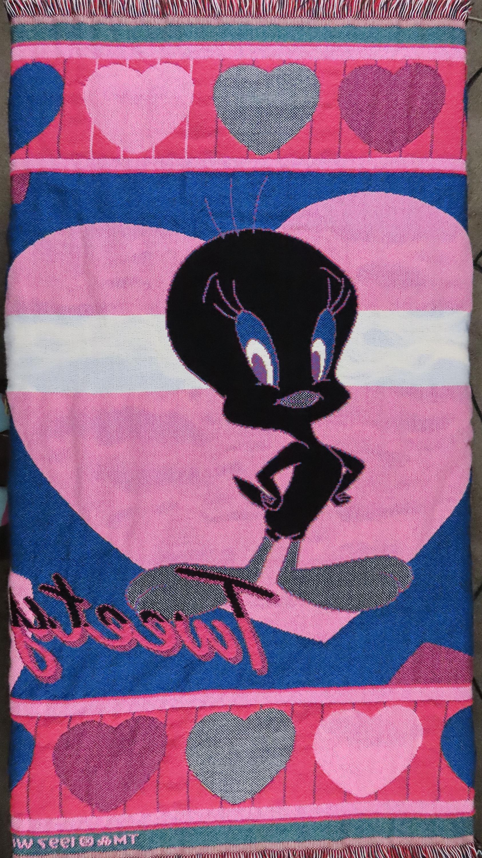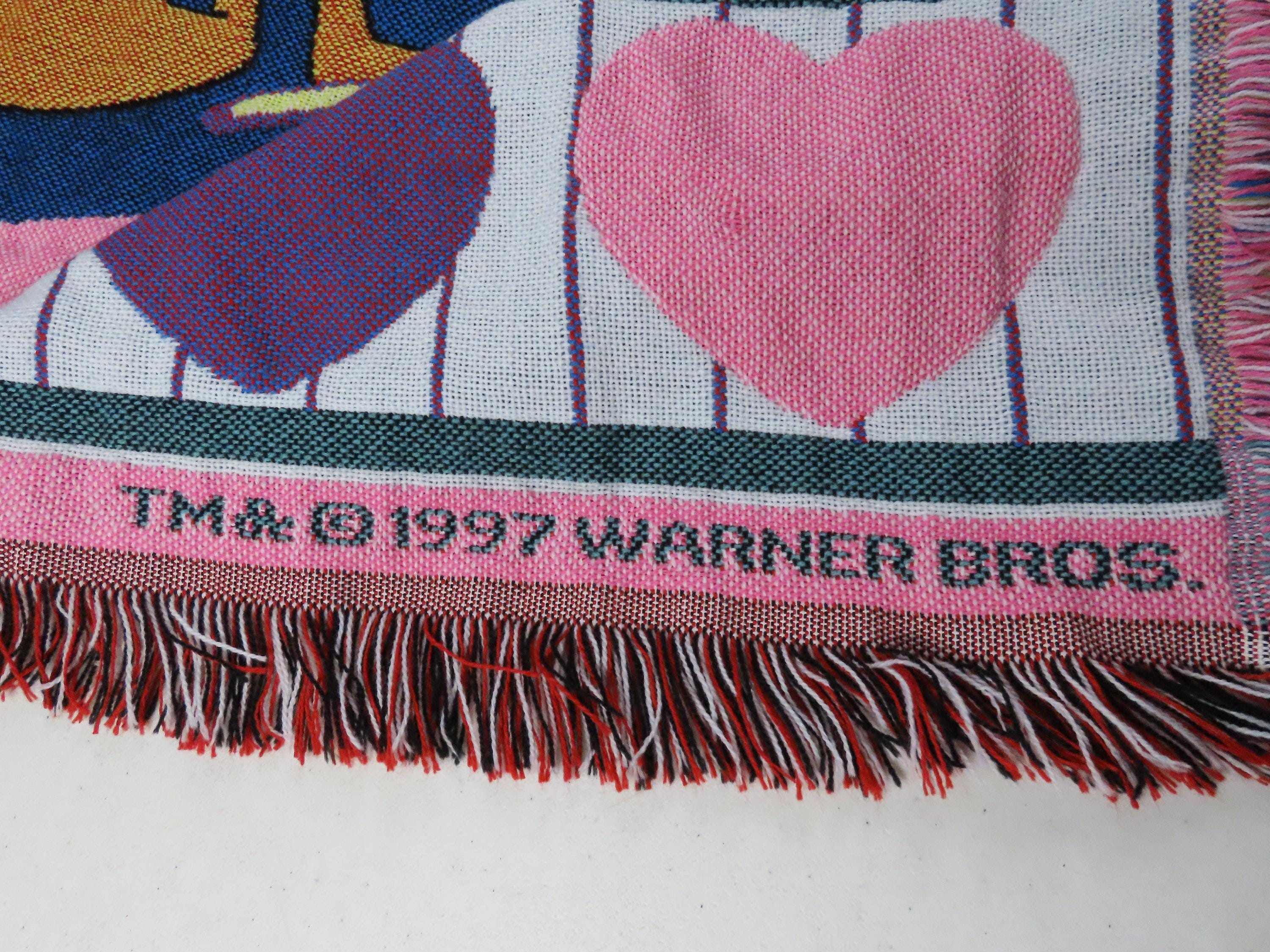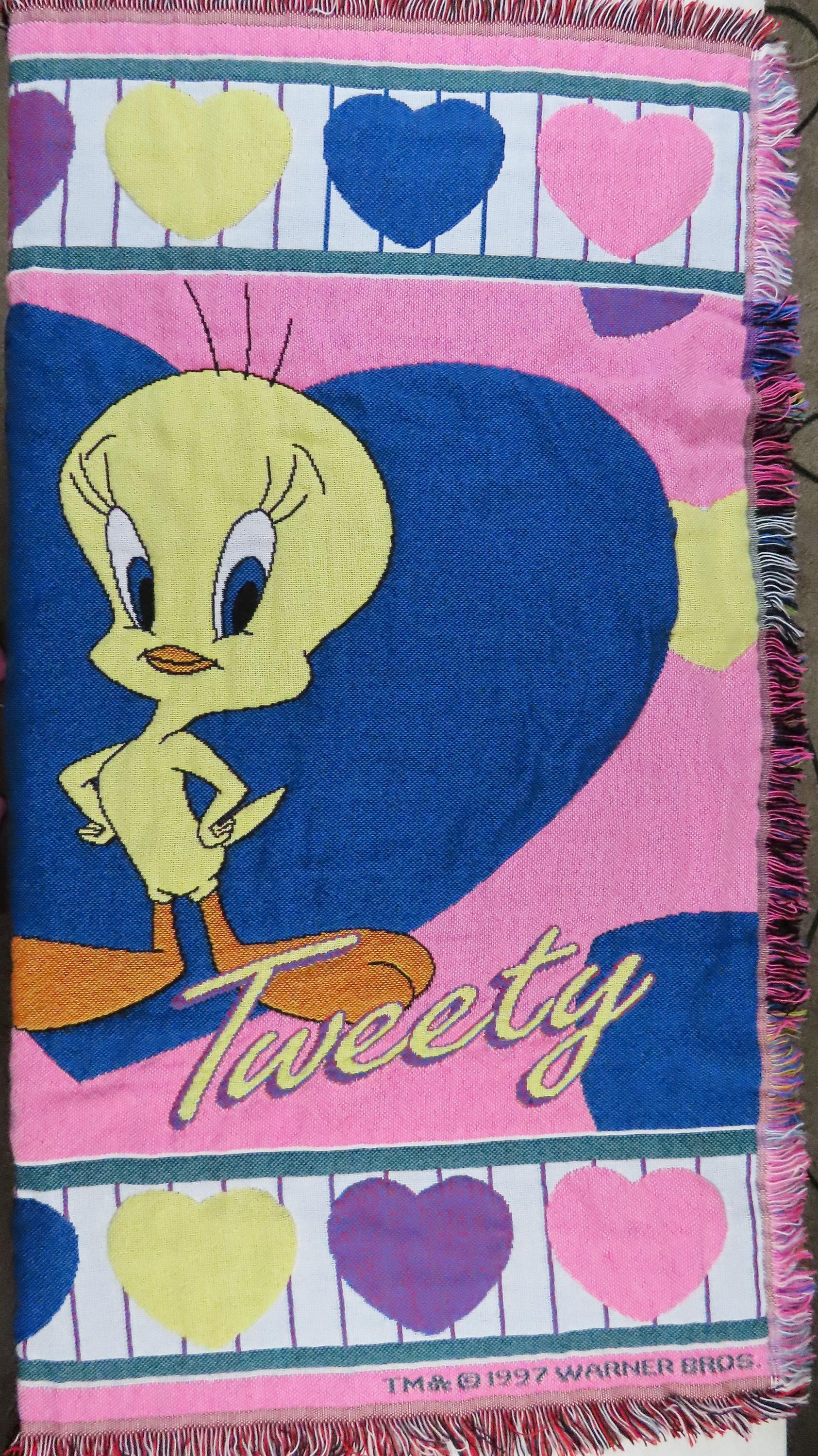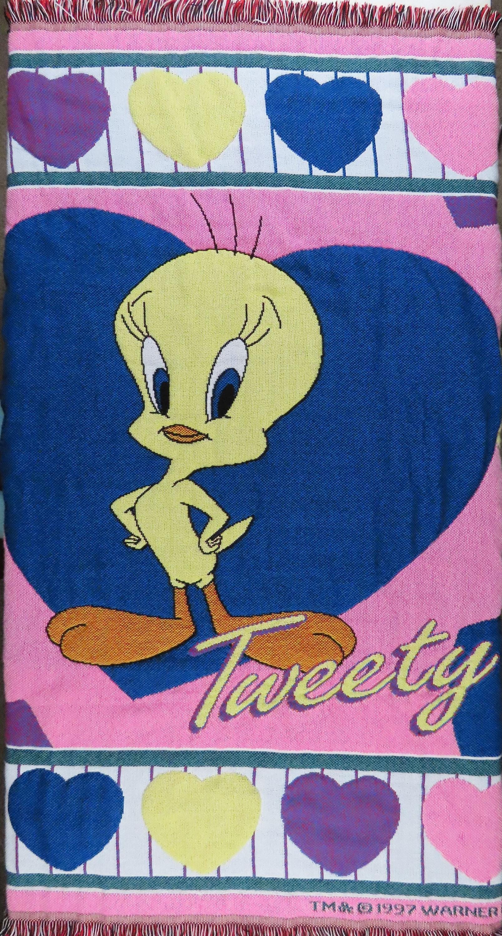Vintage Tweety Bird woven blanket from 1997 which is about 59" tall by 48" wide (150 cm by 124 cm) which includes the decorative yarn edge. It is fairly soft compared to other woven blankets, so I suspect it has at least some acrylic. It does not want to lay completely flat, and it has extremely light pilling in areas. There are some pulled/loose fibers, and it is fraying at the tips of the decorative yarn edge. On the backside, you can see the yellow yarn through the white stripe in the main heart.