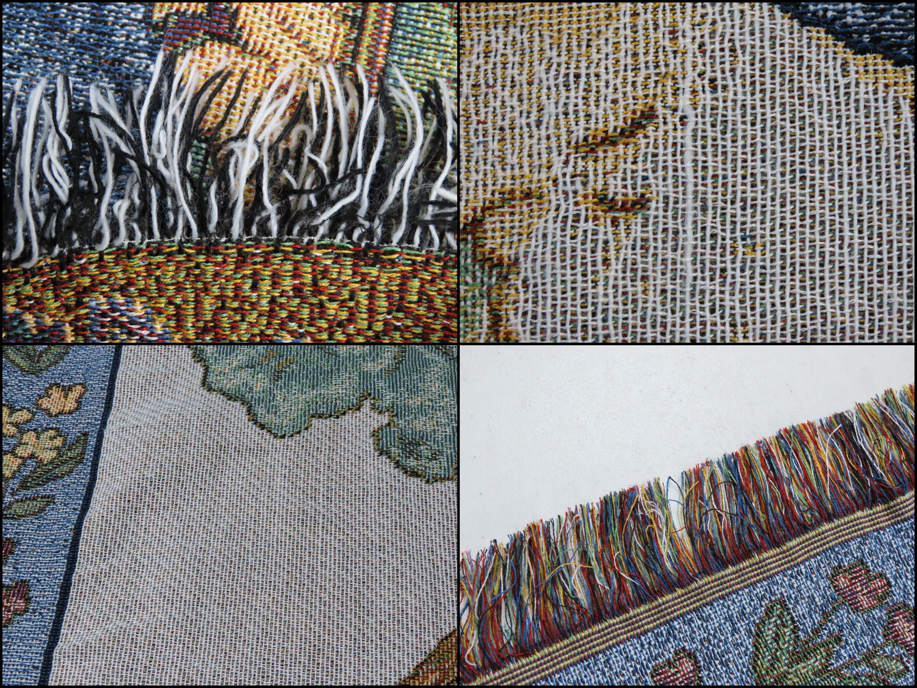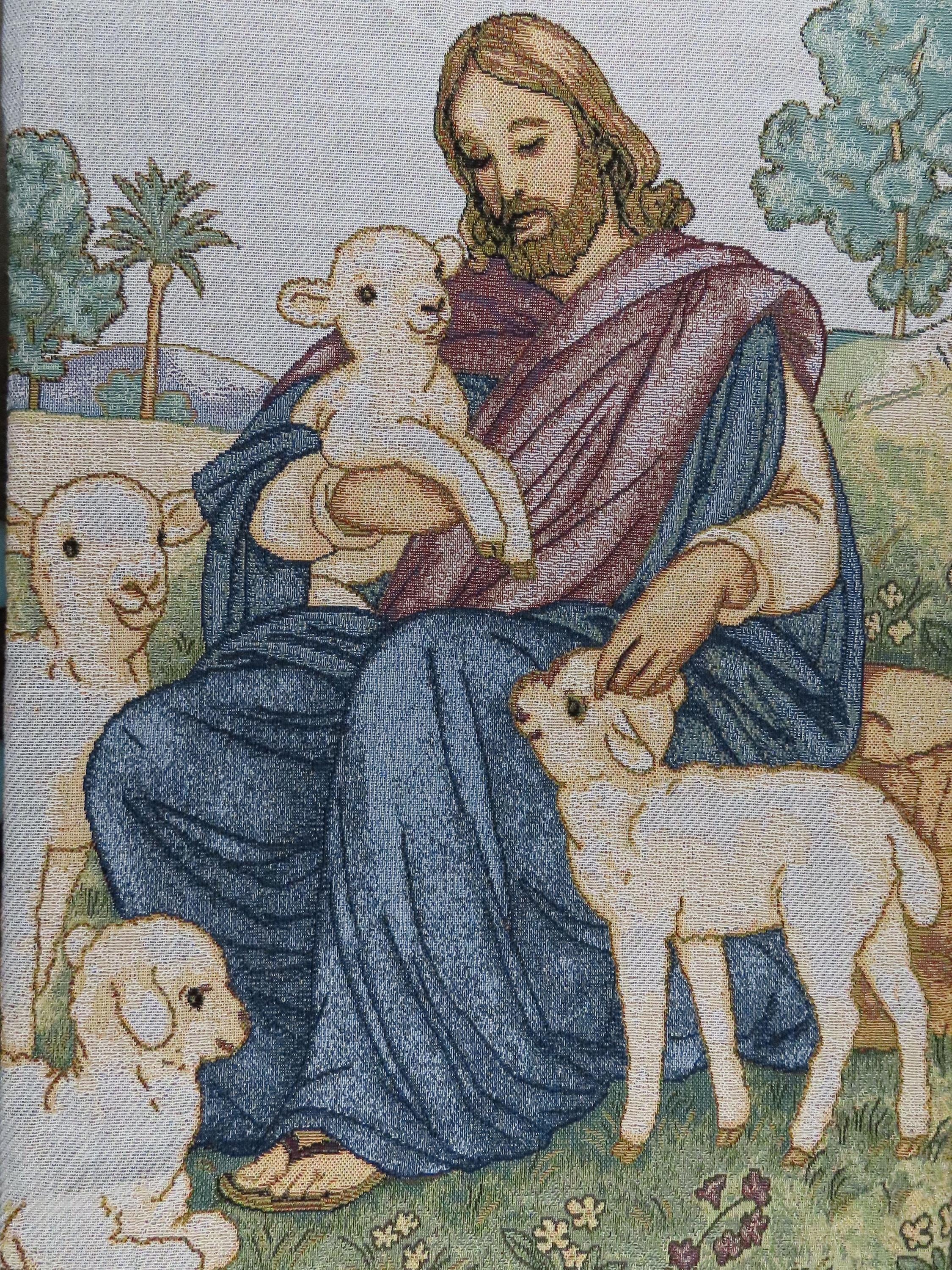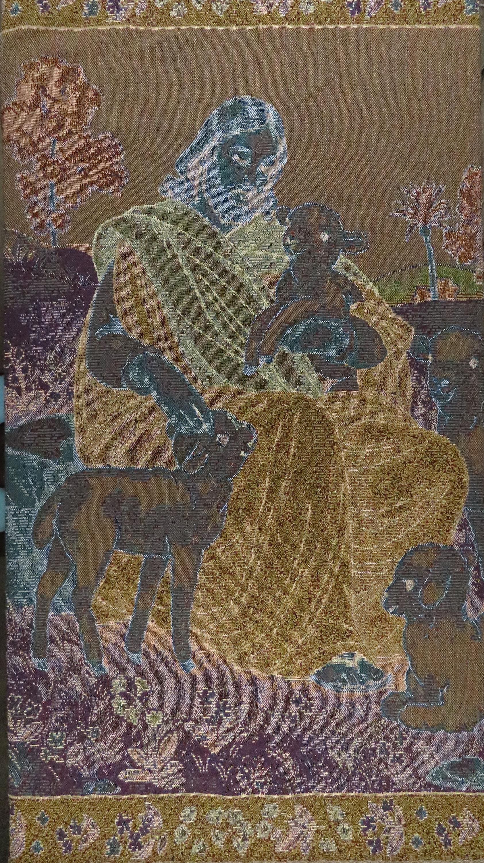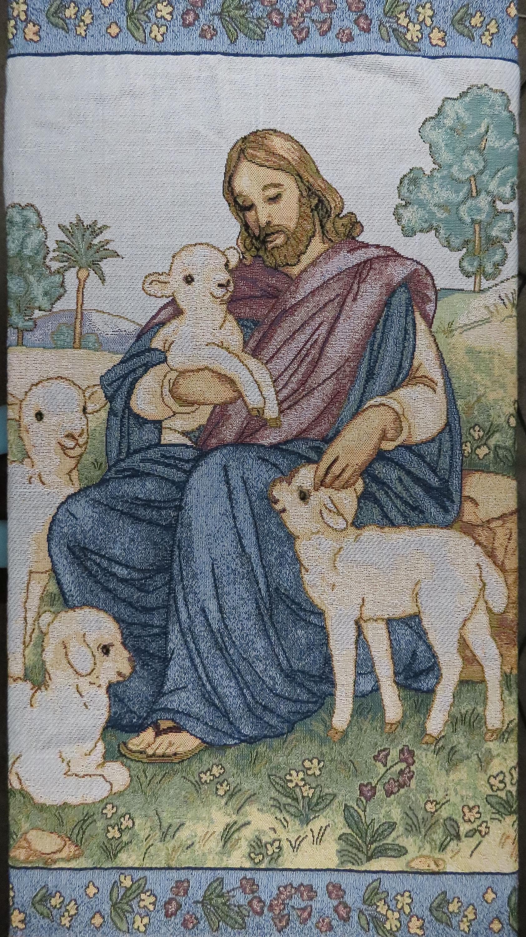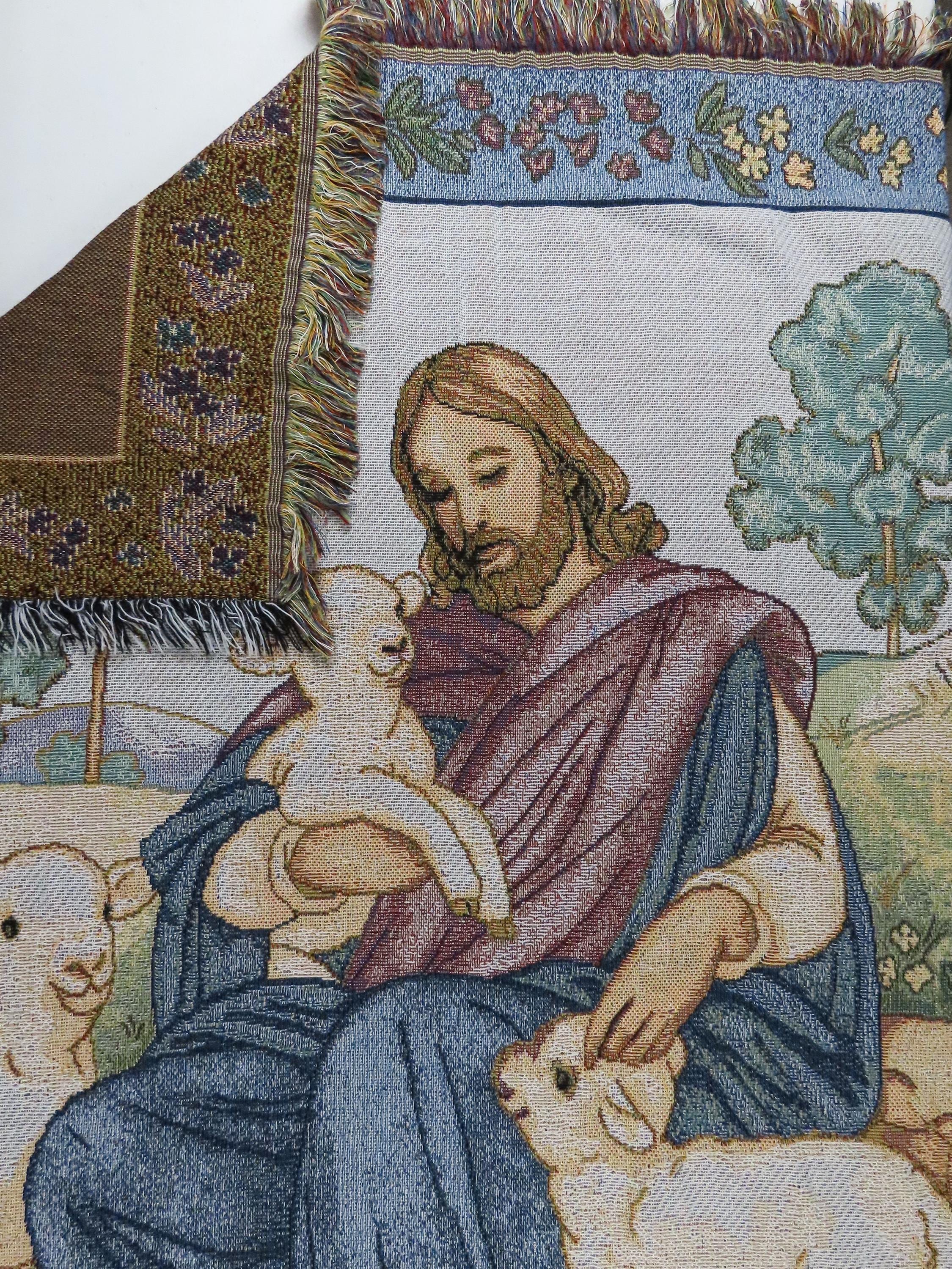 Vintage Jesus the Good Shepherd woven tapestry blanket which is about 61" tall by 47" wide (155 cm by 121 cm) which includes the decorative fringe edge. It does not want to lay completely flat as it ripples some. The yarn at the edges is fraying some at the tips and the yarn is a little tangled.