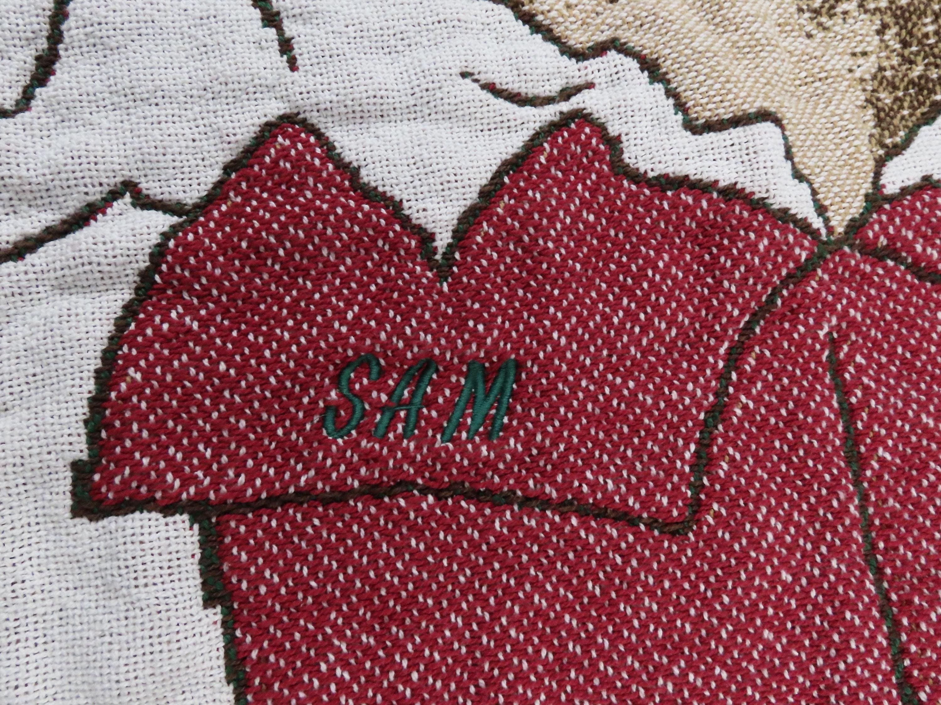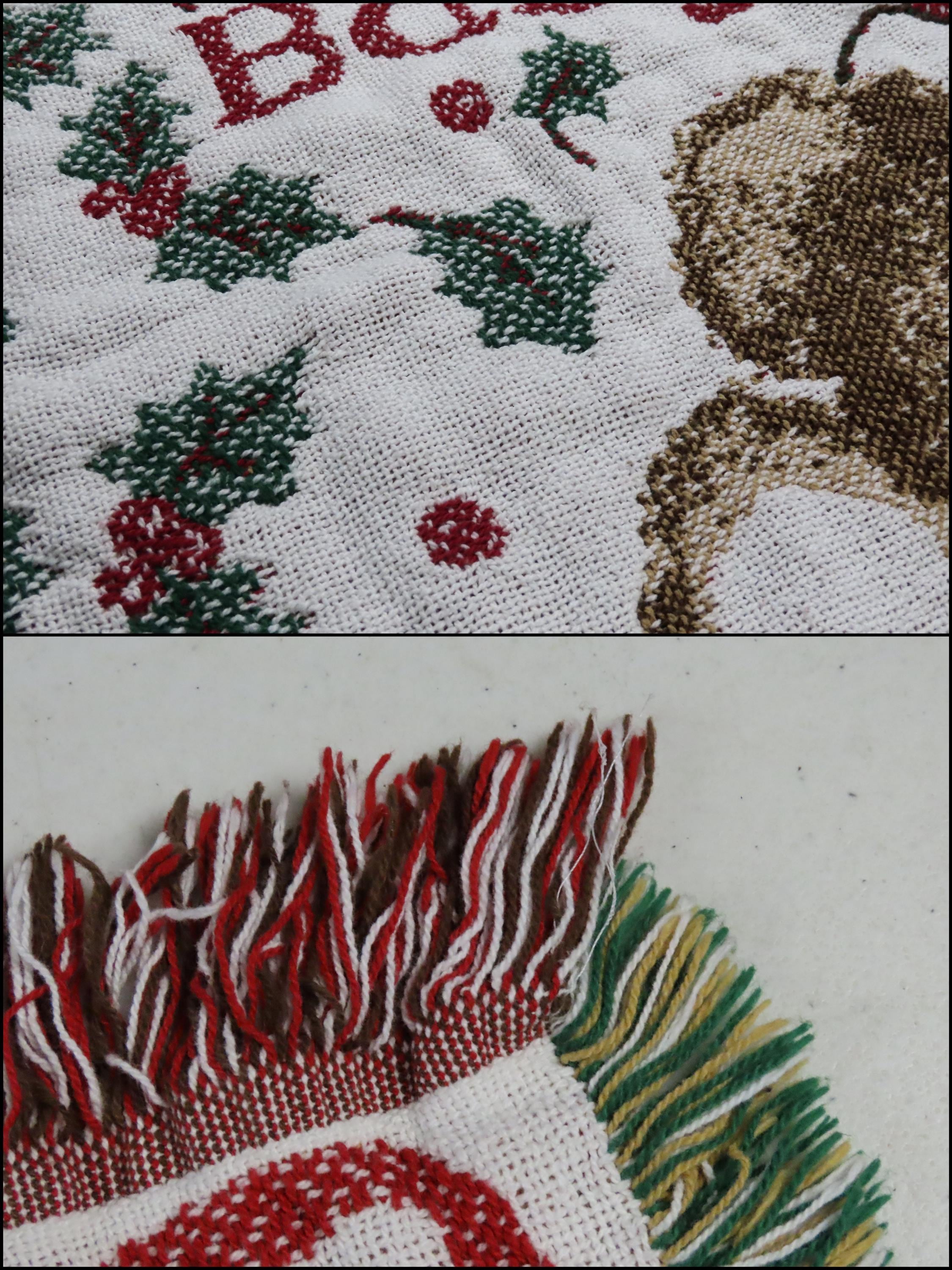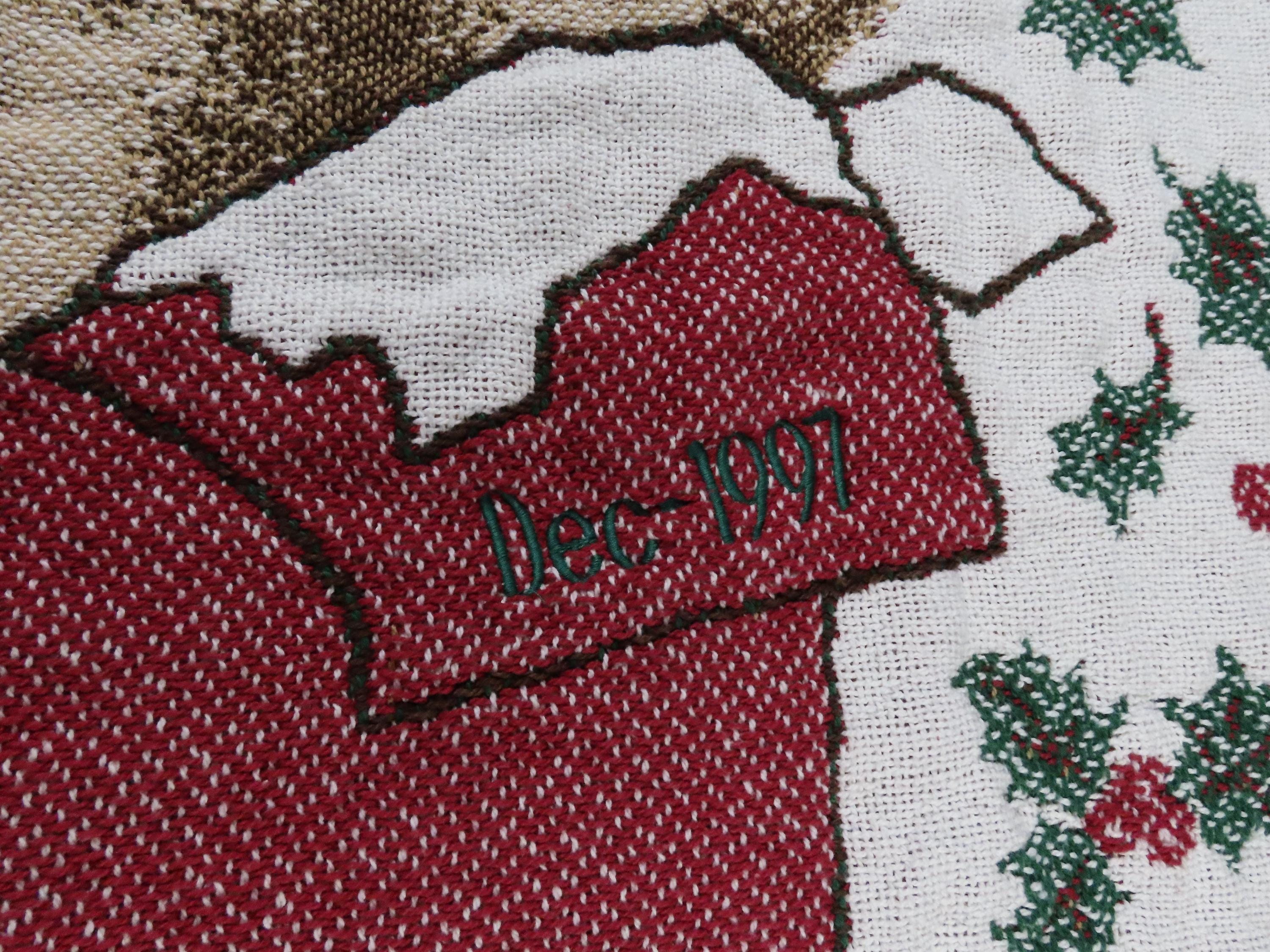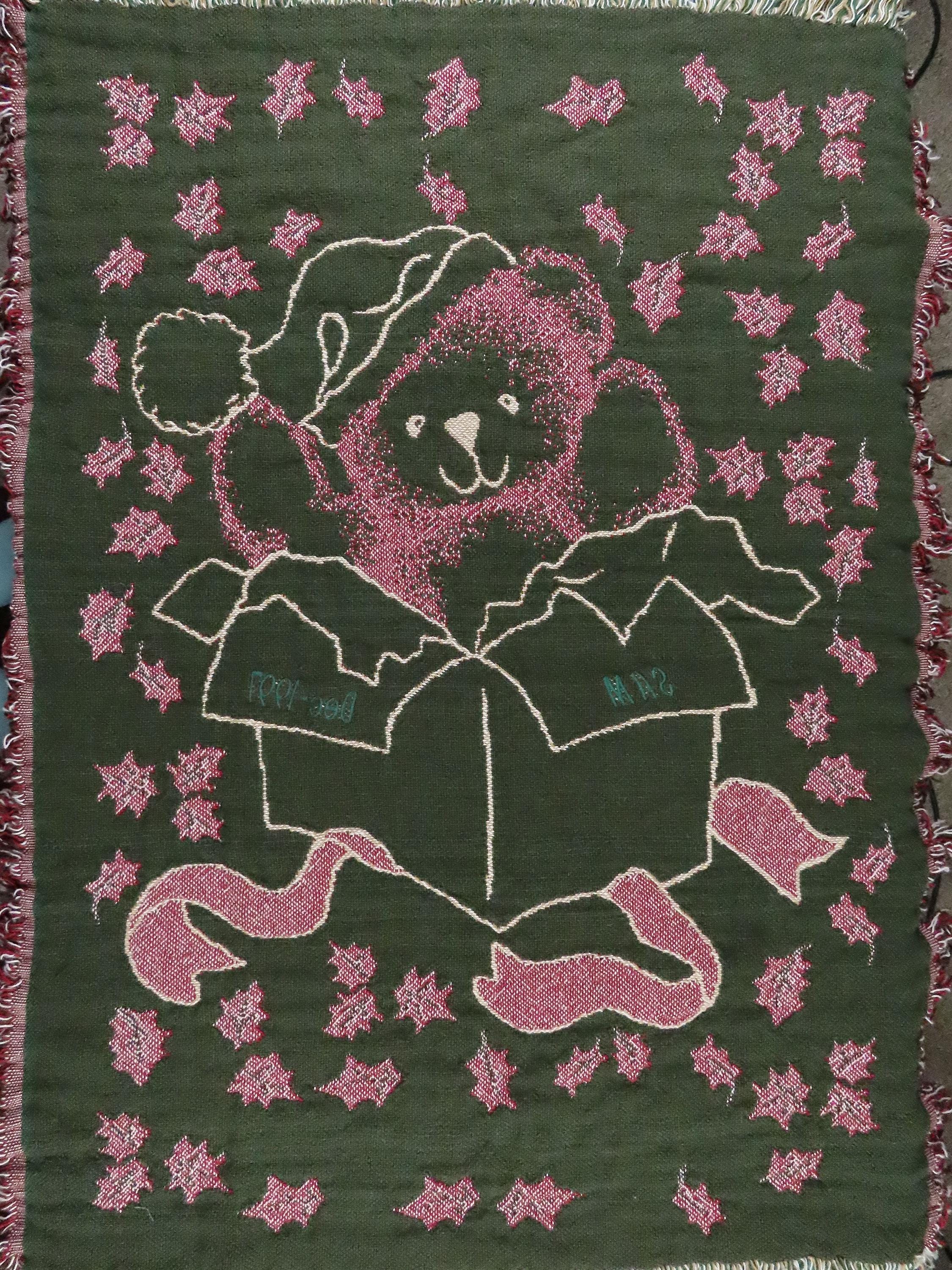 Vintage teddy bear "Baby's First Christmas" small woven blanket which has "Sam" and "Dec 1997" embroidered on the blanket. It is about 47" tall by 37" wide (118 cm by 94 cm) which includes the decorative fringe edge. It does not want to lay completely flat and ripples. There is light pilling in areas. The yarn at the edges is a little tangled and the tips are fraying some.
