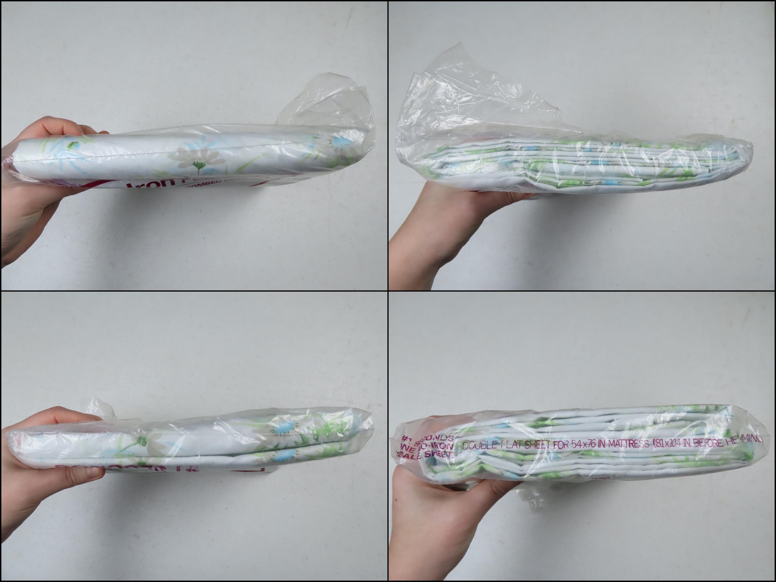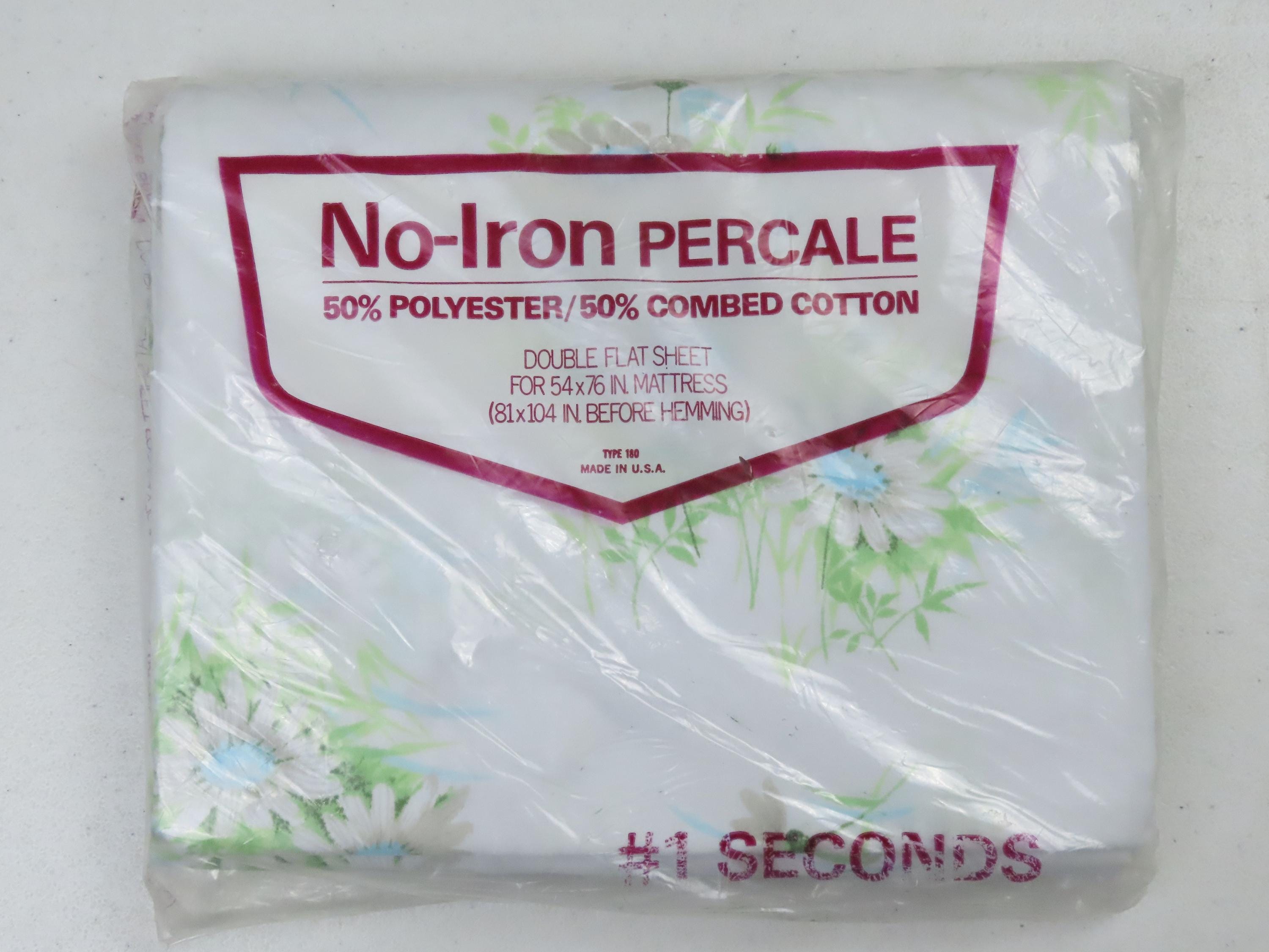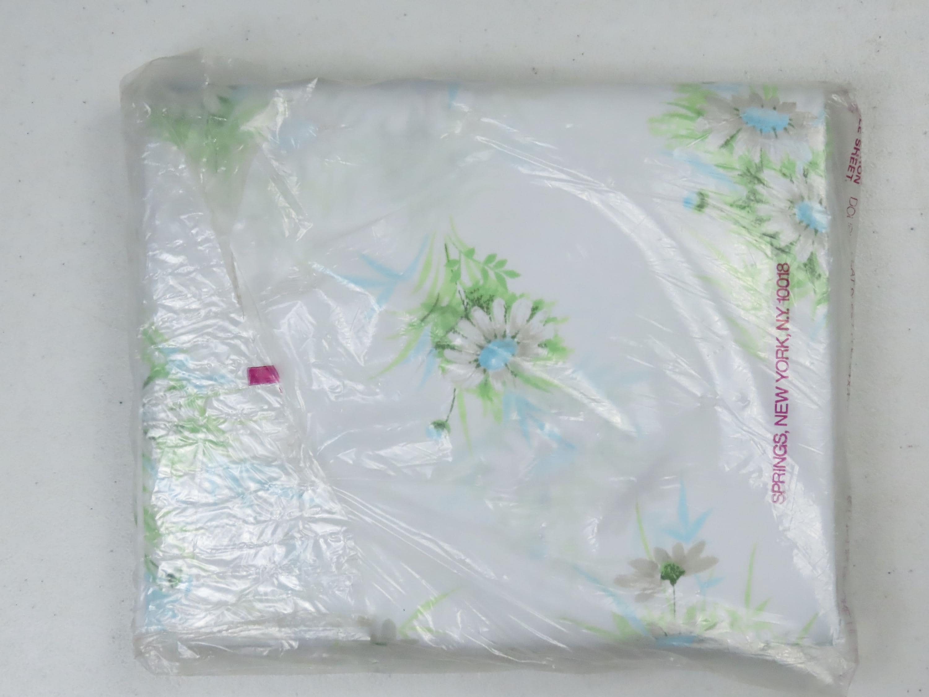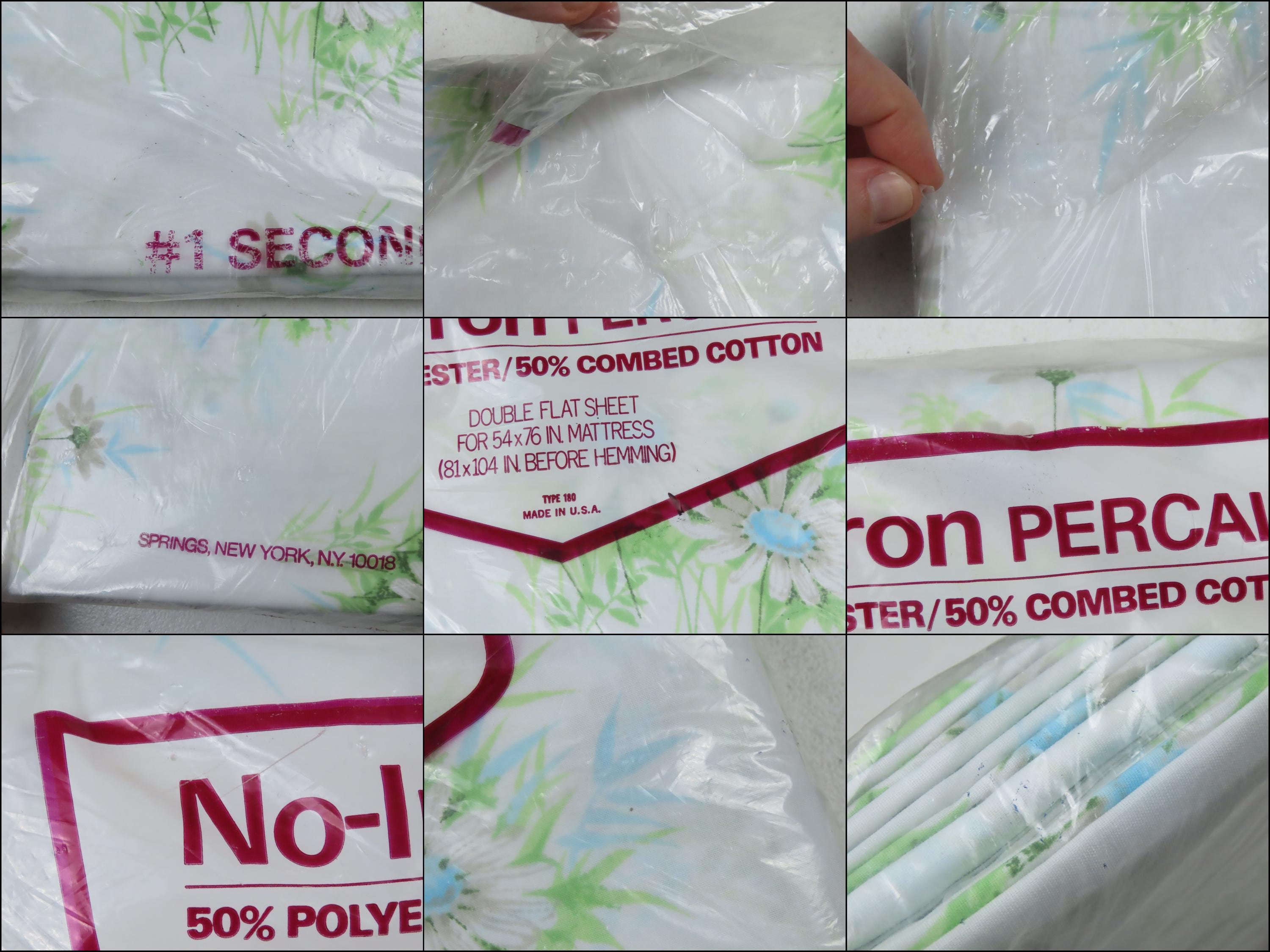 Vintage "Number 1 Seconds" floral double flat sheet which is new in the package. It is 50% cotton and 50% polyester with a 180 thread count. It also says Springs on the back as well as #1 seconds, so I wonder if this company sold the "B" stock of other brands. The plastic packaging is very worn. The plastic has small holes, marks, and some sharpie marks. It has a larger hole on the backside, the ink is wearing off, and there is some loose dust/debris inside the packaging. It was sealed awkwardly as there is a large flap on the backside.