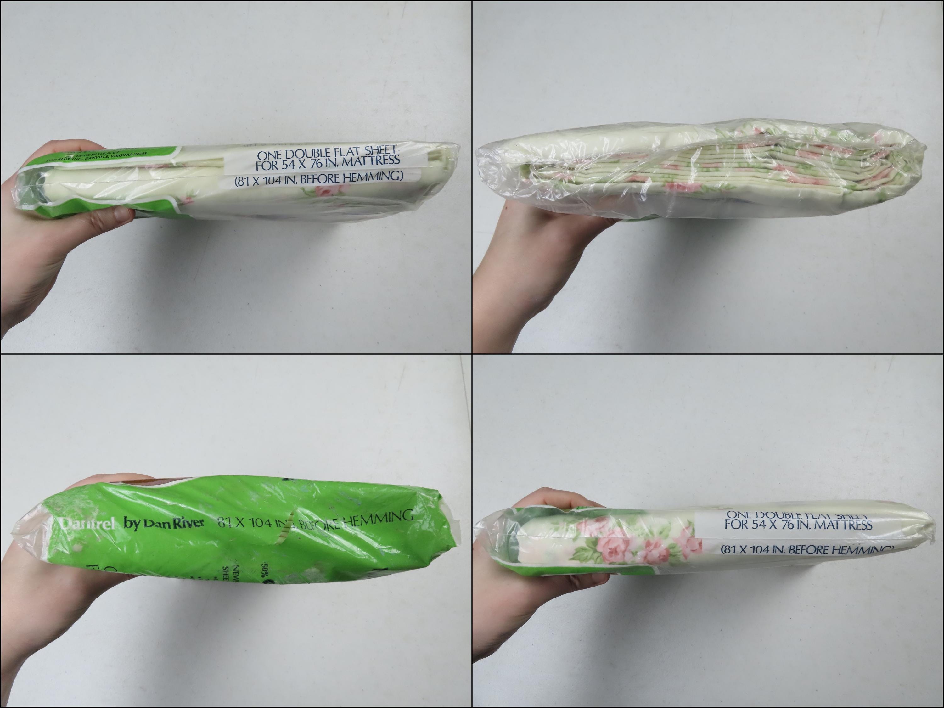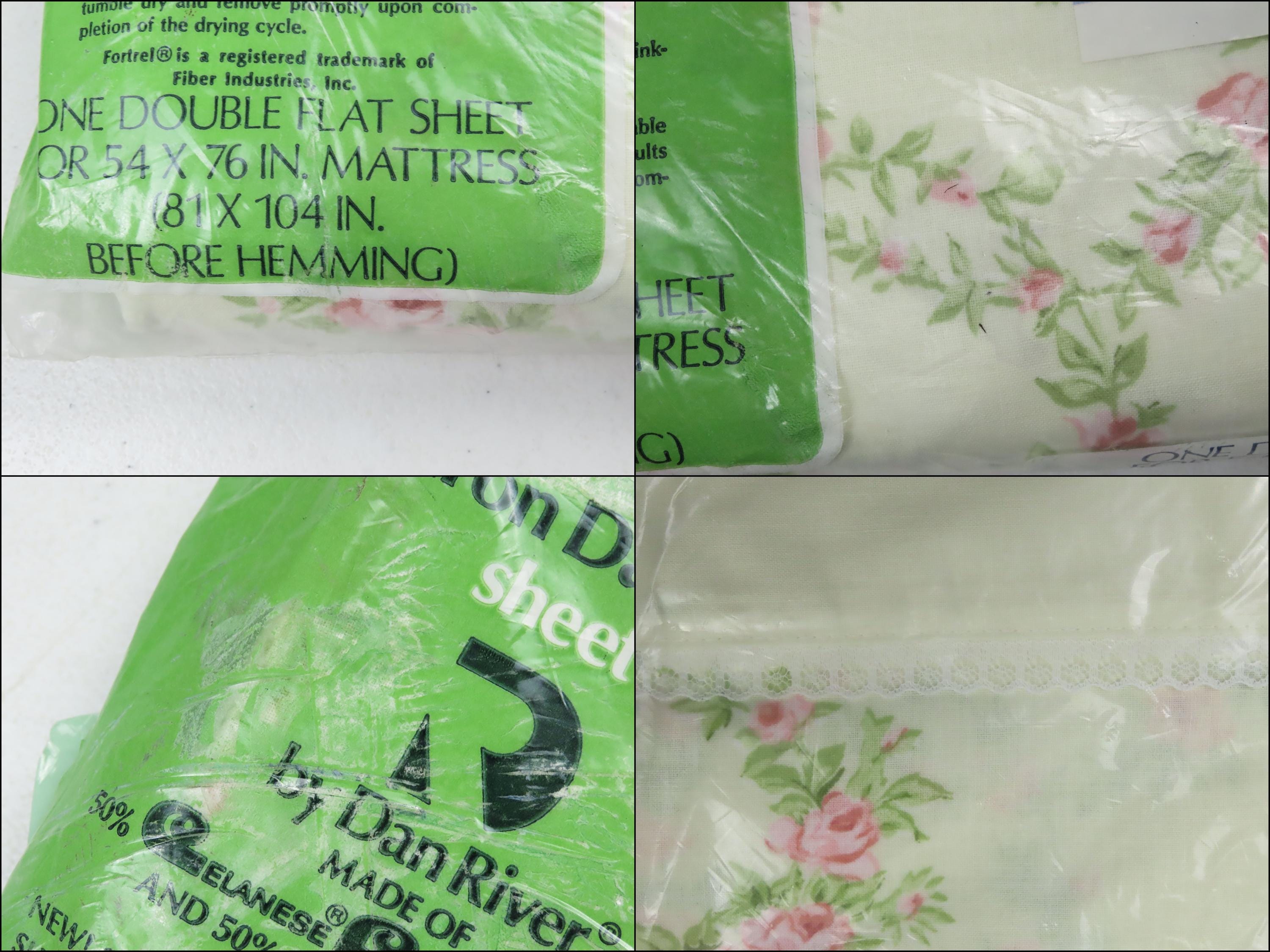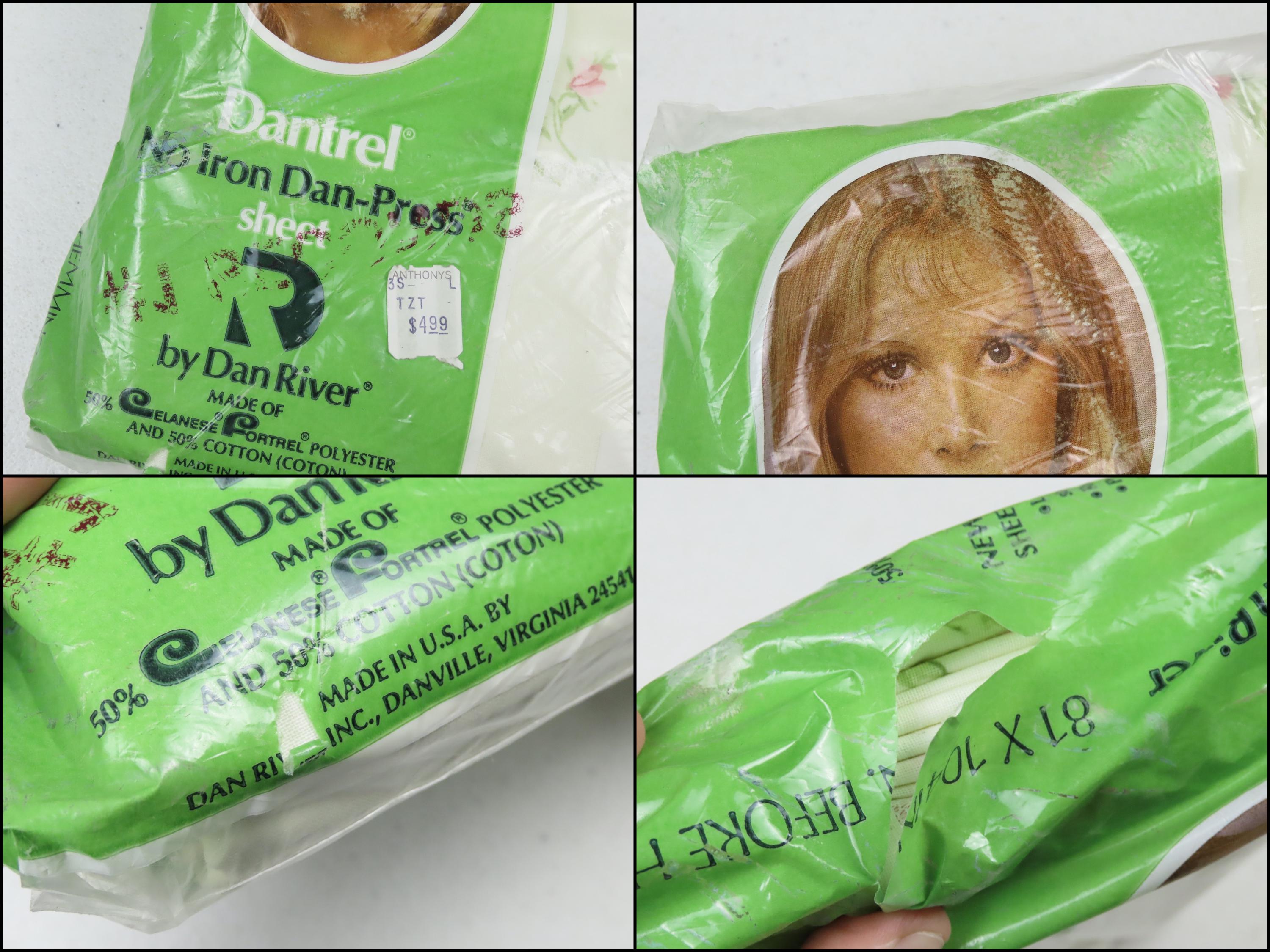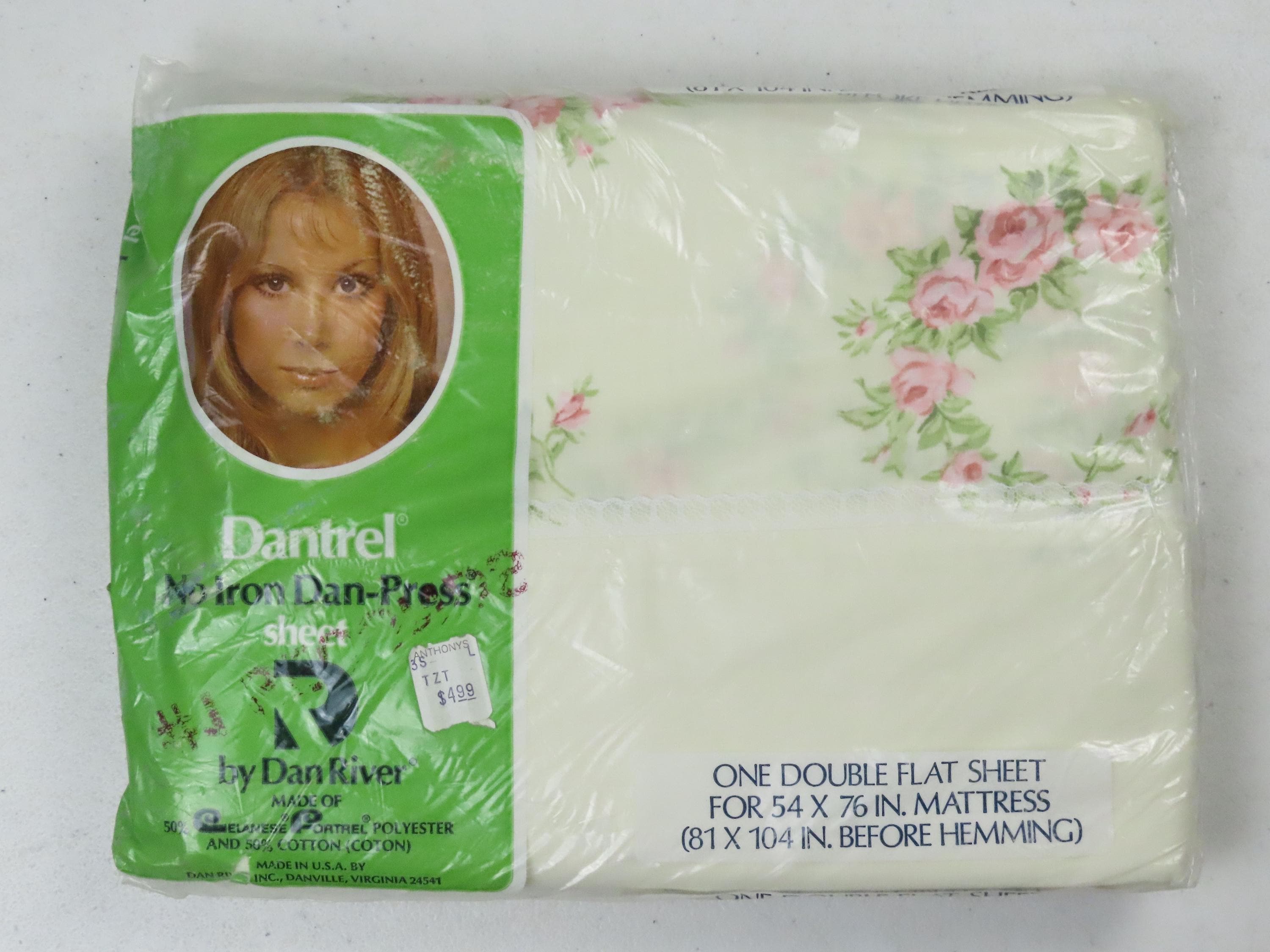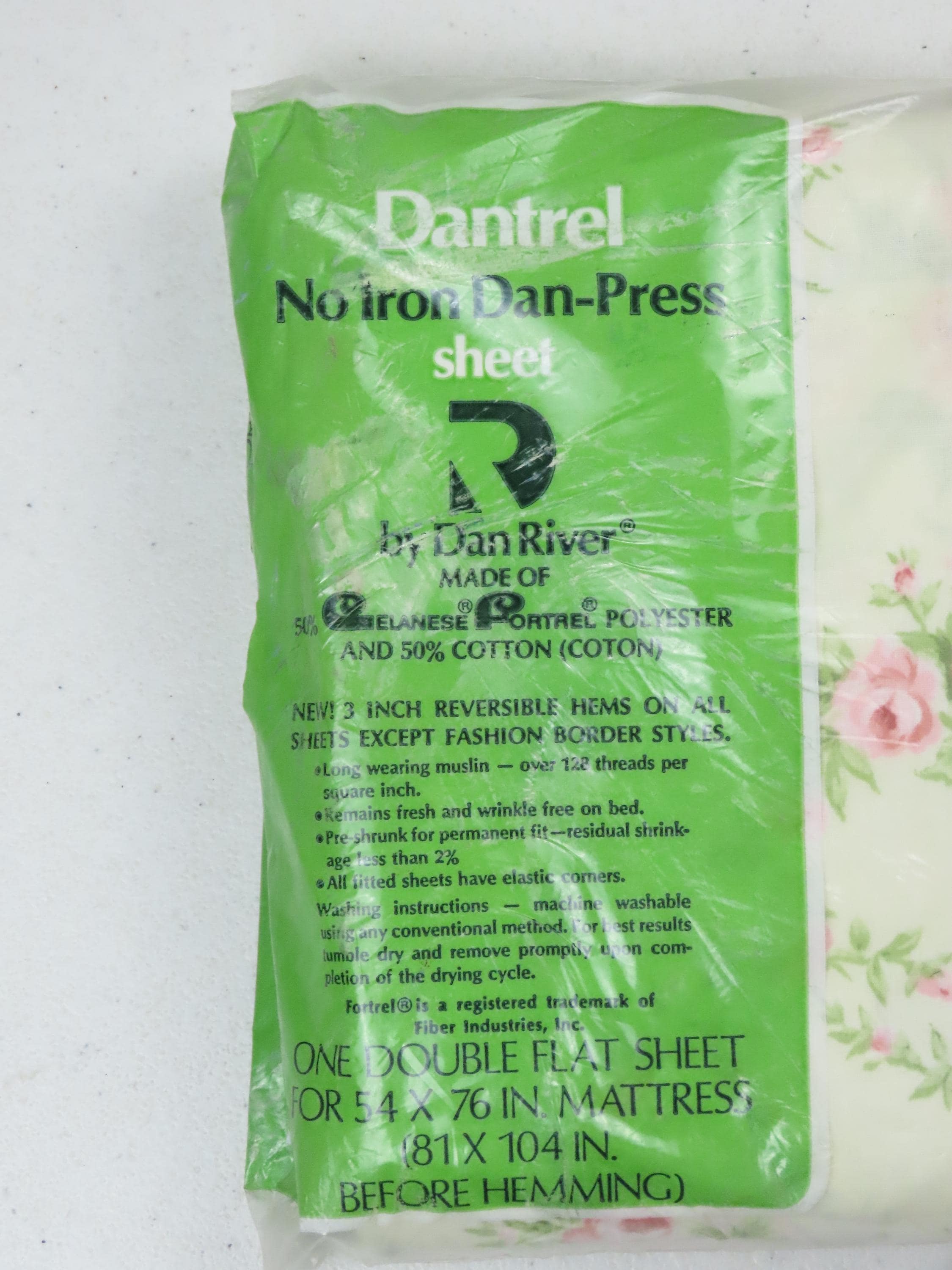 Vintage Dan River "Sweetheart Rose" double flat sheet which is new in the package. It is 50% cotton and 50% polyester. I'd describe the sheet as a cream color. The plastic packaging is very worn. It has a large hole, some small holes, and marks on the plastic. The ink has worn off in areas, and some wording from a different sheet package has transferred on to it from being stored together.